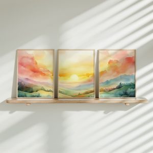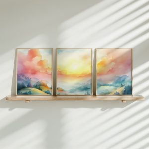 Zachte Zonsopgang boven Bergtoppen – Dromerig Waterverfschilderij