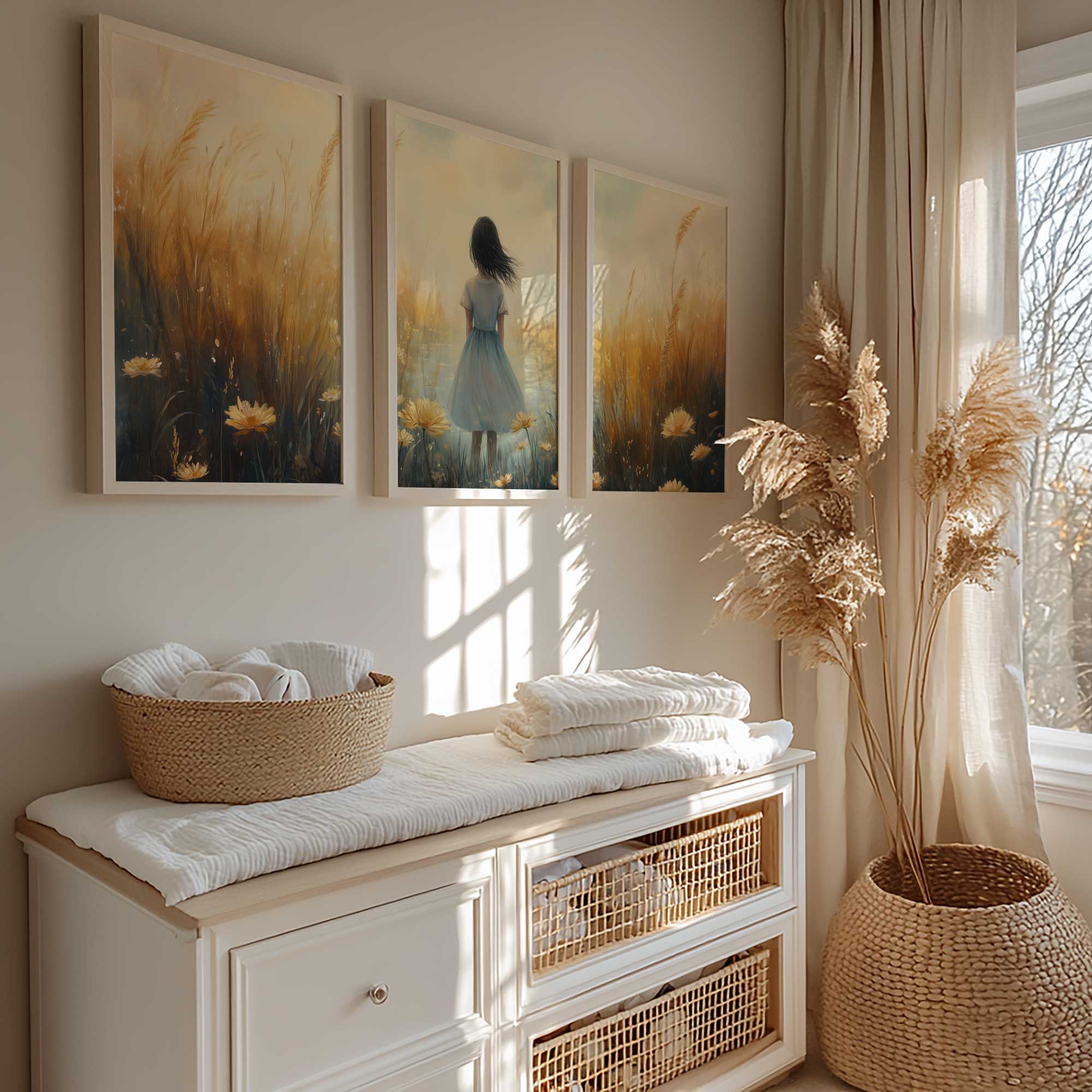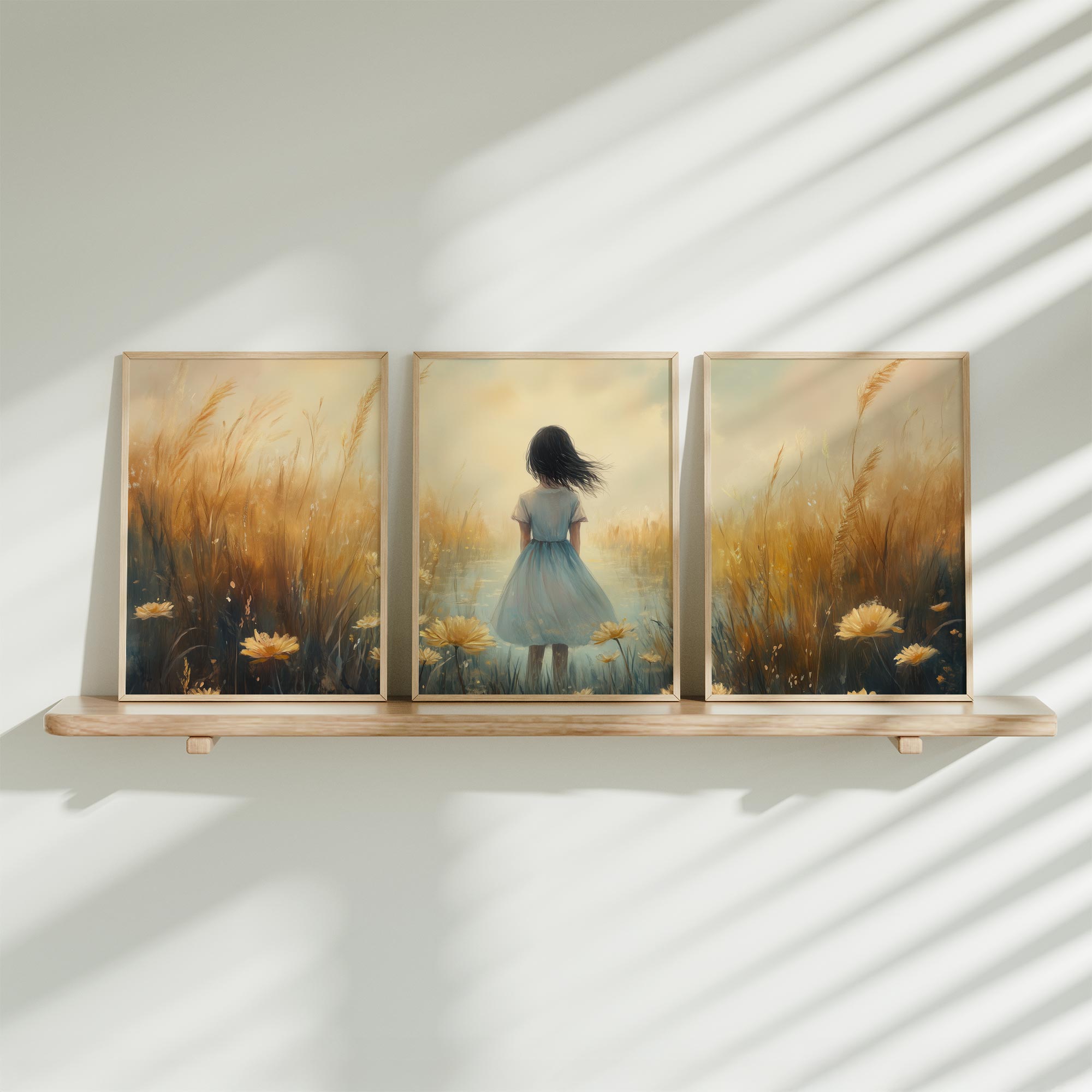 Zwevend Meisje in Gele Bloemenveld – Blauwe Jurk
