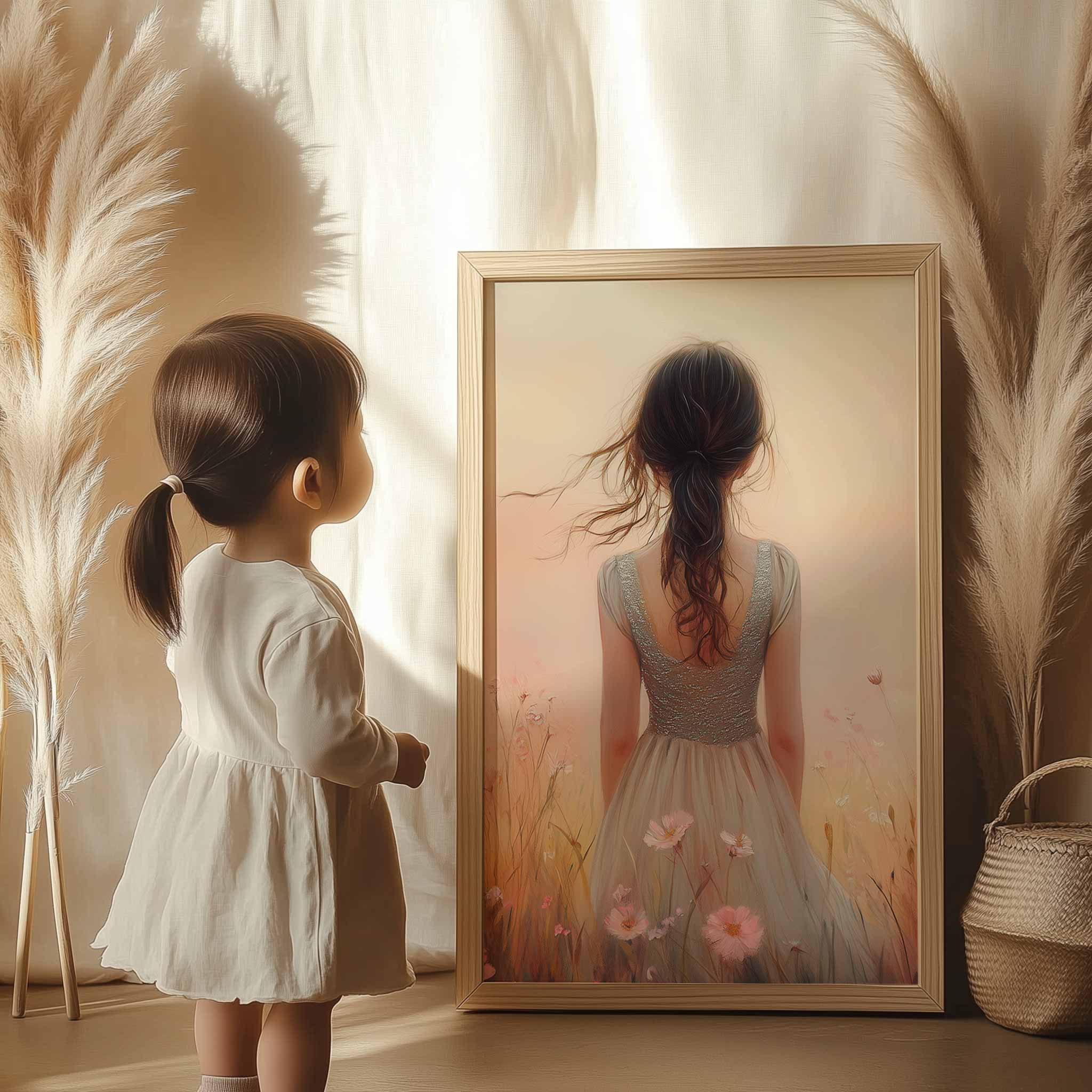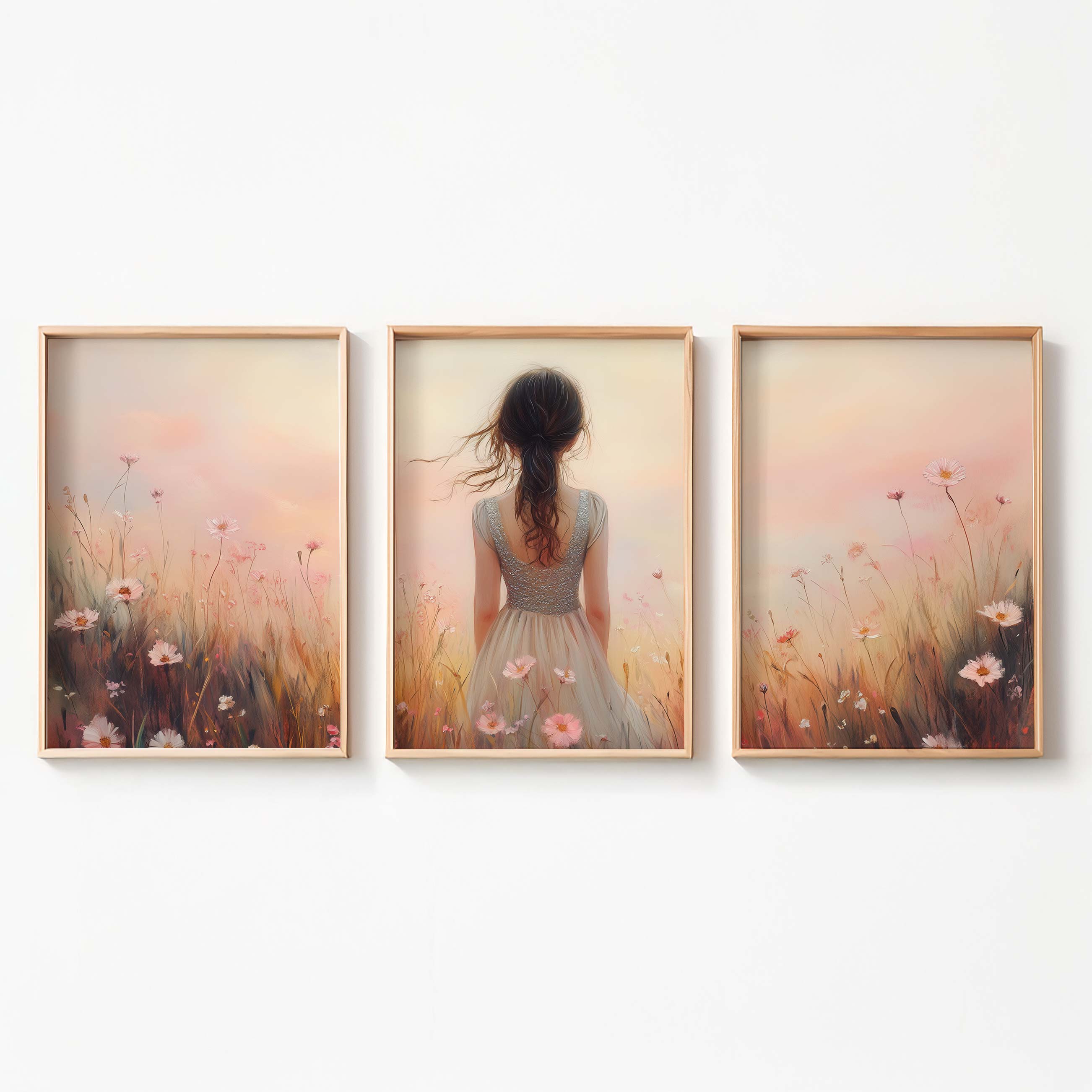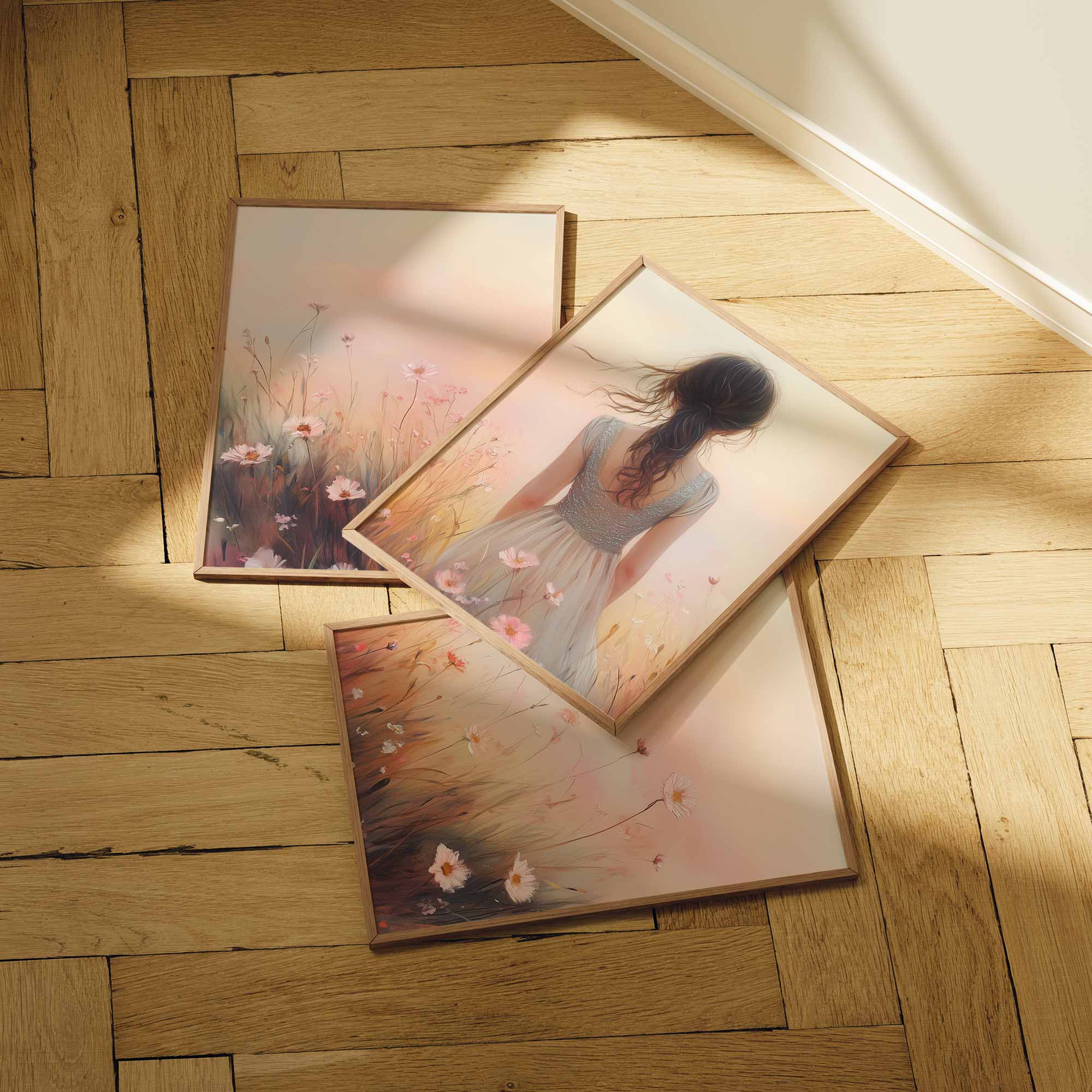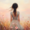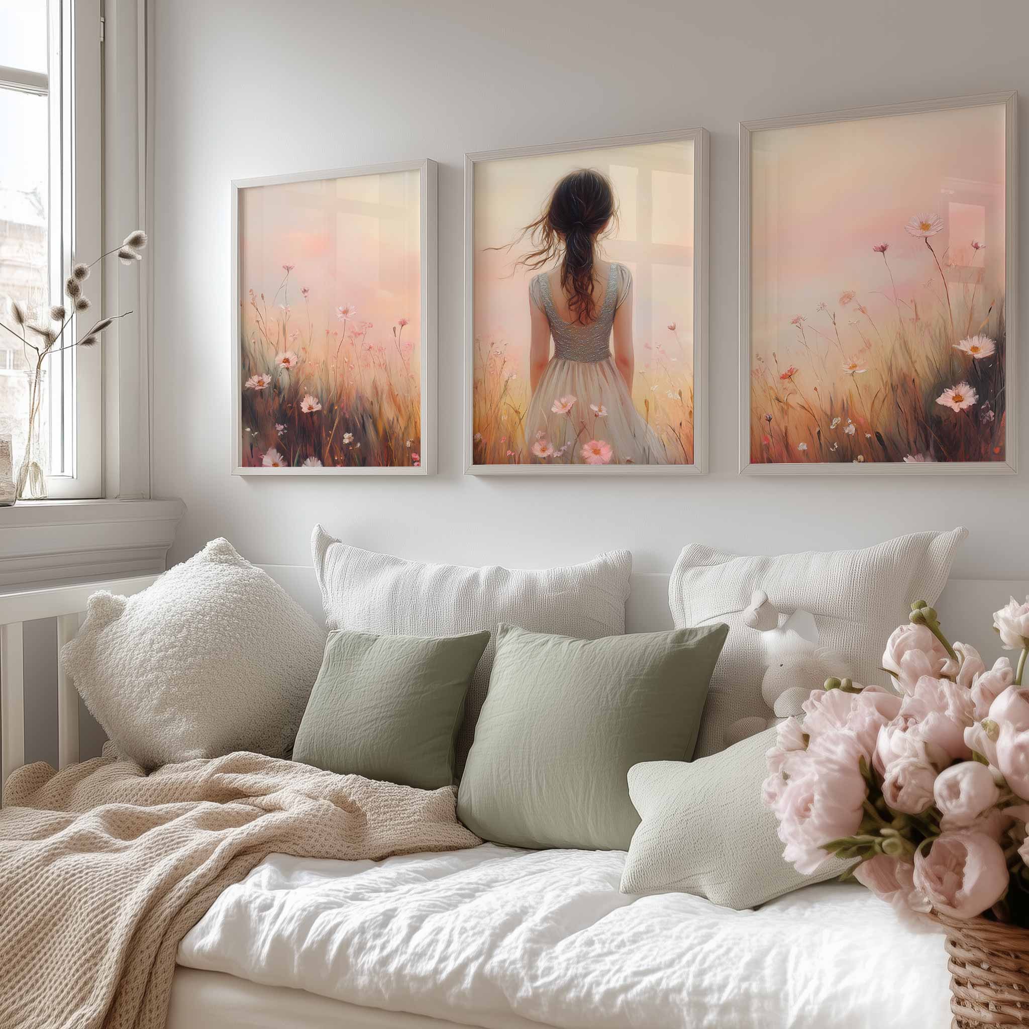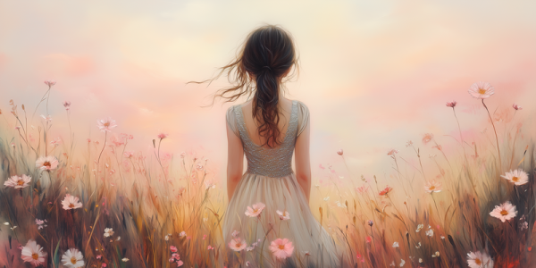 Betoverend bloemenveld met dromerige vrouw en kleurrijke lucht