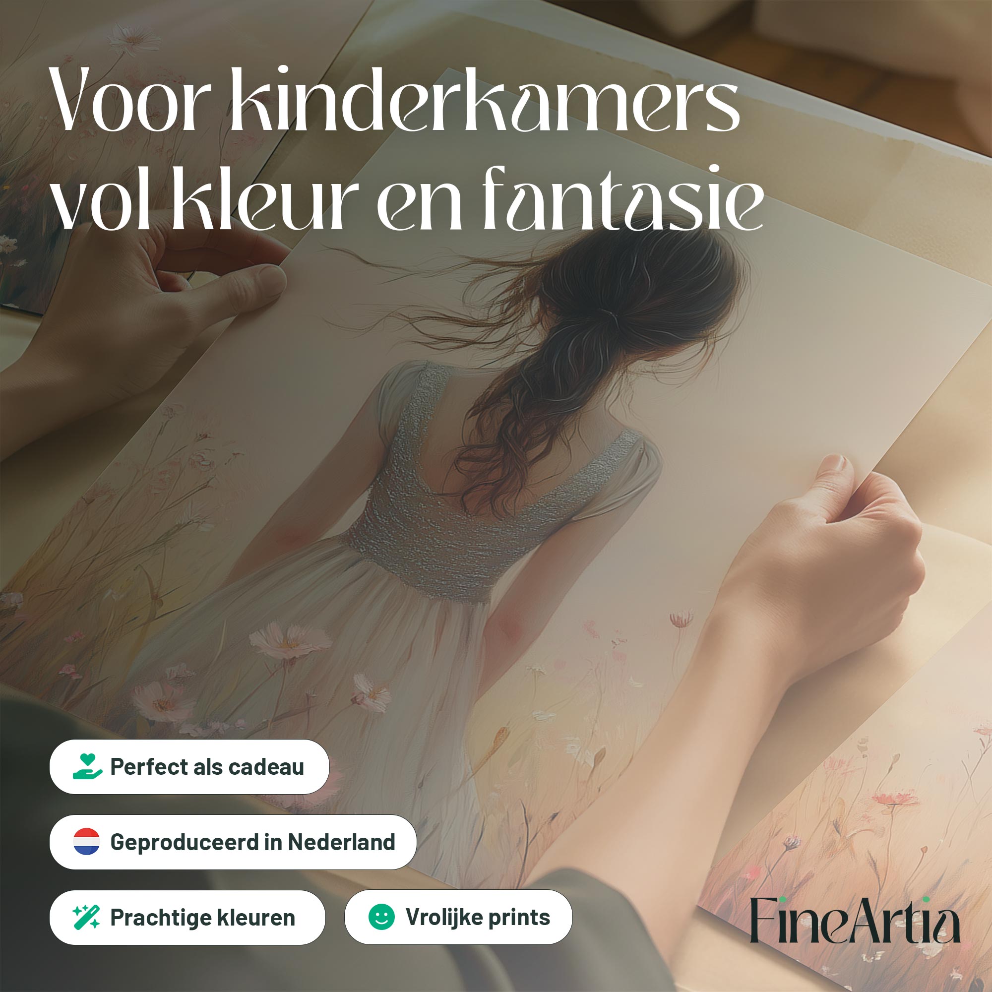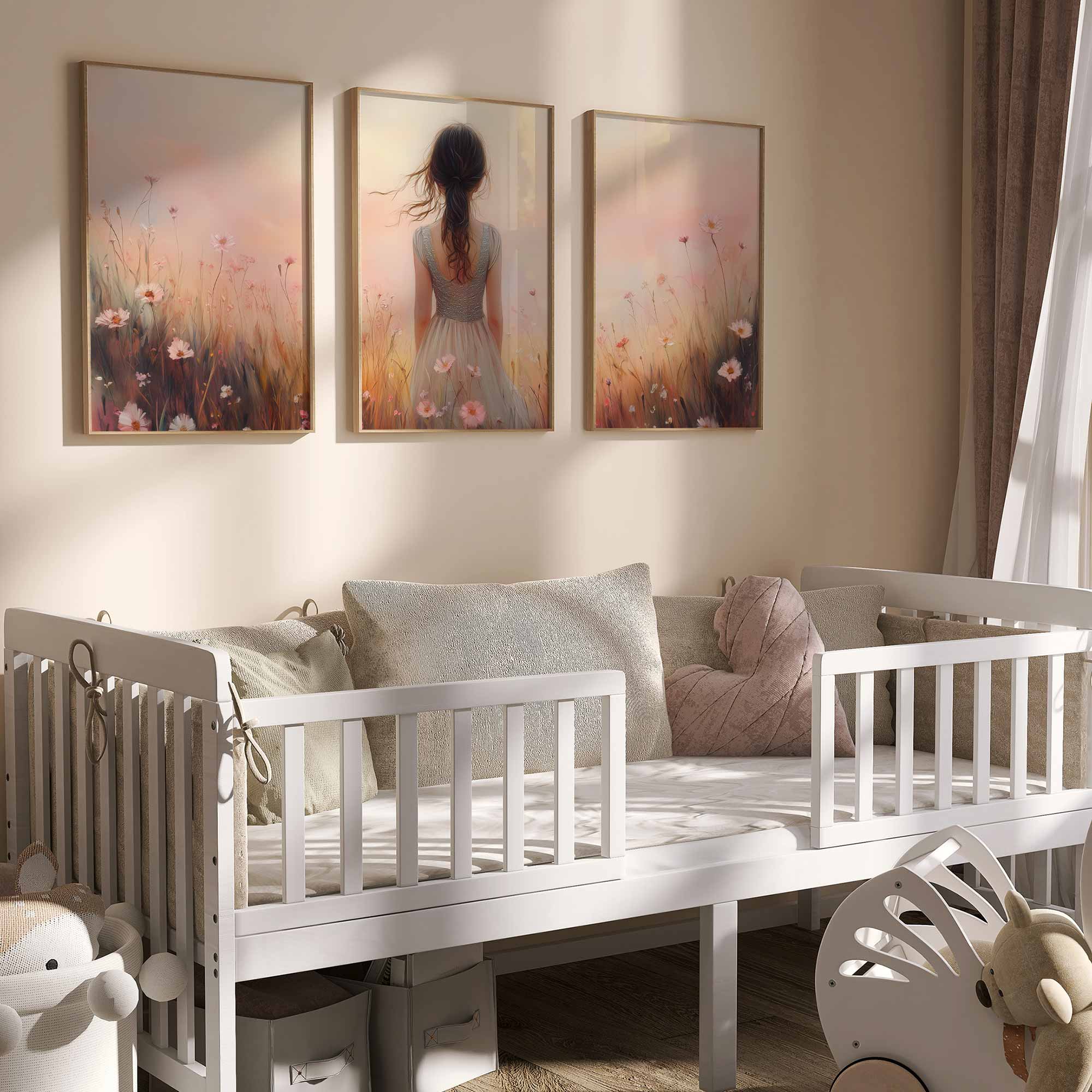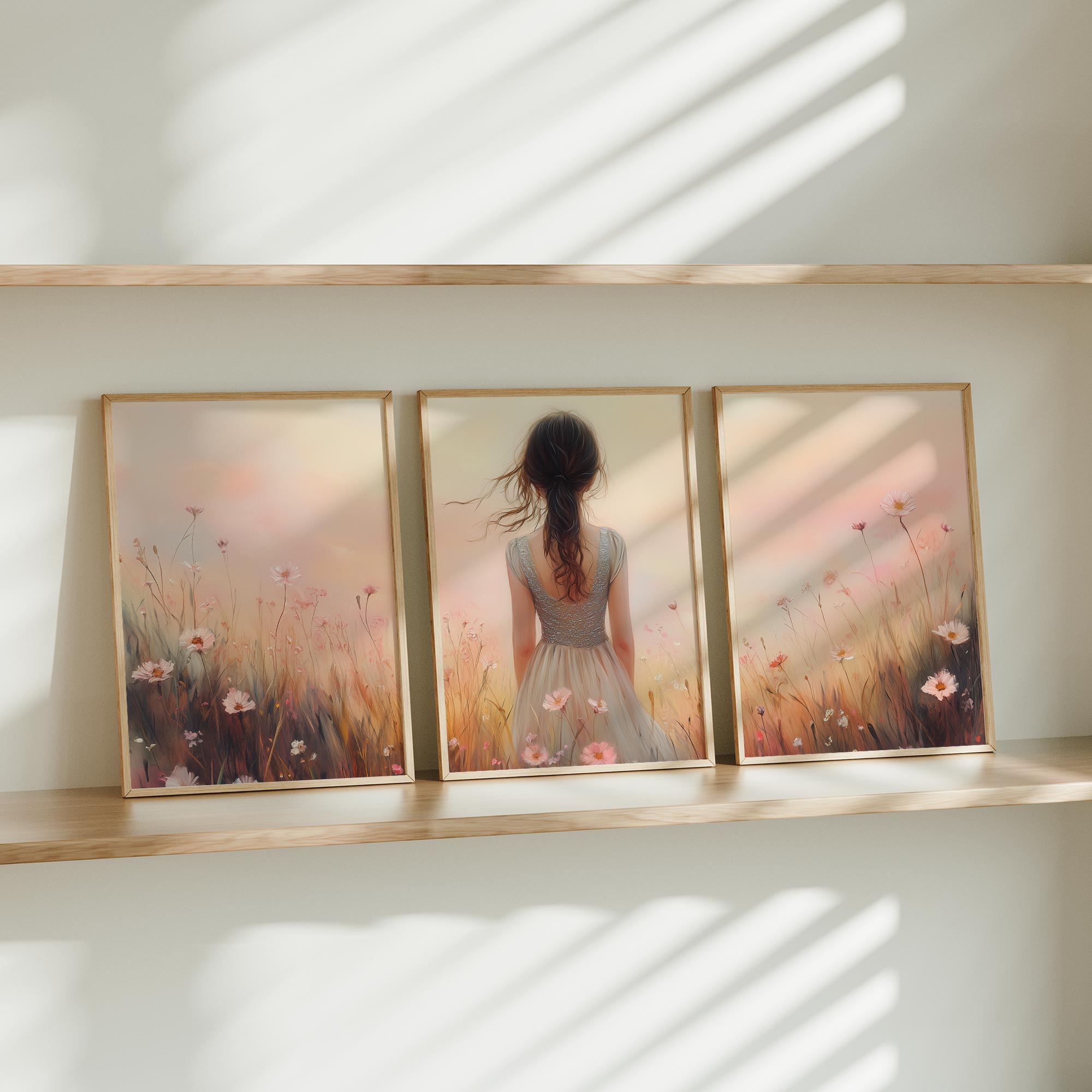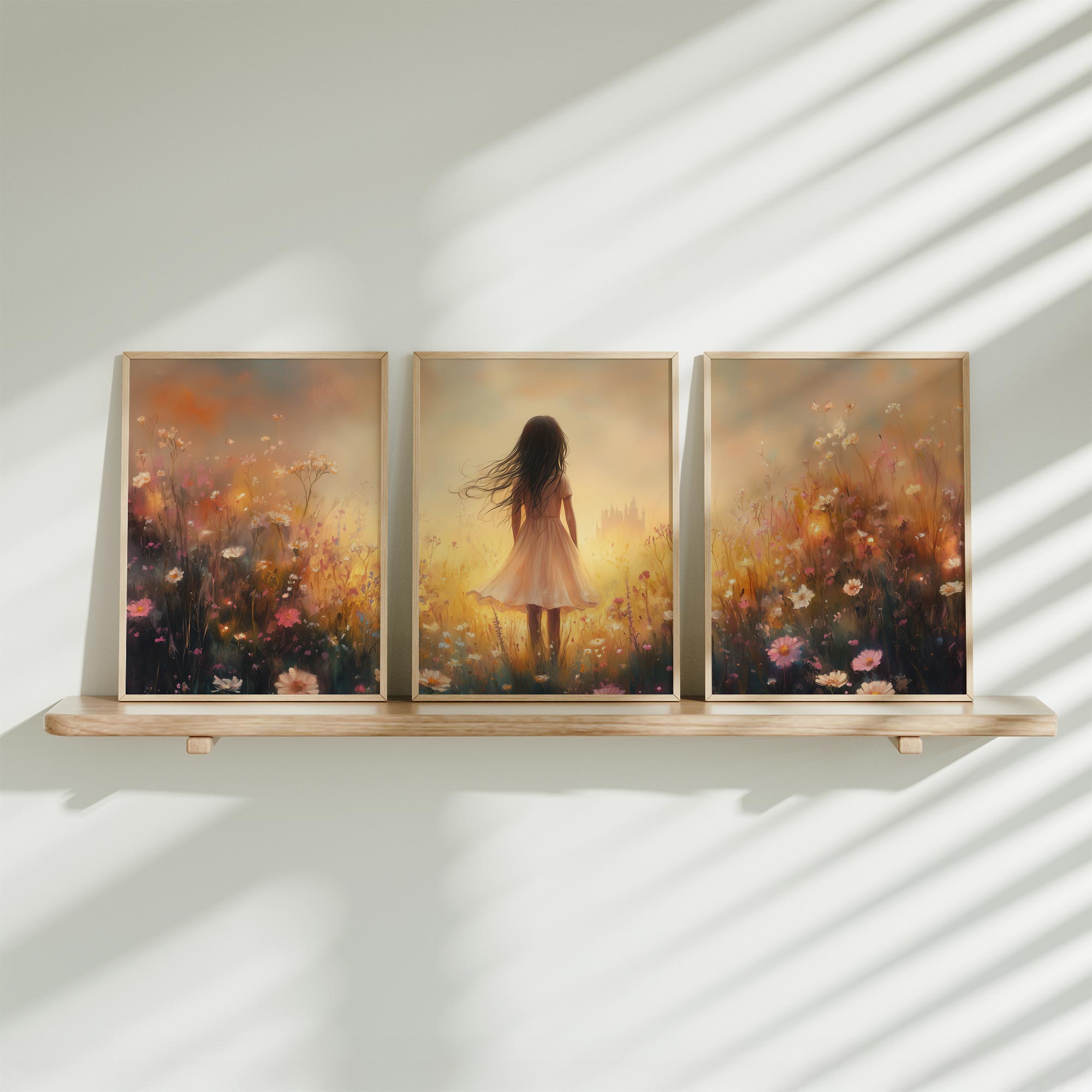 Betoverend bloemenveld met dromerige vrouw en kleurrijke lucht