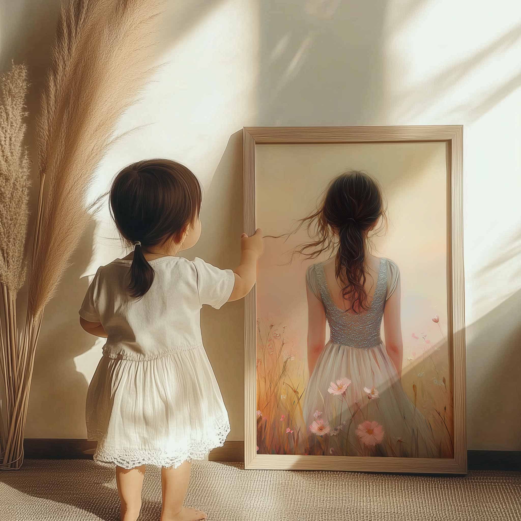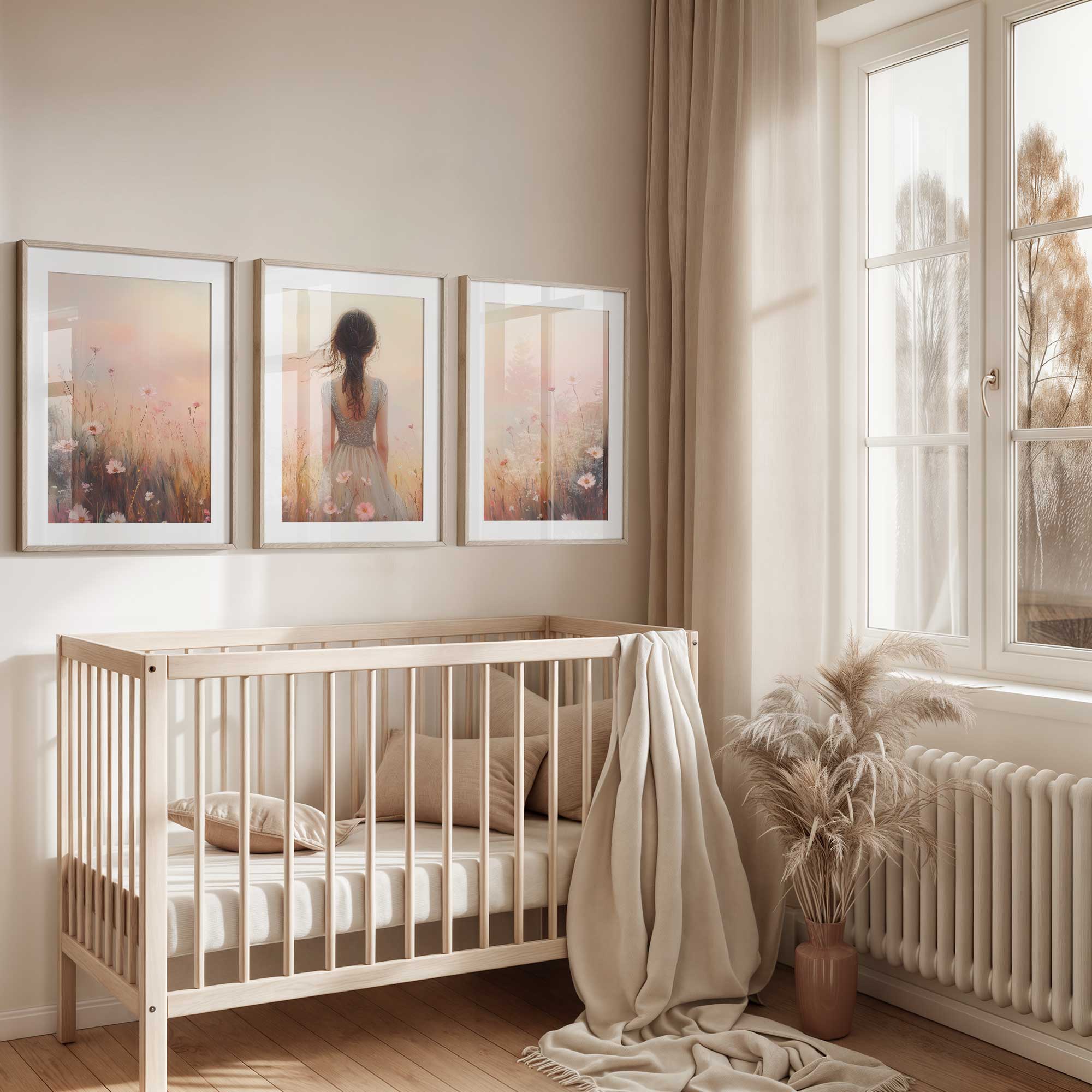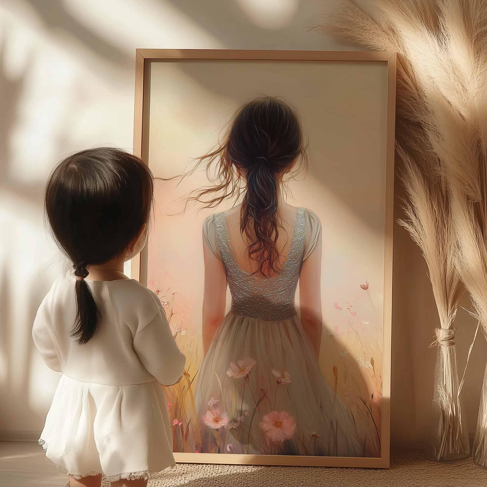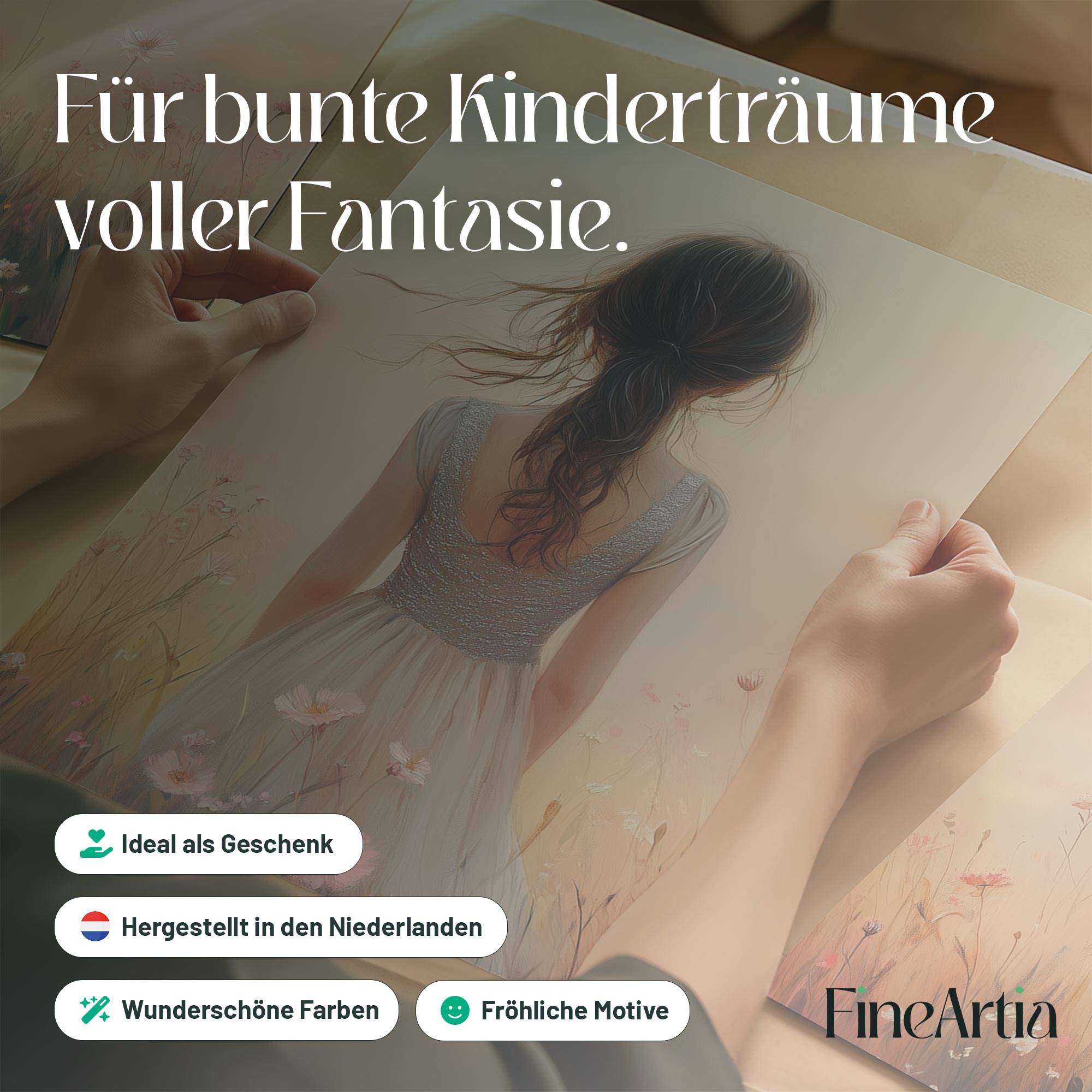 Betoverend bloemenveld met dromerige vrouw en kleurrijke lucht