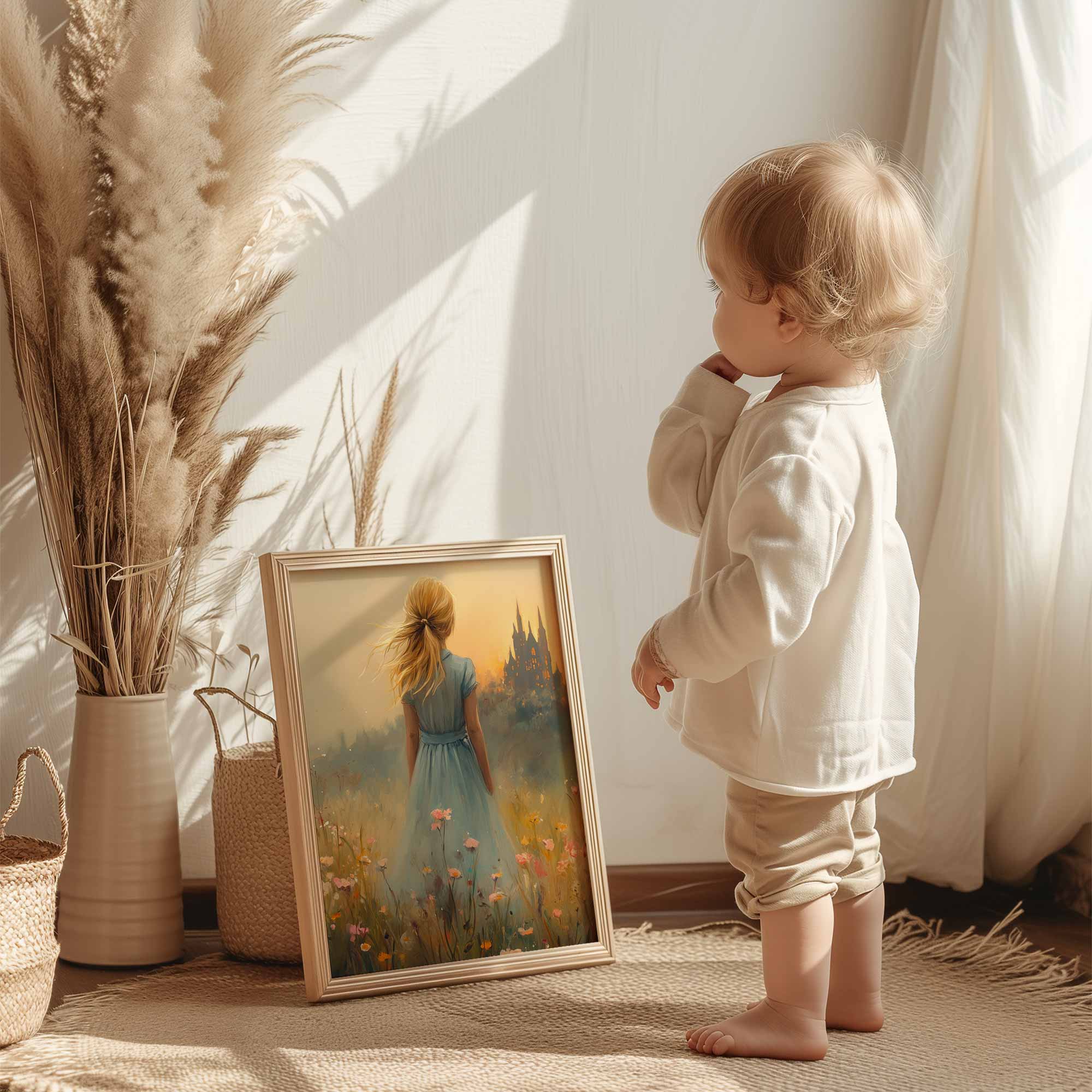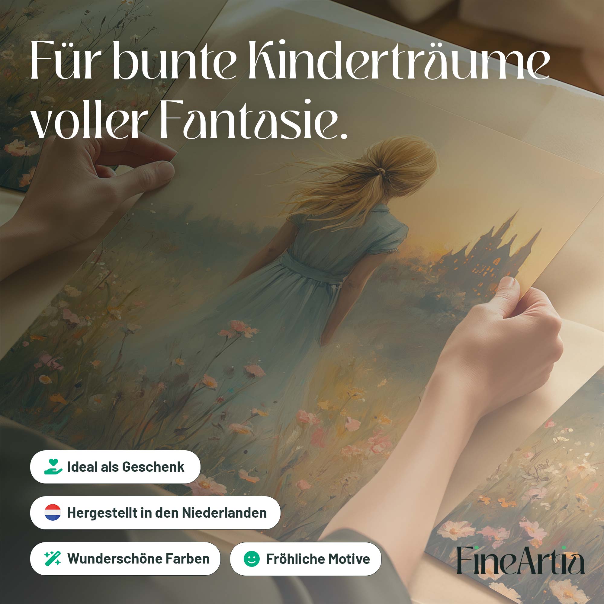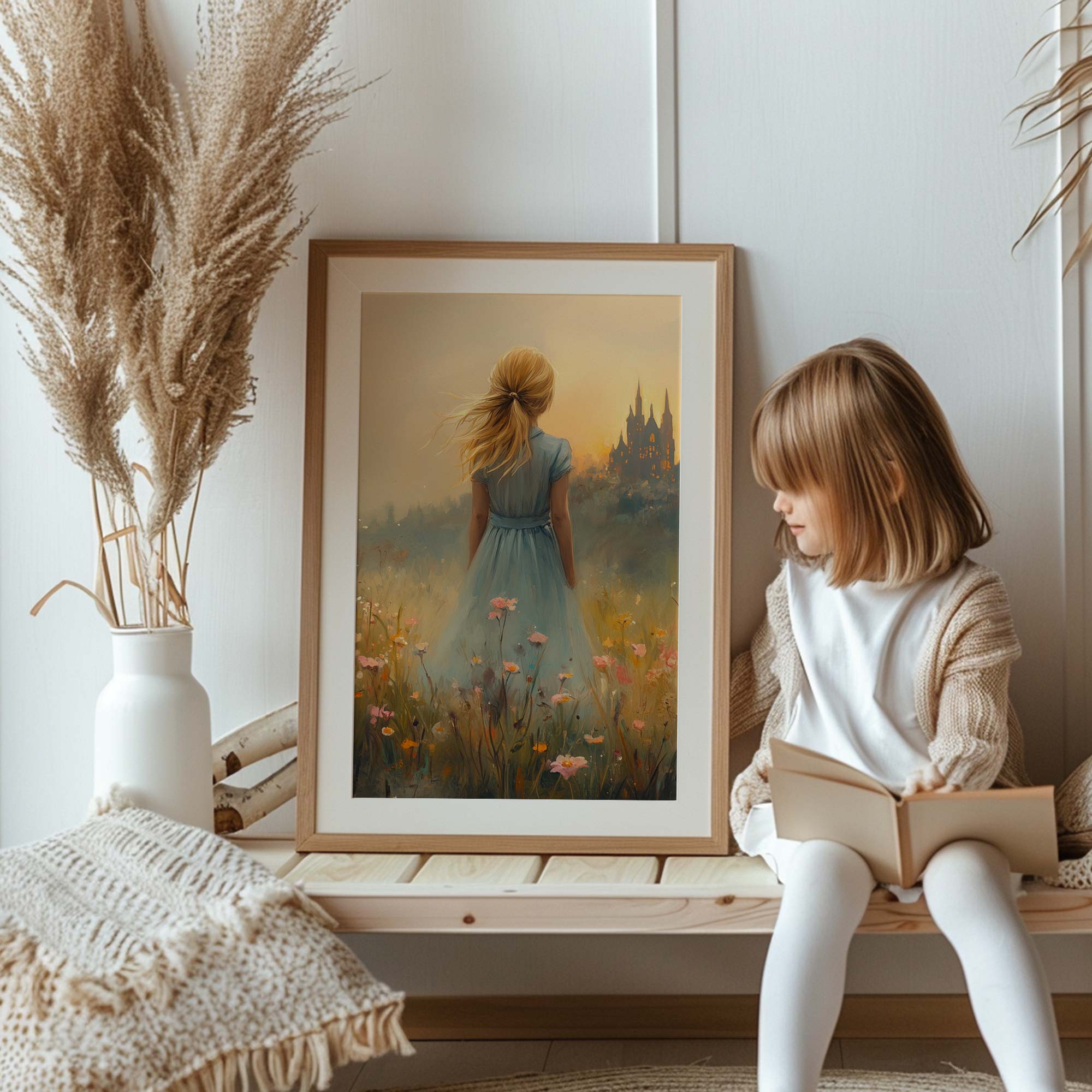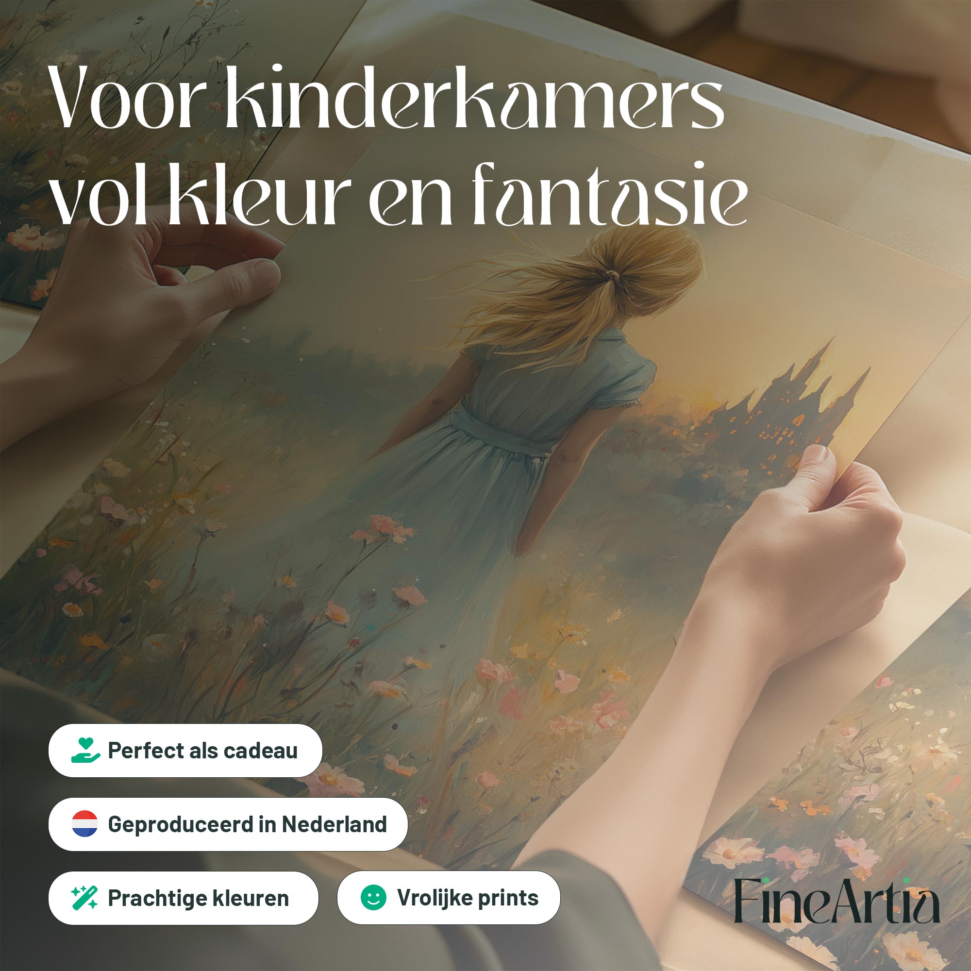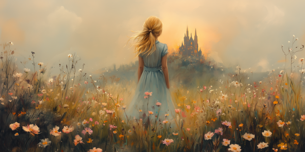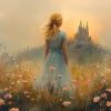 Betoverend Bloemenveld met Kasteel en Blauwe Jurk