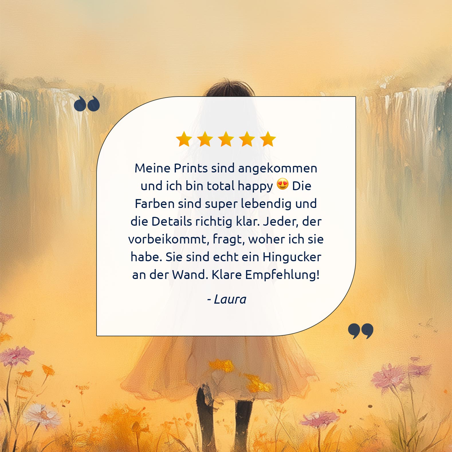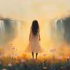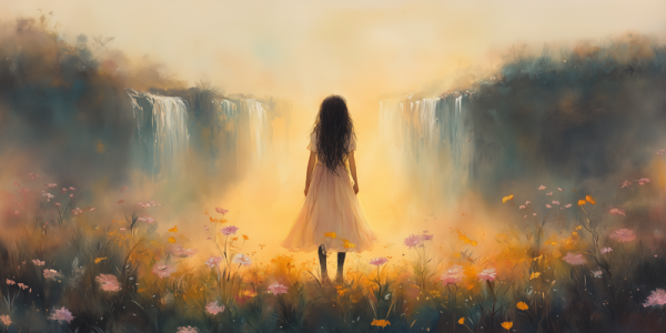 Betoverend bloemenveld met waterval en dromerige vrouw