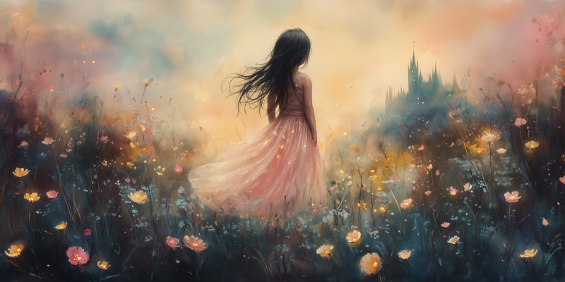 Betoverend Kasteel met Roze Jurk in Bloemenveld