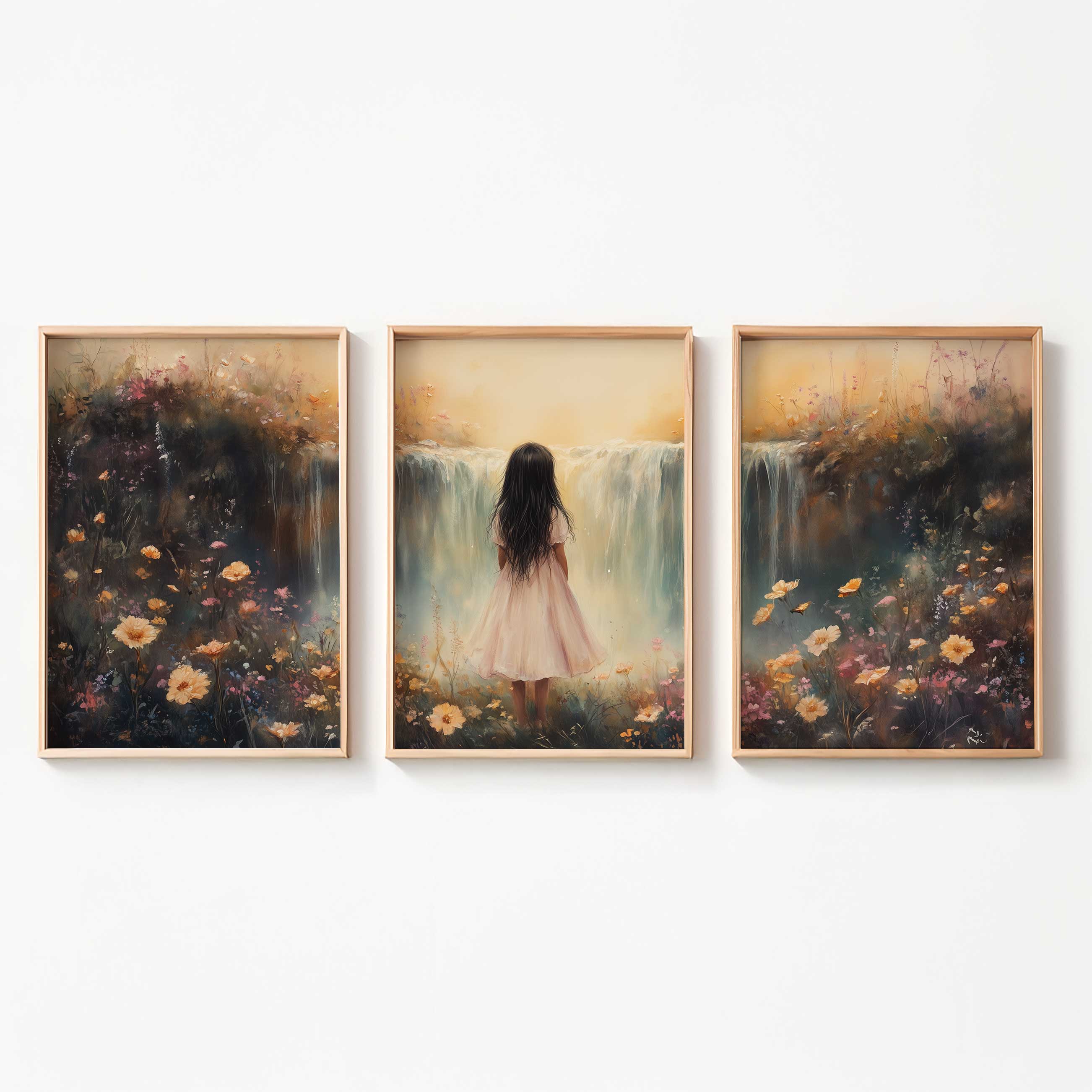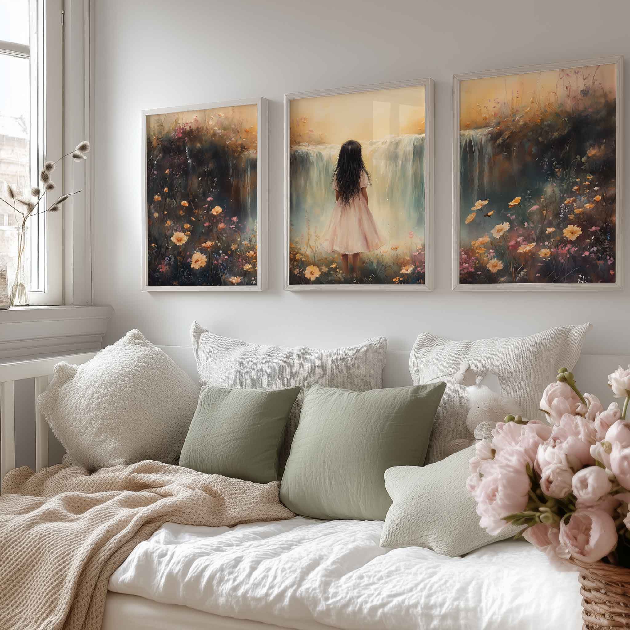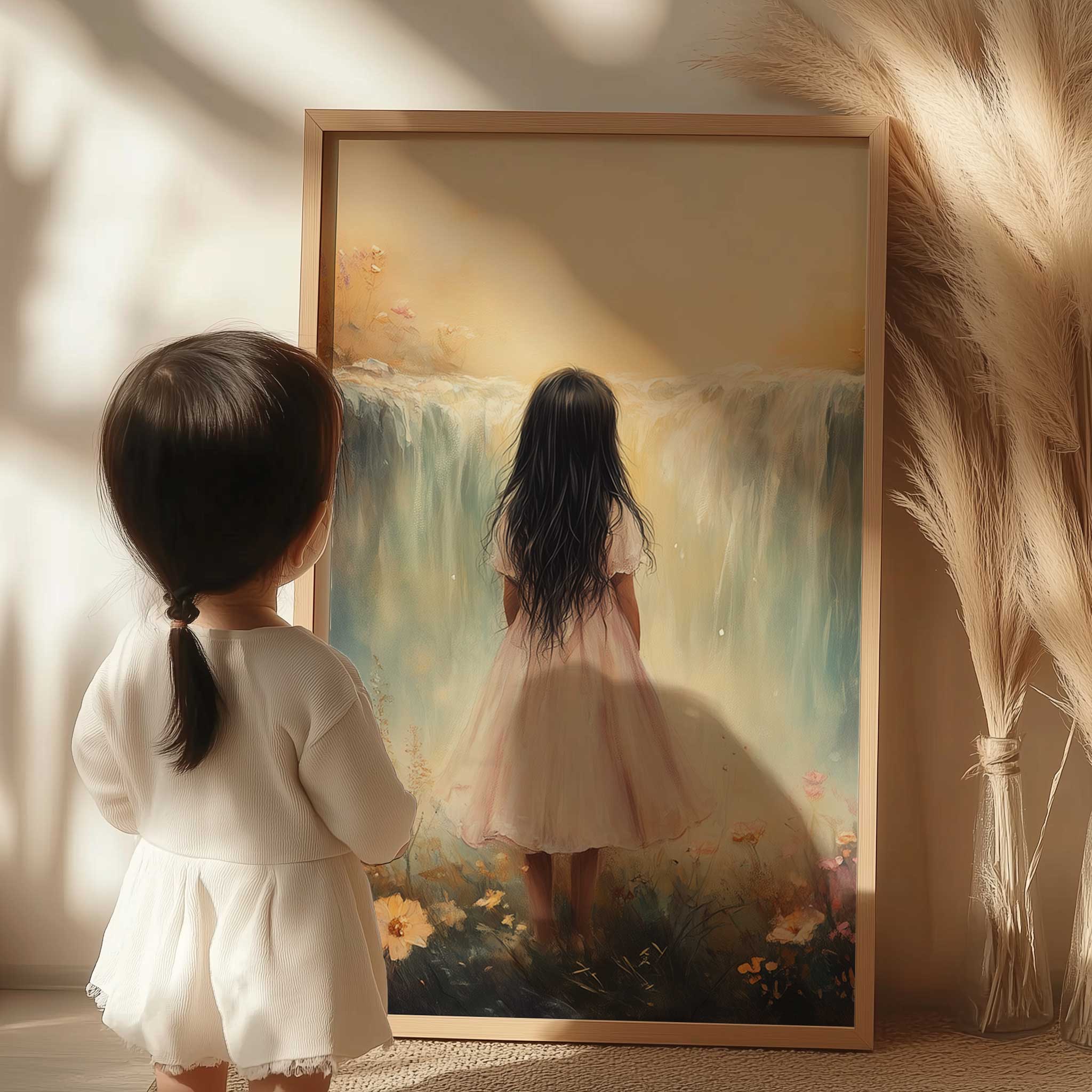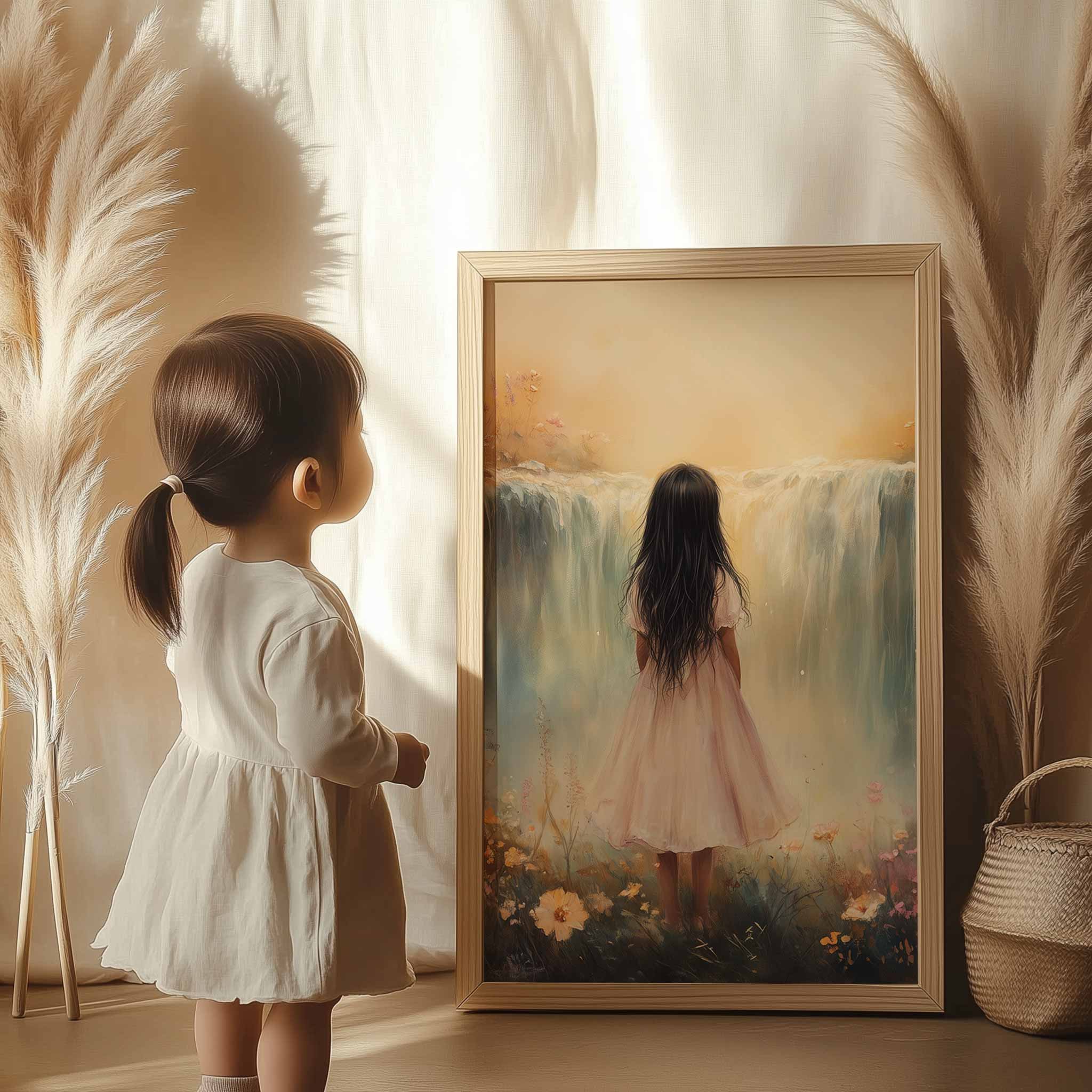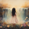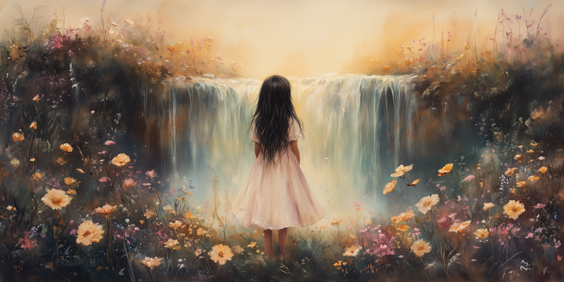 Betoverend Meisje bij Waterval in Pastel Bloemenveld