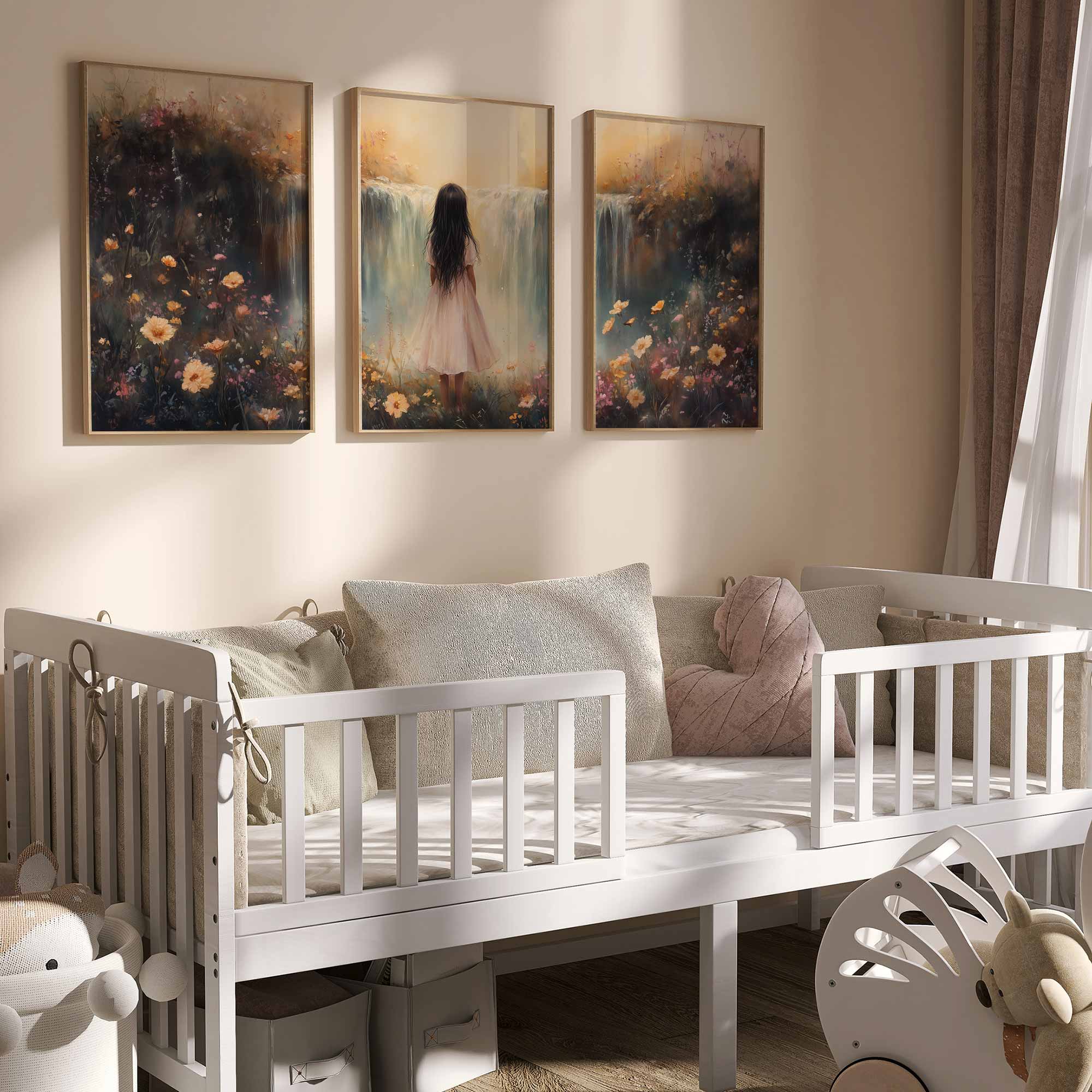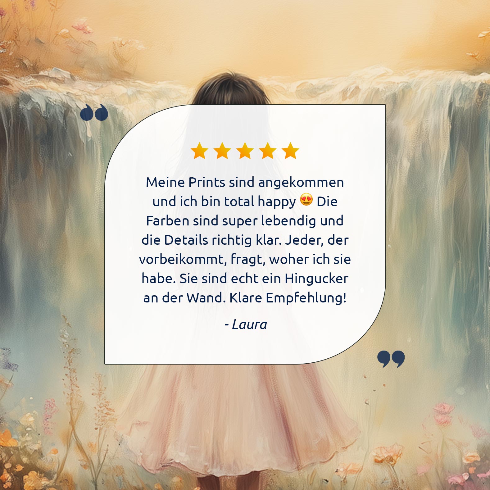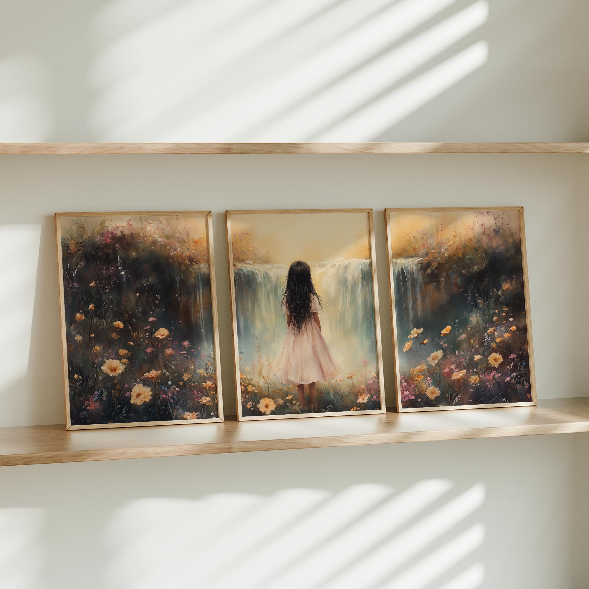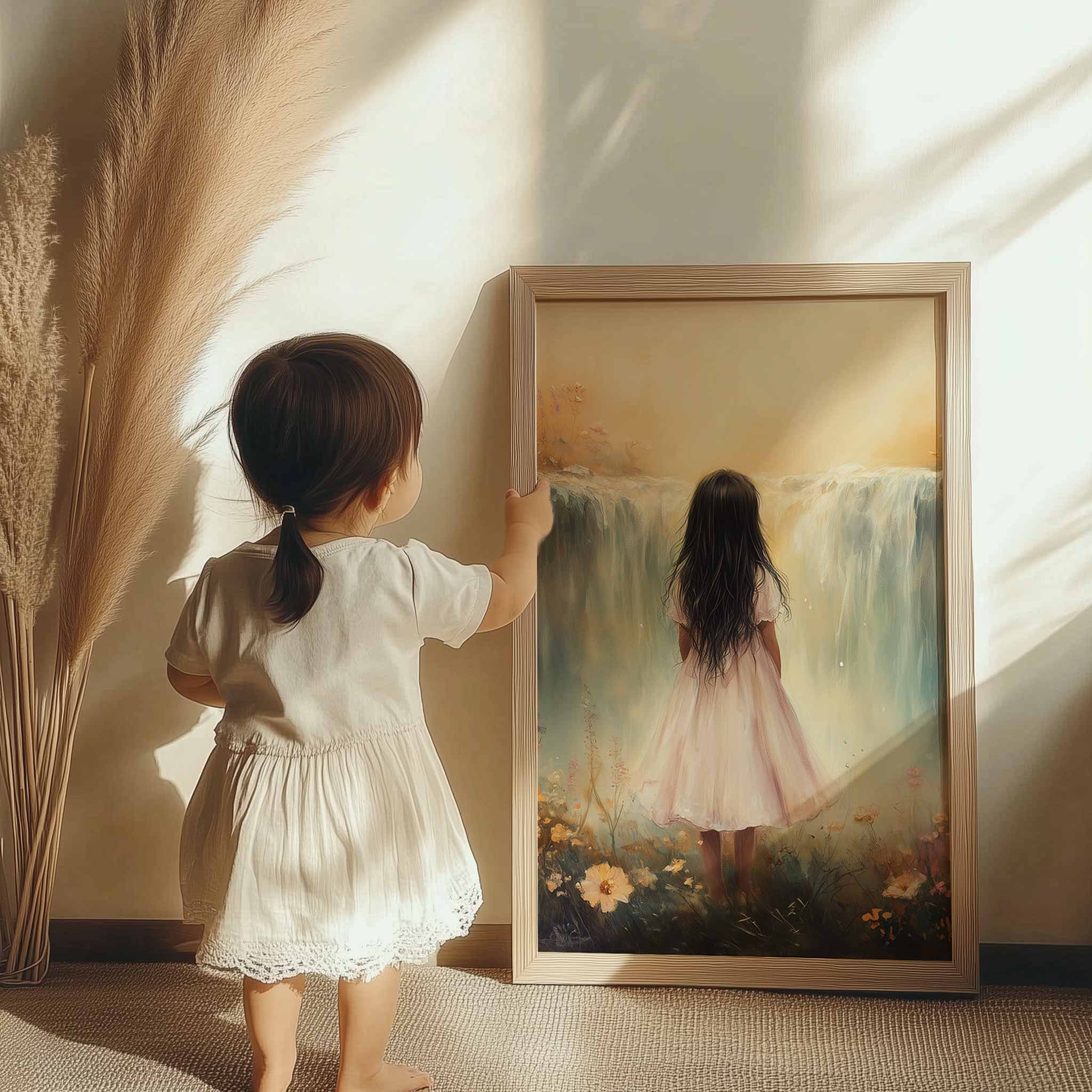 Betoverend Meisje bij Waterval in Pastel Bloemenveld