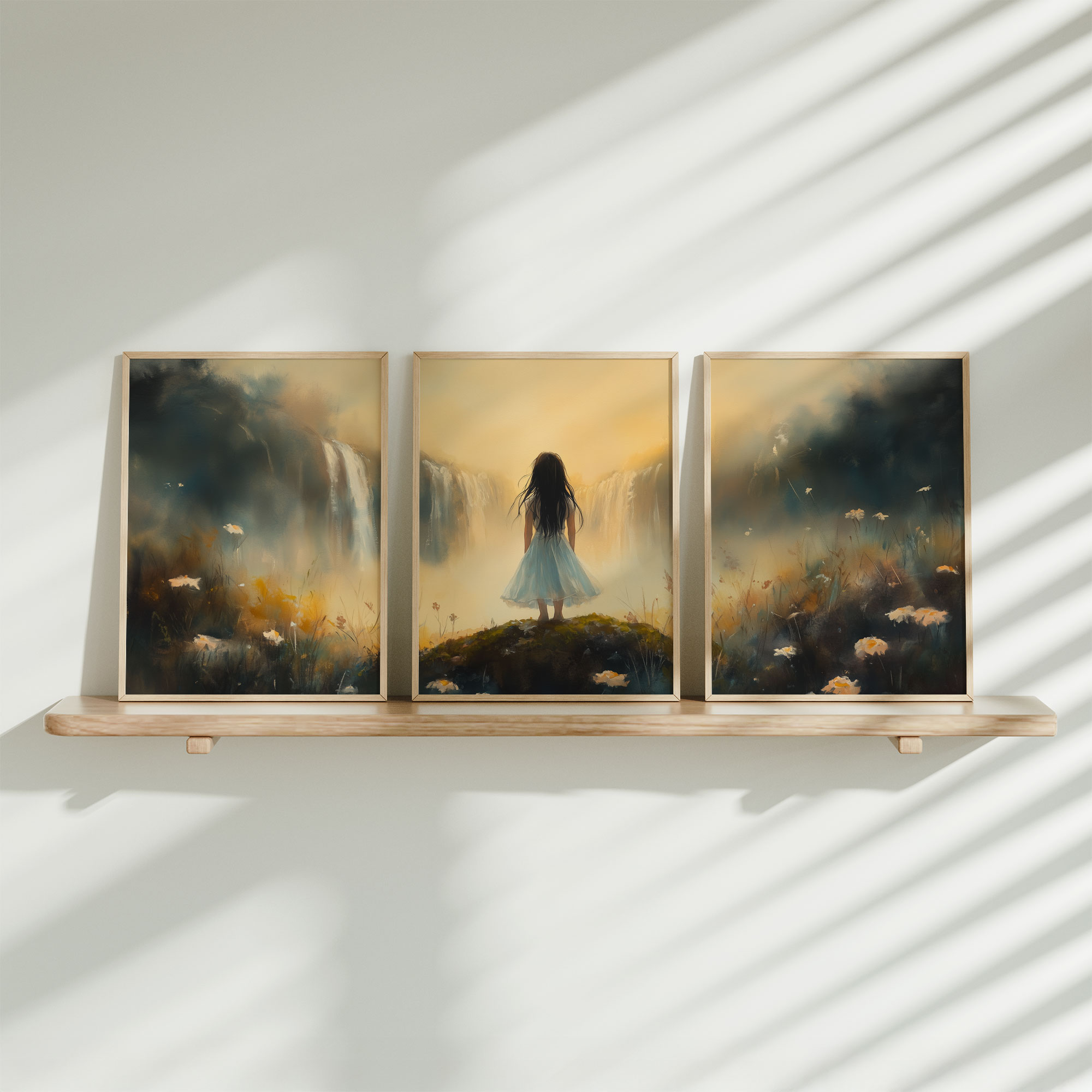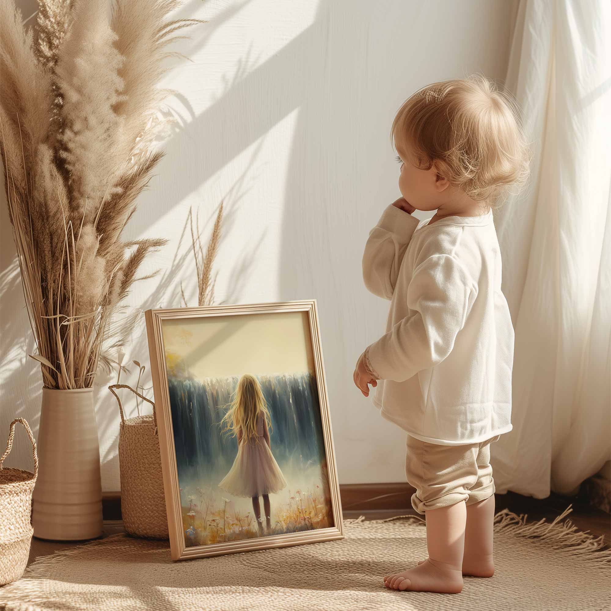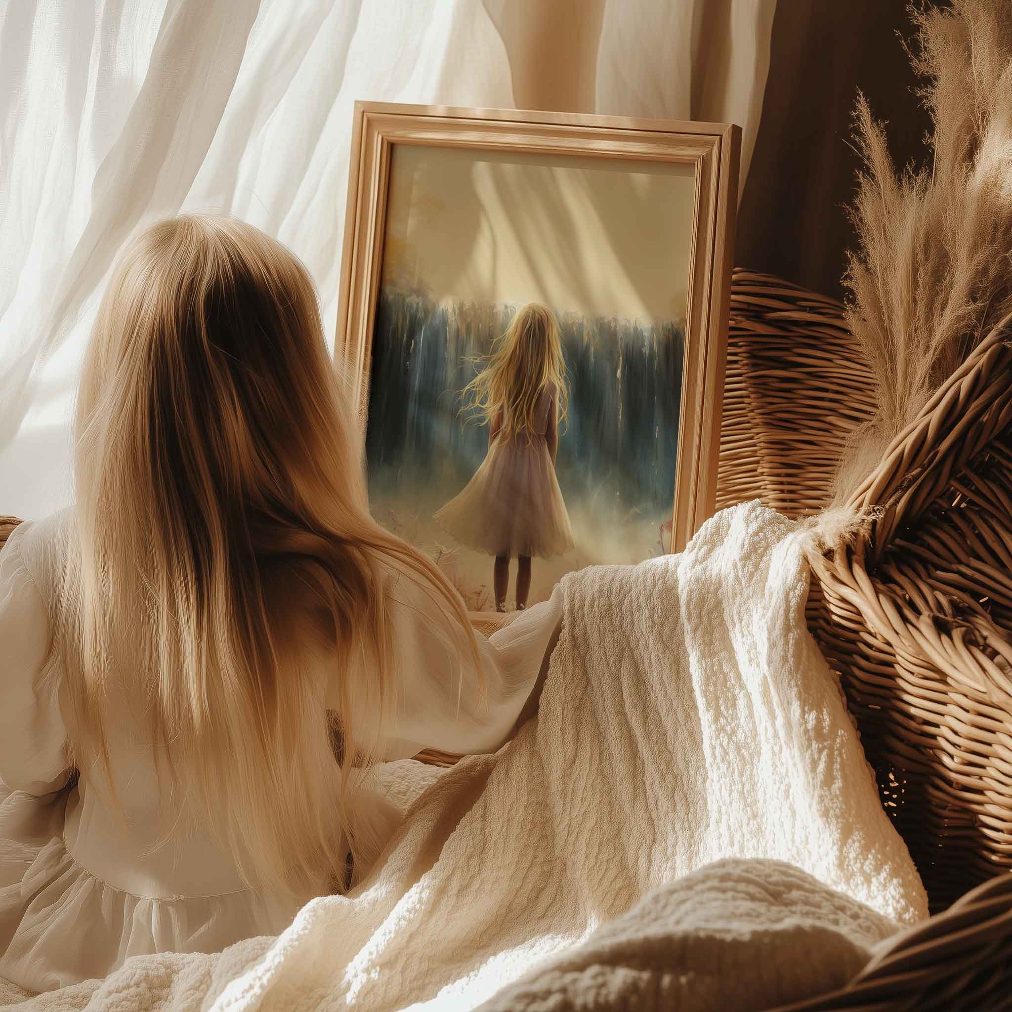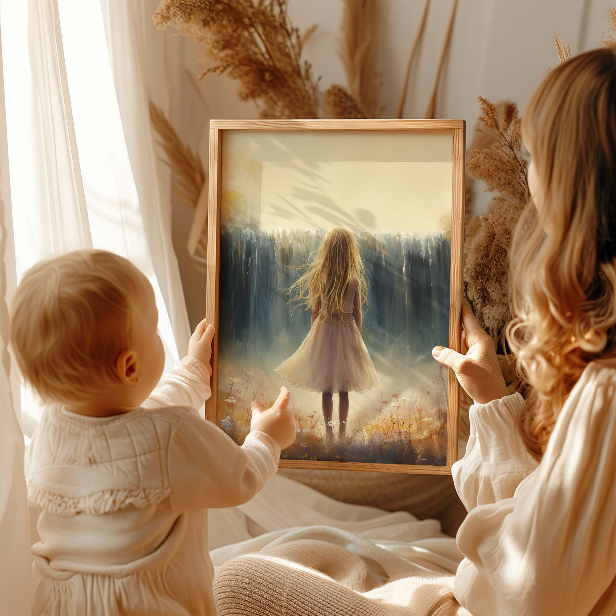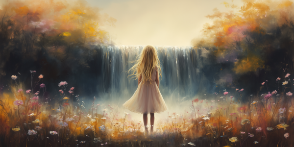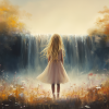 Betoverend Meisje bij Waterval in Pastel Droomwereld