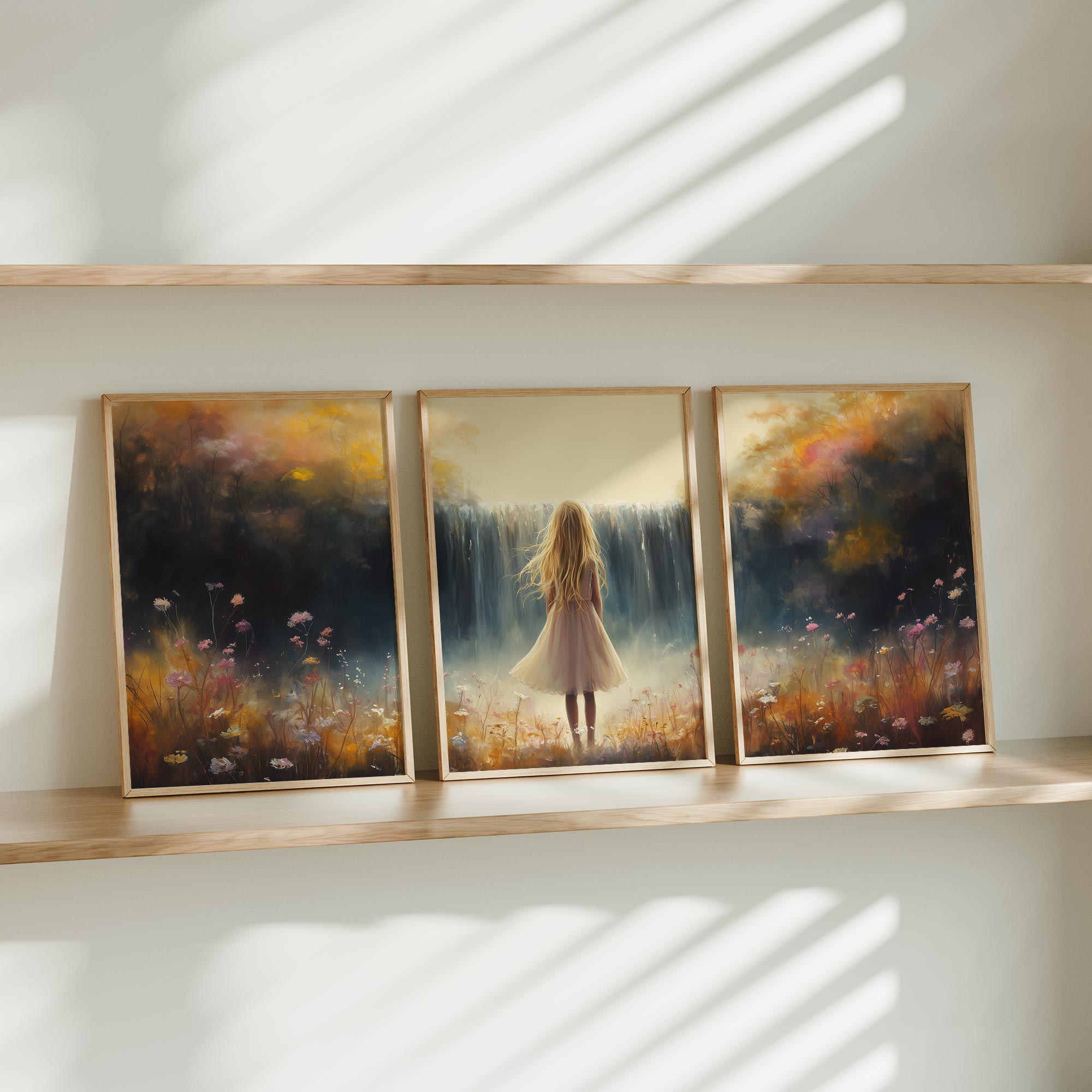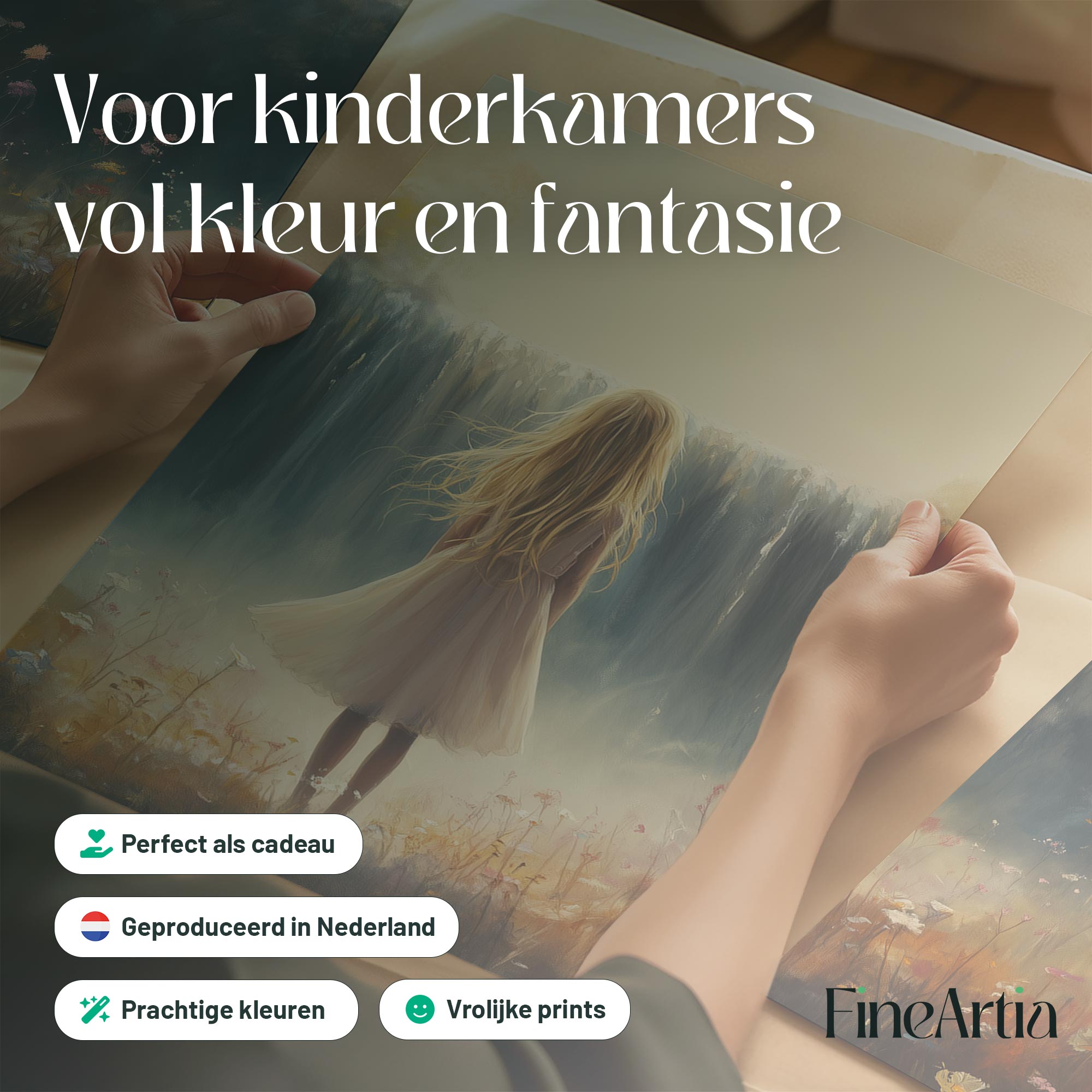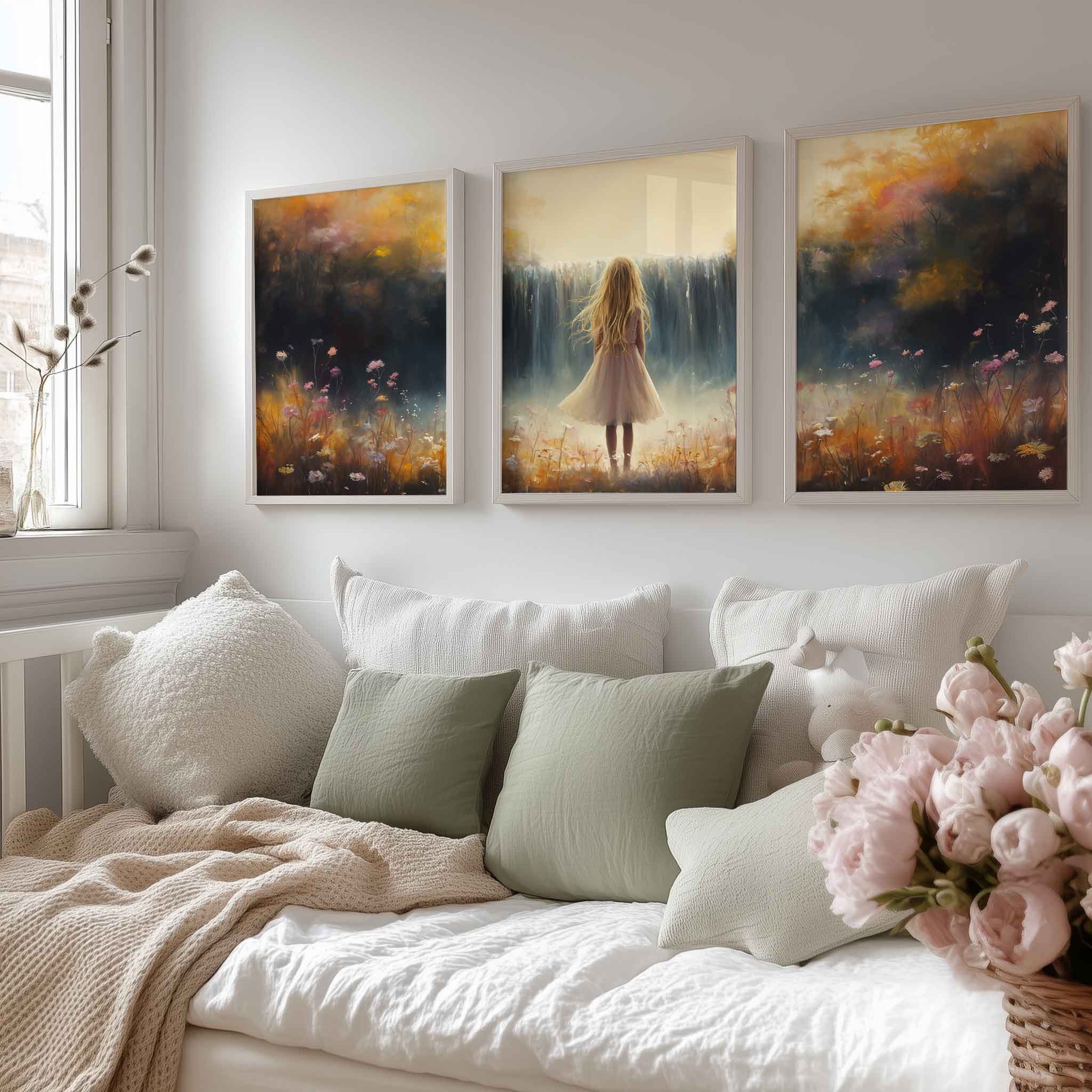 Betoverend Meisje bij Waterval in Pastel Droomwereld