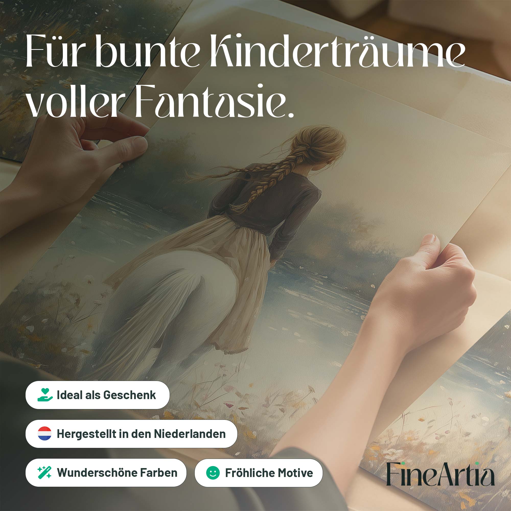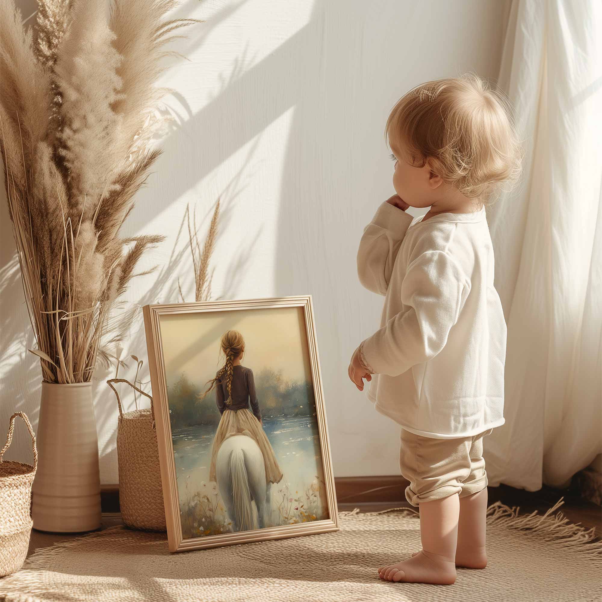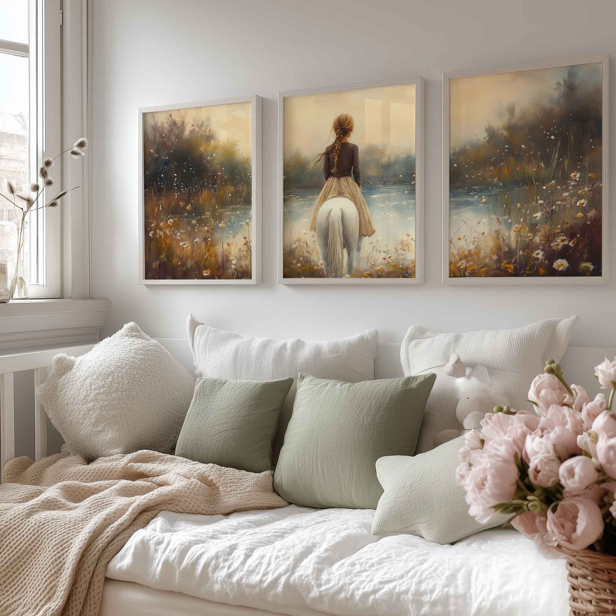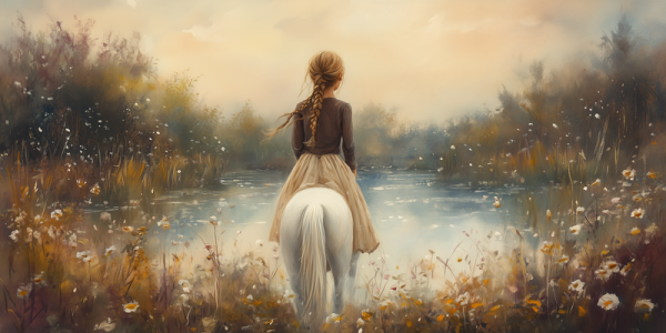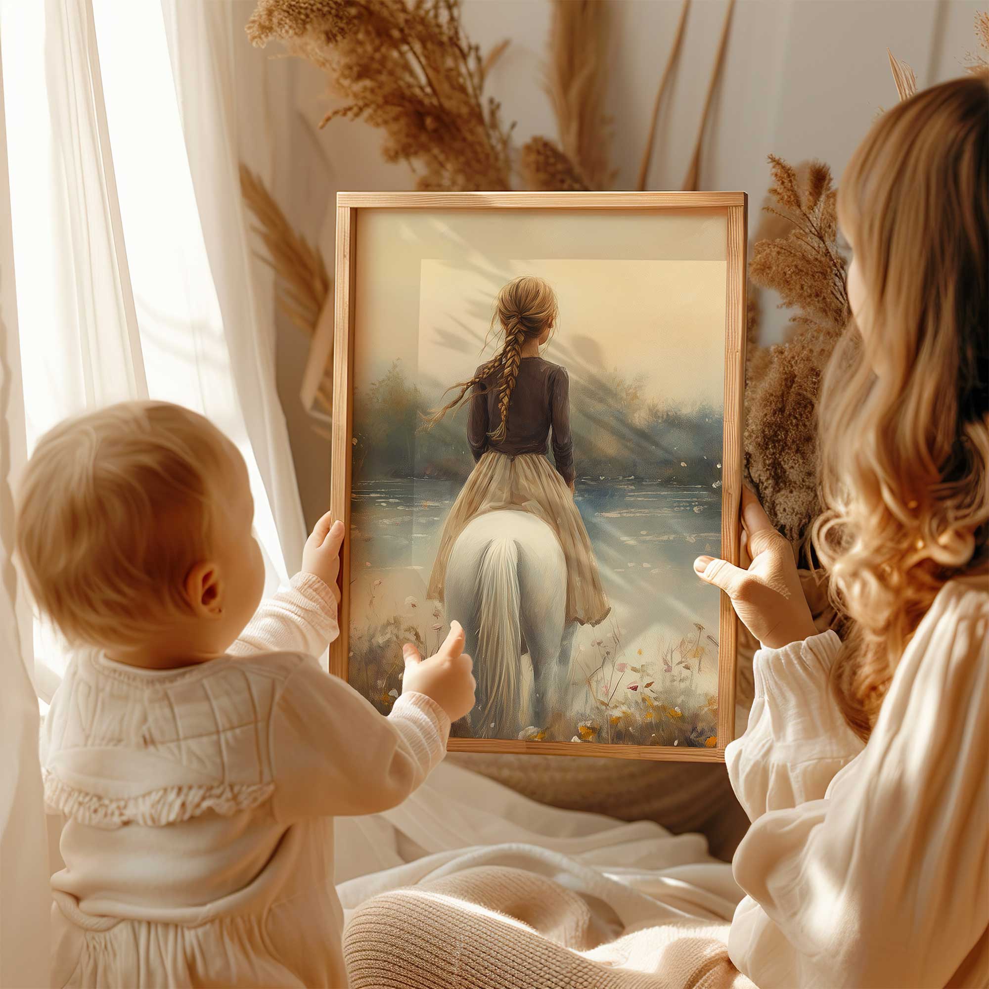 Terug naar collectie Posters Betoverend Meisje op Wit Paard in Bloemenveld