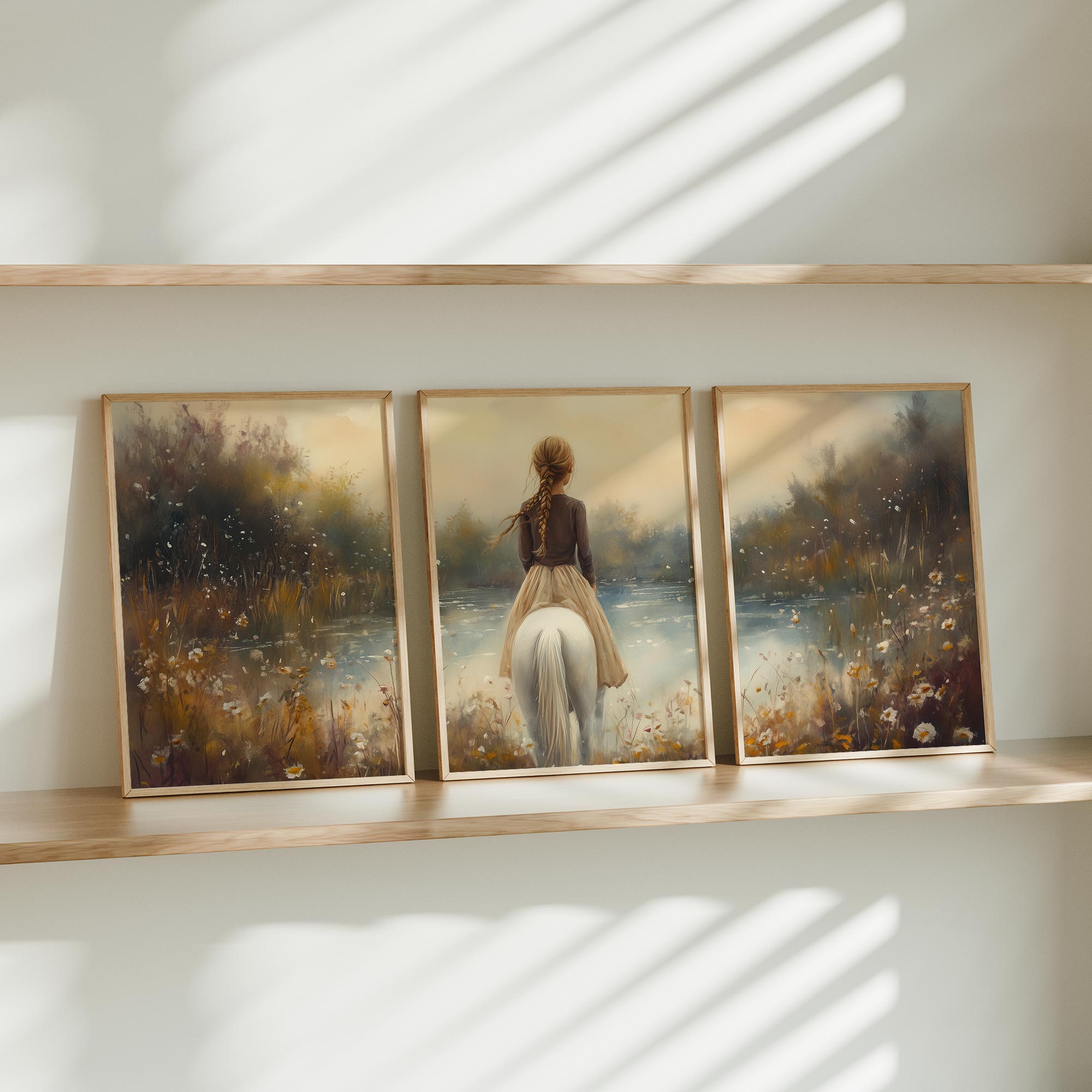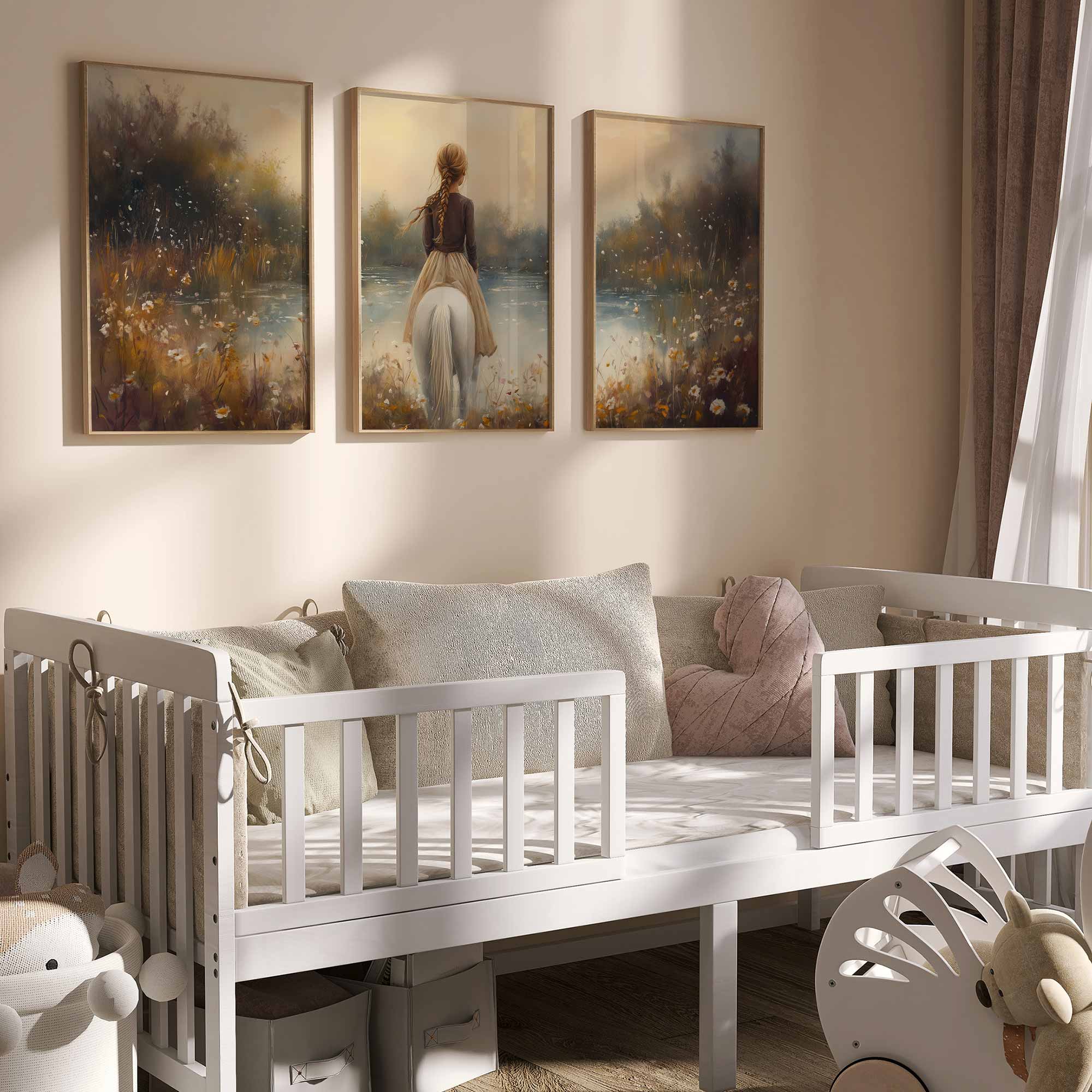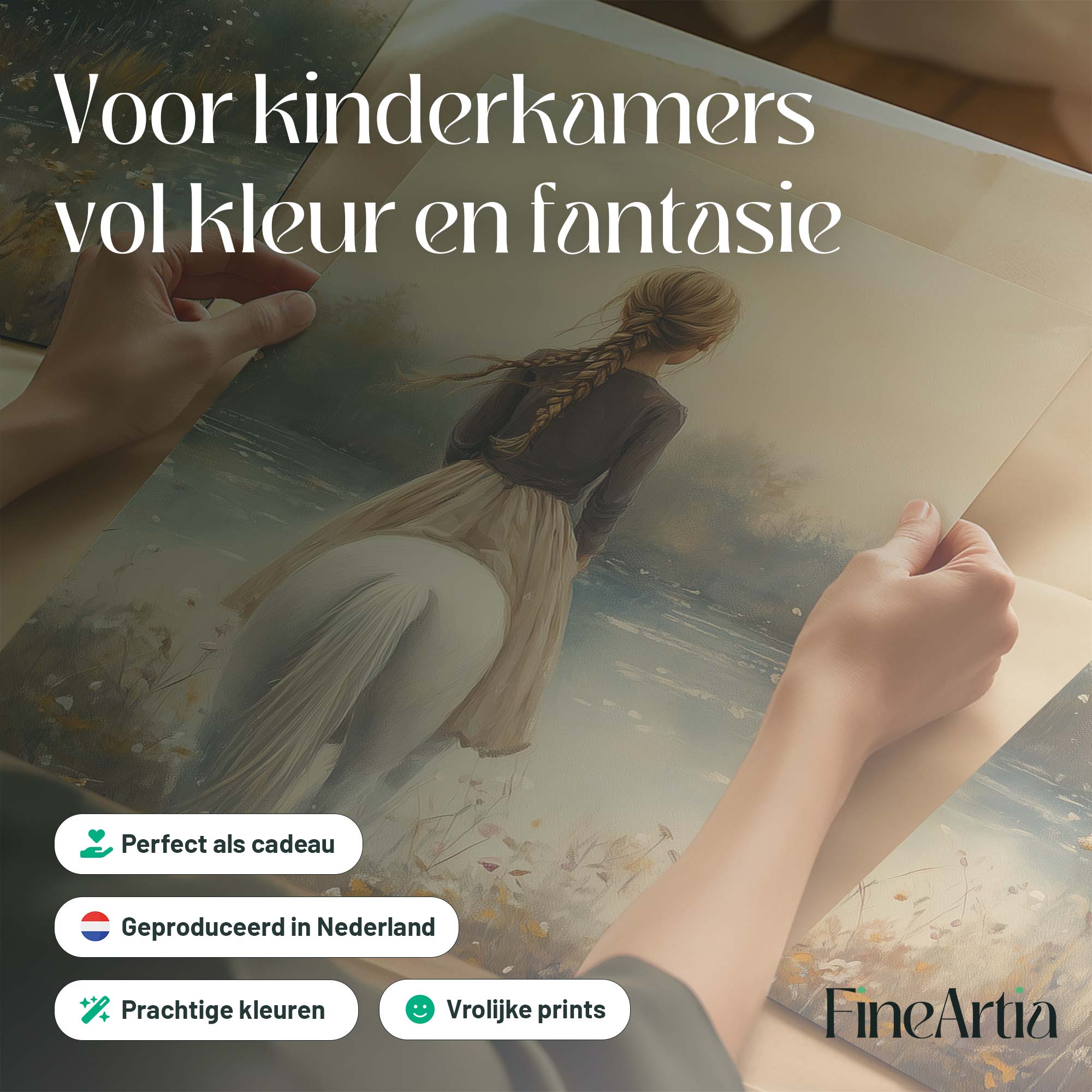 Terug naar collectie Posters Betoverend Meisje op Wit Paard in Bloemenveld