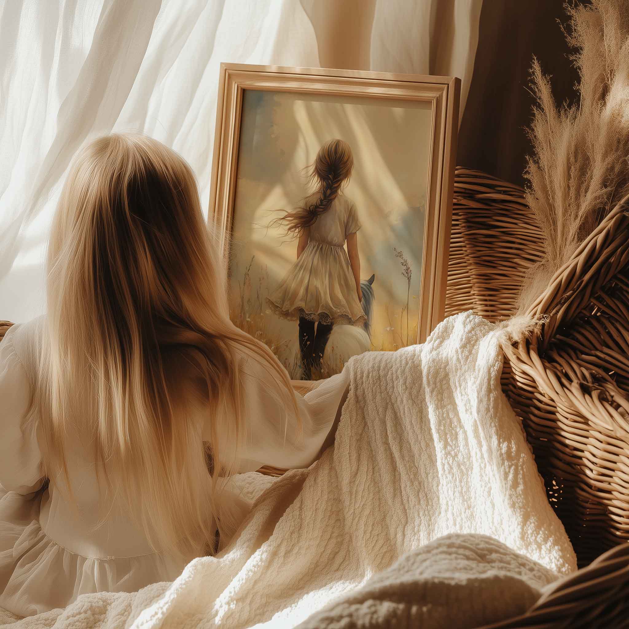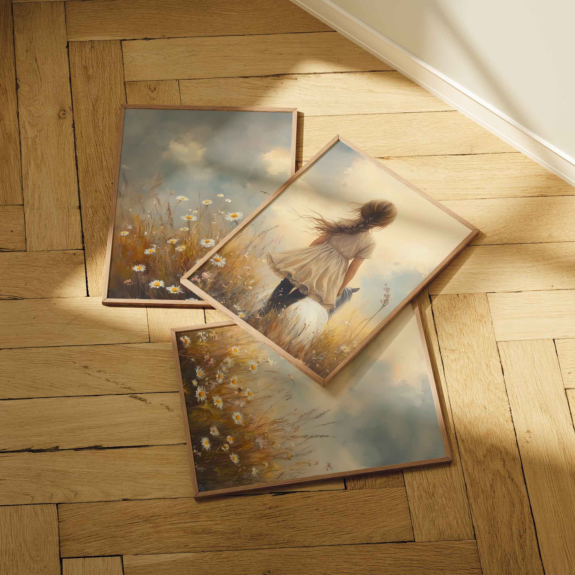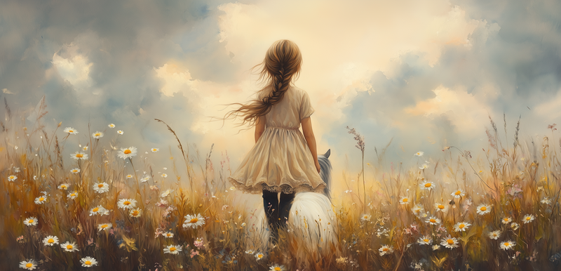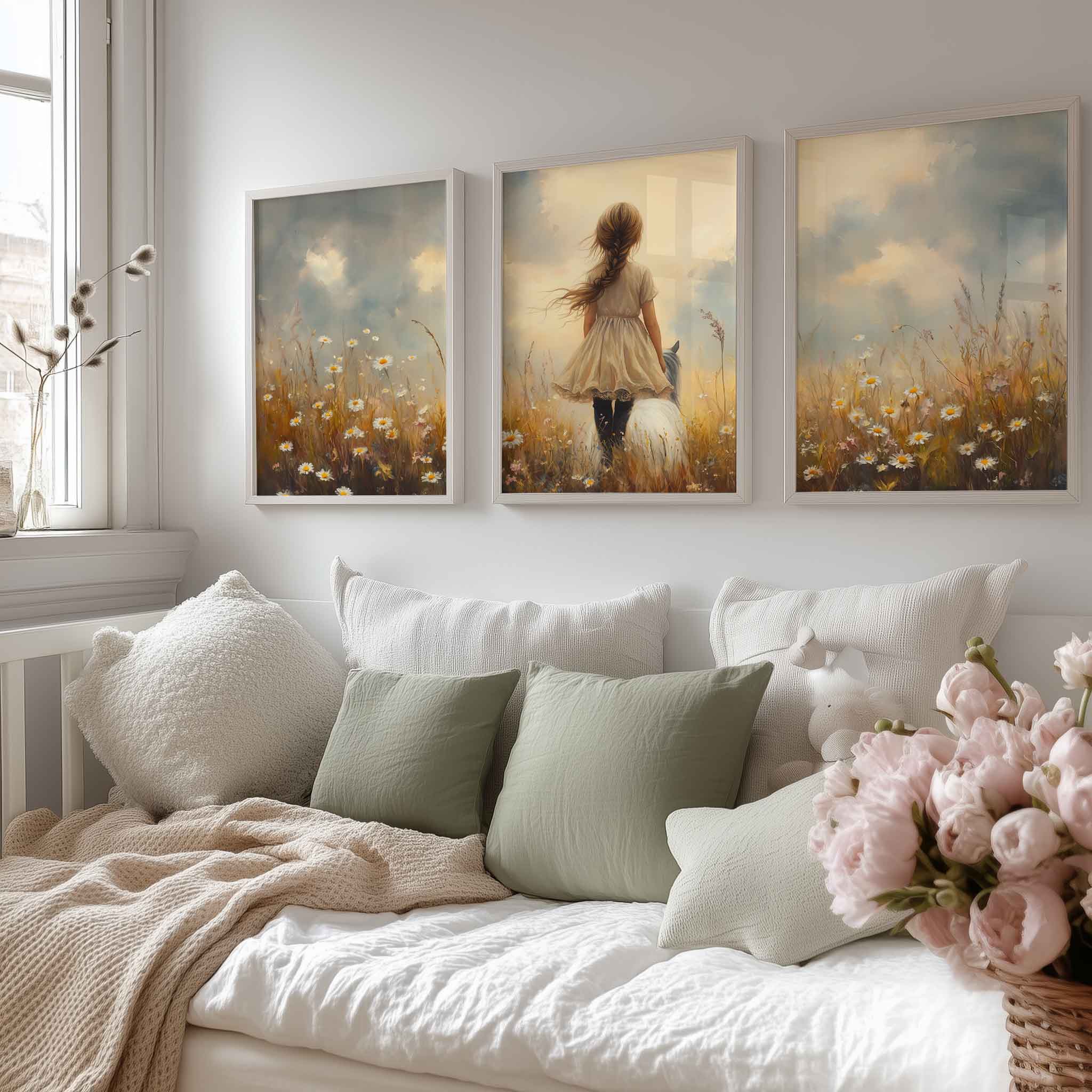 Bloemenveld met meisje en paard – zachte droomdecoratie