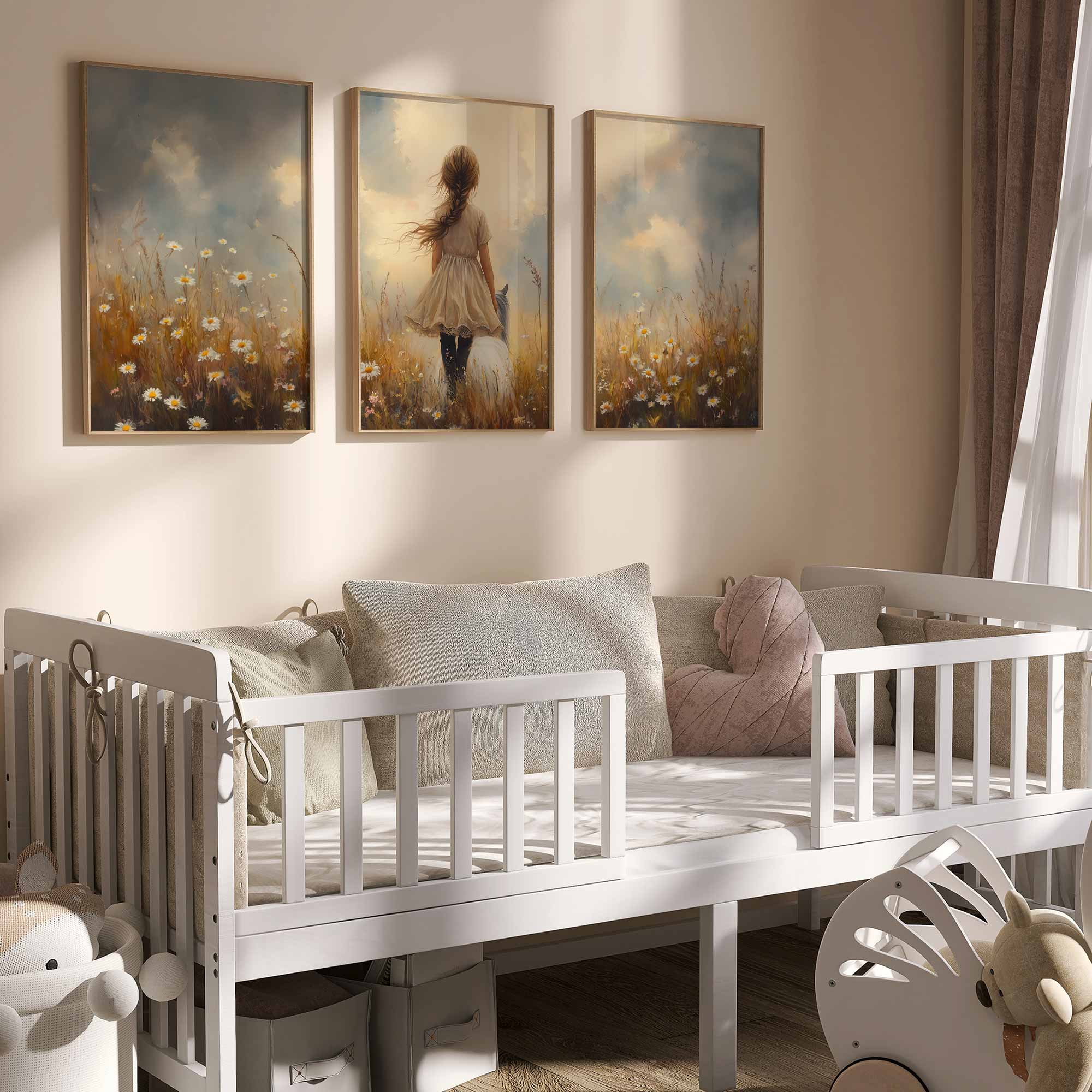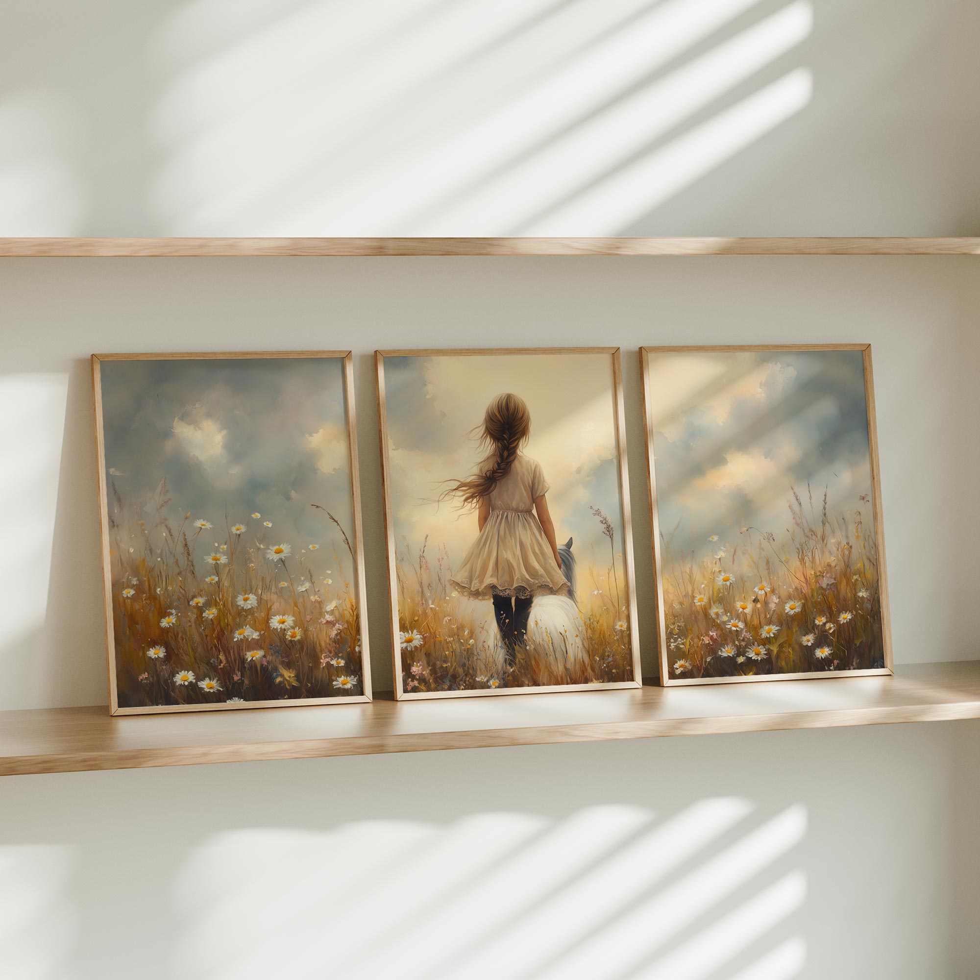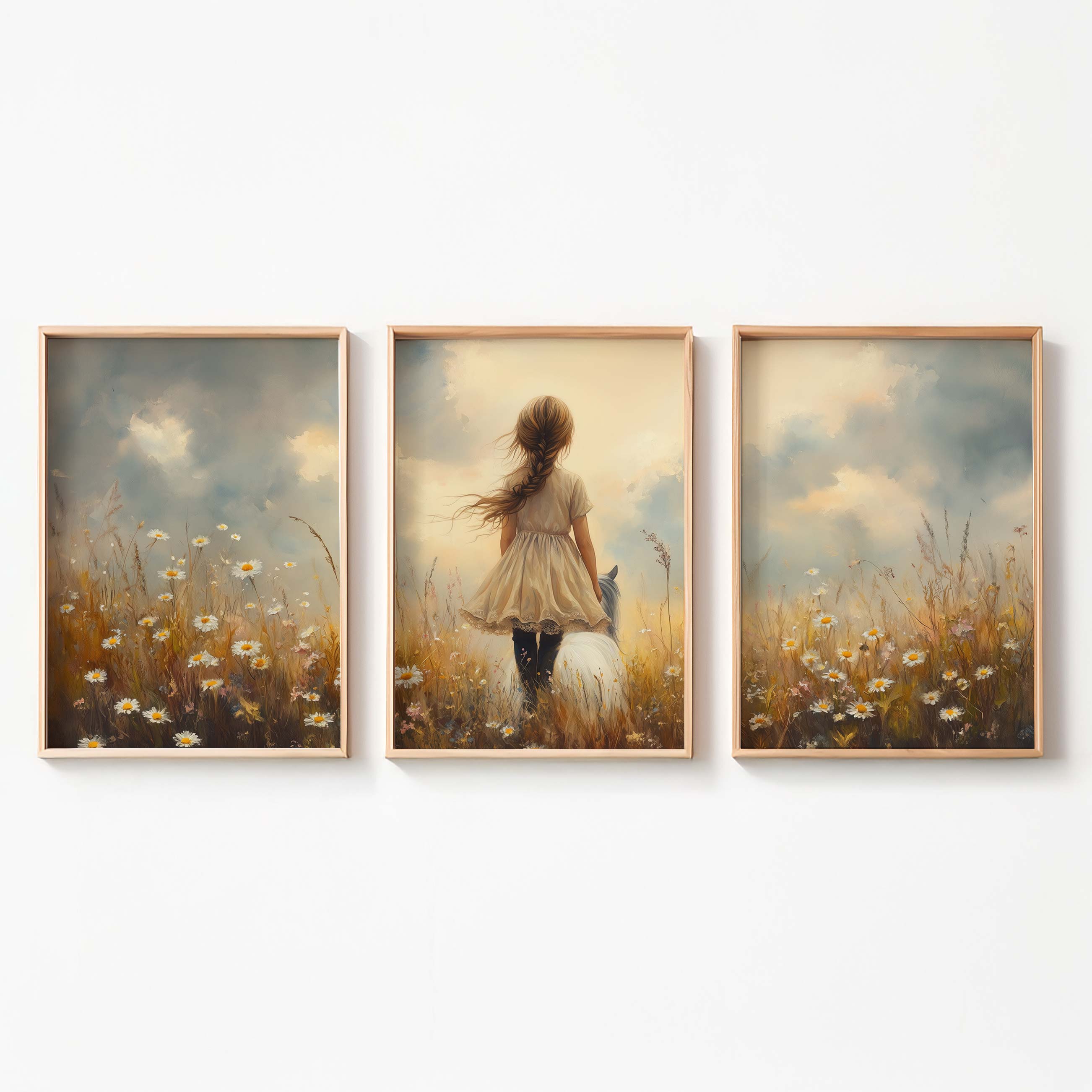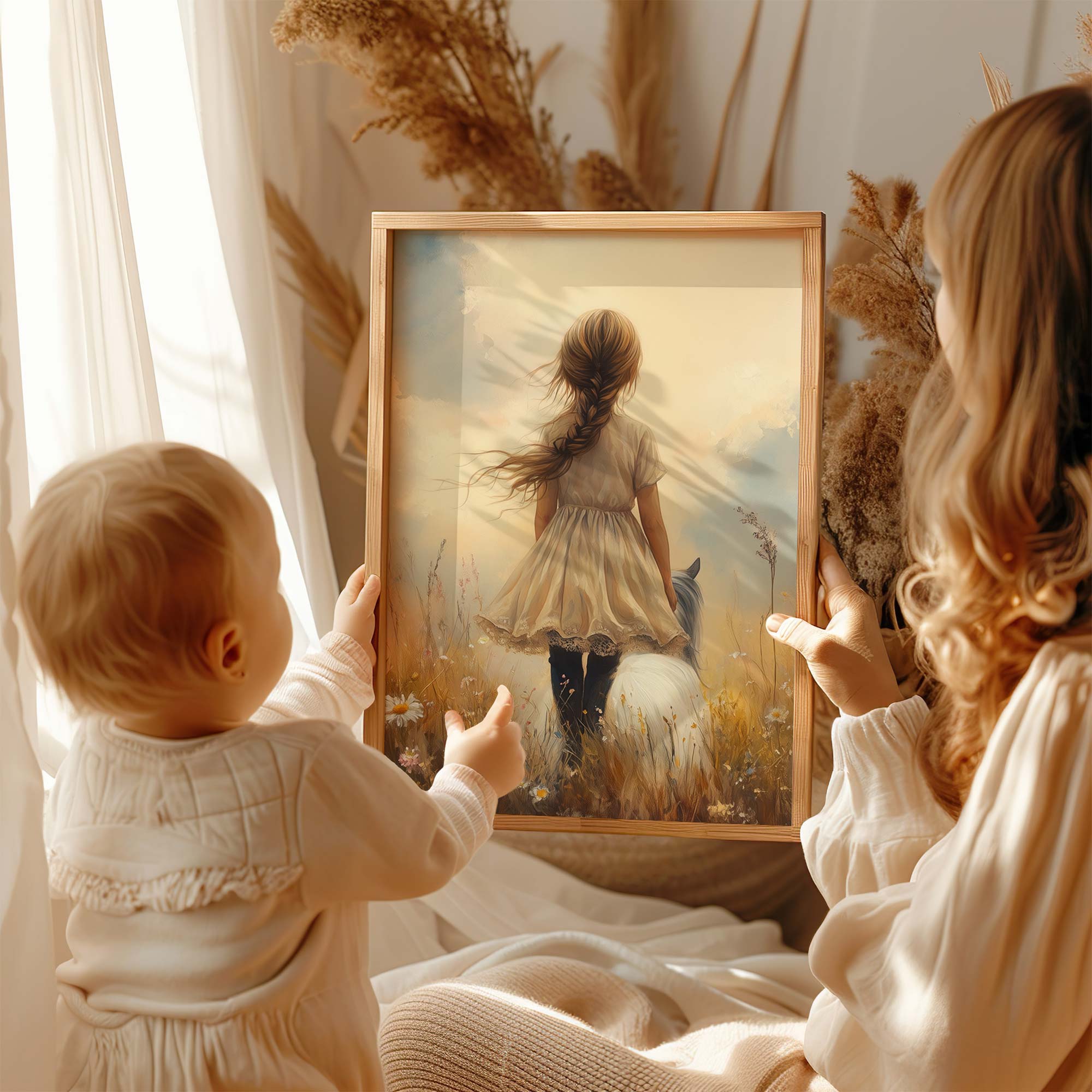 Bloemenveld met meisje en paard – zachte droomdecoratie