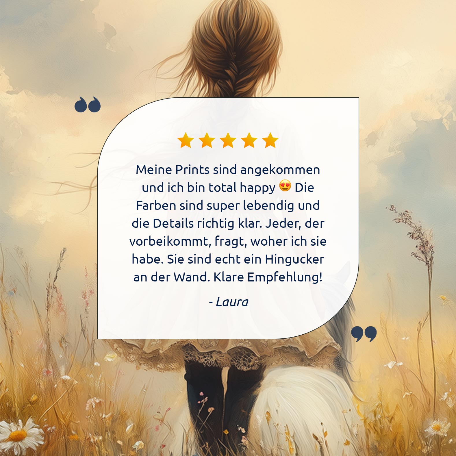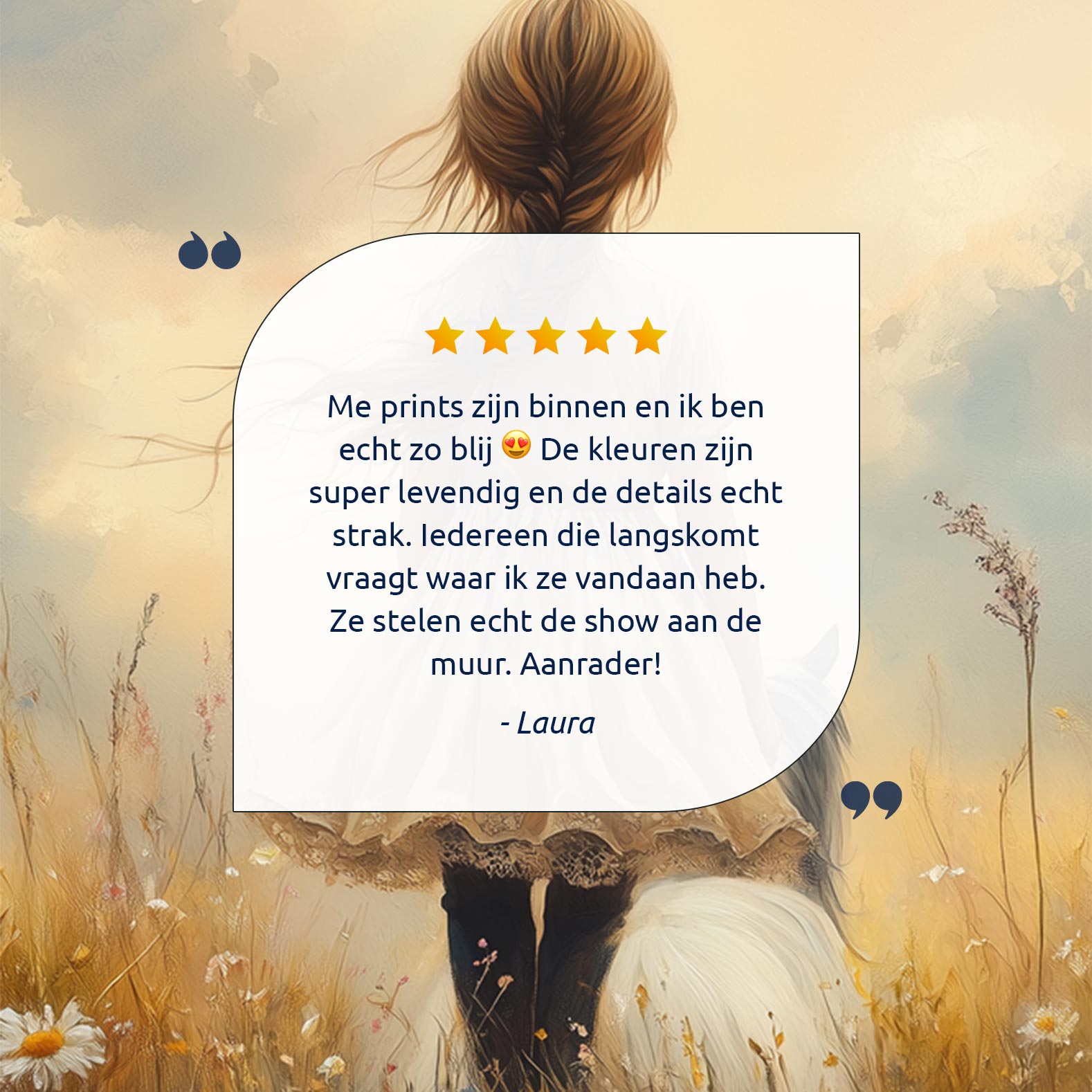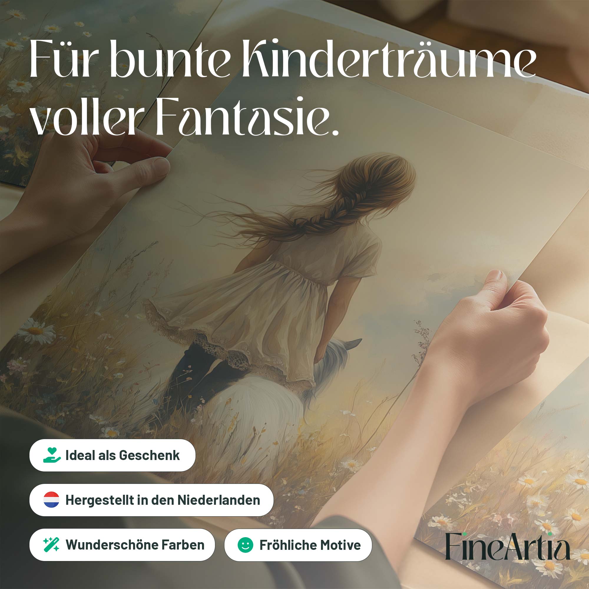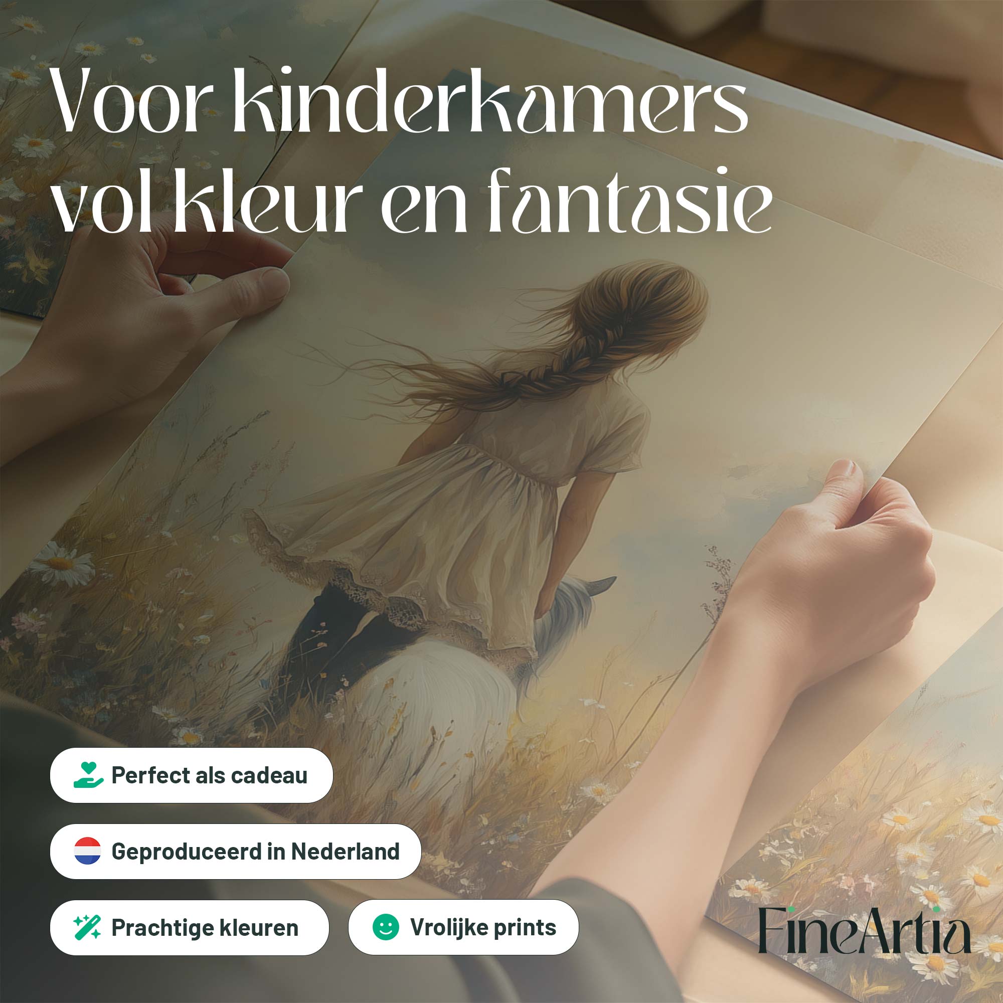 Bloemenveld met meisje en paard – zachte droomdecoratie