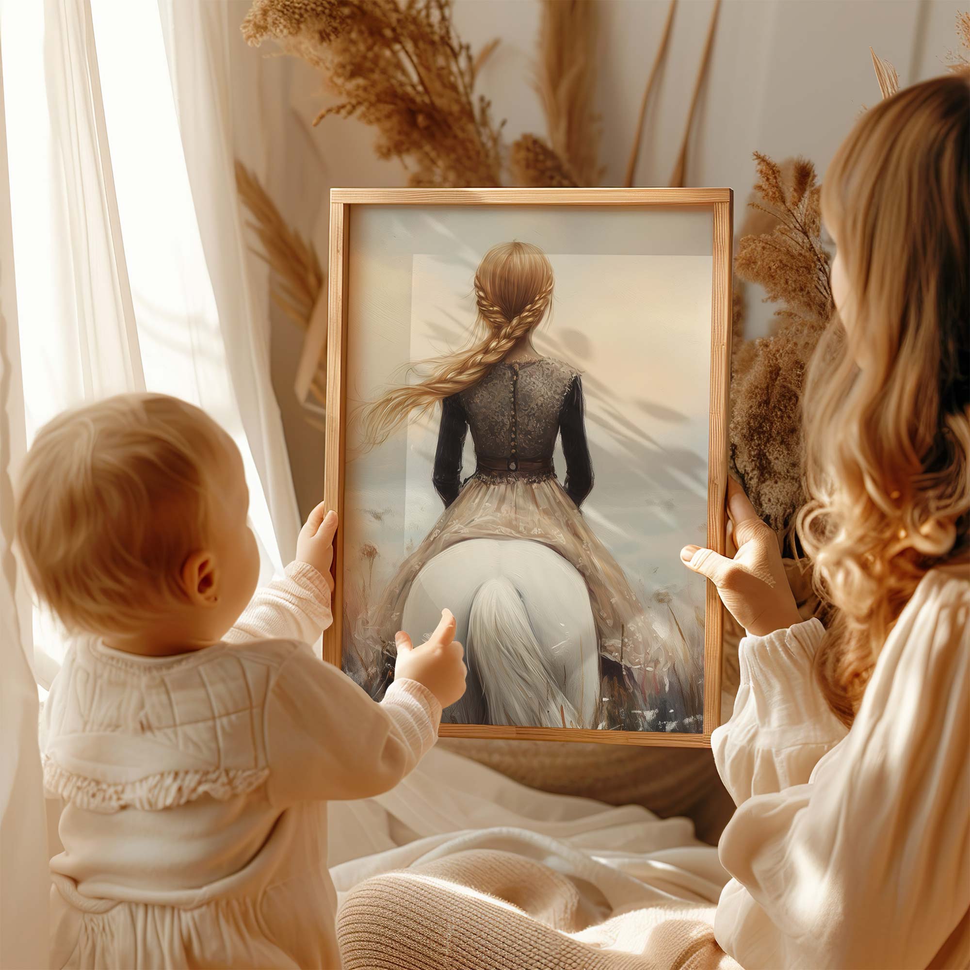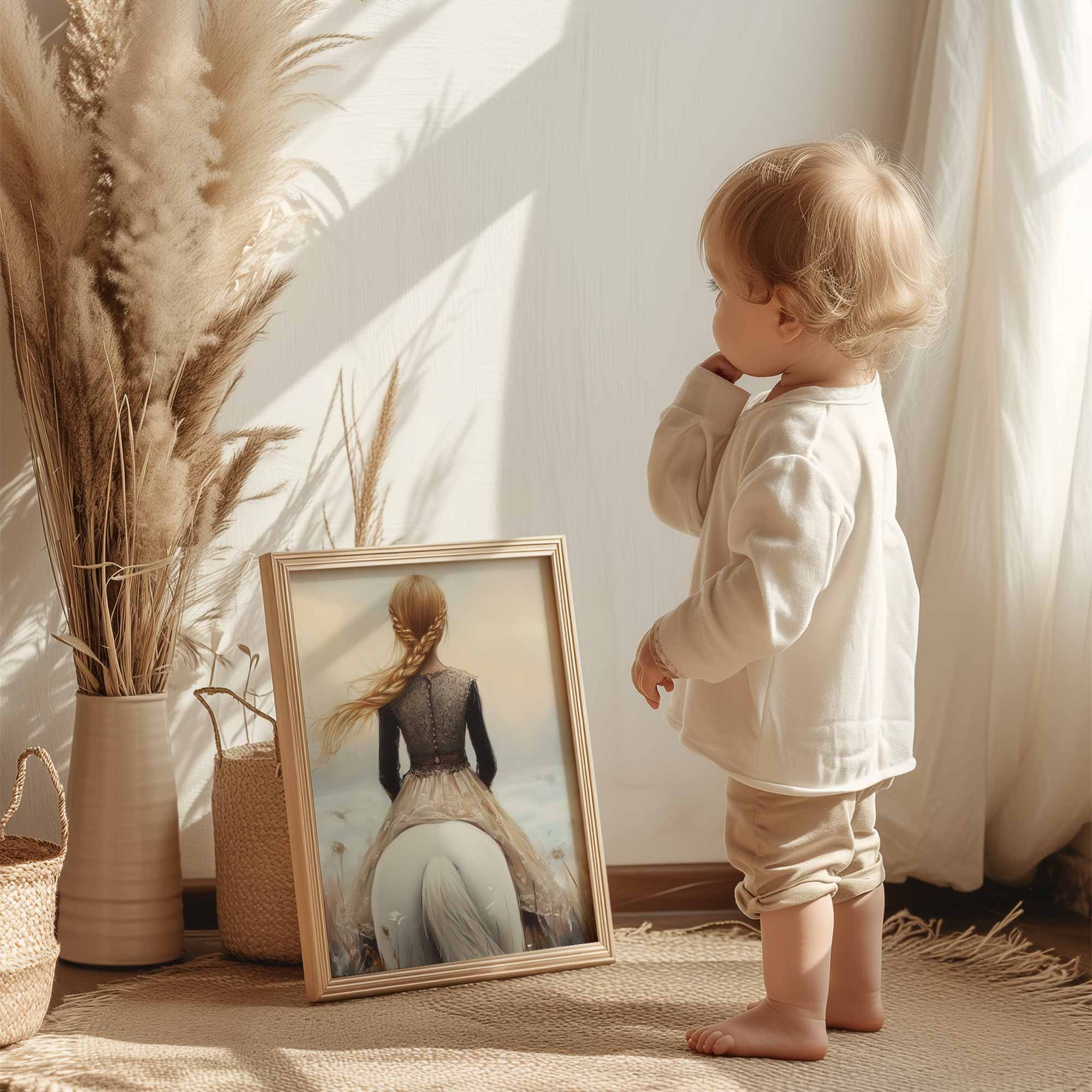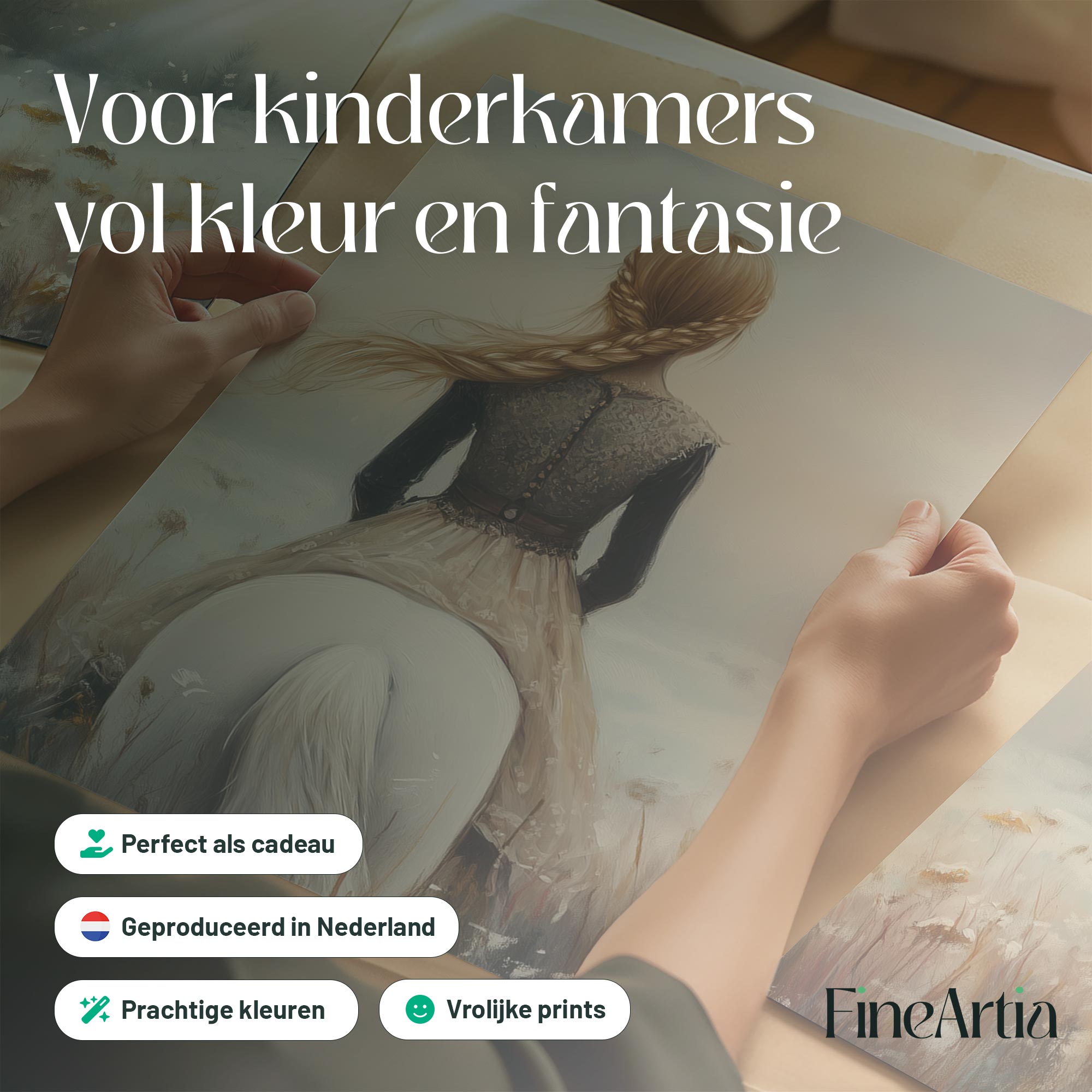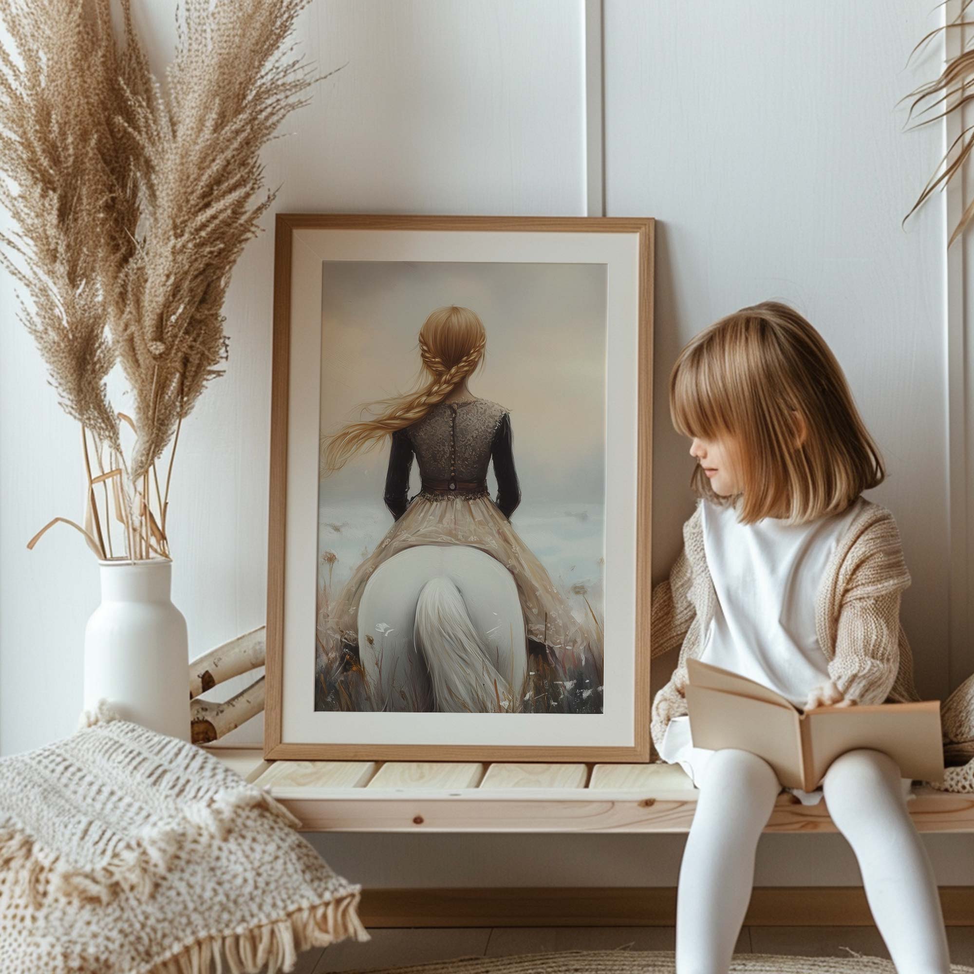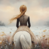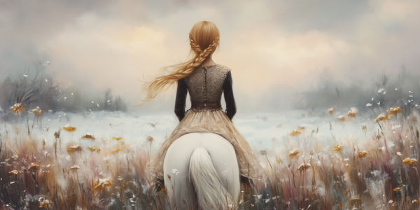 Blonde Droom in Pastel: Vrouw te Paard tussen Bloemen
