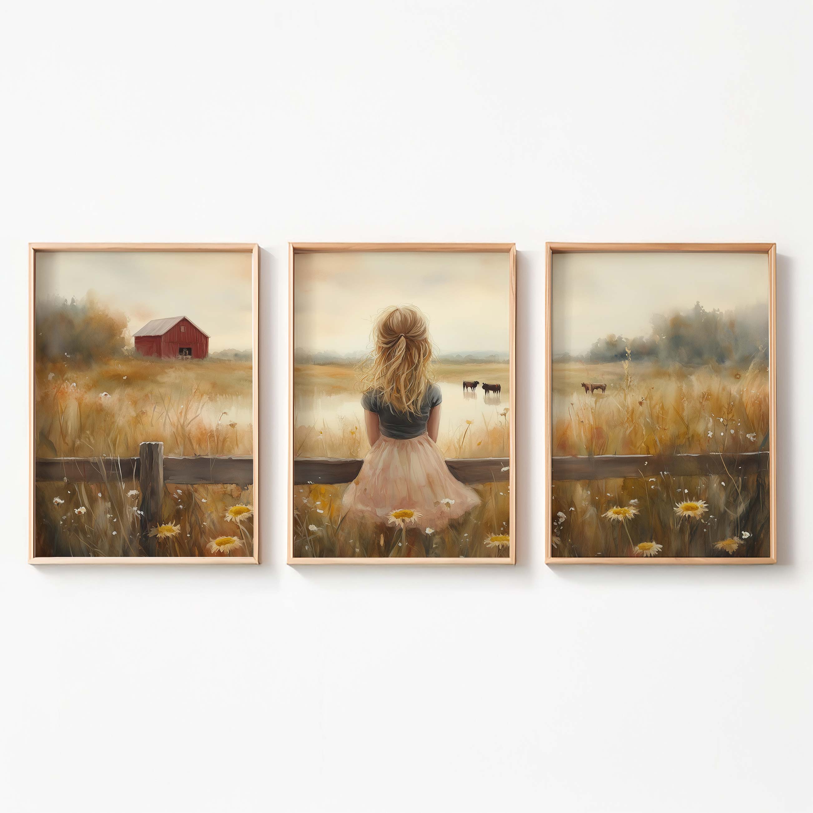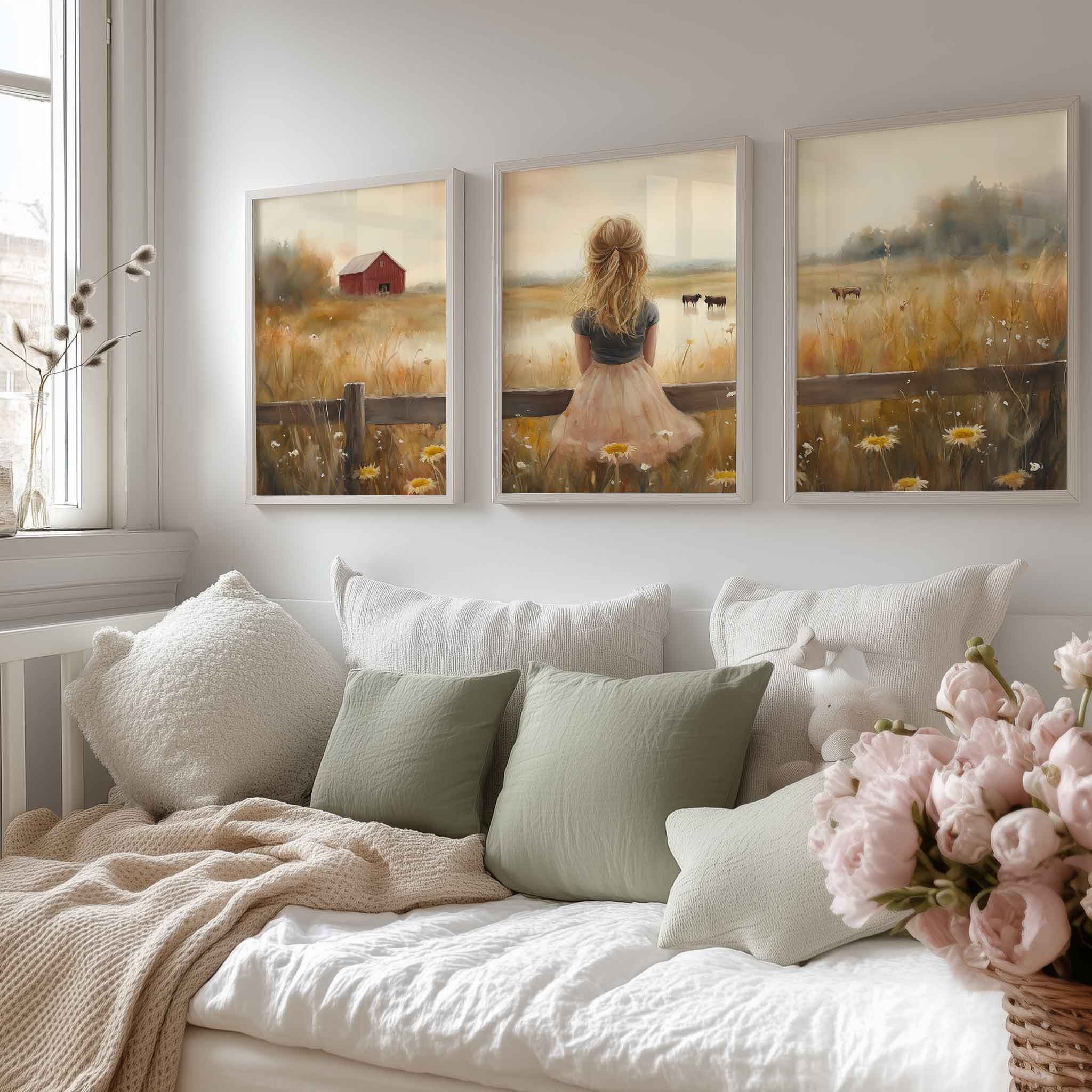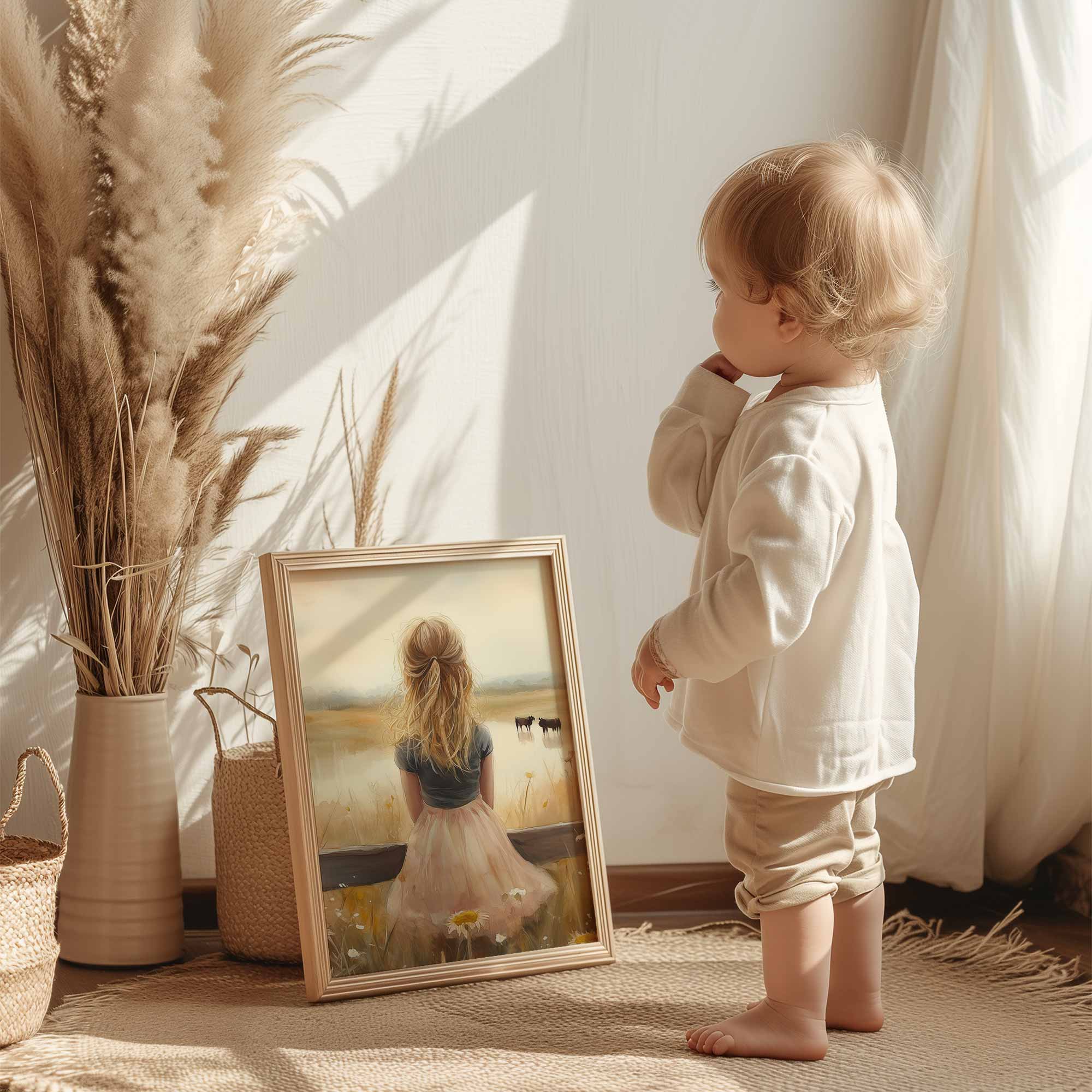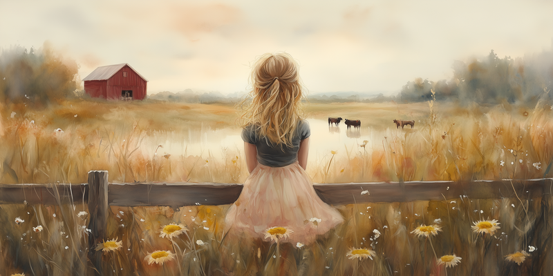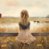 Blonde Meisje in Roze op Hek tussen Bloemenveld