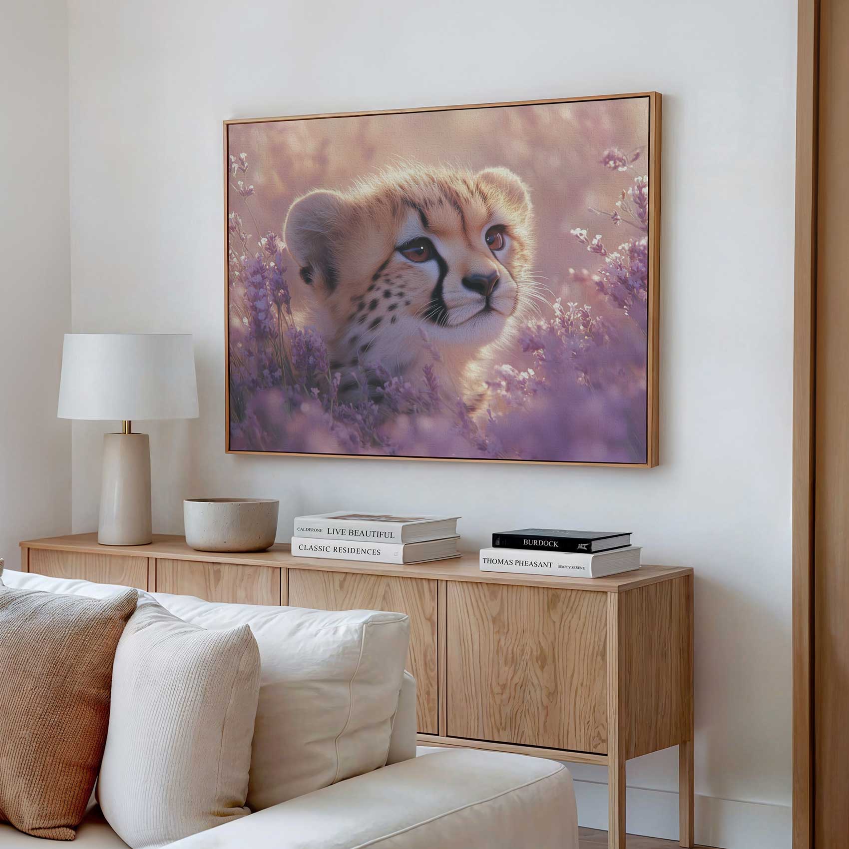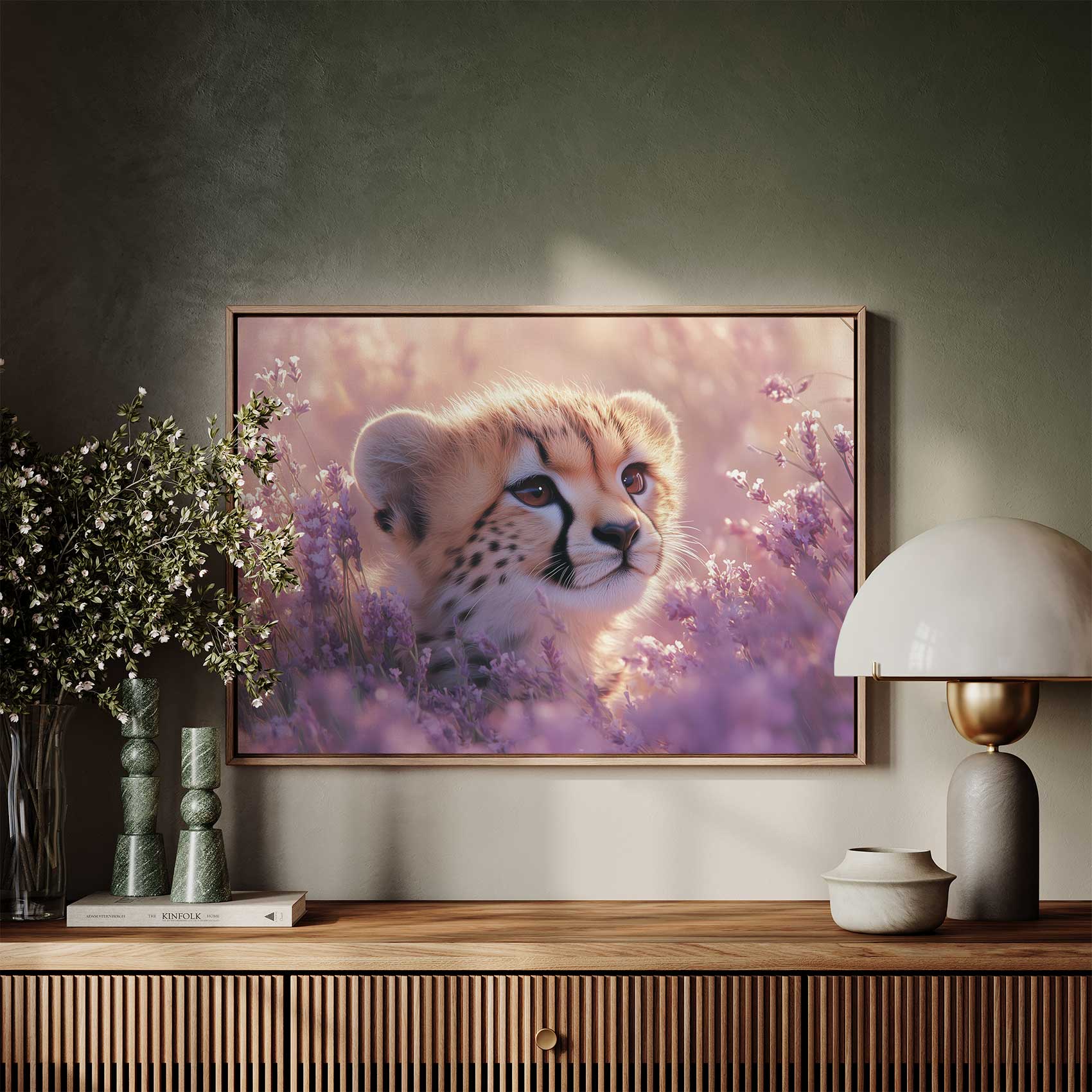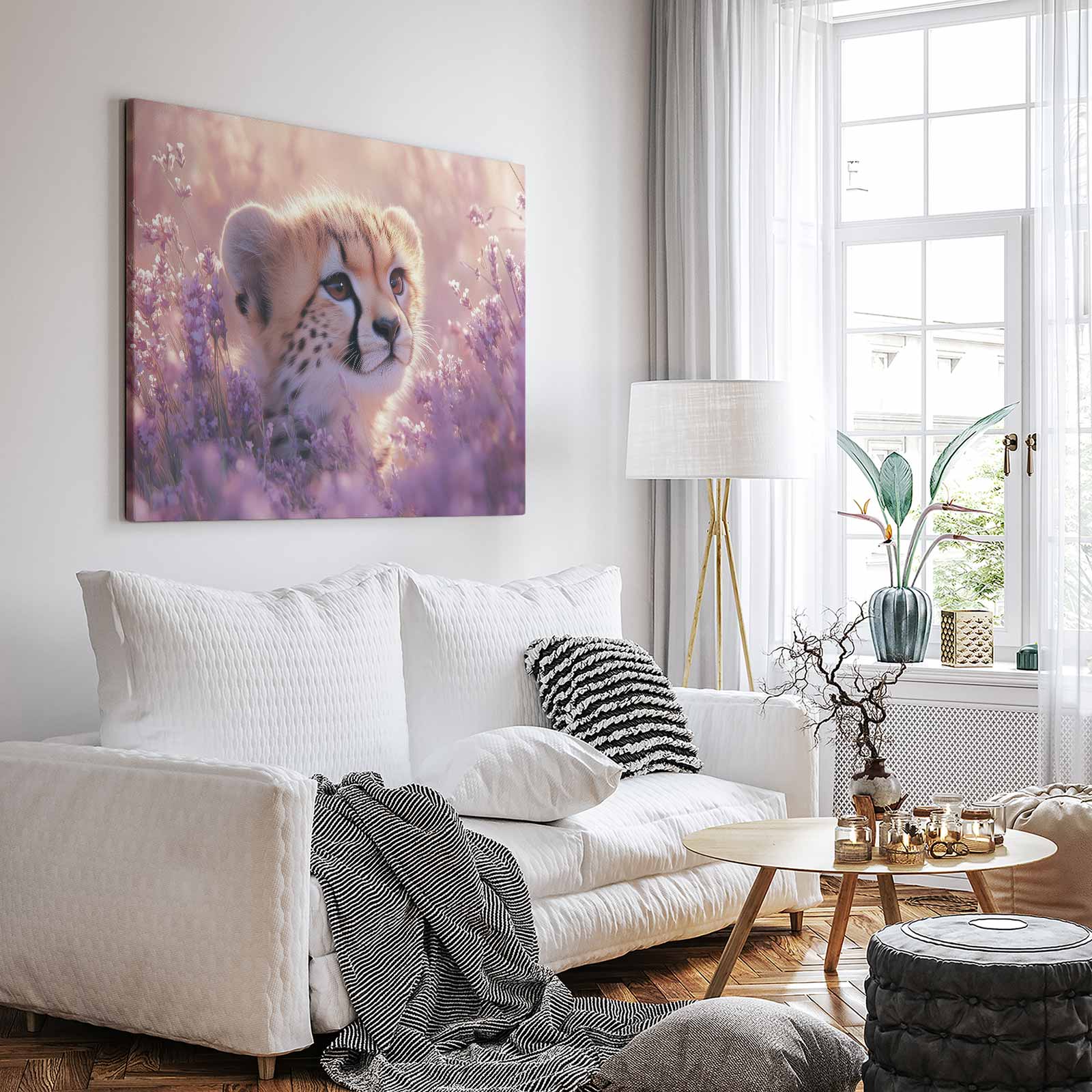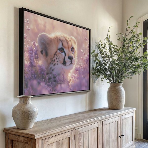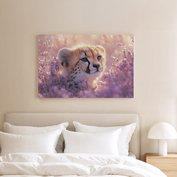 Cheetah welp tussen paarse bloemen