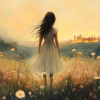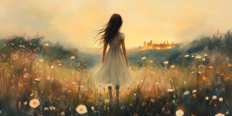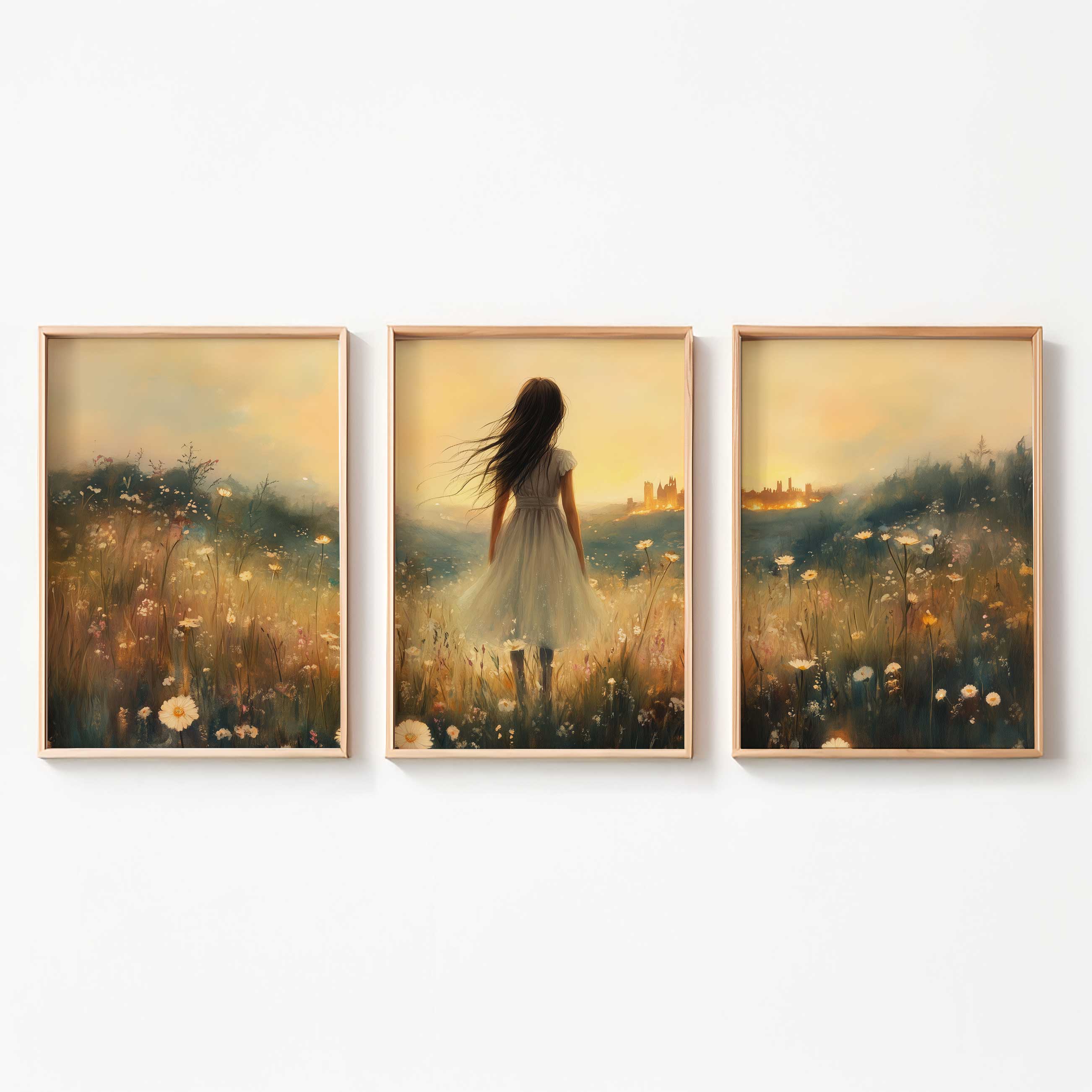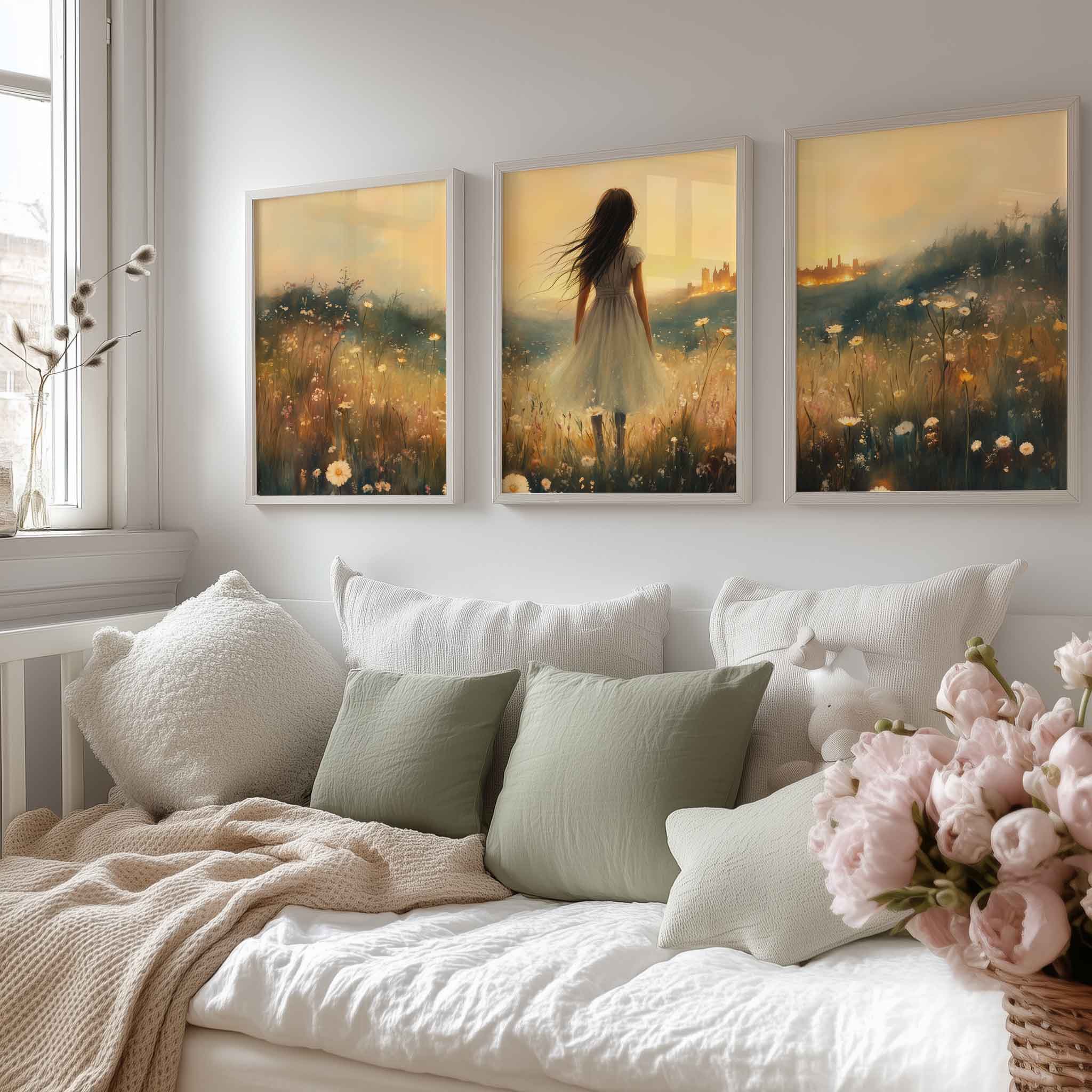 Terug naar collectie Posters Dromerig bloemenveld met stad op de achtergrond