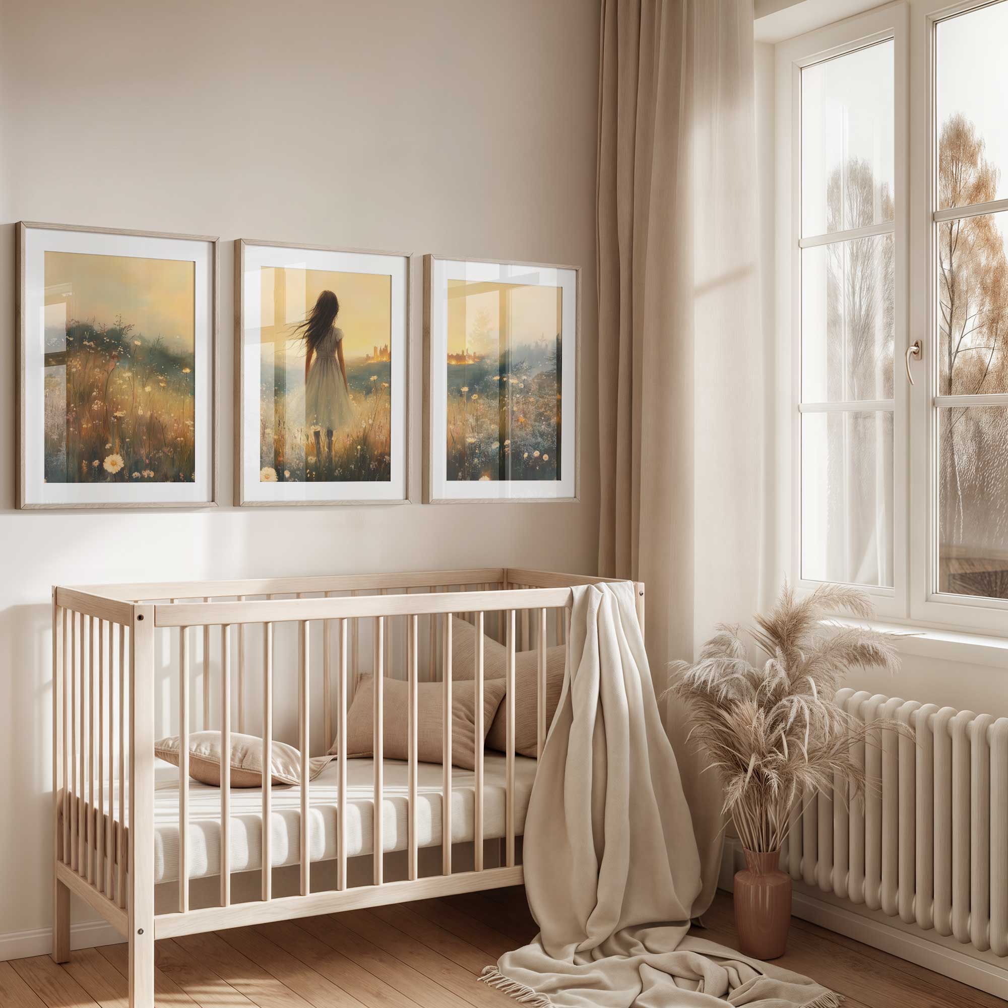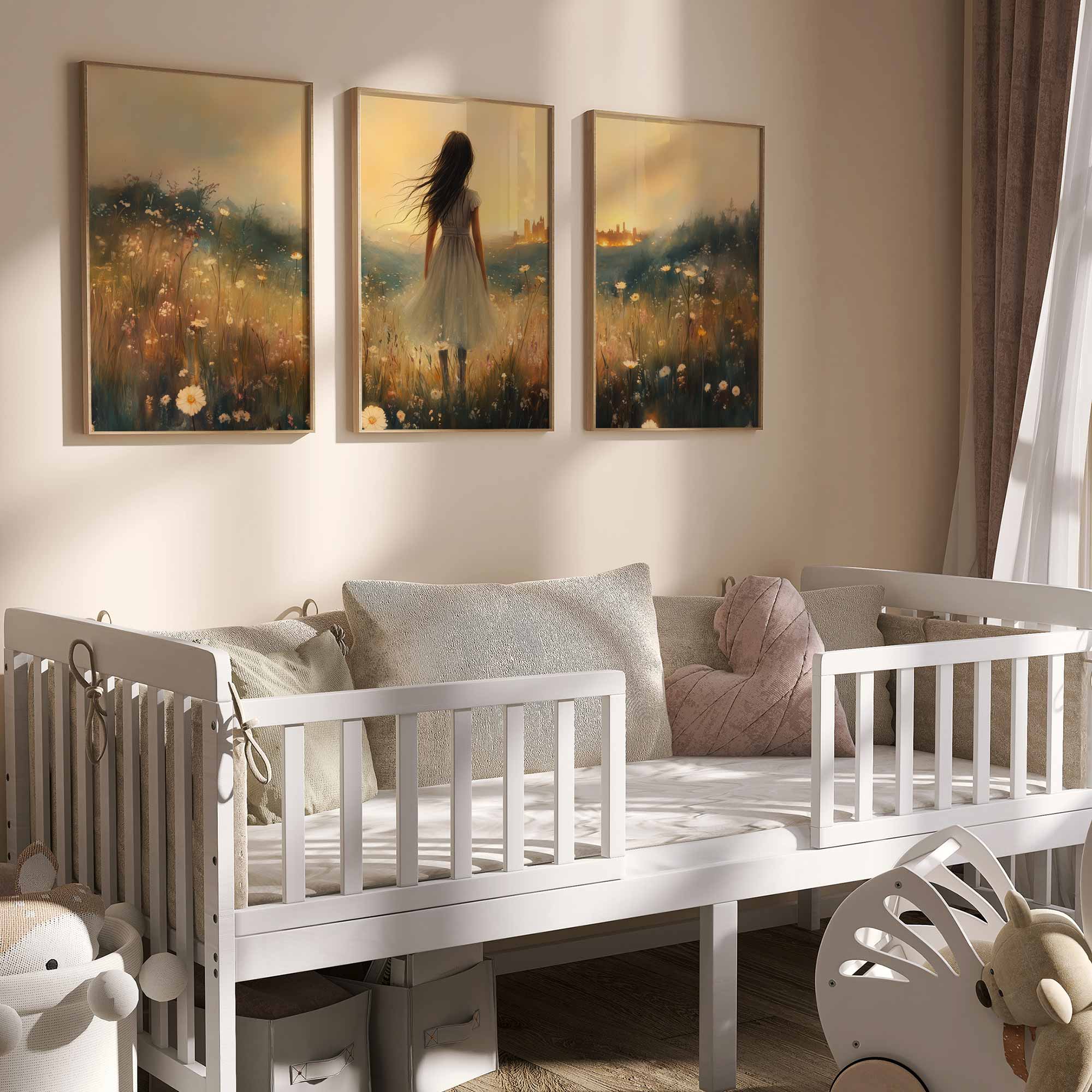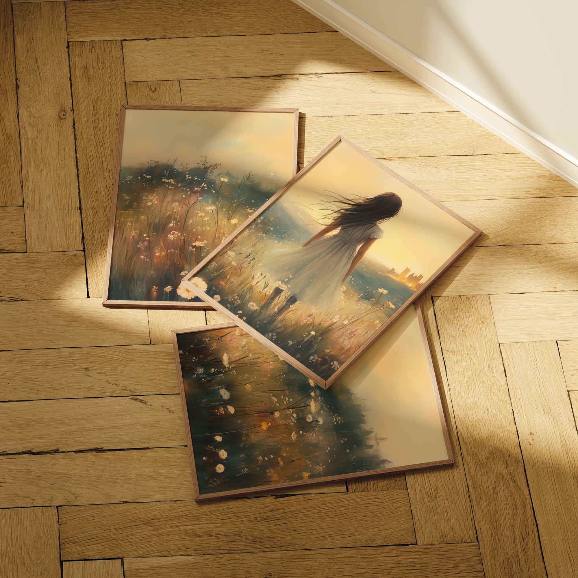 Terug naar collectie Posters Dromerig bloemenveld met stad op de achtergrond