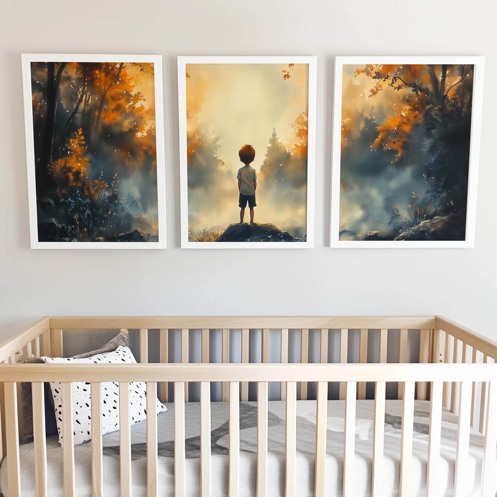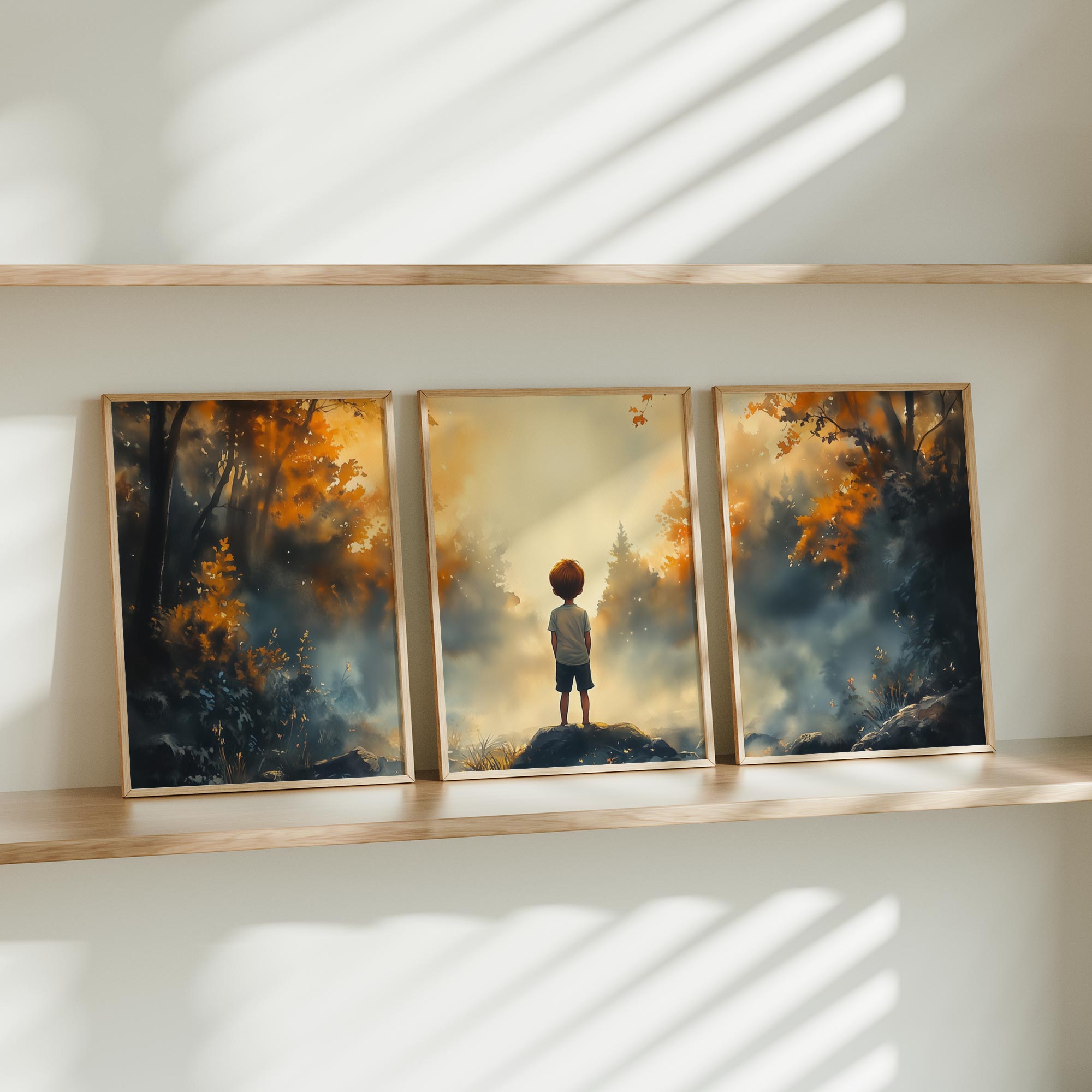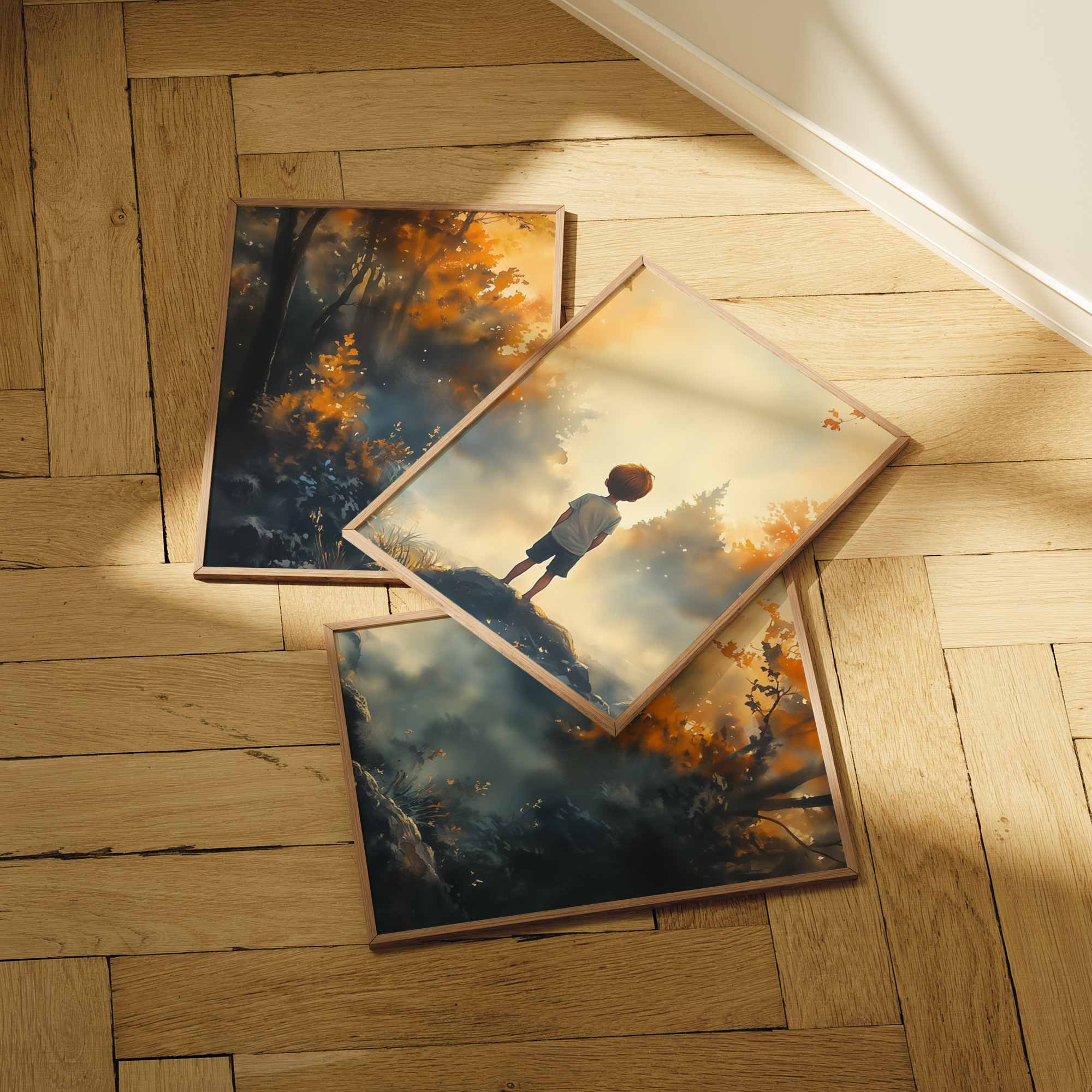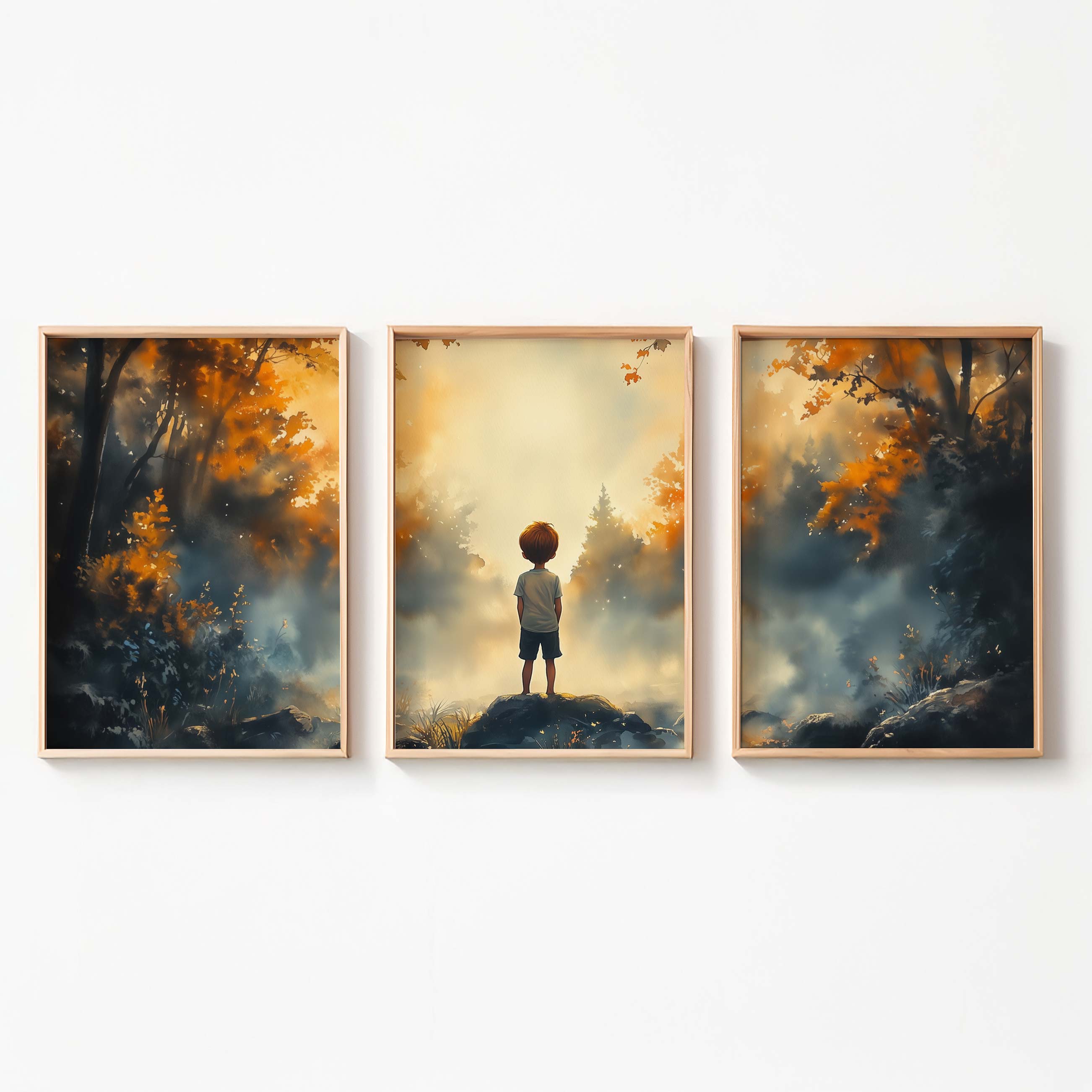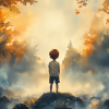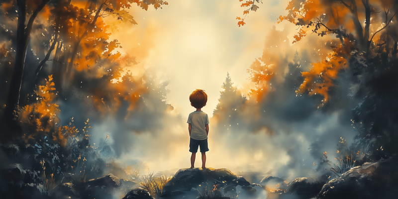 Dromerig Bosavontuur: Jongen op Rots in Kleurrijk Woud