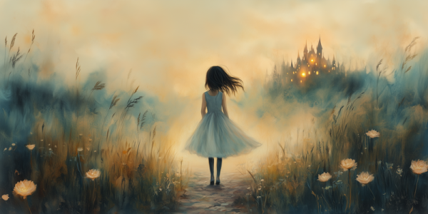 Dromerig Meisje bij Betoverend Kasteel – Pastel Schilderij