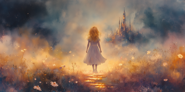 Dromerig Meisje bij Betoverend Kasteel – Sprookjesachtig Kunstwerk