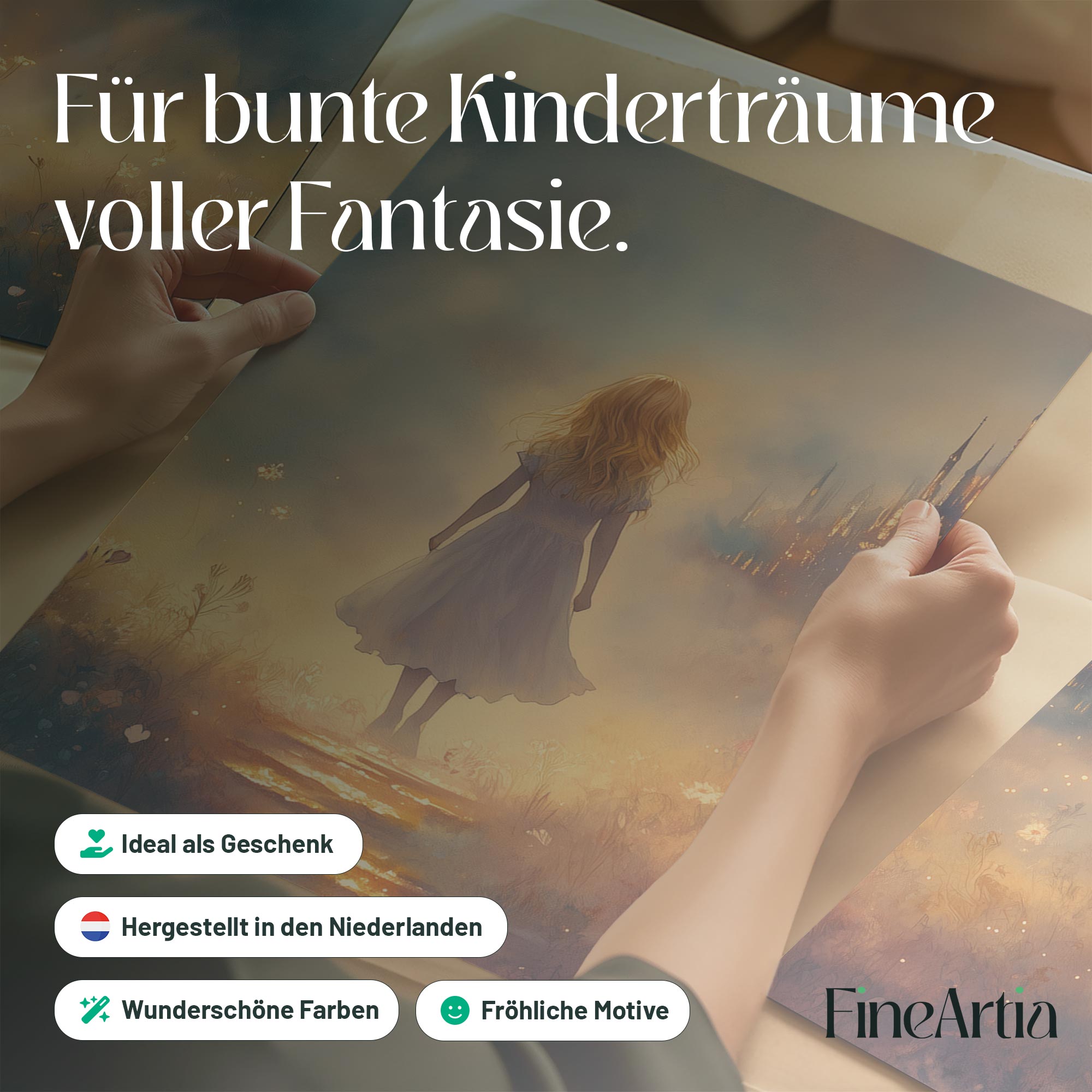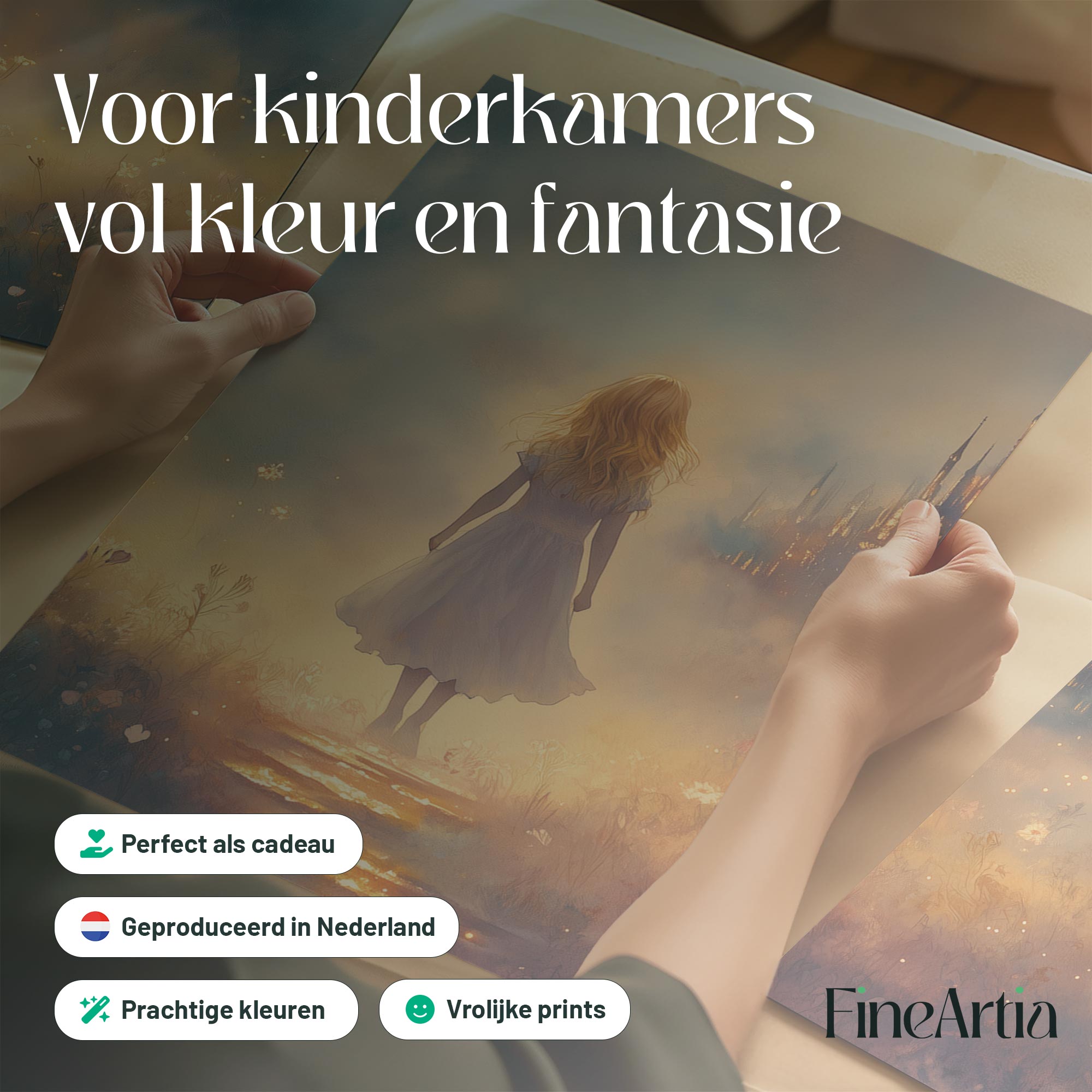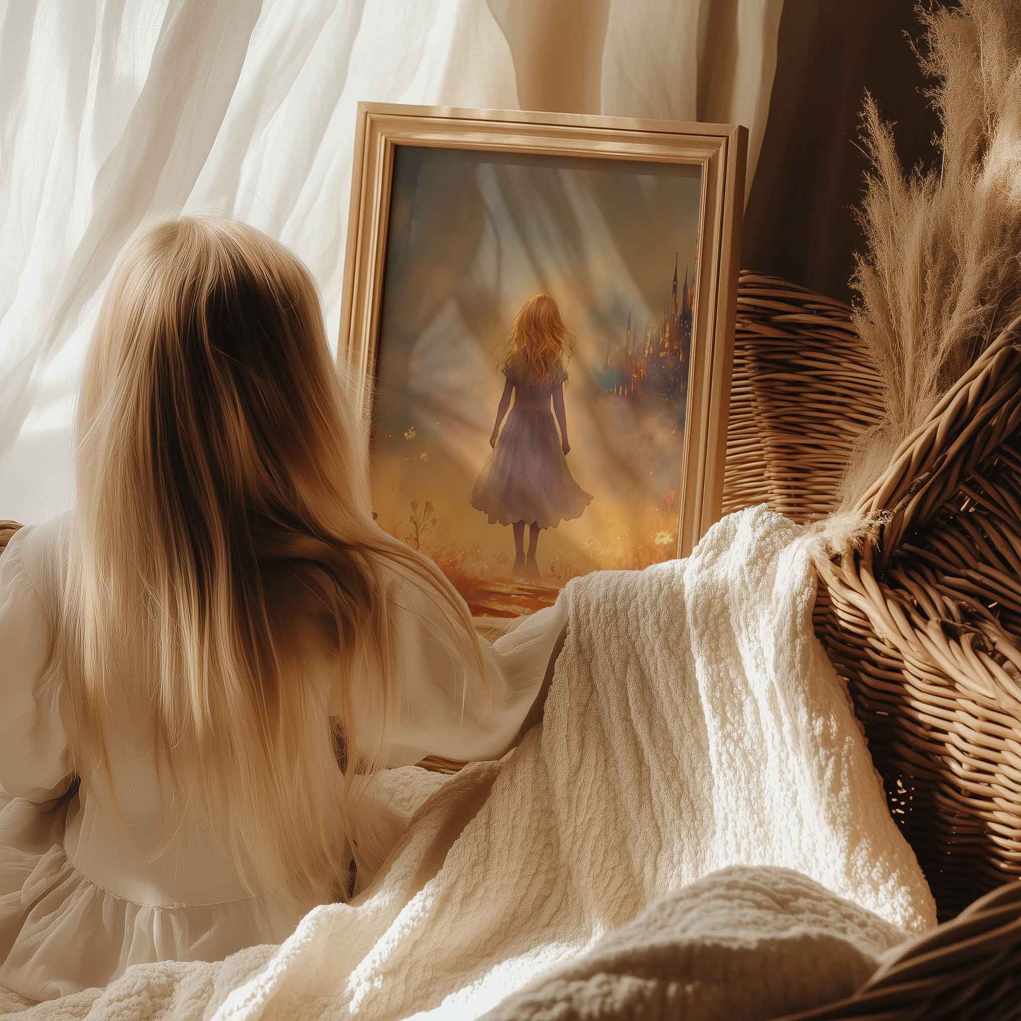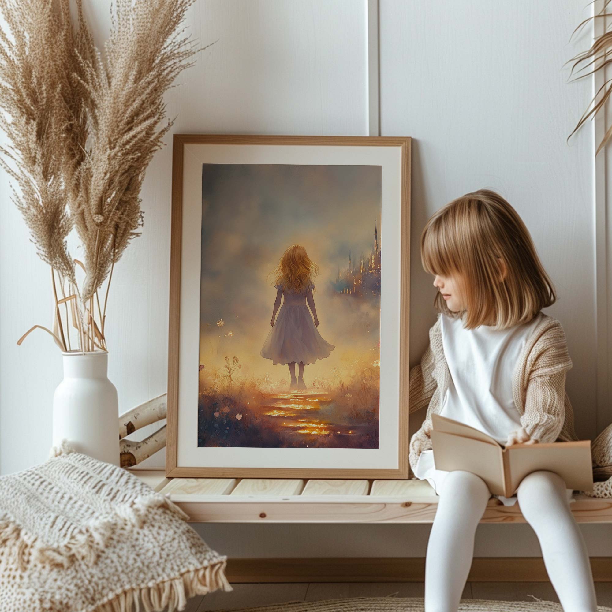 Terug naar collectie Posters Dromerig Meisje bij Betoverend Kasteel – Sprookjesachtig Kunstwerk