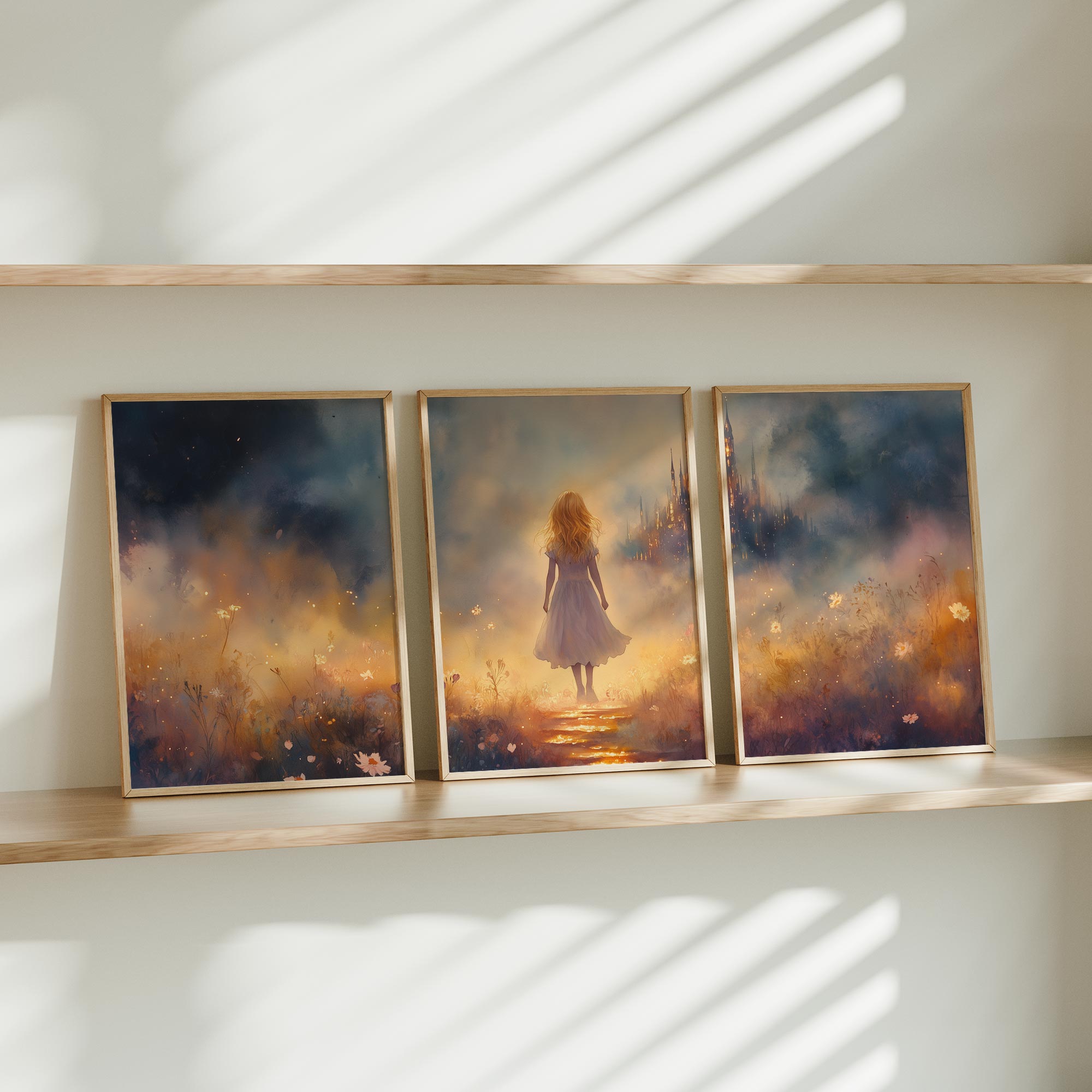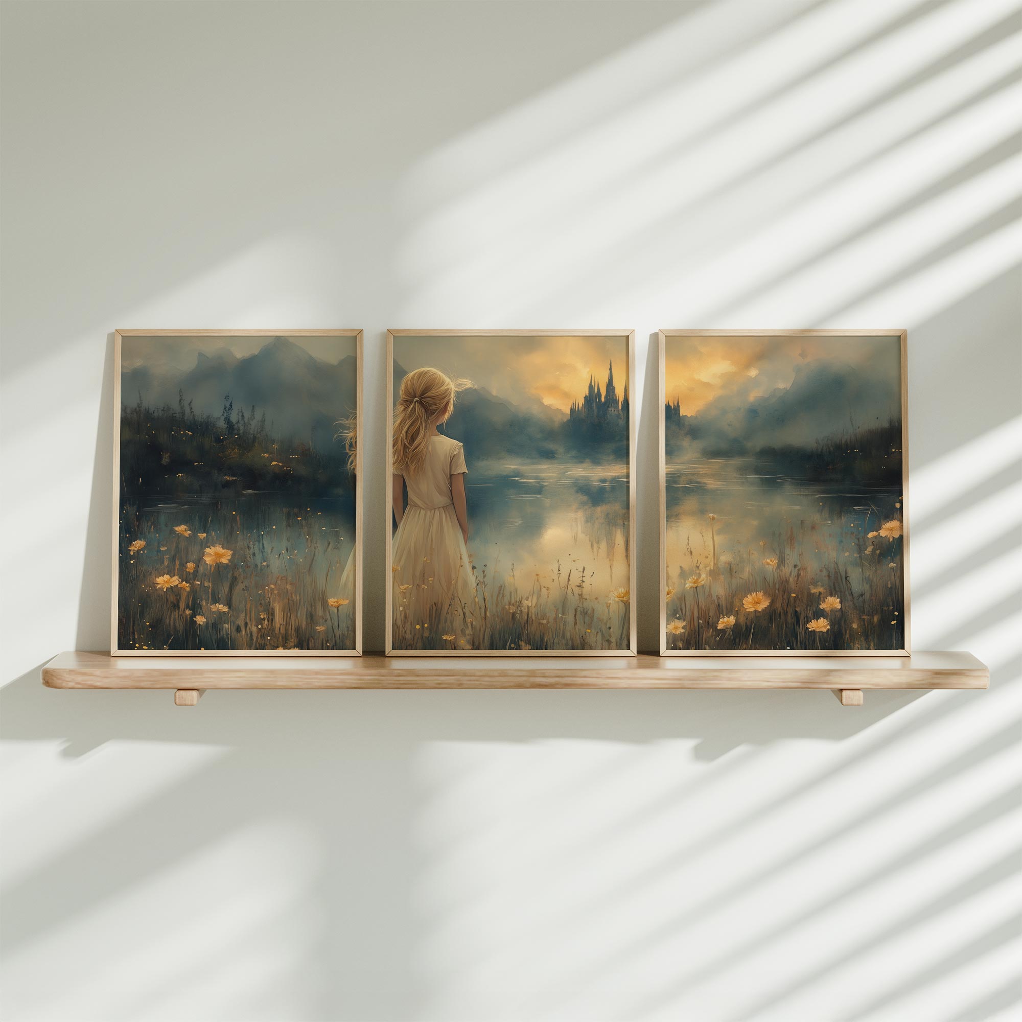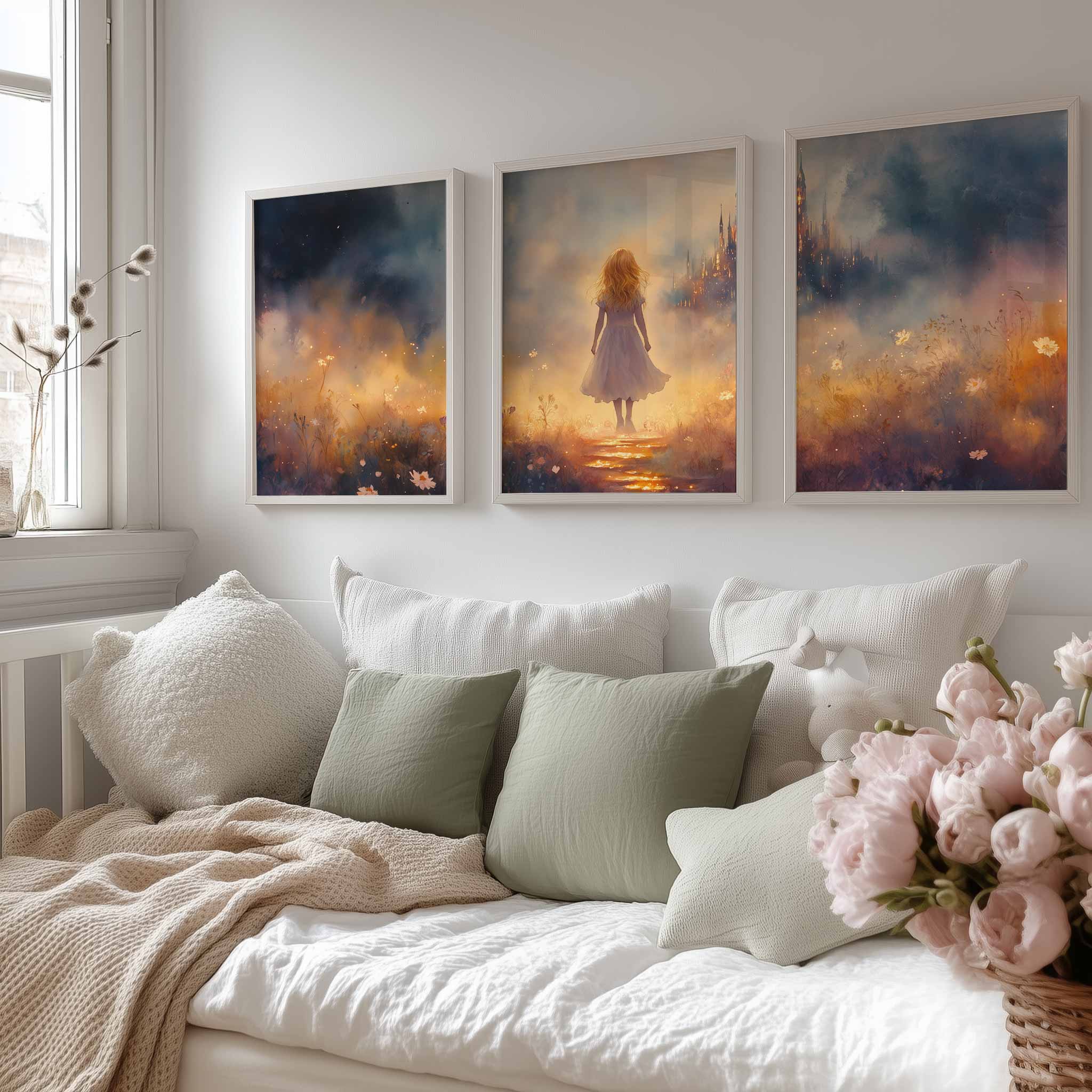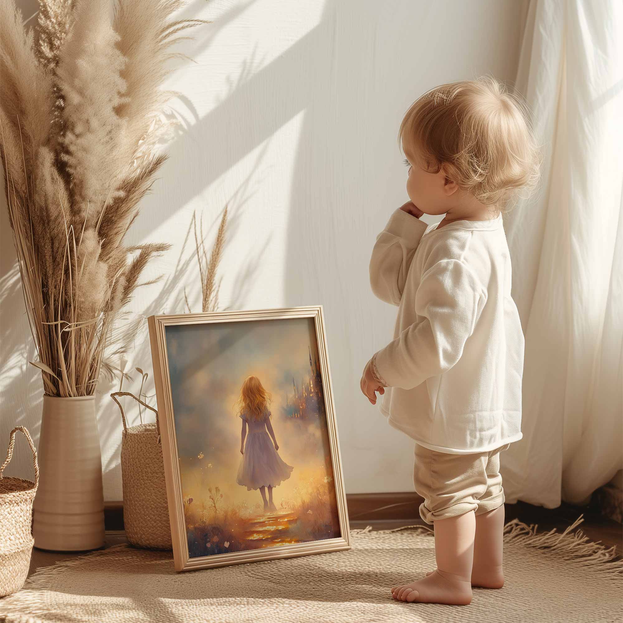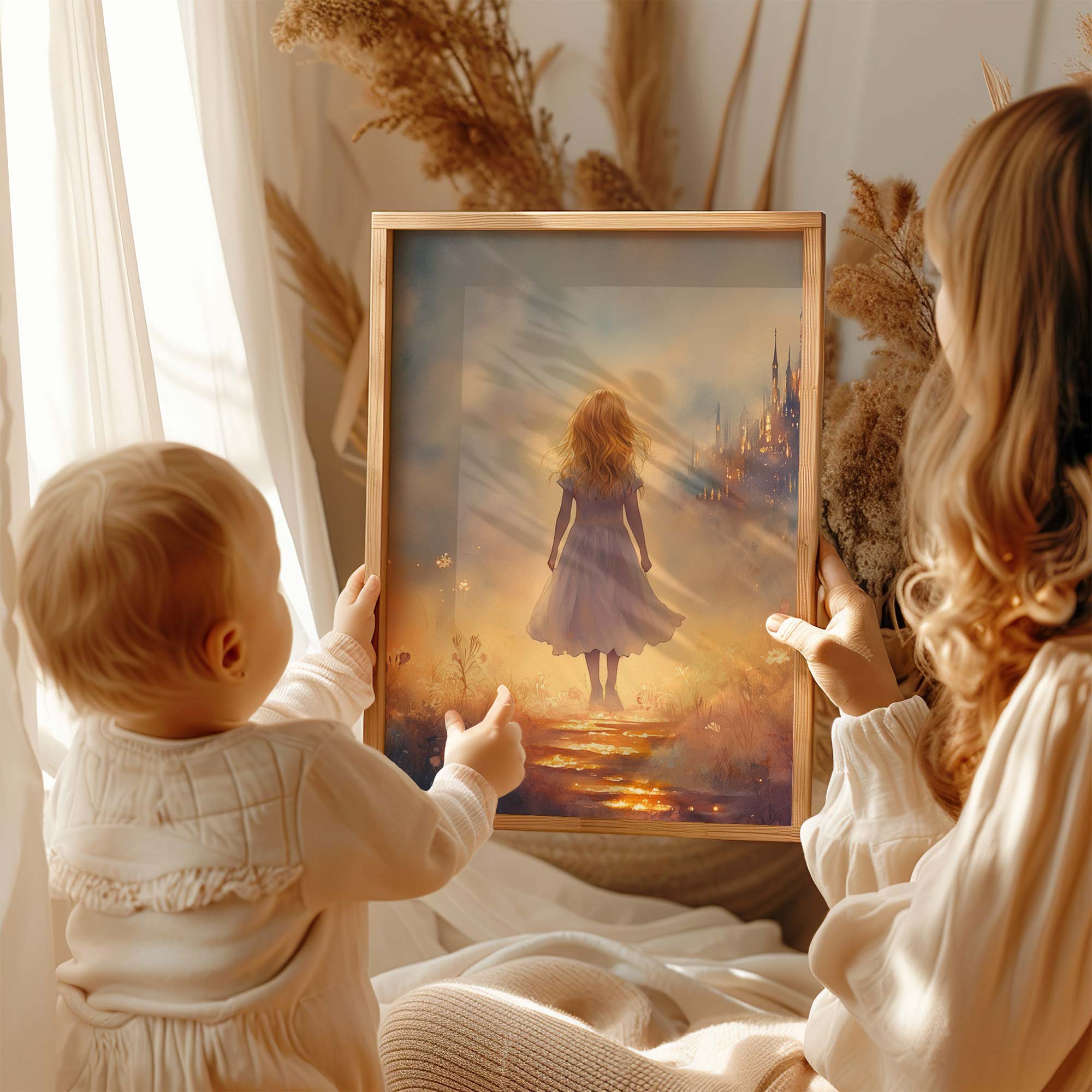 Terug naar collectie Posters Dromerig Meisje bij Betoverend Kasteel – Sprookjesachtig Kunstwerk