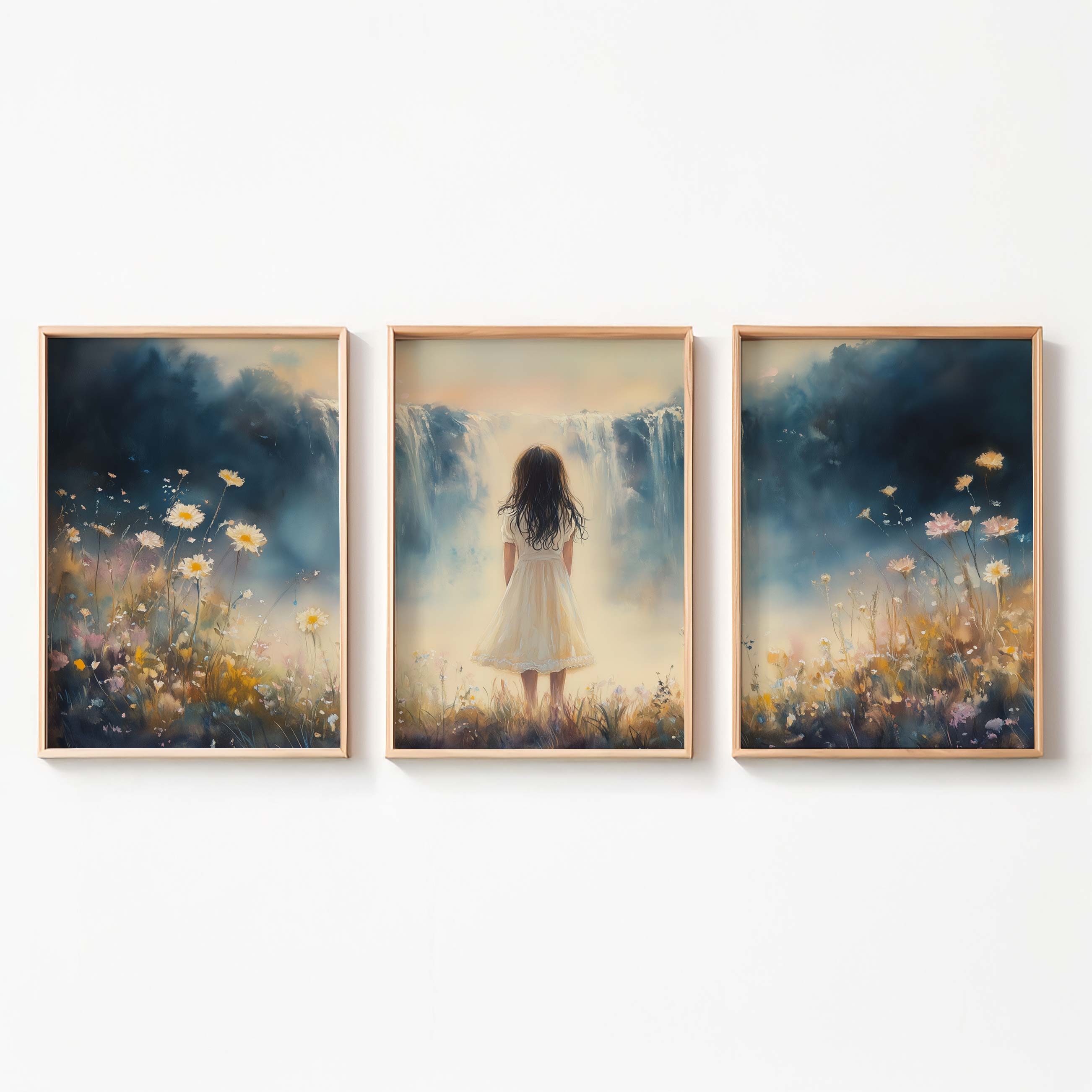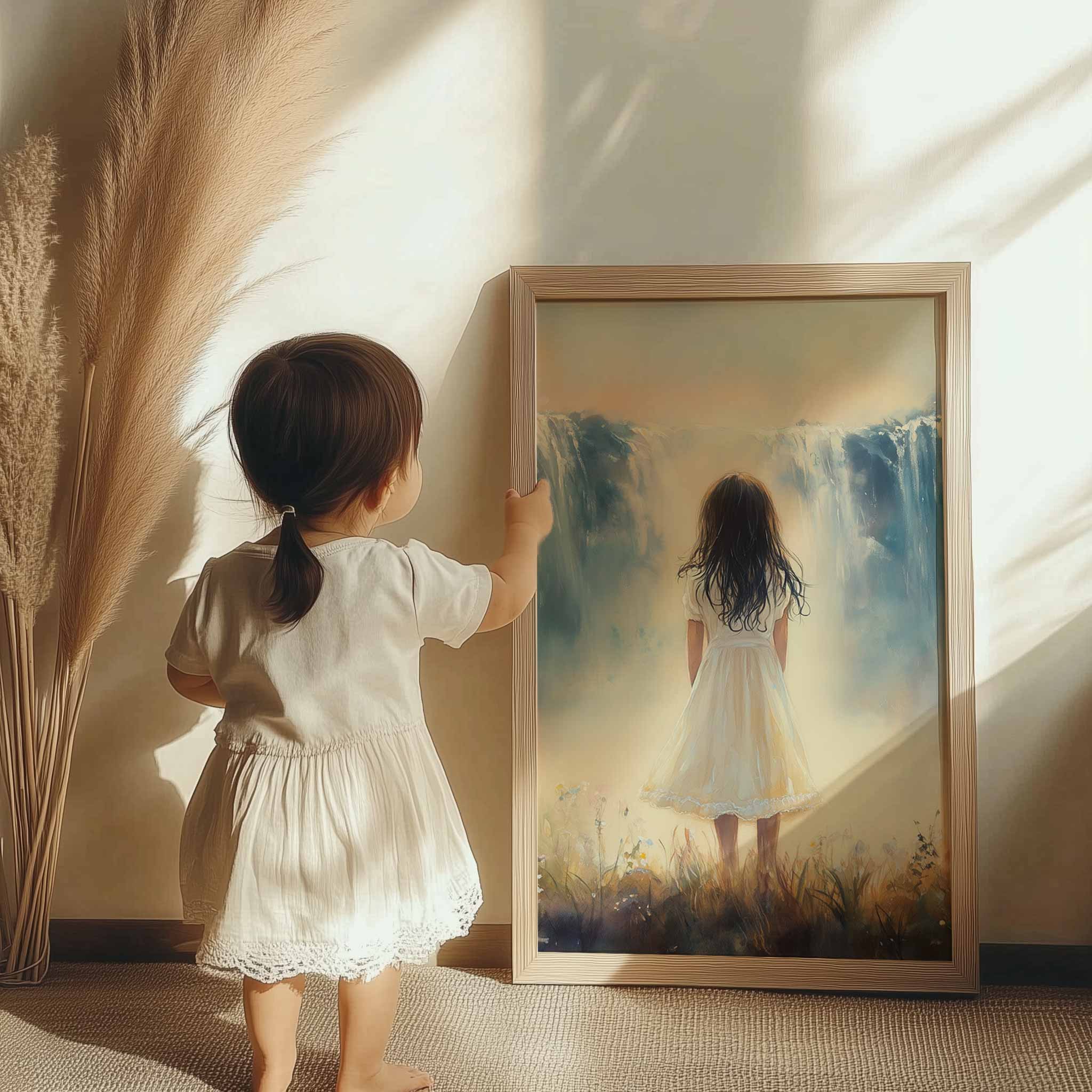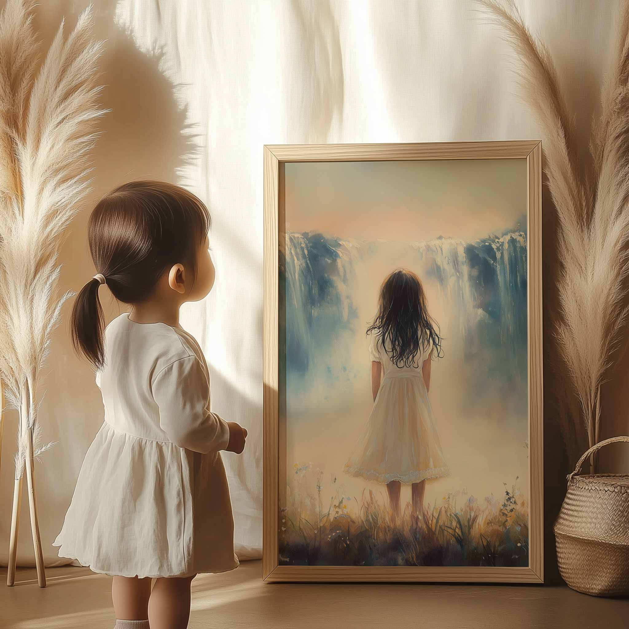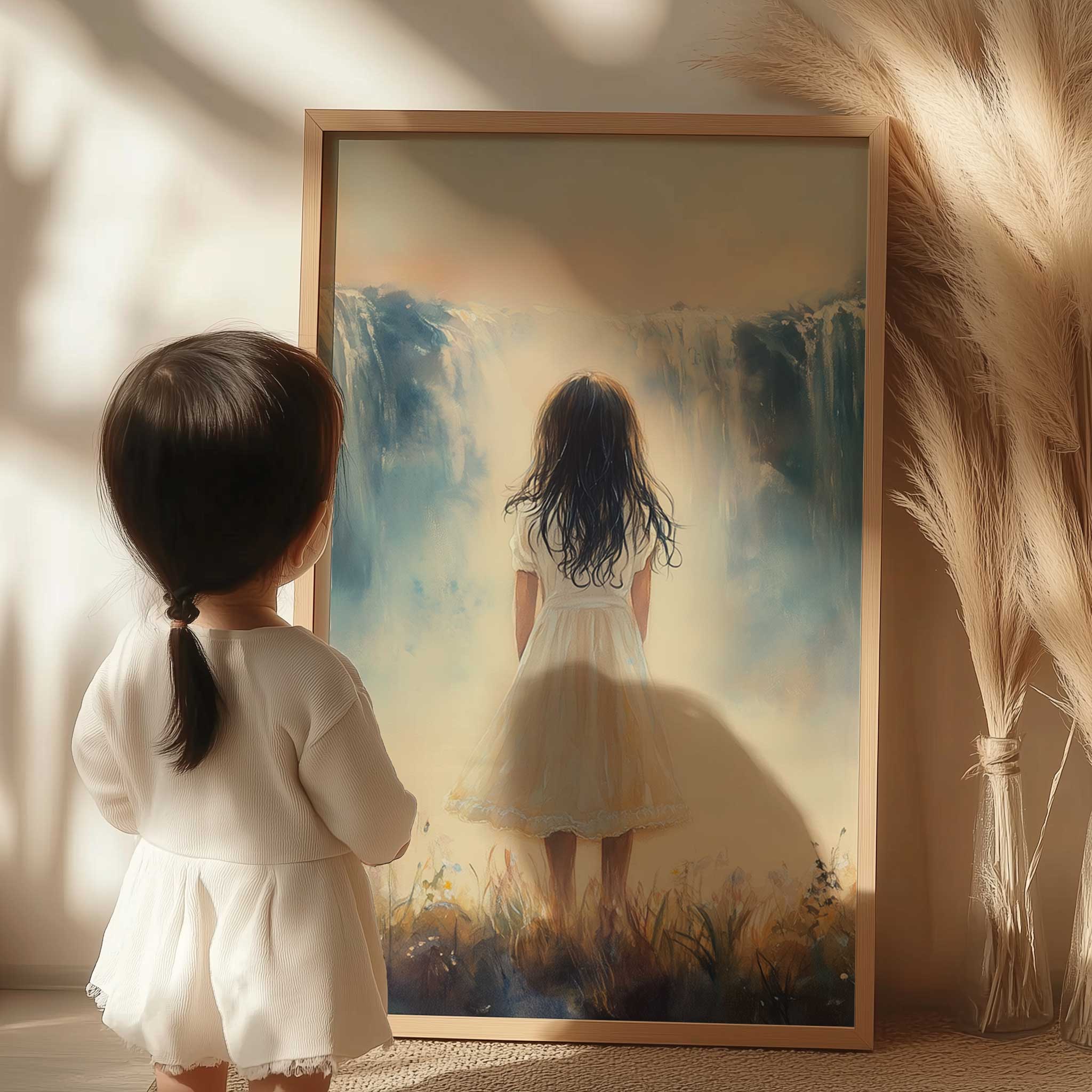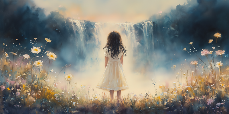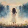 Dromerig Meisje bij Betoverende Waterval en Bloemenveld