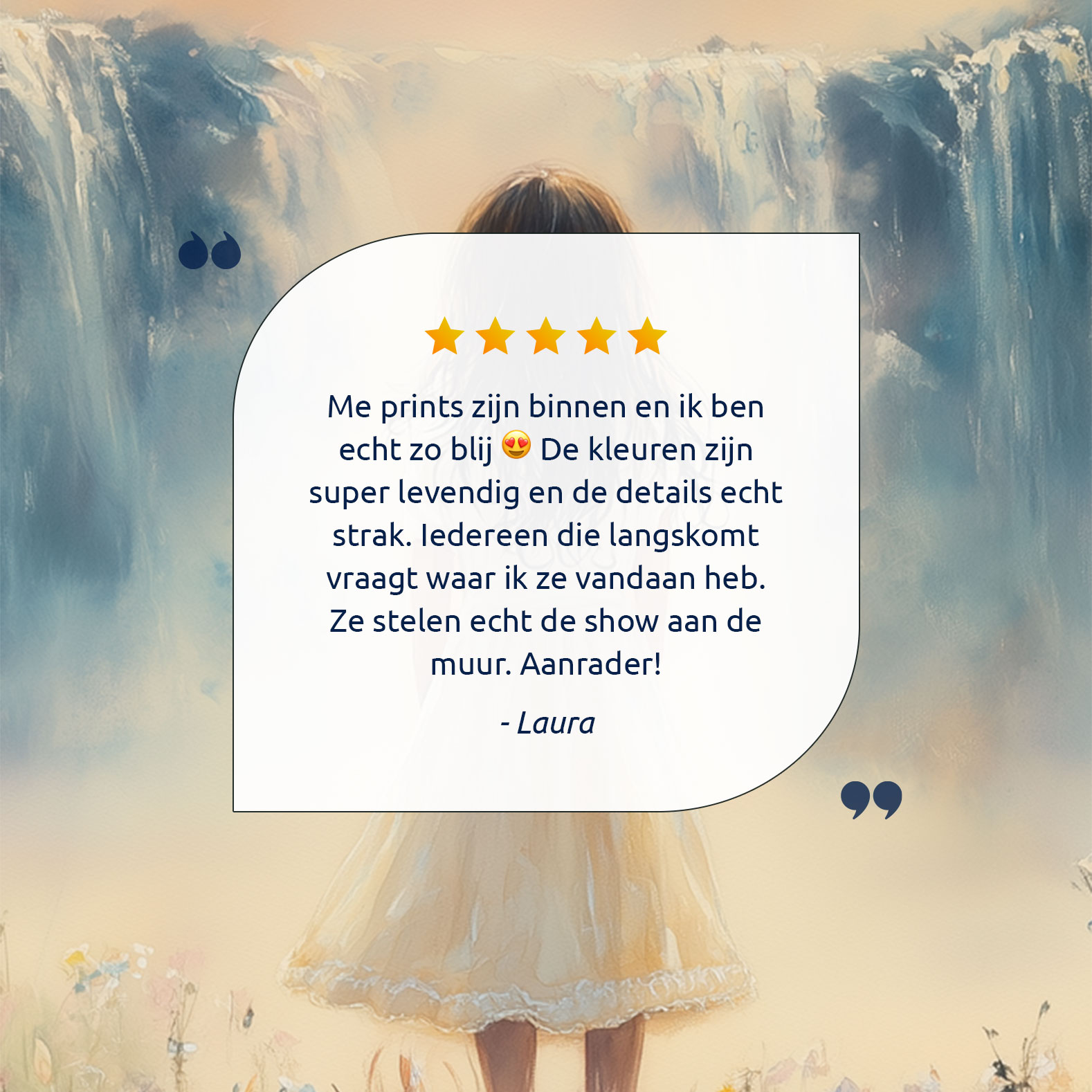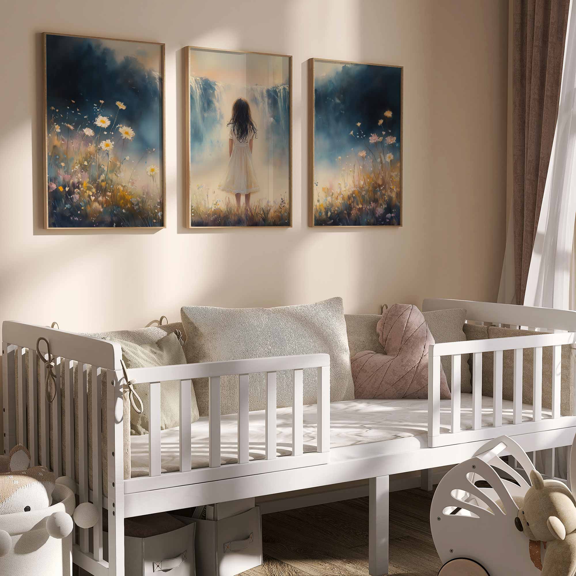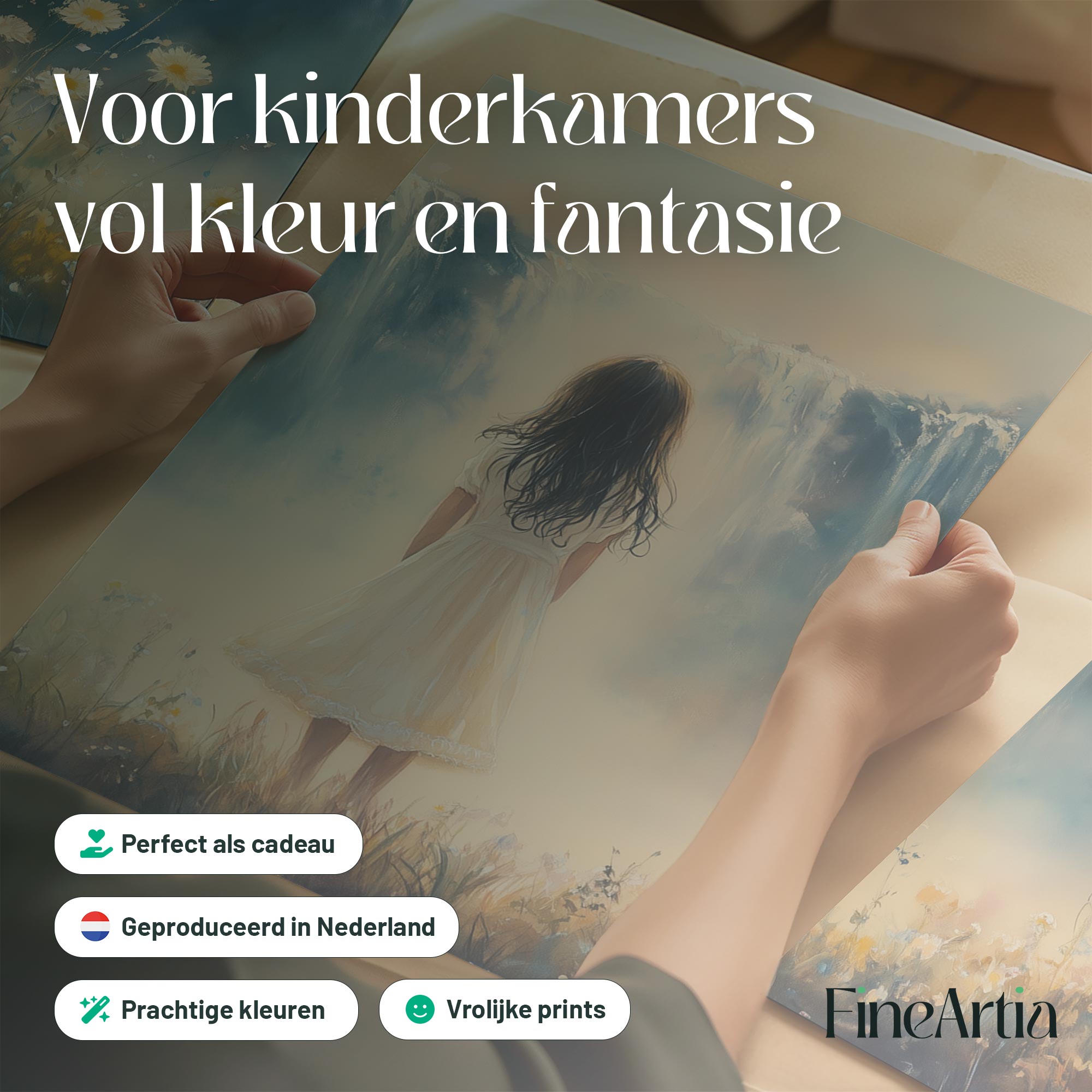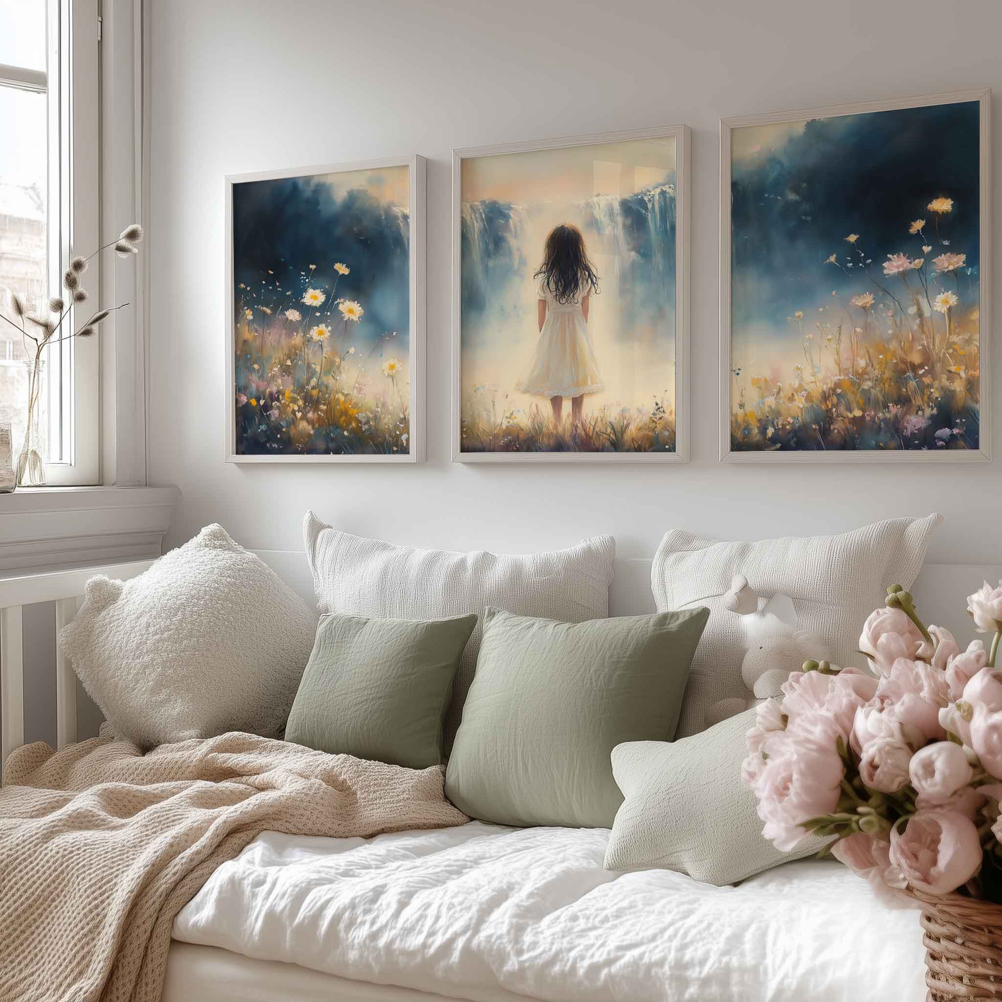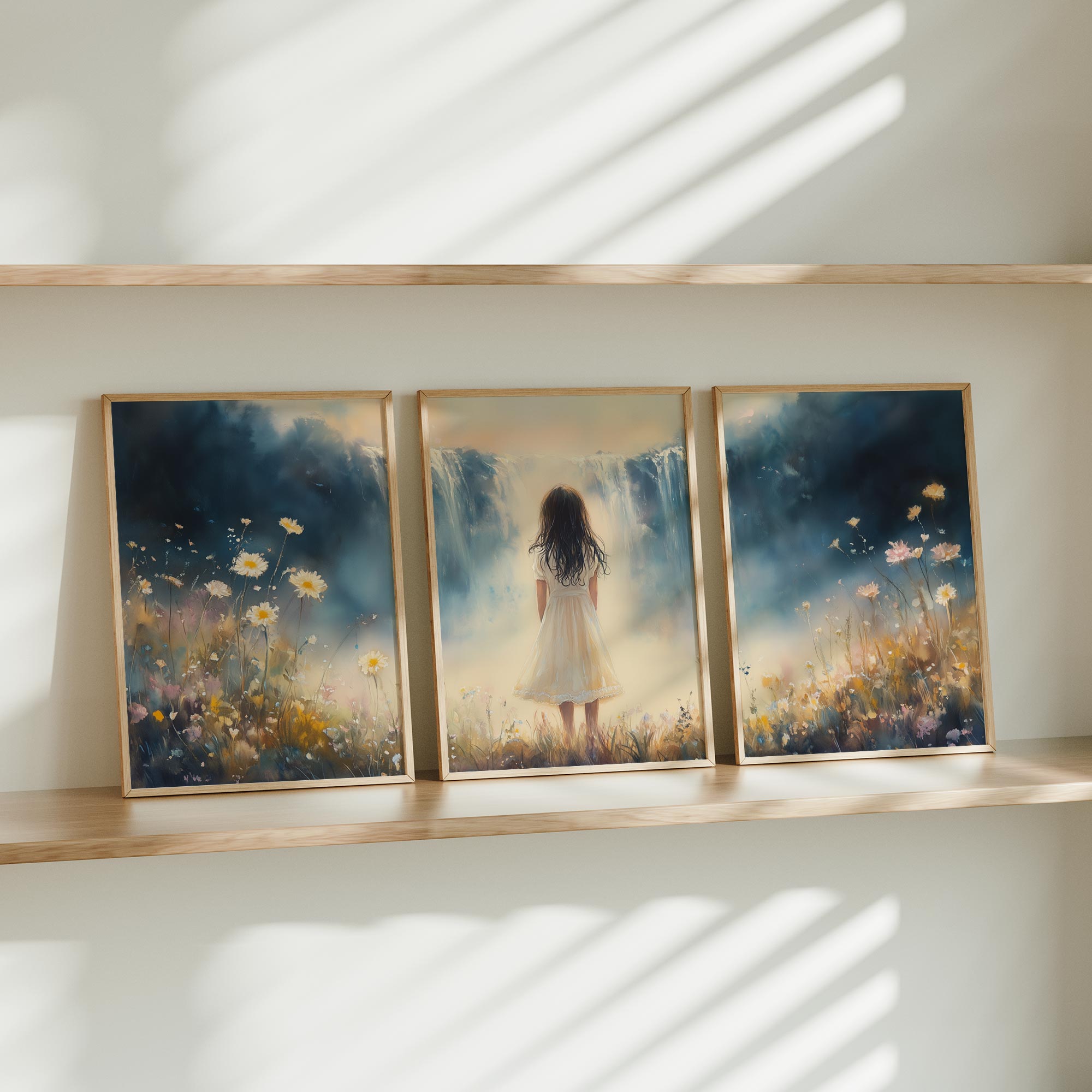Dromerig Meisje bij Betoverende Waterval en Bloemenveld
