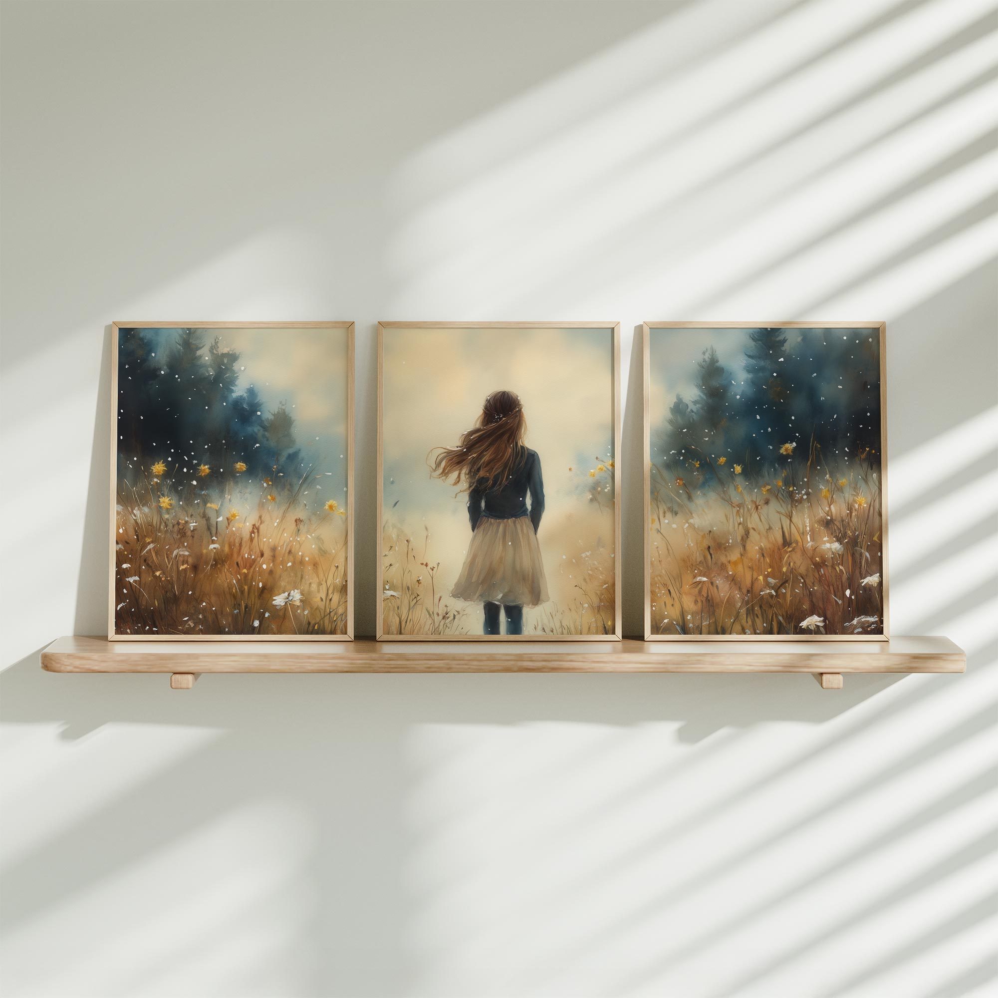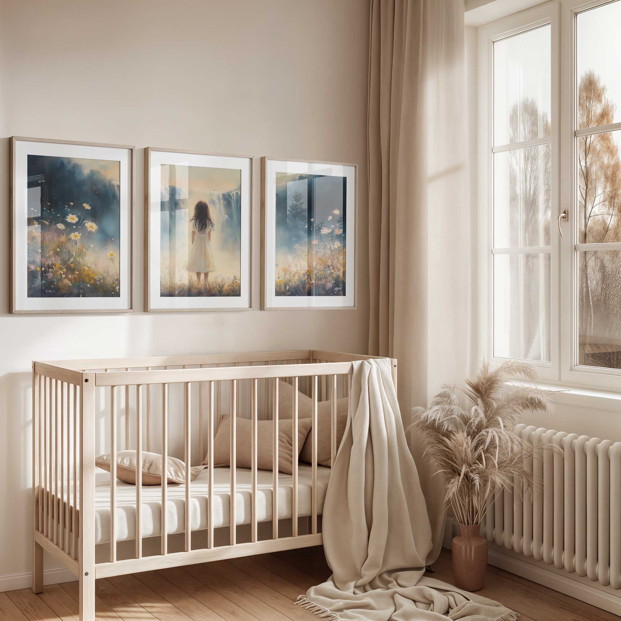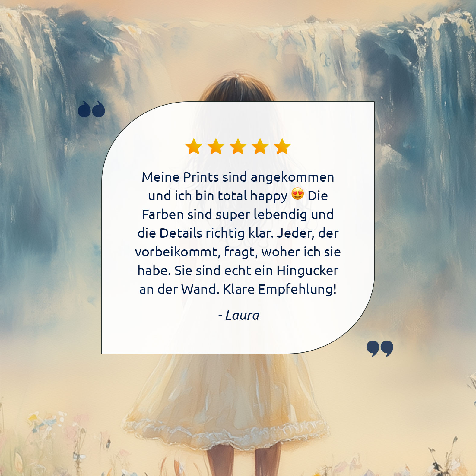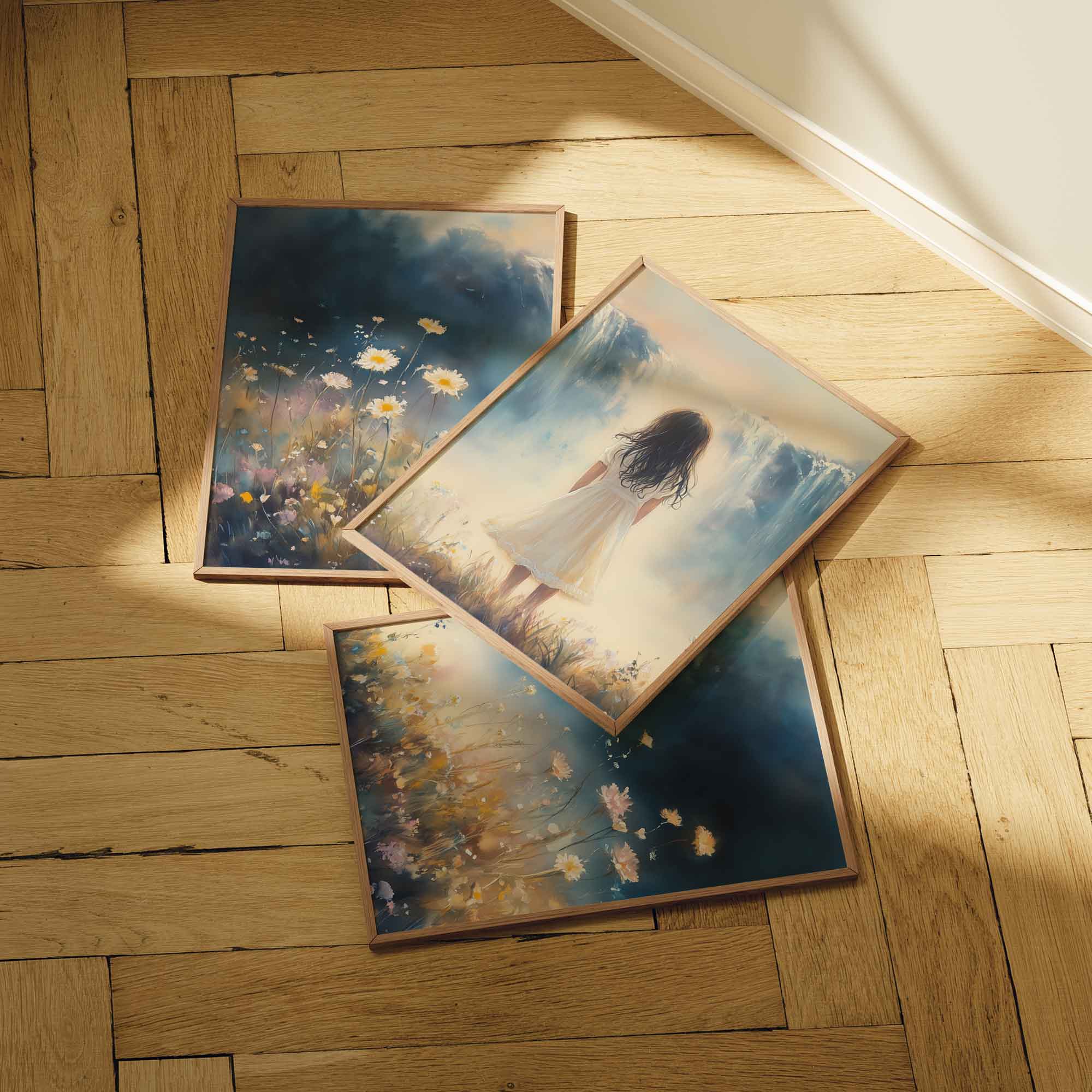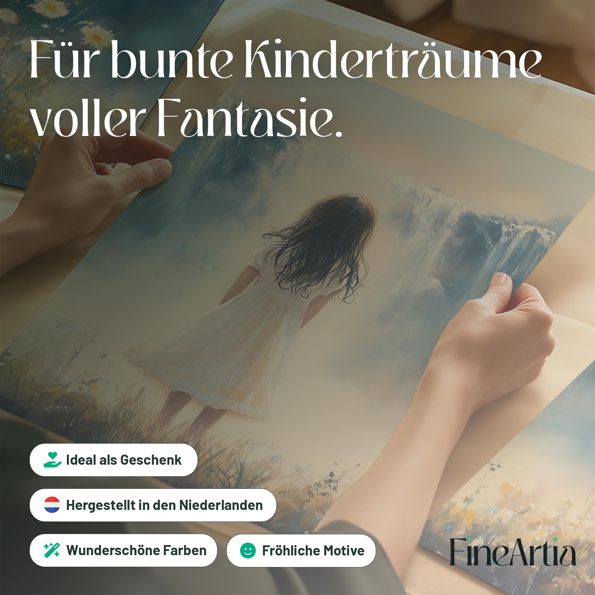 Dromerig Meisje bij Betoverende Waterval en Bloemenveld