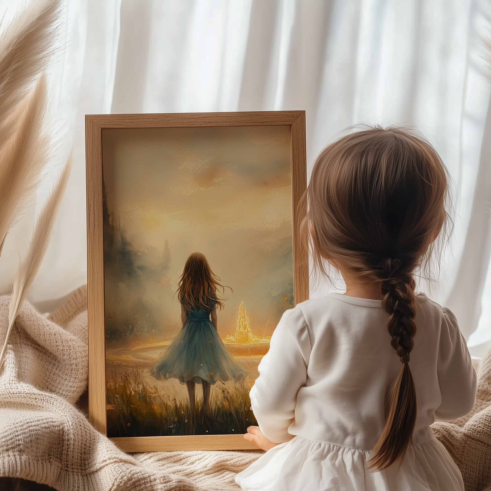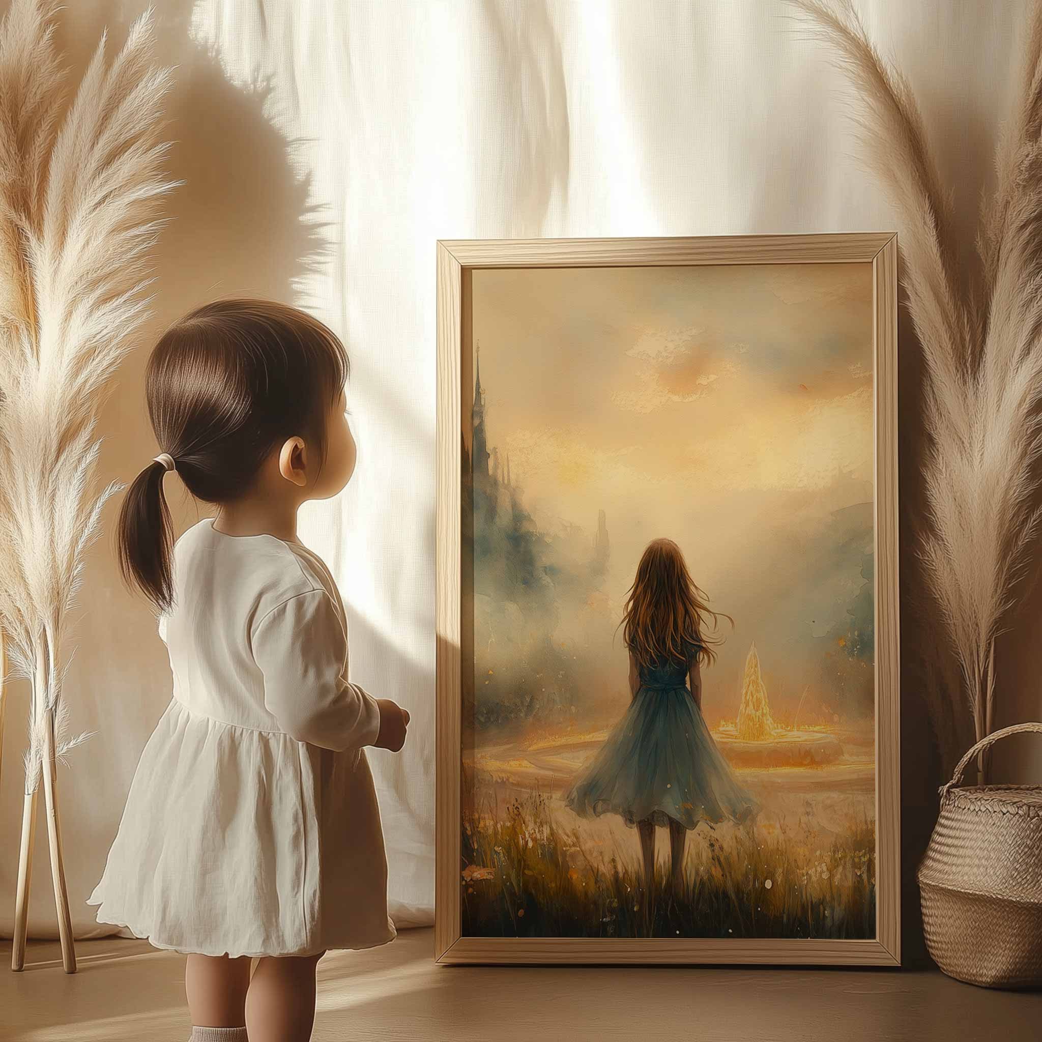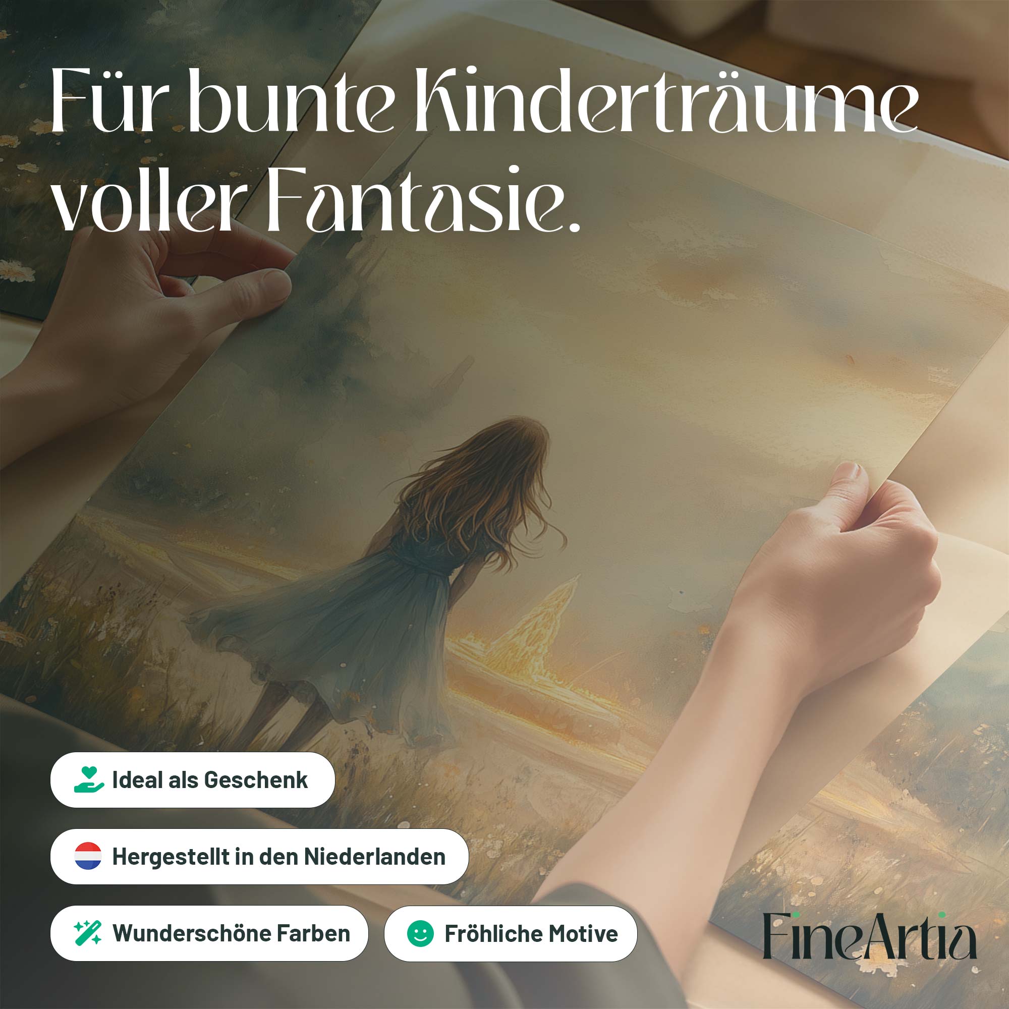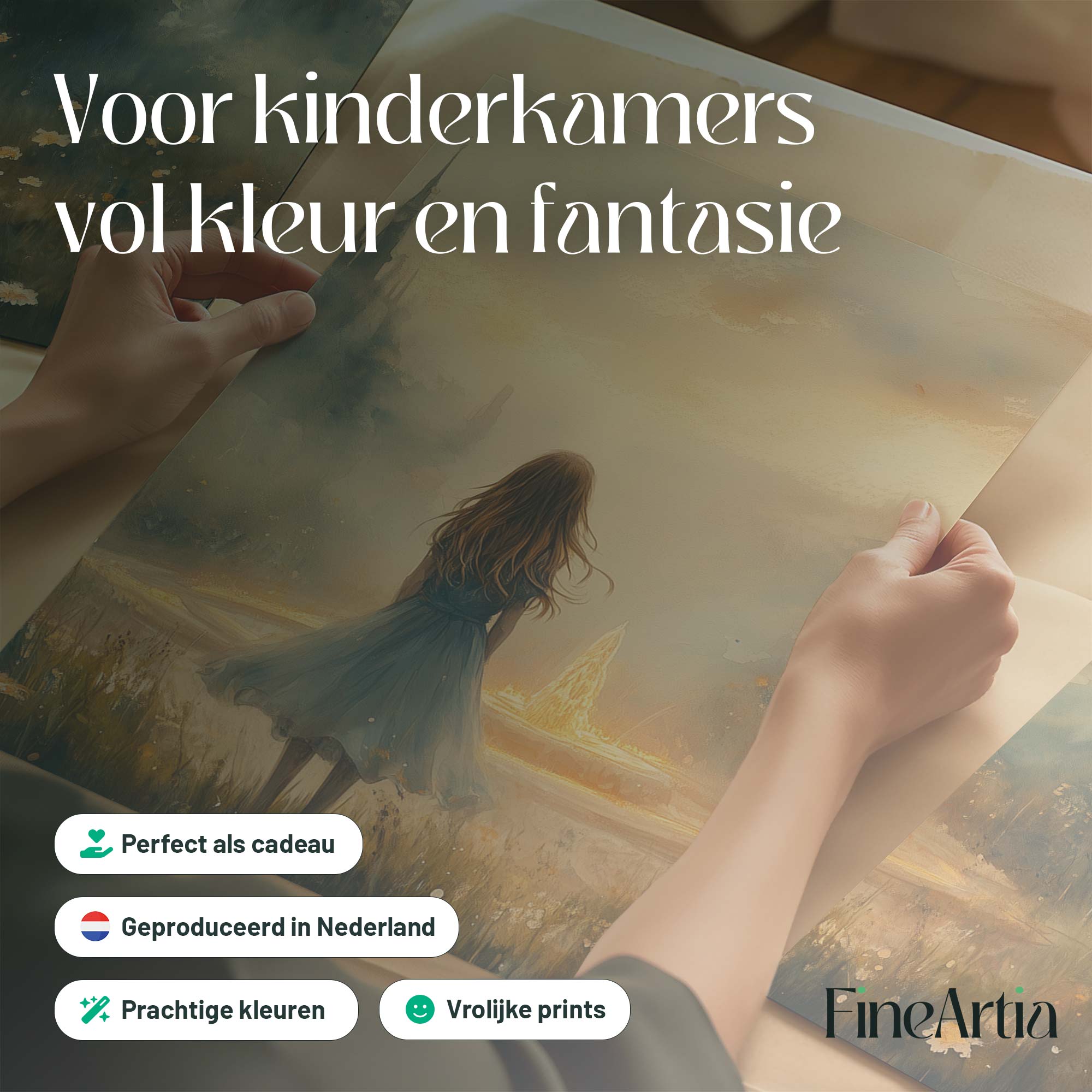Terug naar collectie Posters Dromerig Meisje bij Fontein in Betoverend Landschap