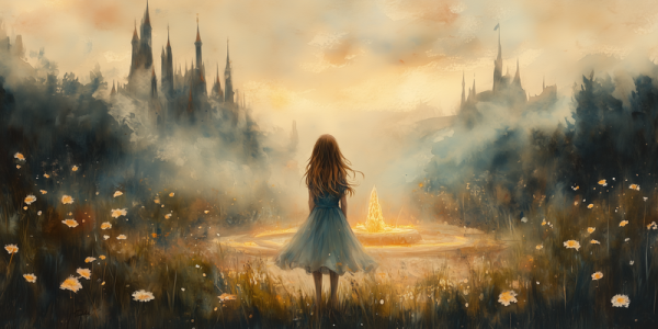Dromerig Meisje bij Fontein in Betoverend Landschap