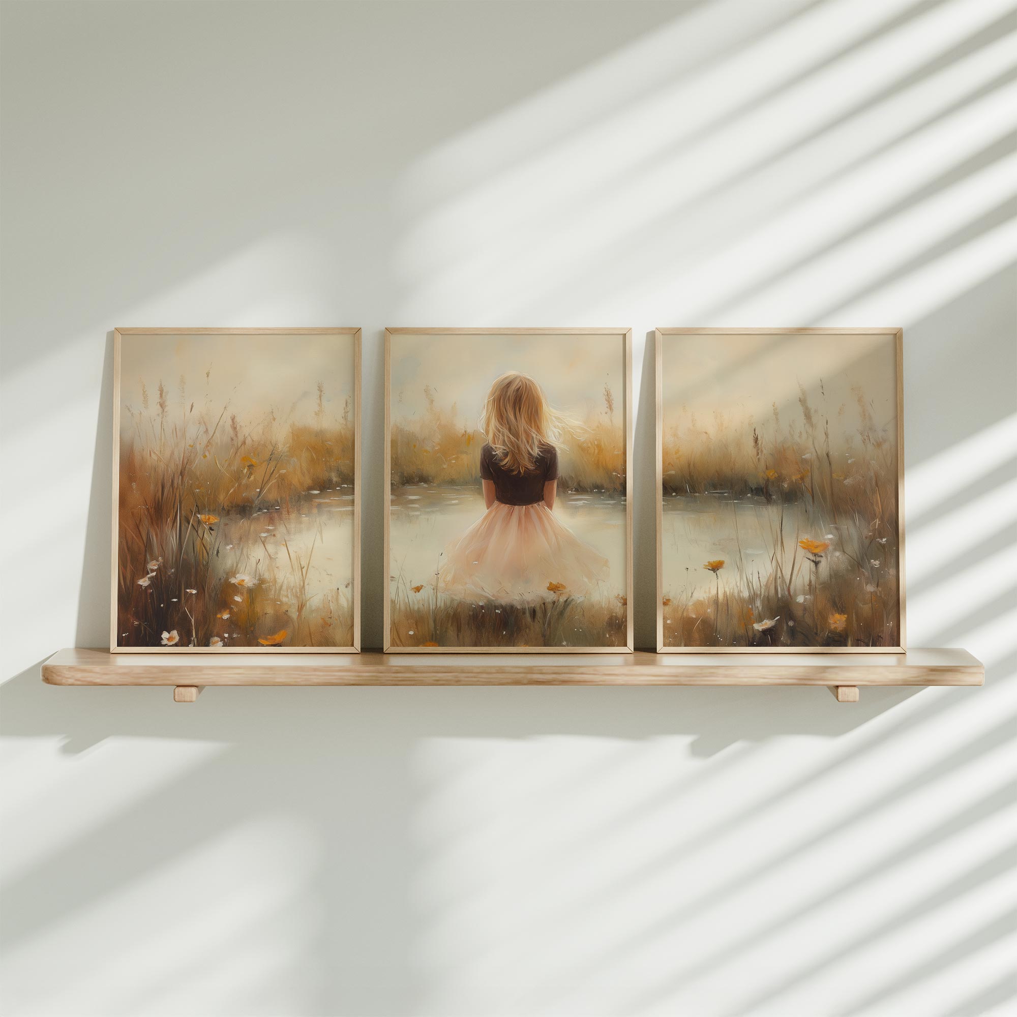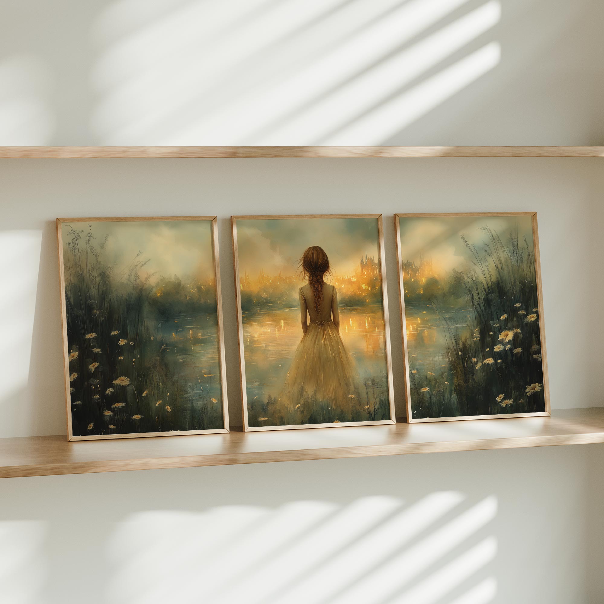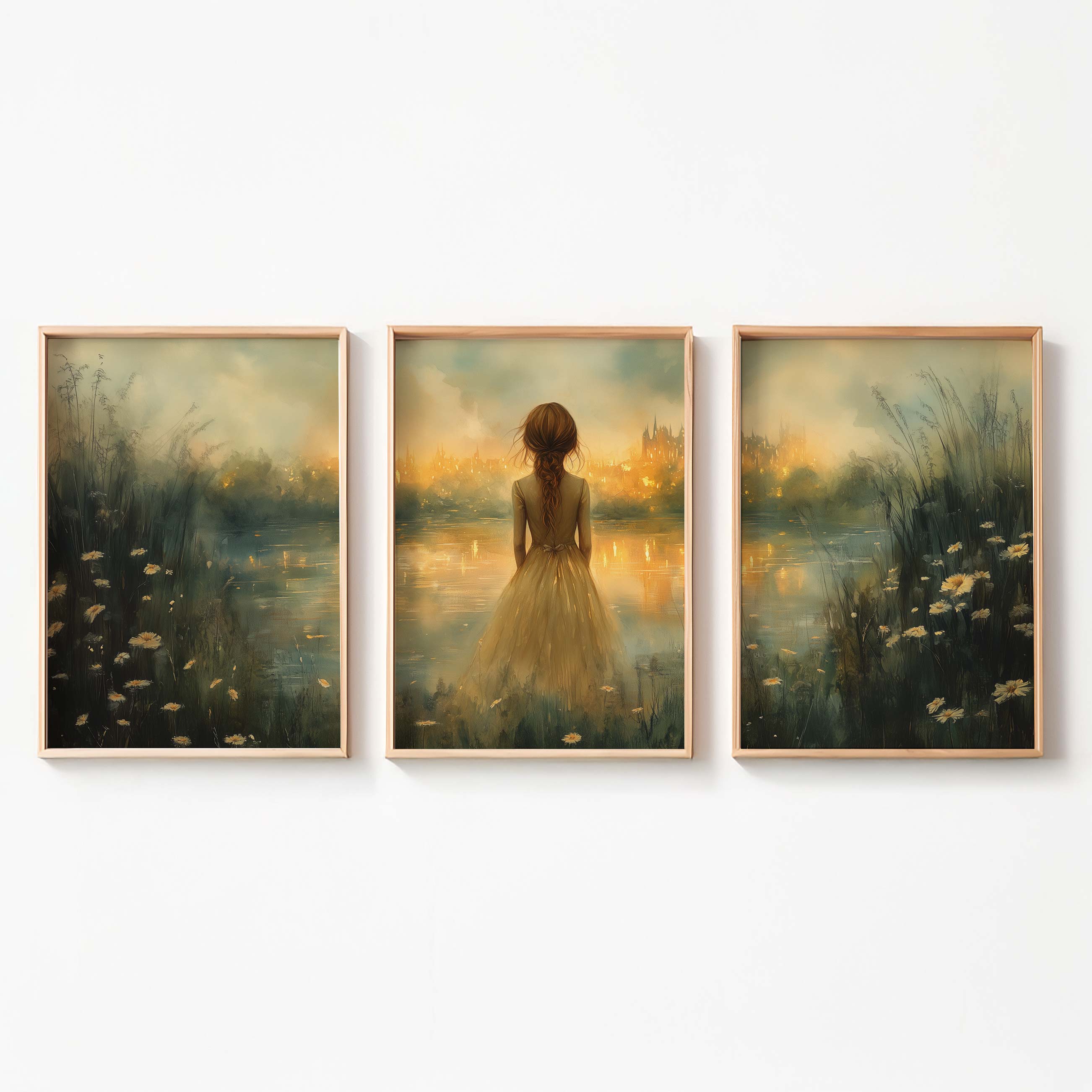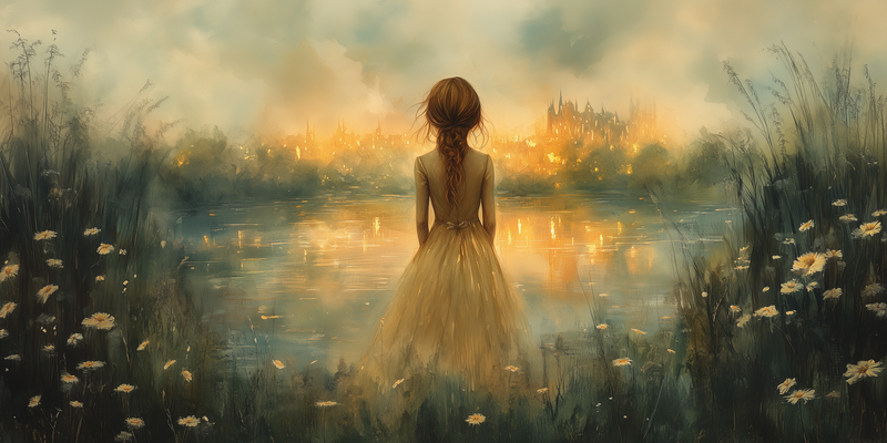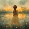 Dromerig Meisje bij het Water – Pastel Groen en Geel