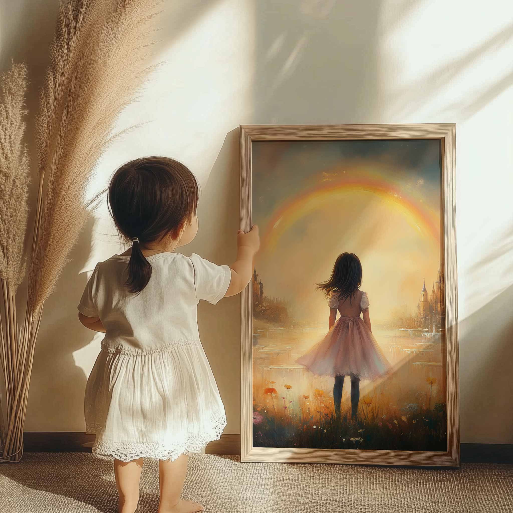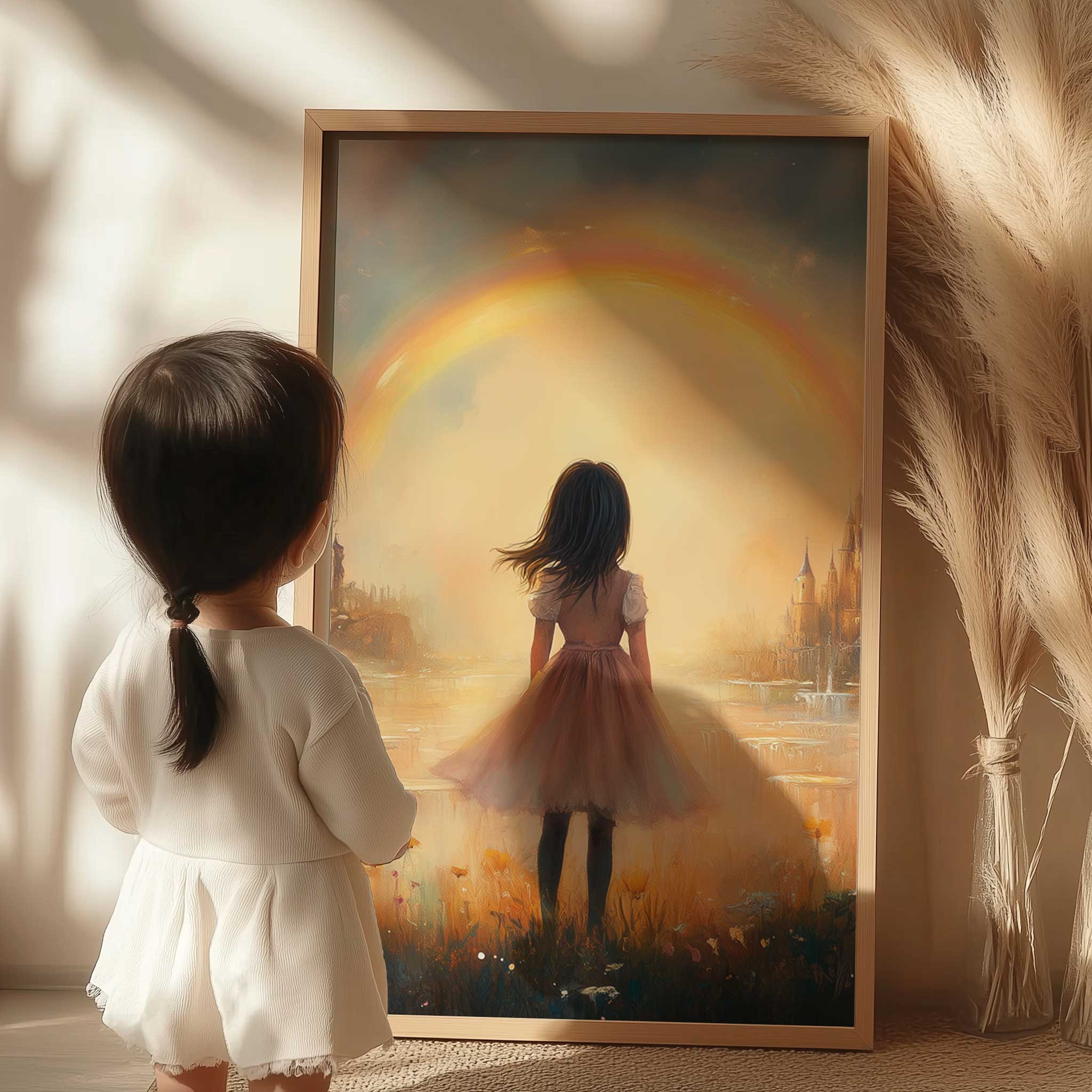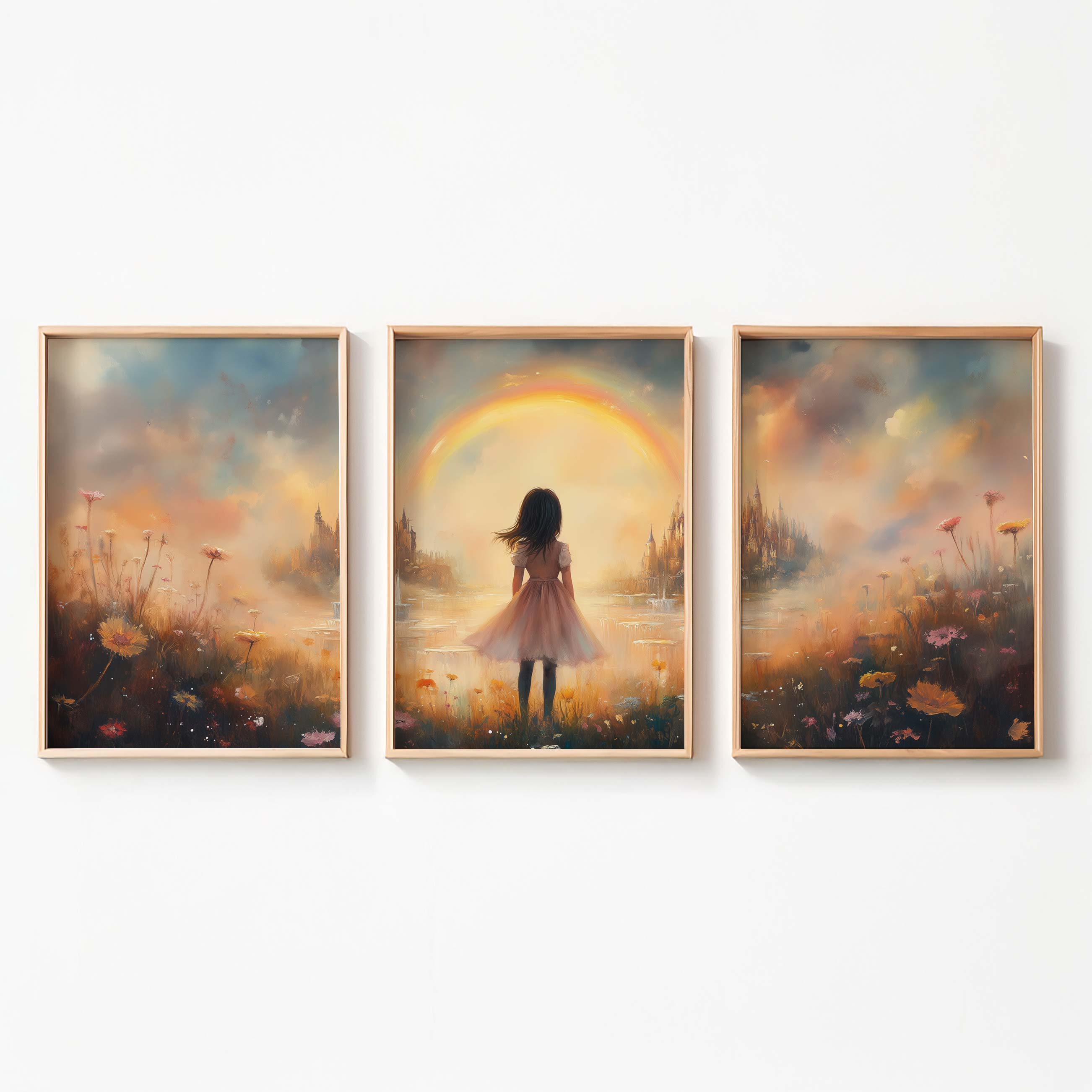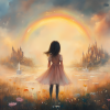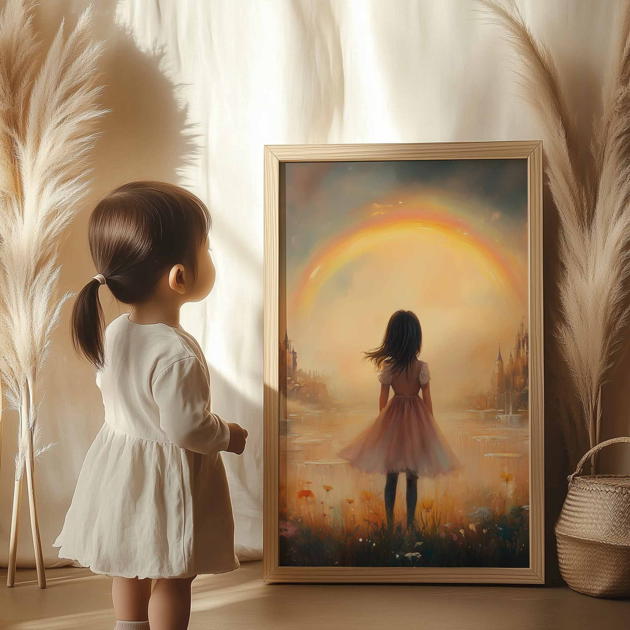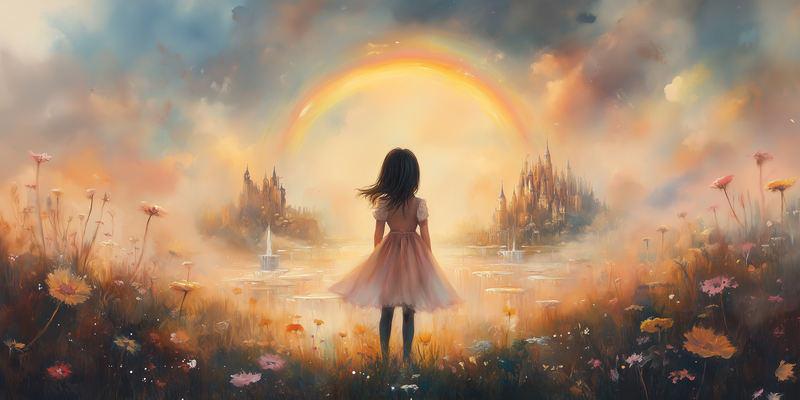 Dromerig Meisje bij Regenboog en Bloemenveld