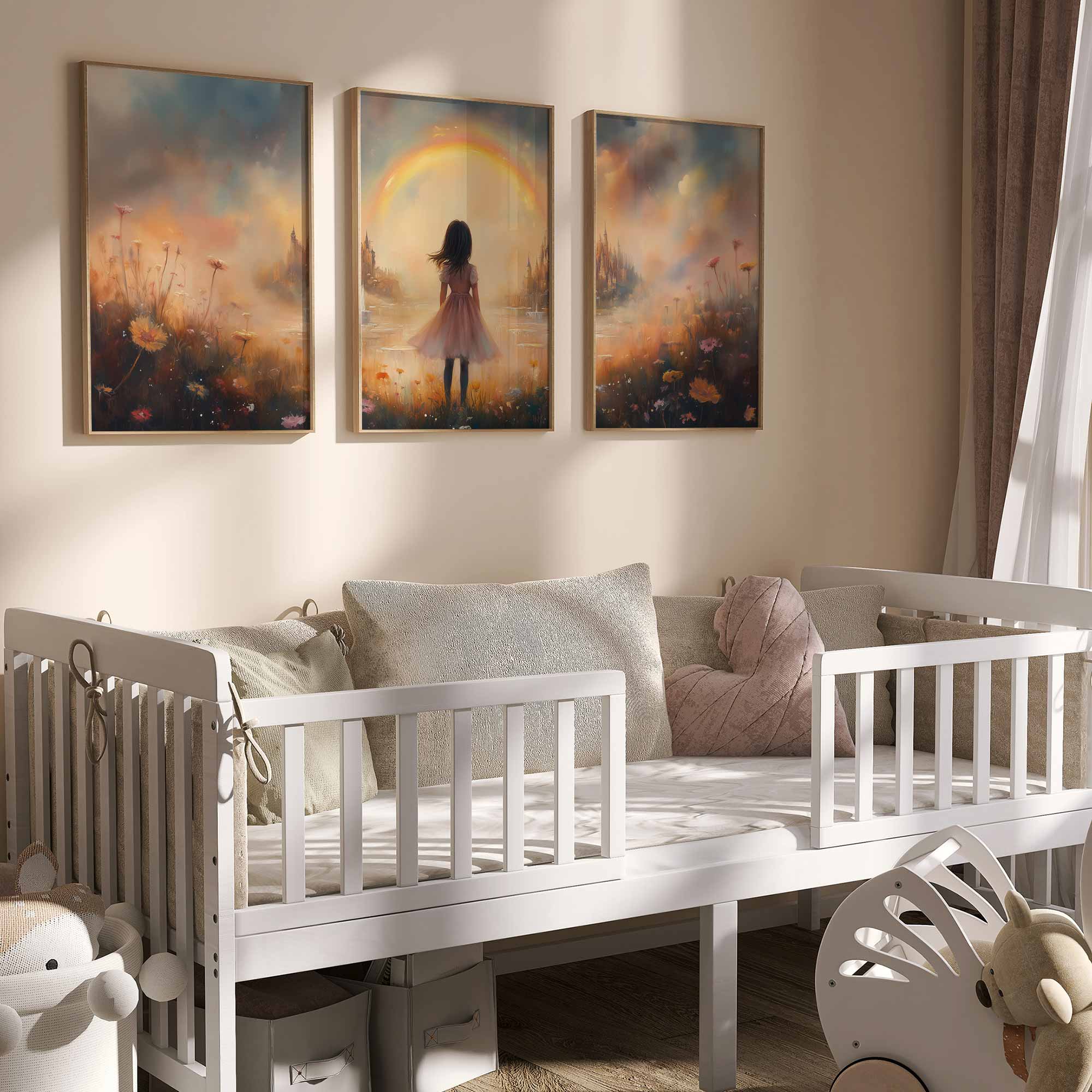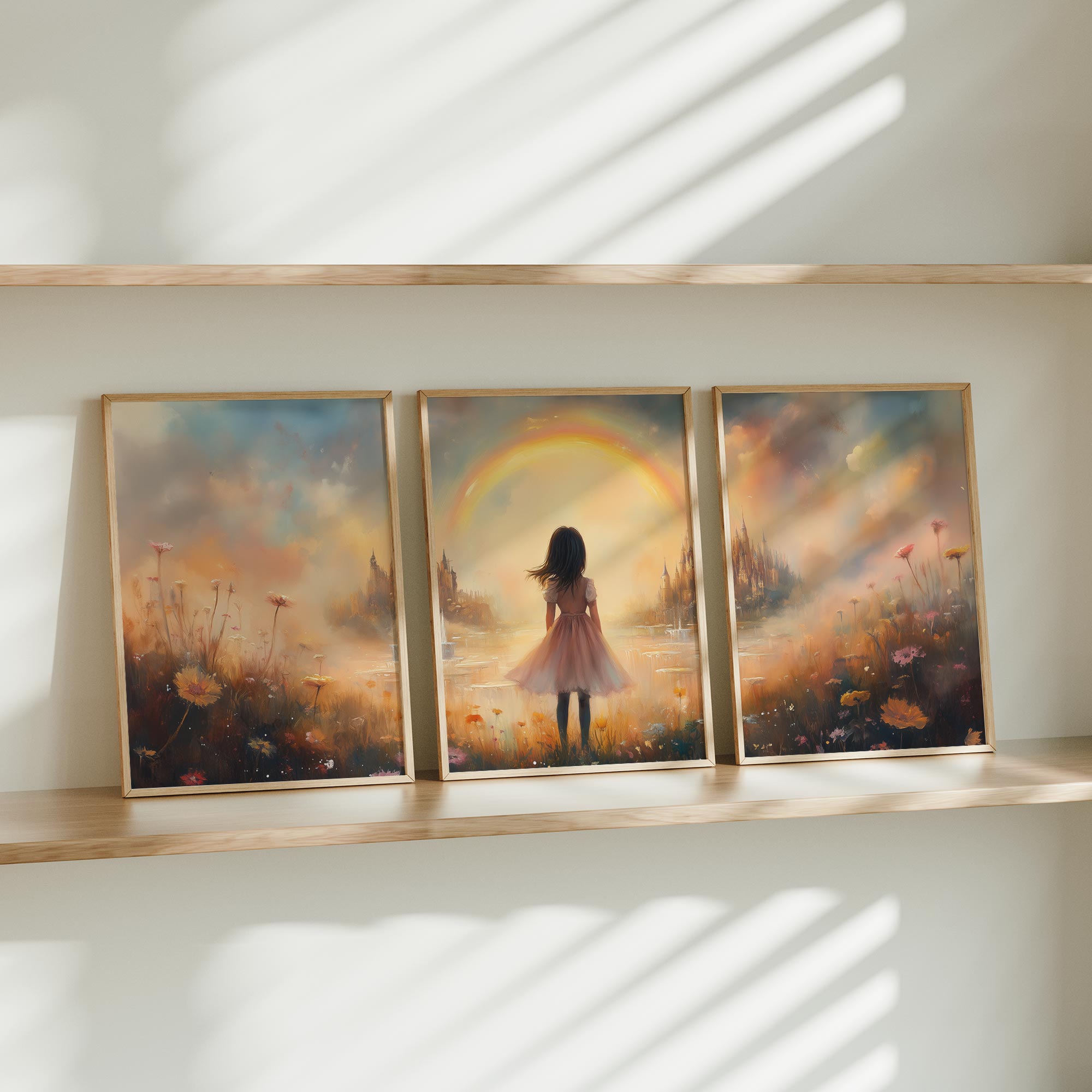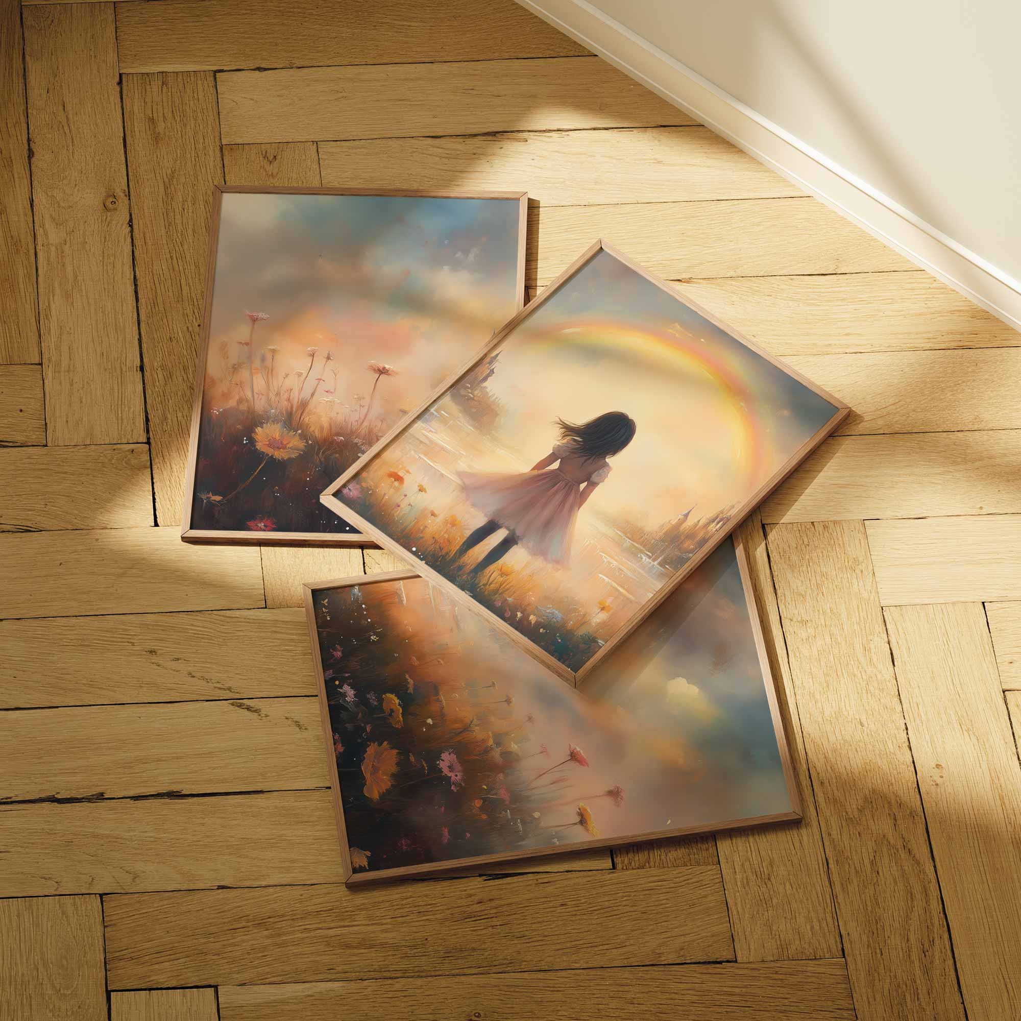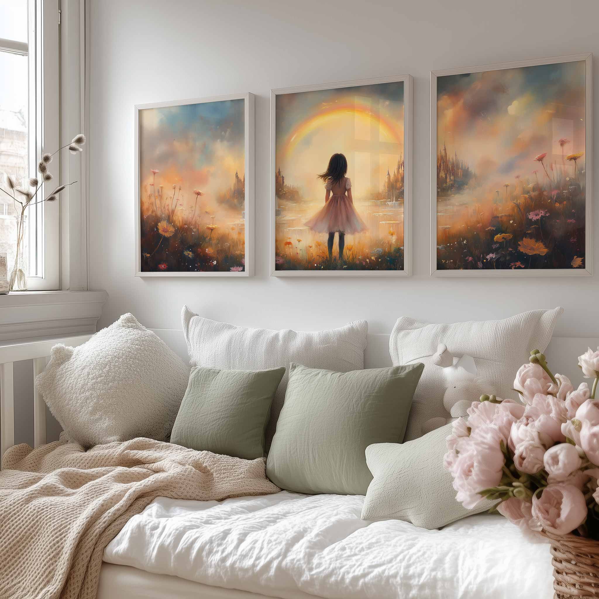 Dromerig Meisje bij Regenboog en Bloemenveld