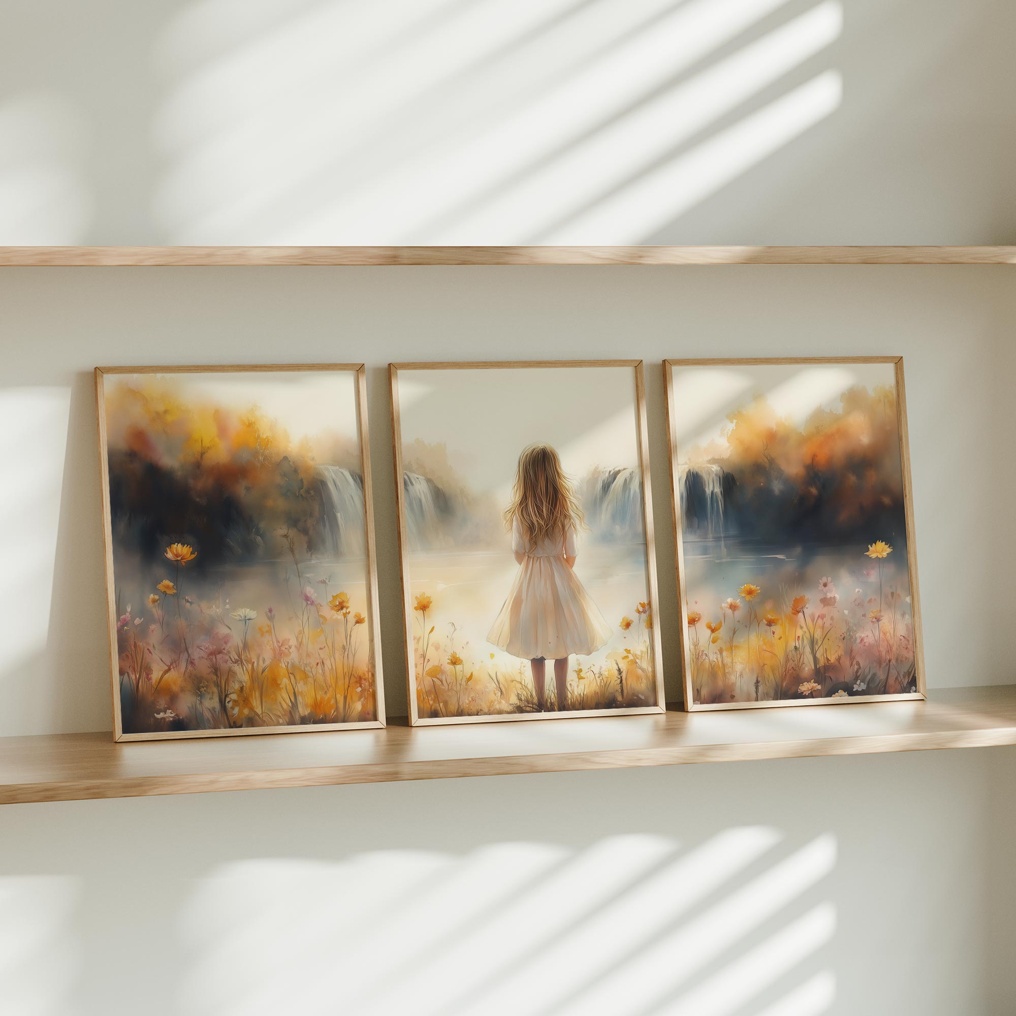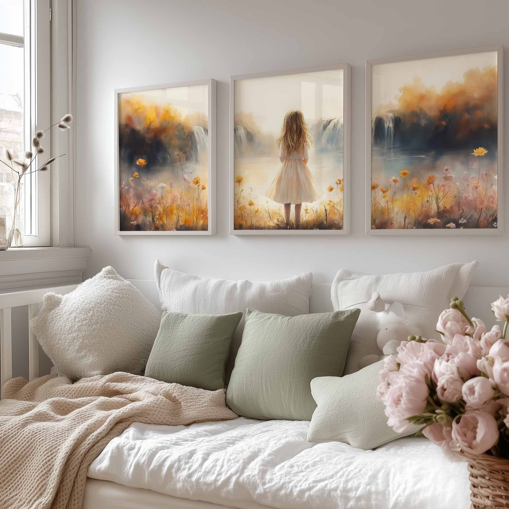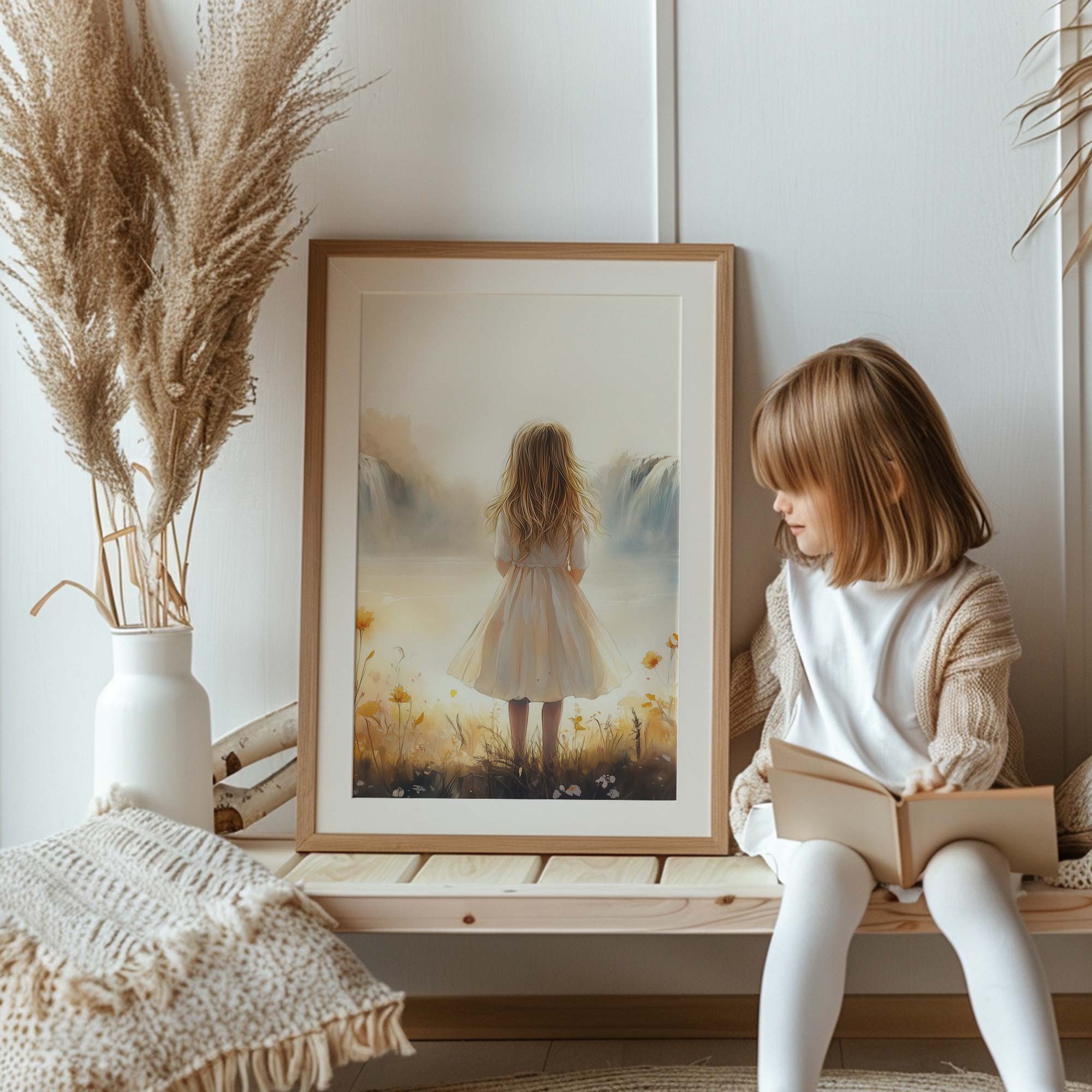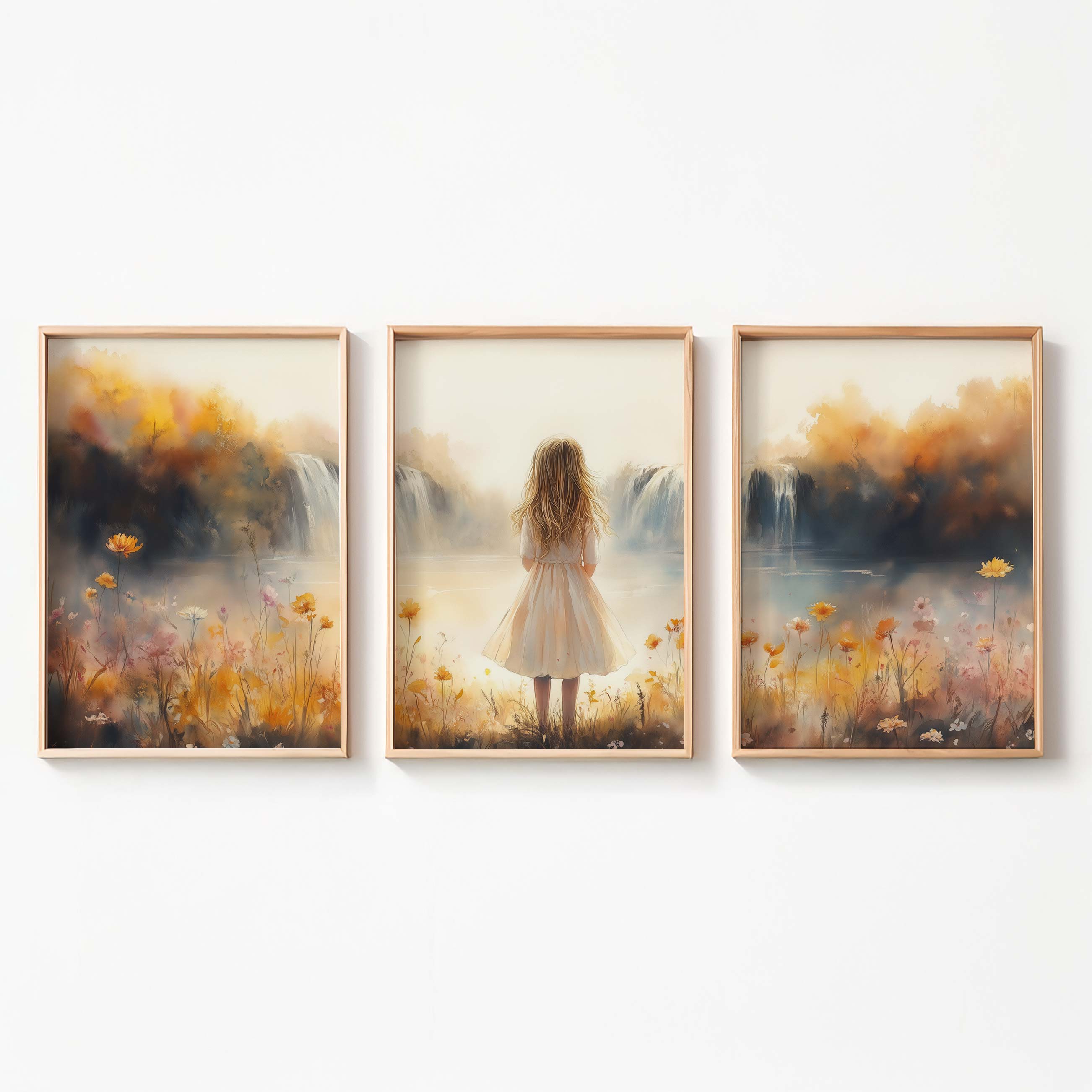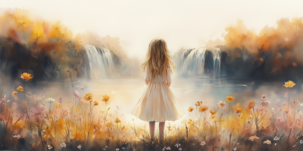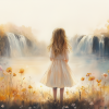 Dromerig Meisje bij Waterfall in Bloemenveld