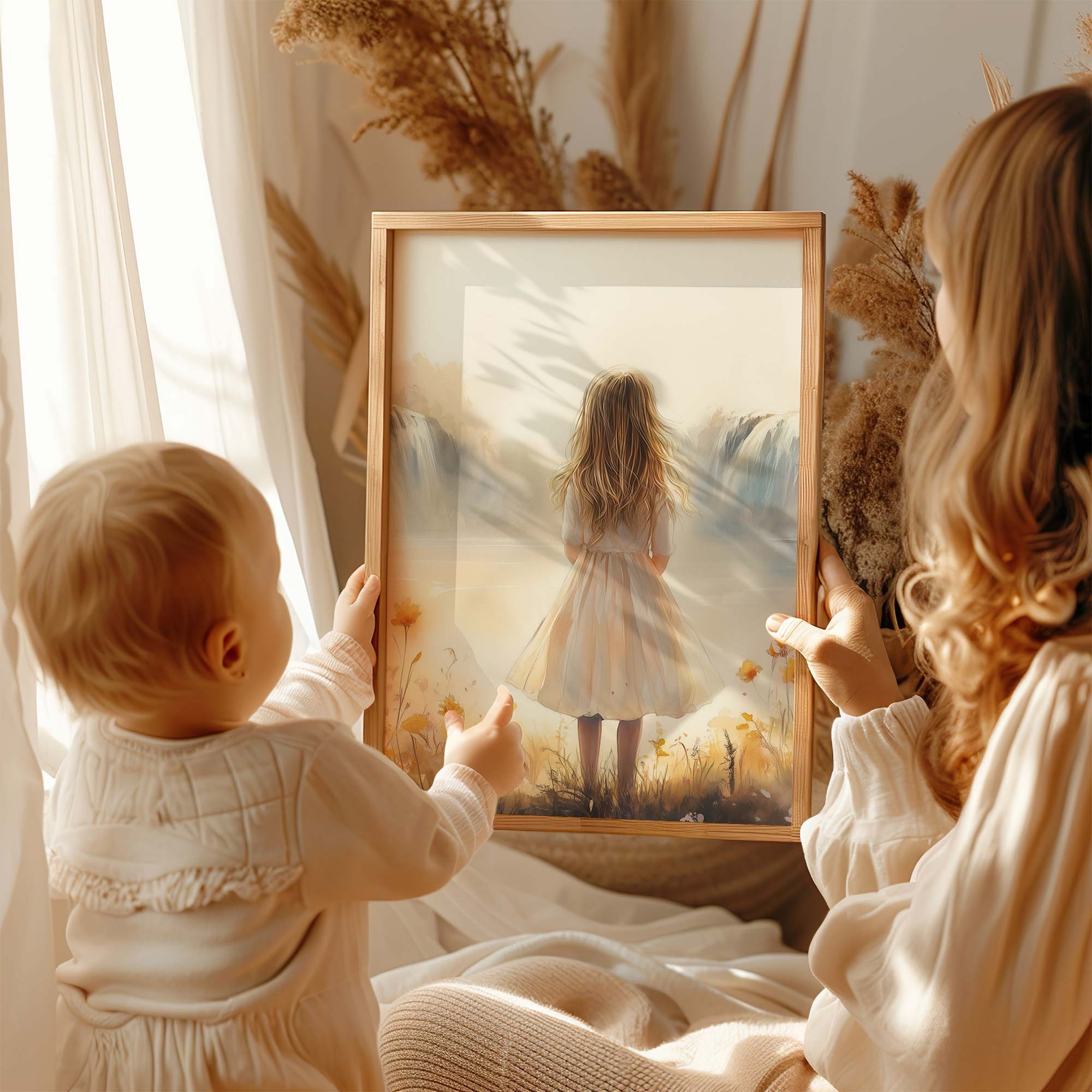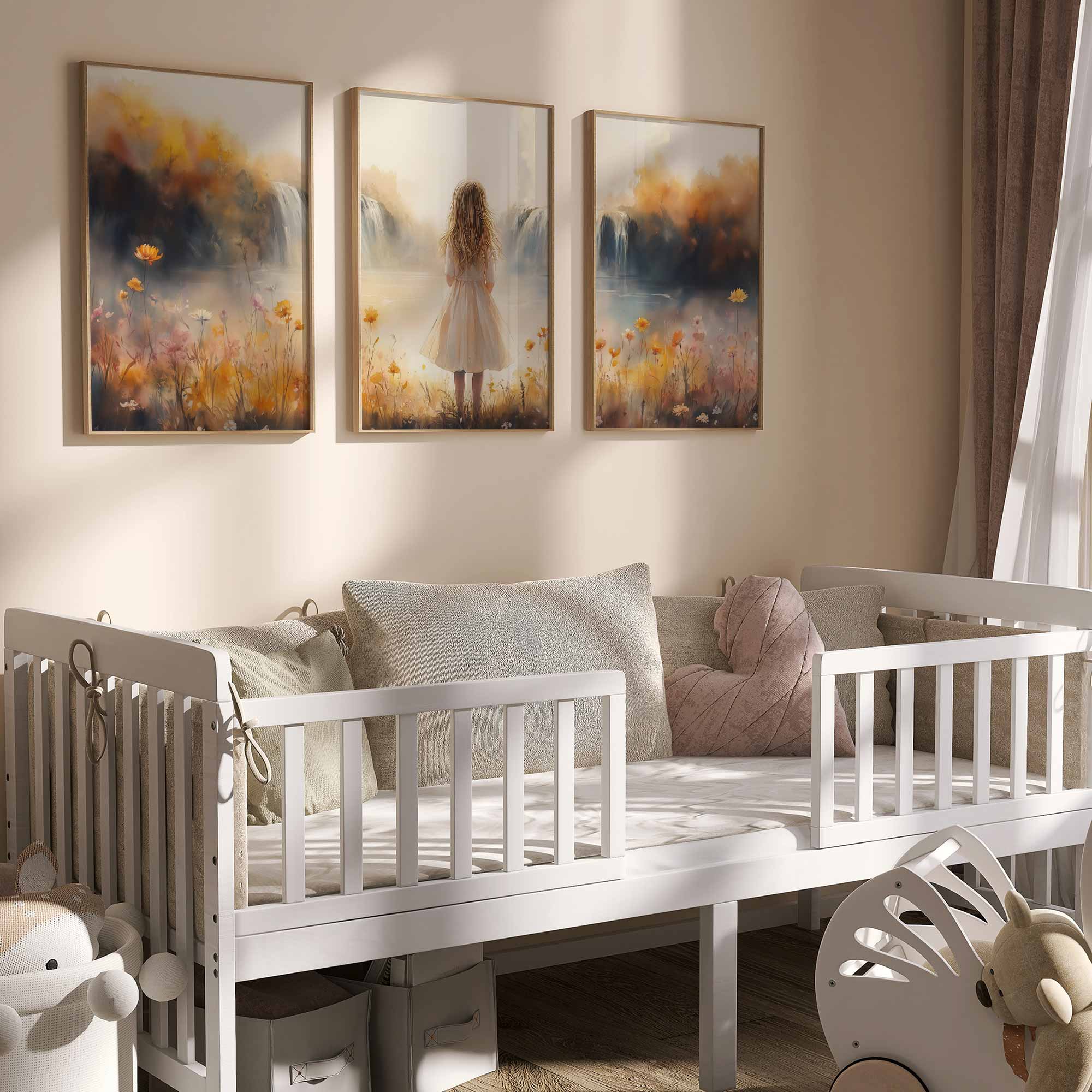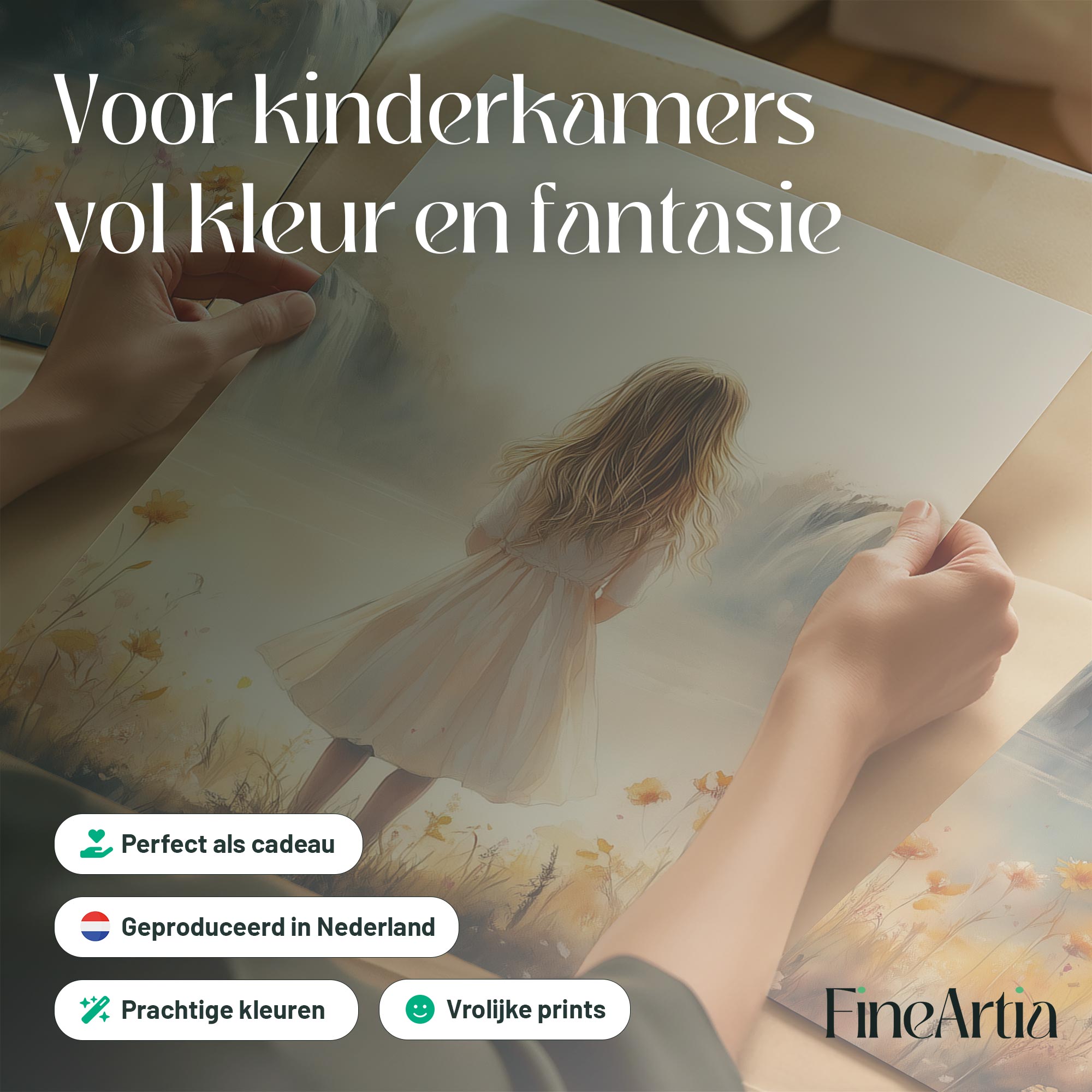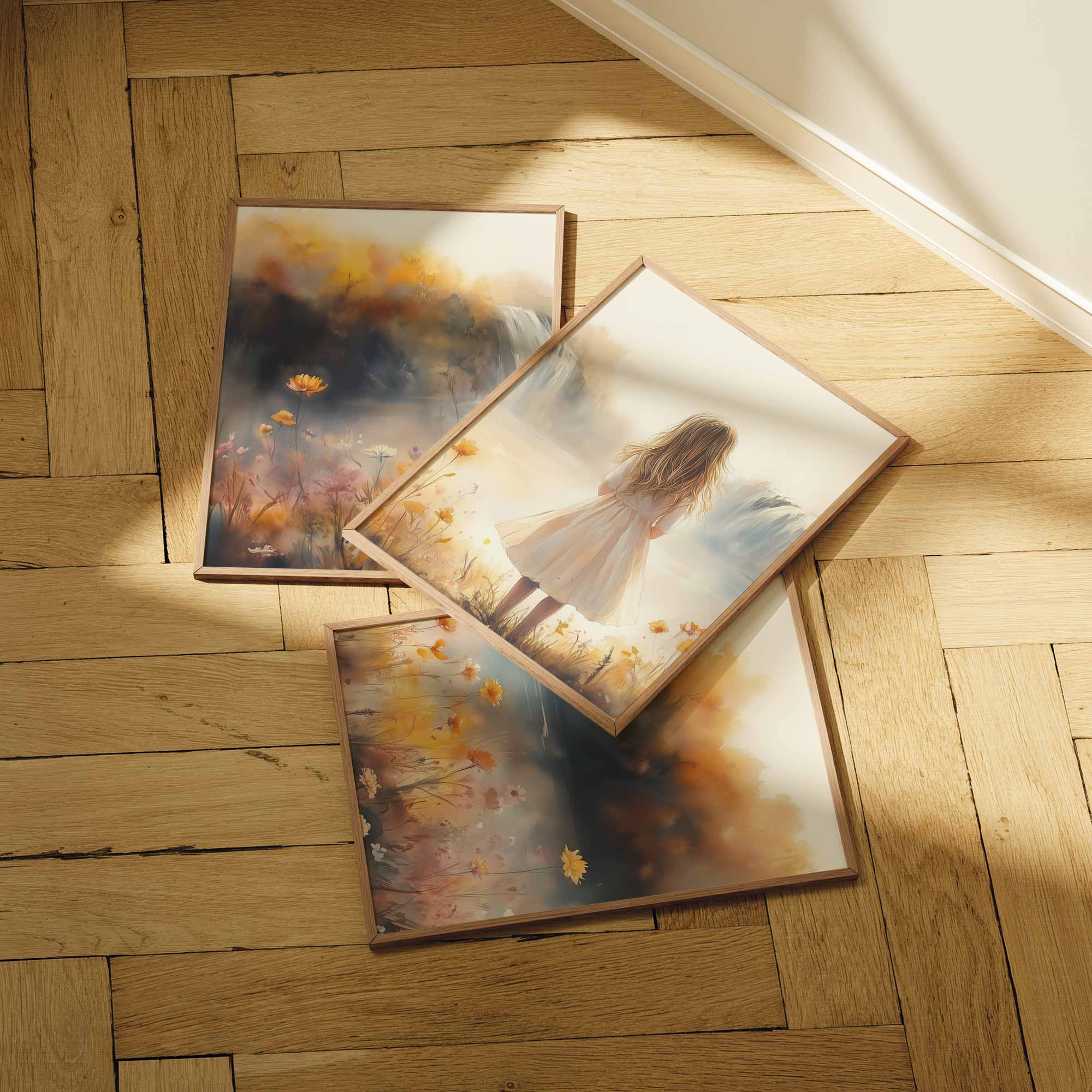 Dromerig Meisje bij Waterfall in Bloemenveld