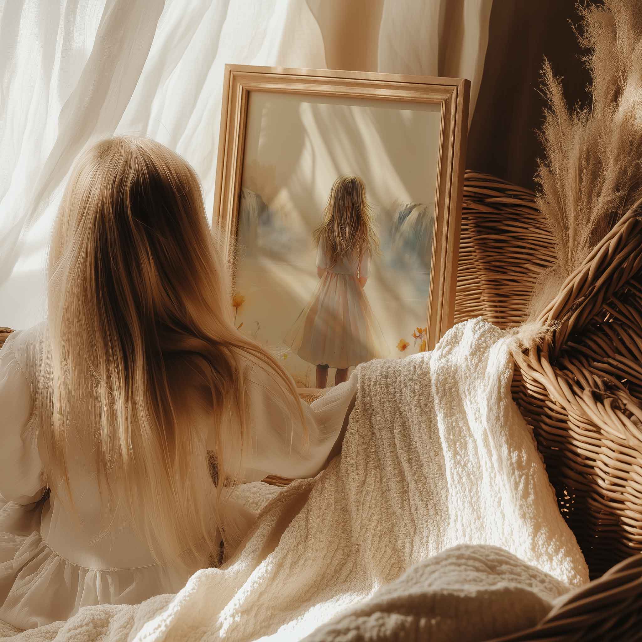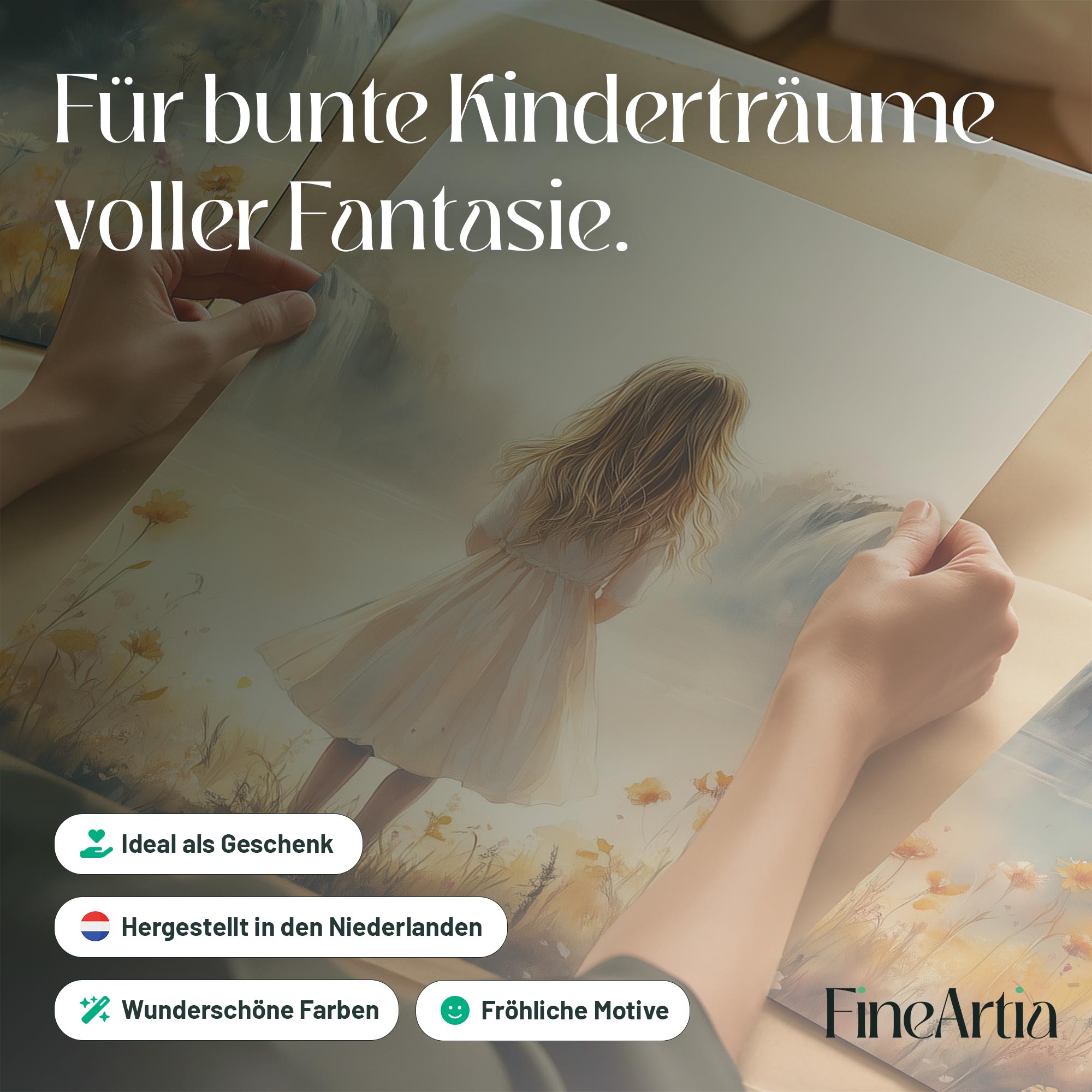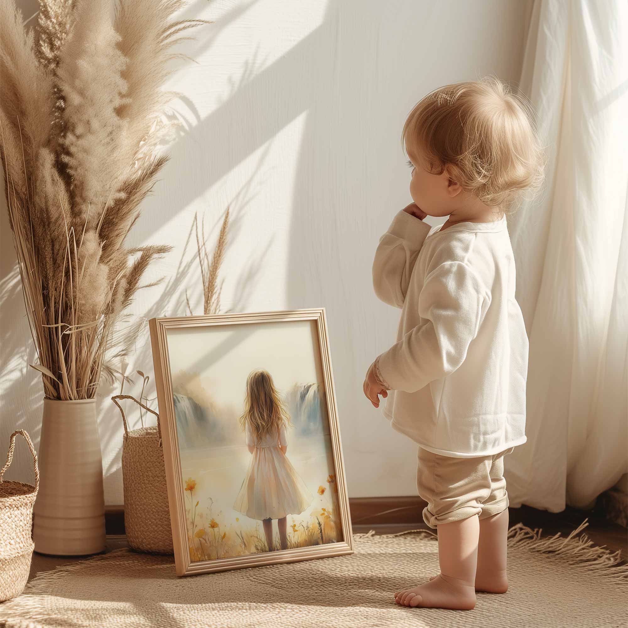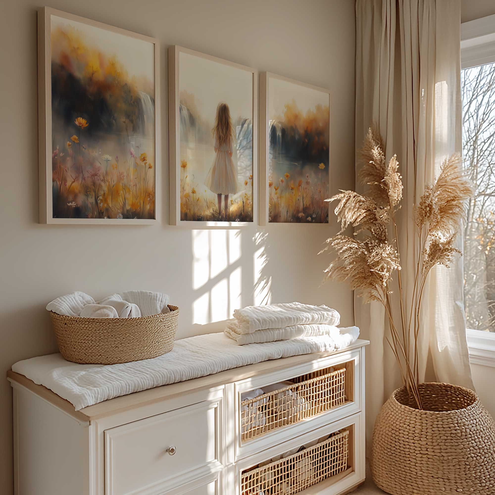 Dromerig Meisje bij Waterfall in Bloemenveld