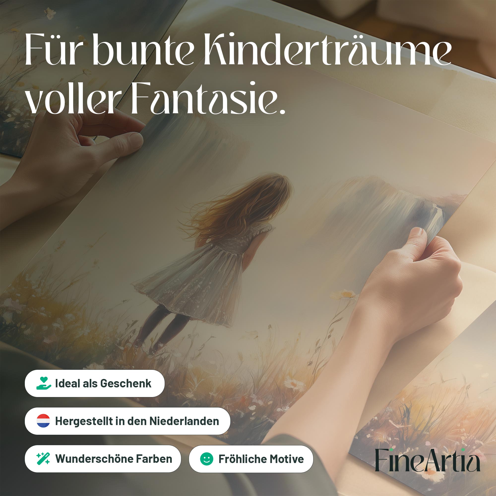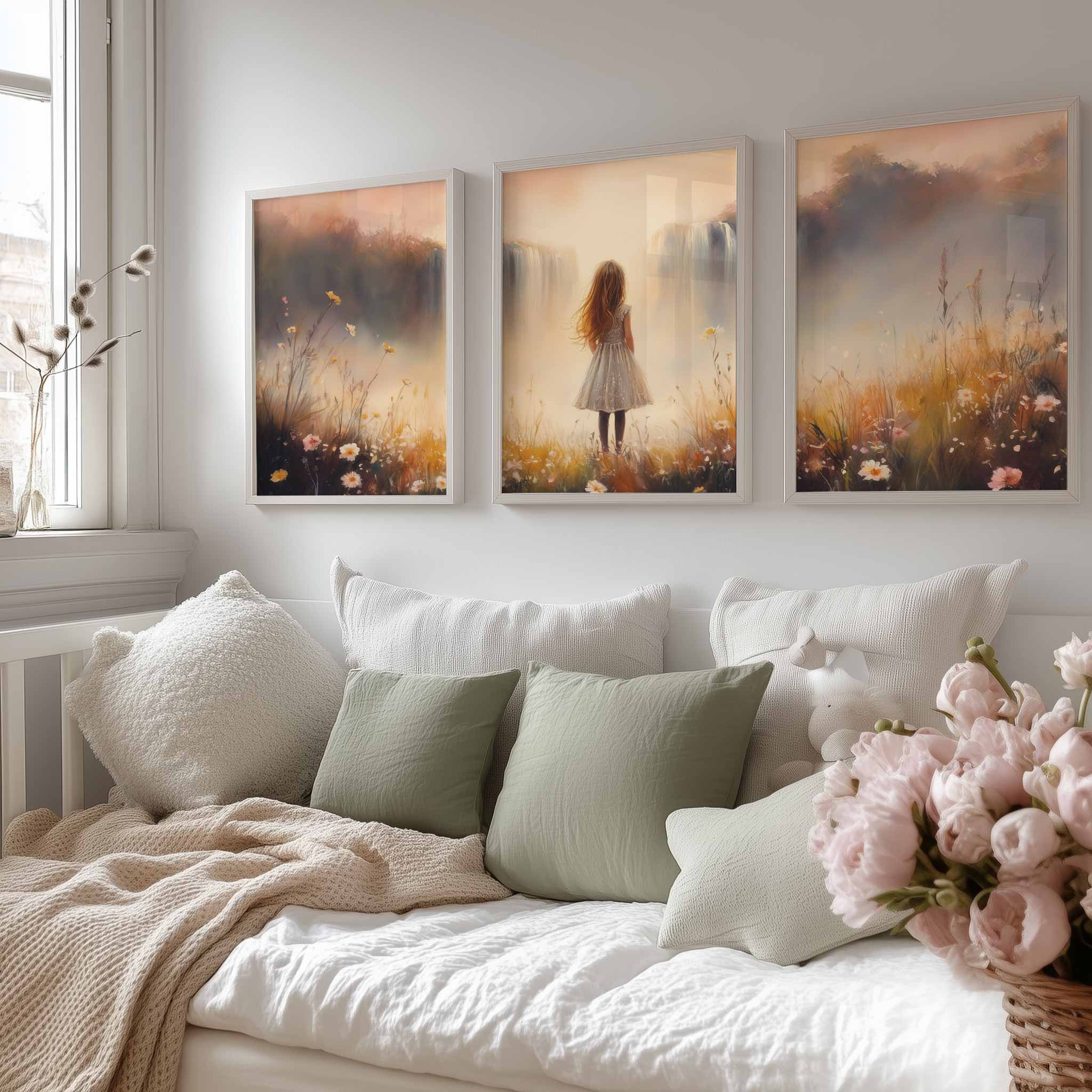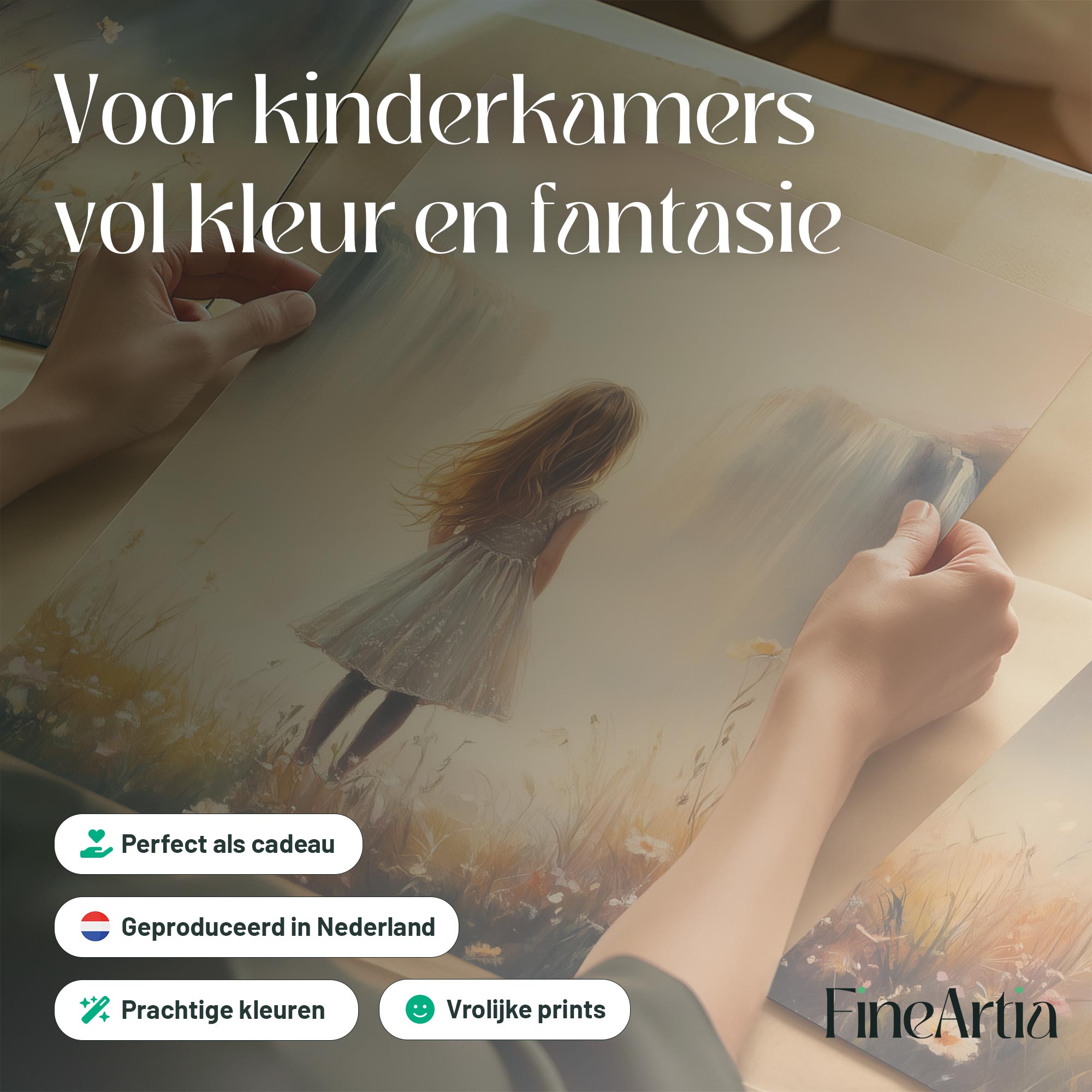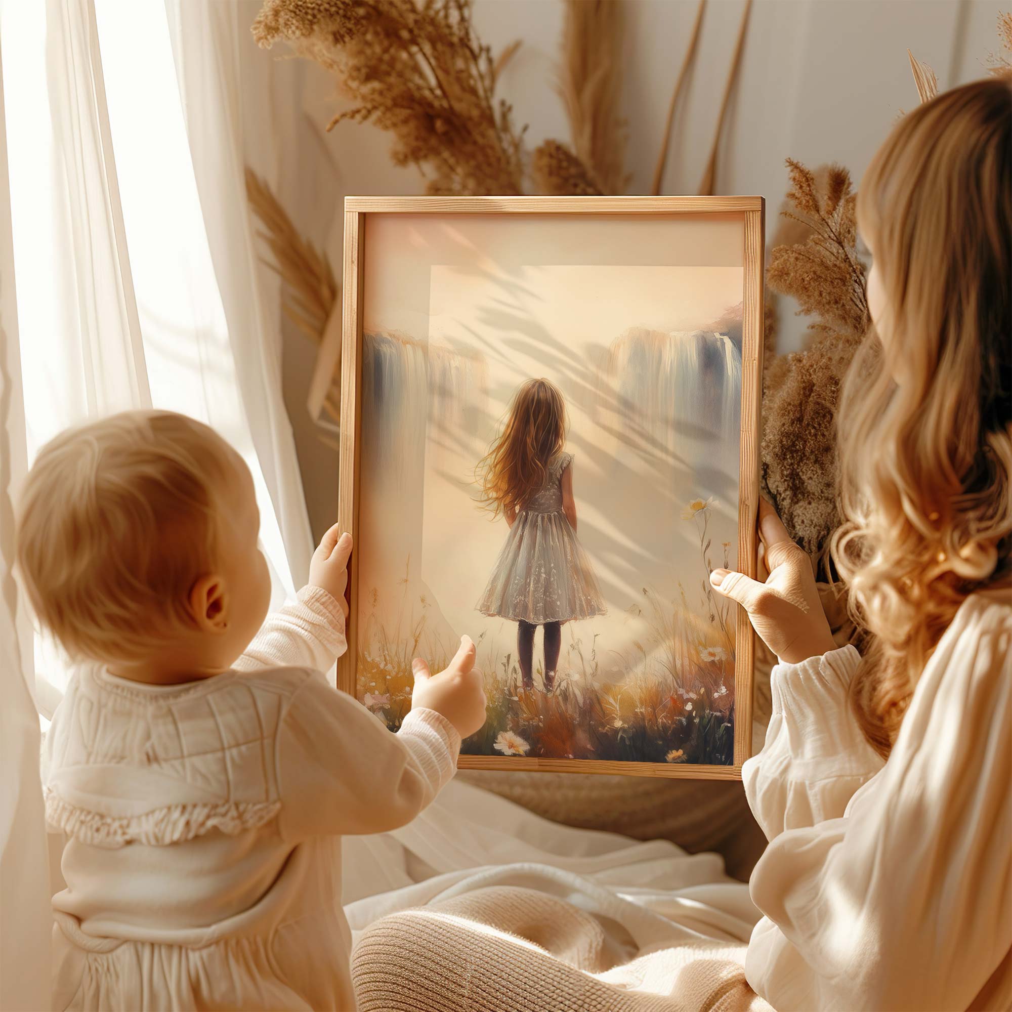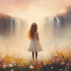 Terug naar collectie Posters Dromerig Meisje bij Waterval en Bloemenveld
