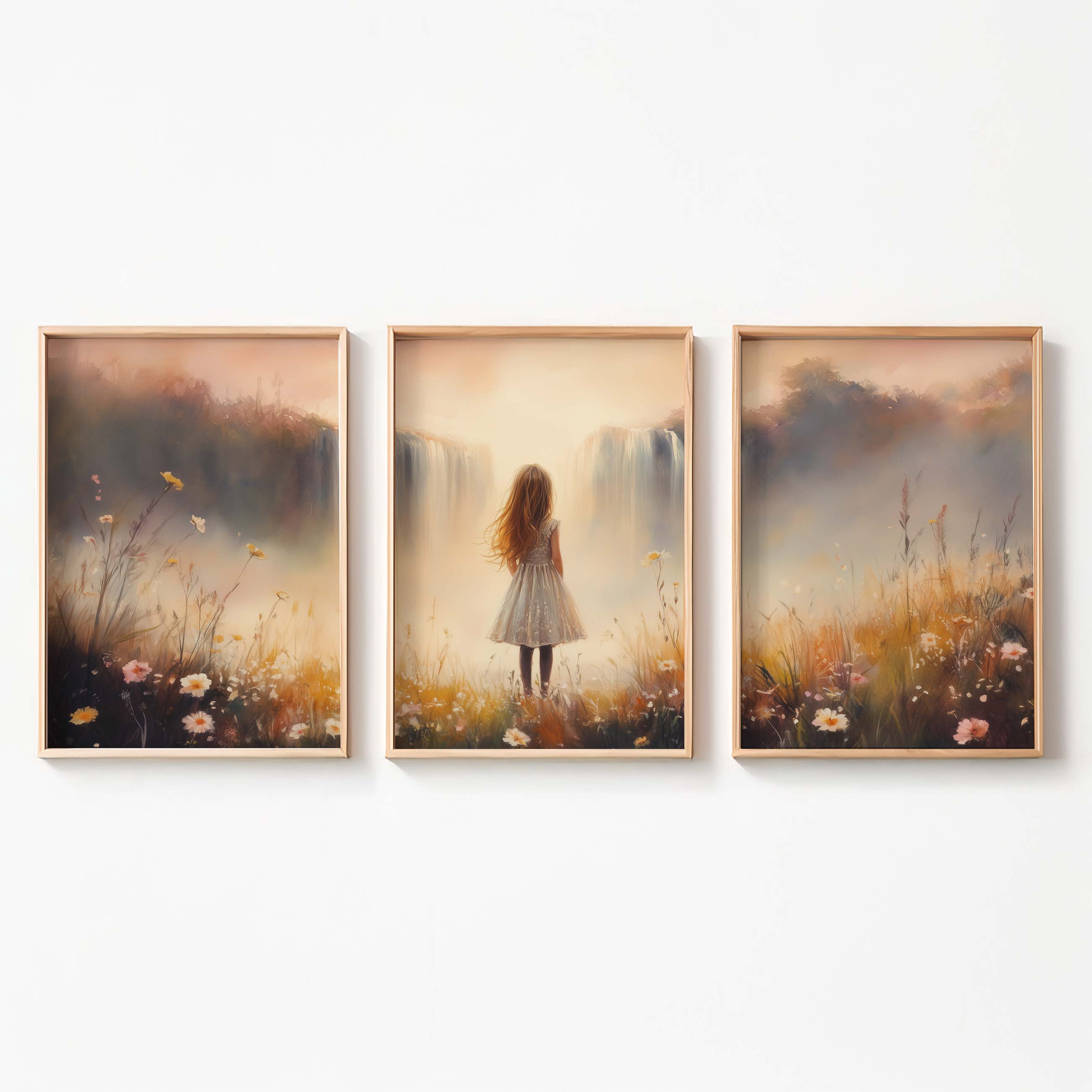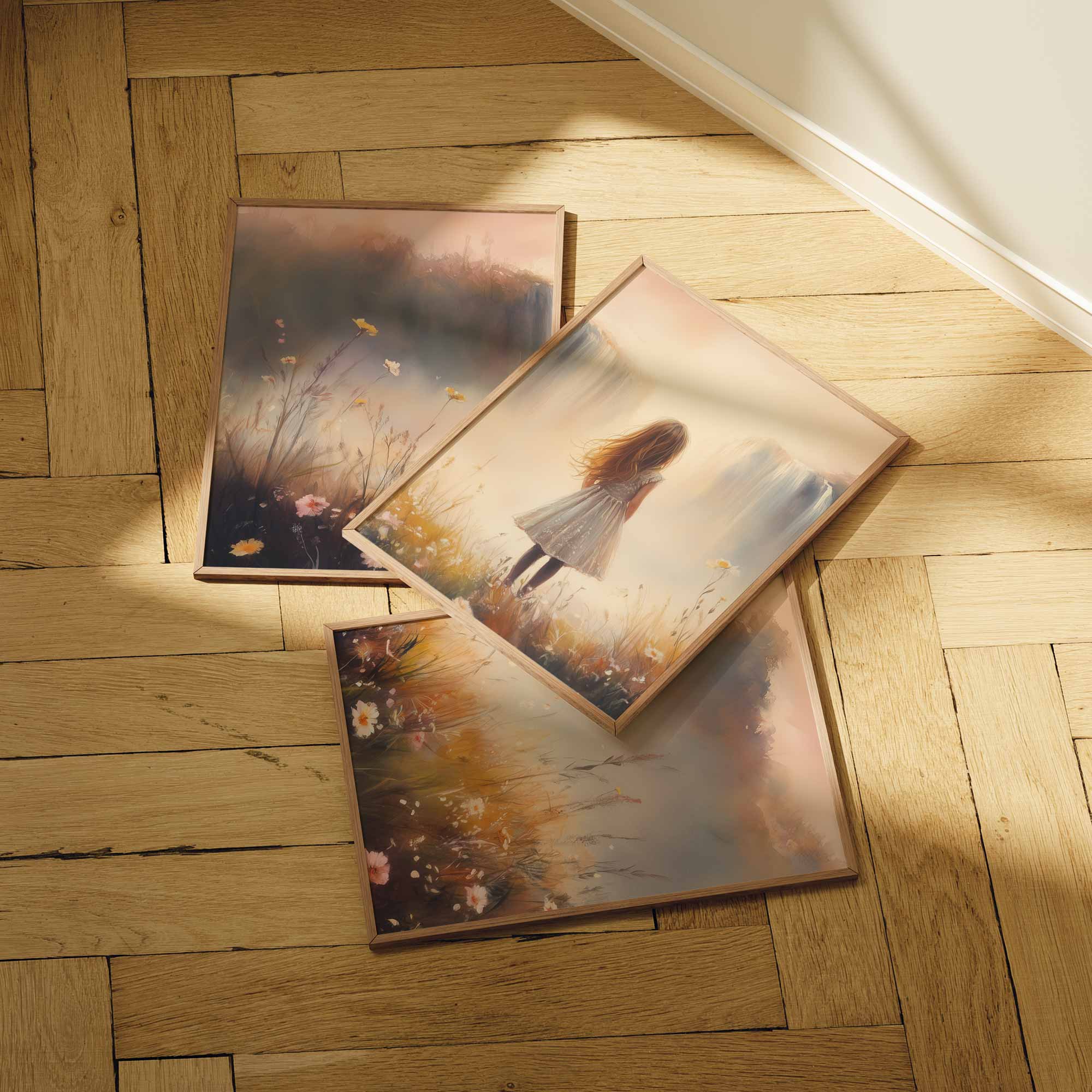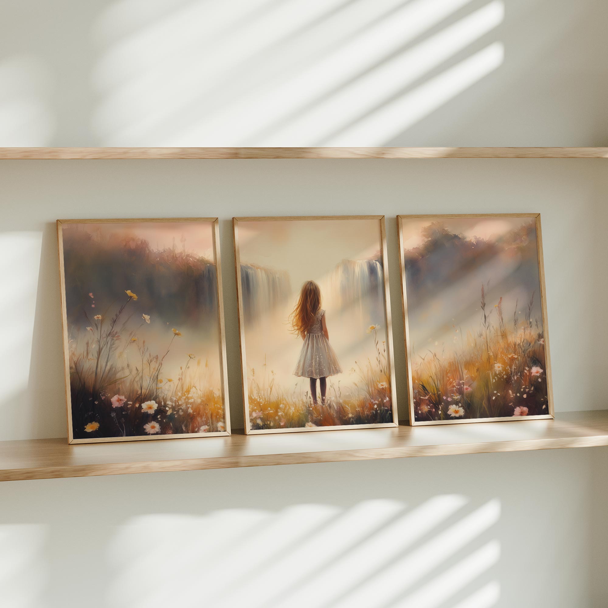 Terug naar collectie Posters Dromerig Meisje bij Waterval en Bloemenveld