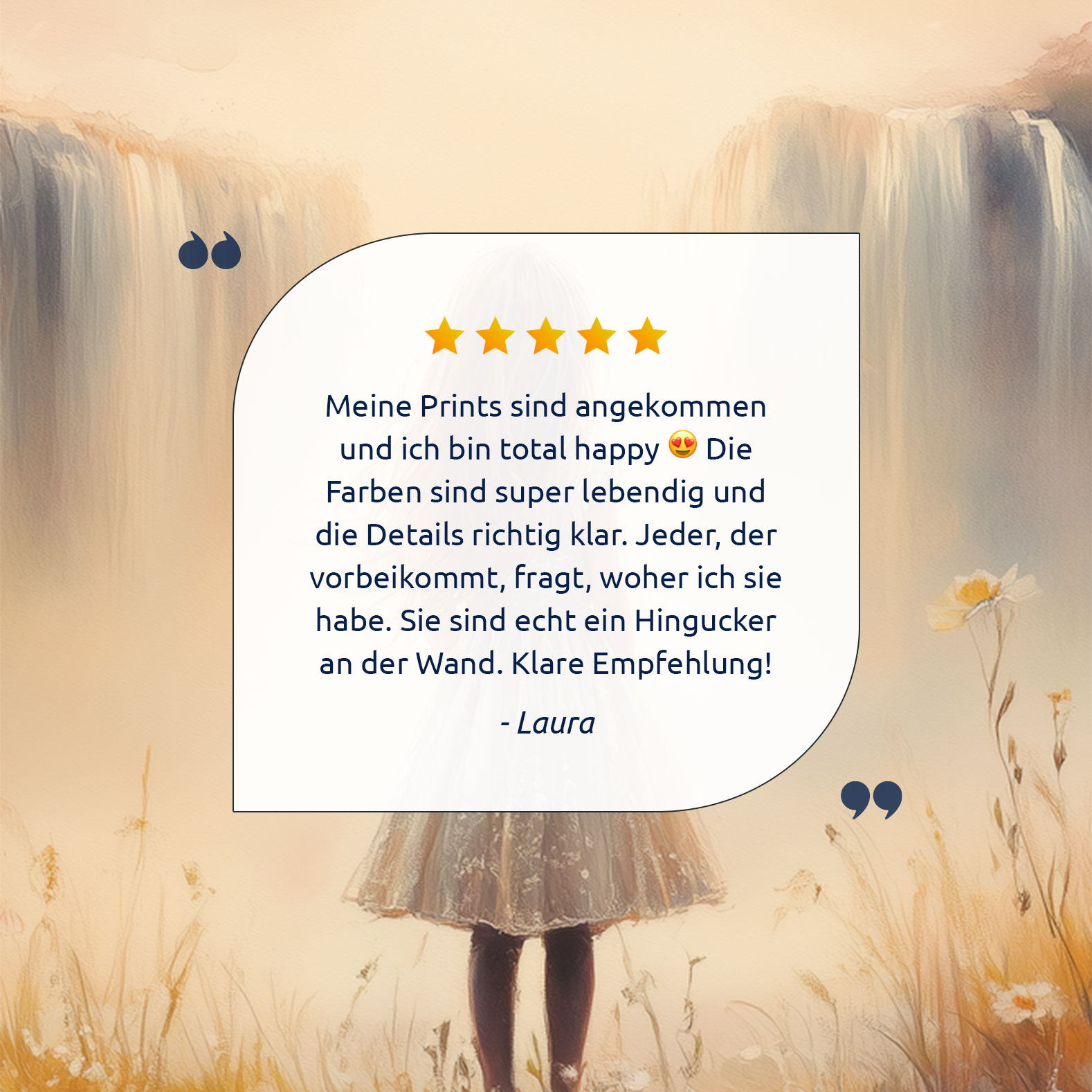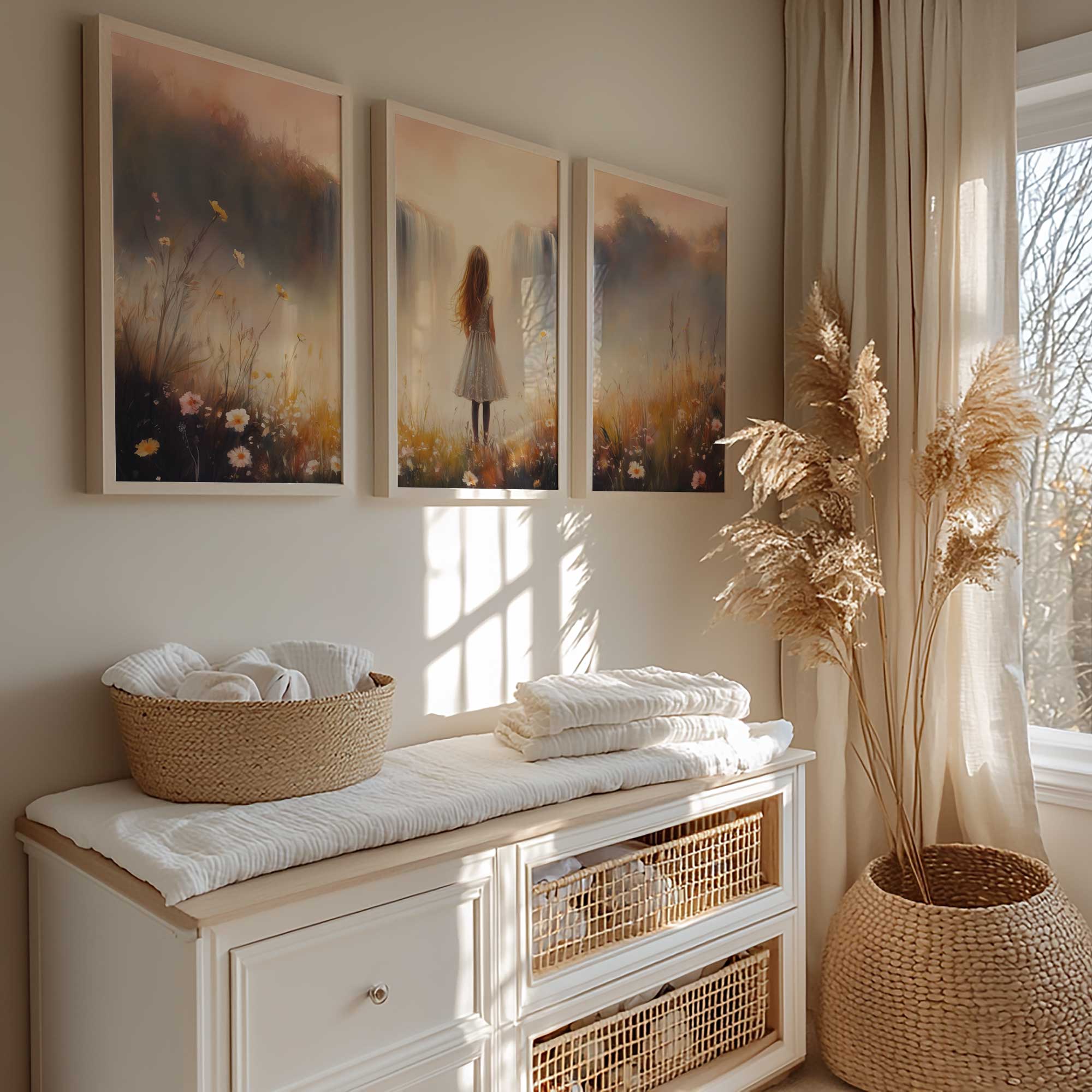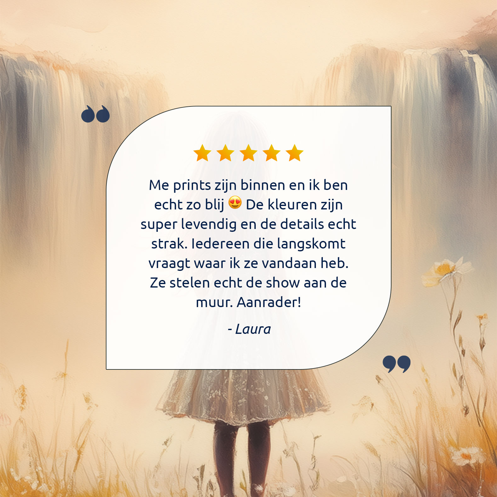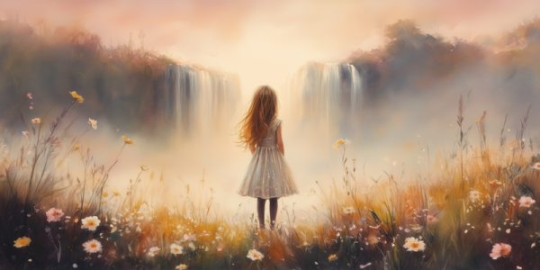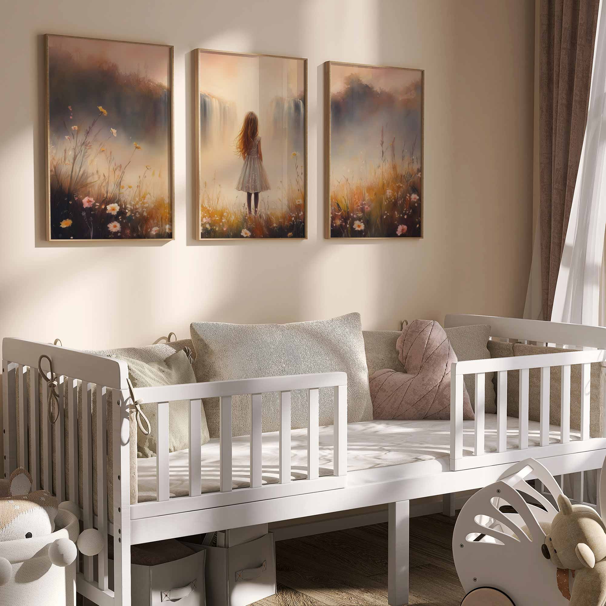 Terug naar collectie Posters Dromerig Meisje bij Waterval en Bloemenveld