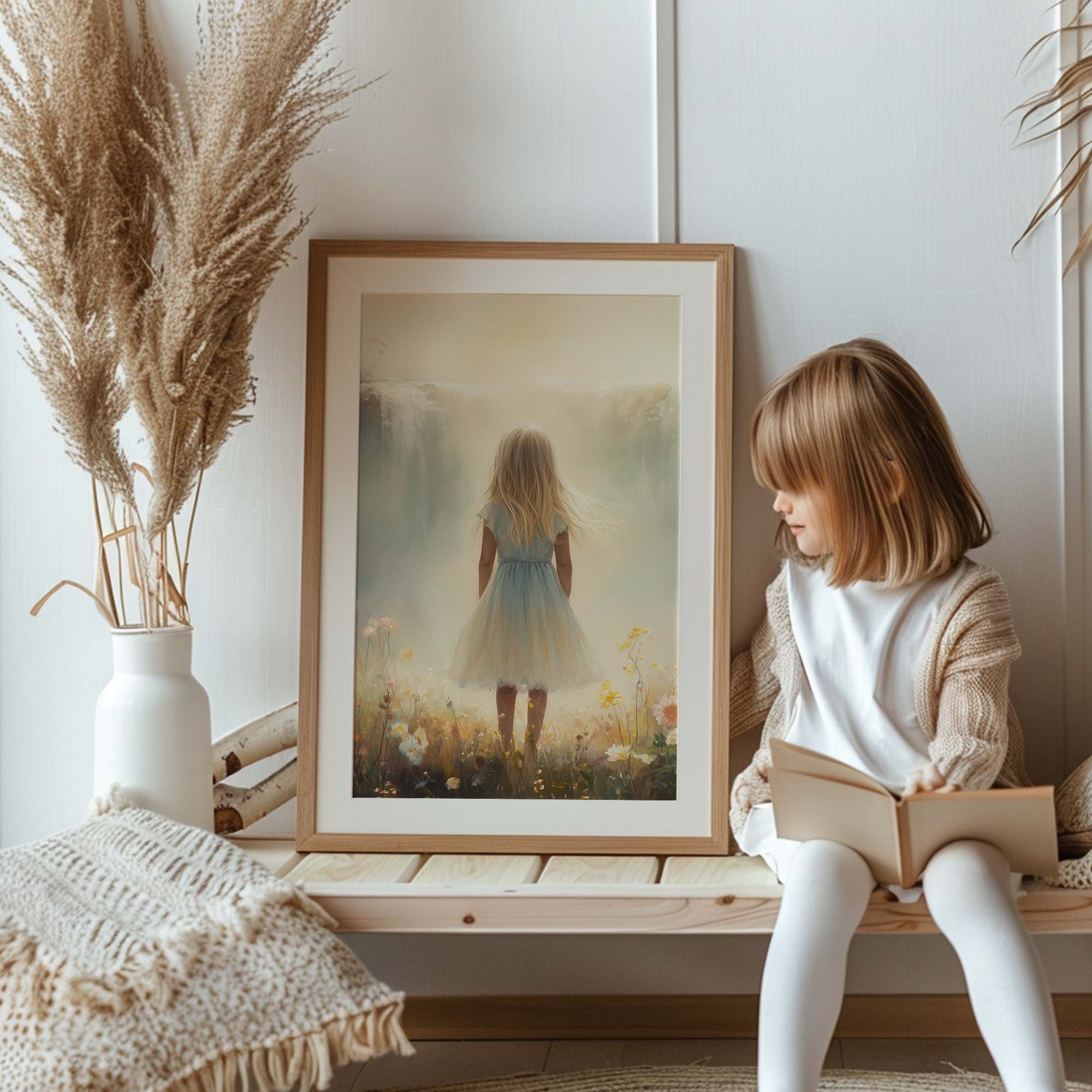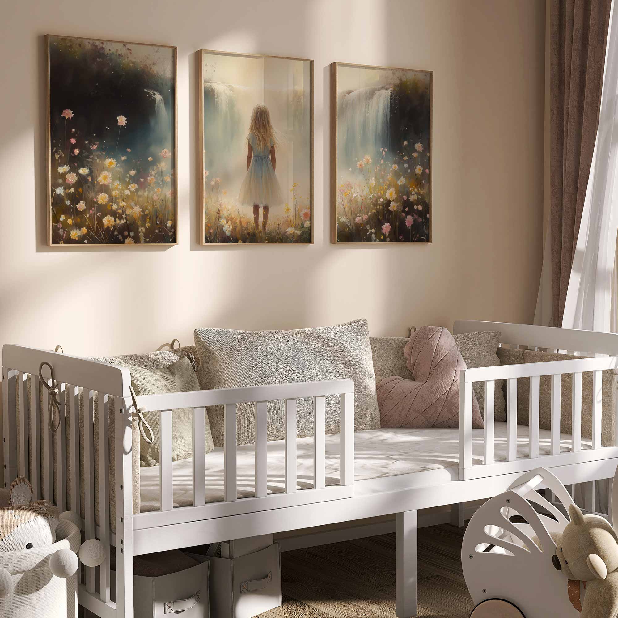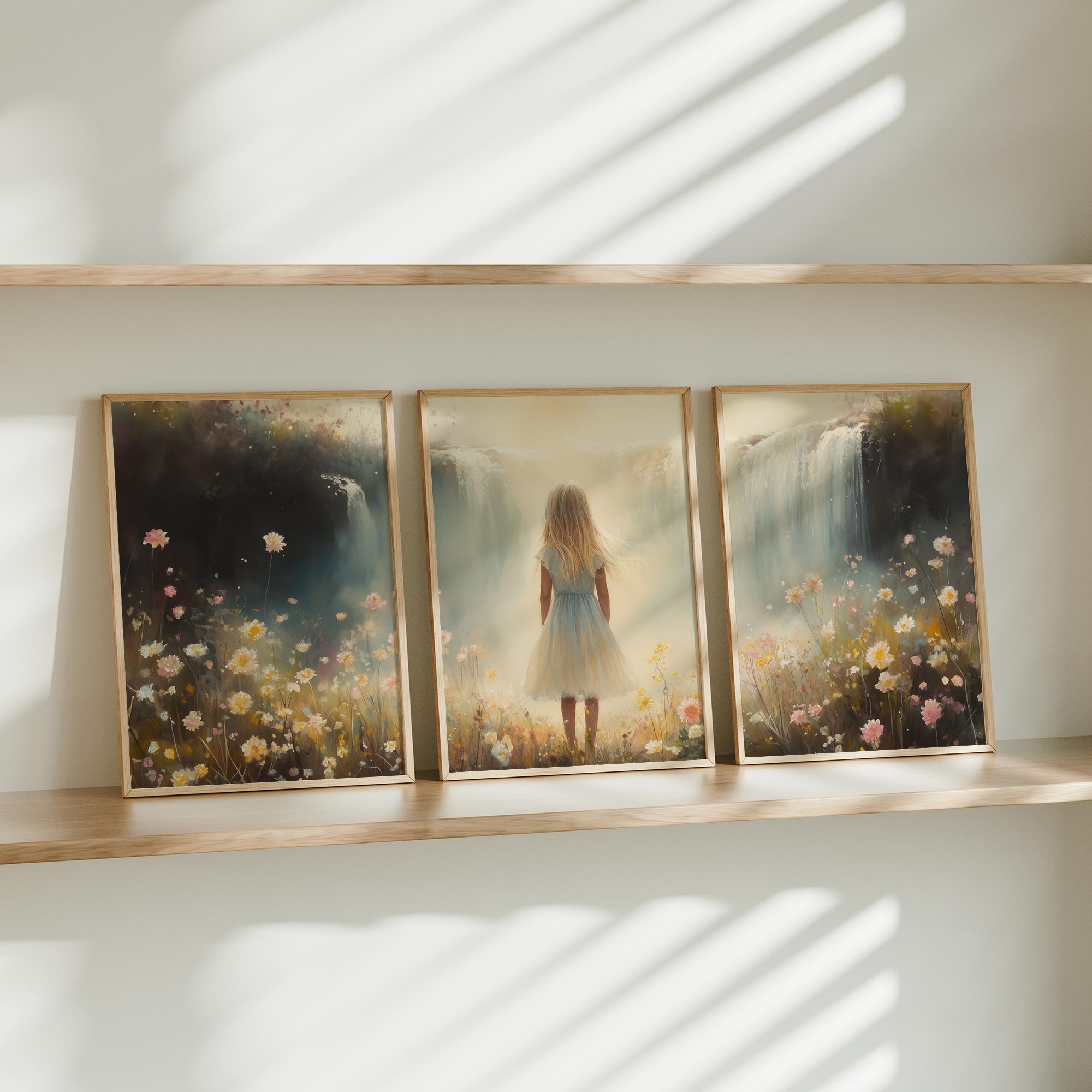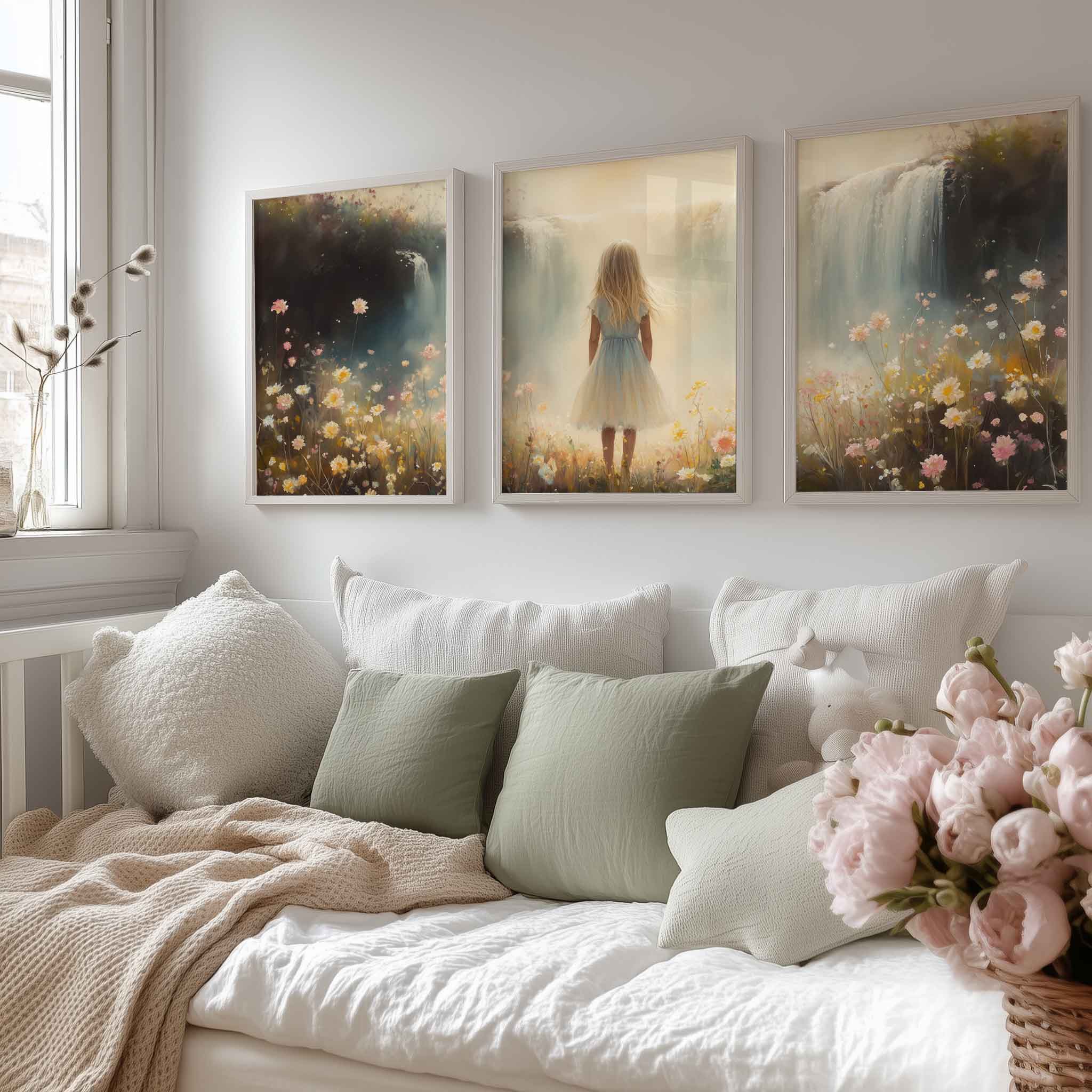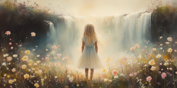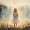 Dromerig Meisje bij Waterval in Pastel Bloemenveld