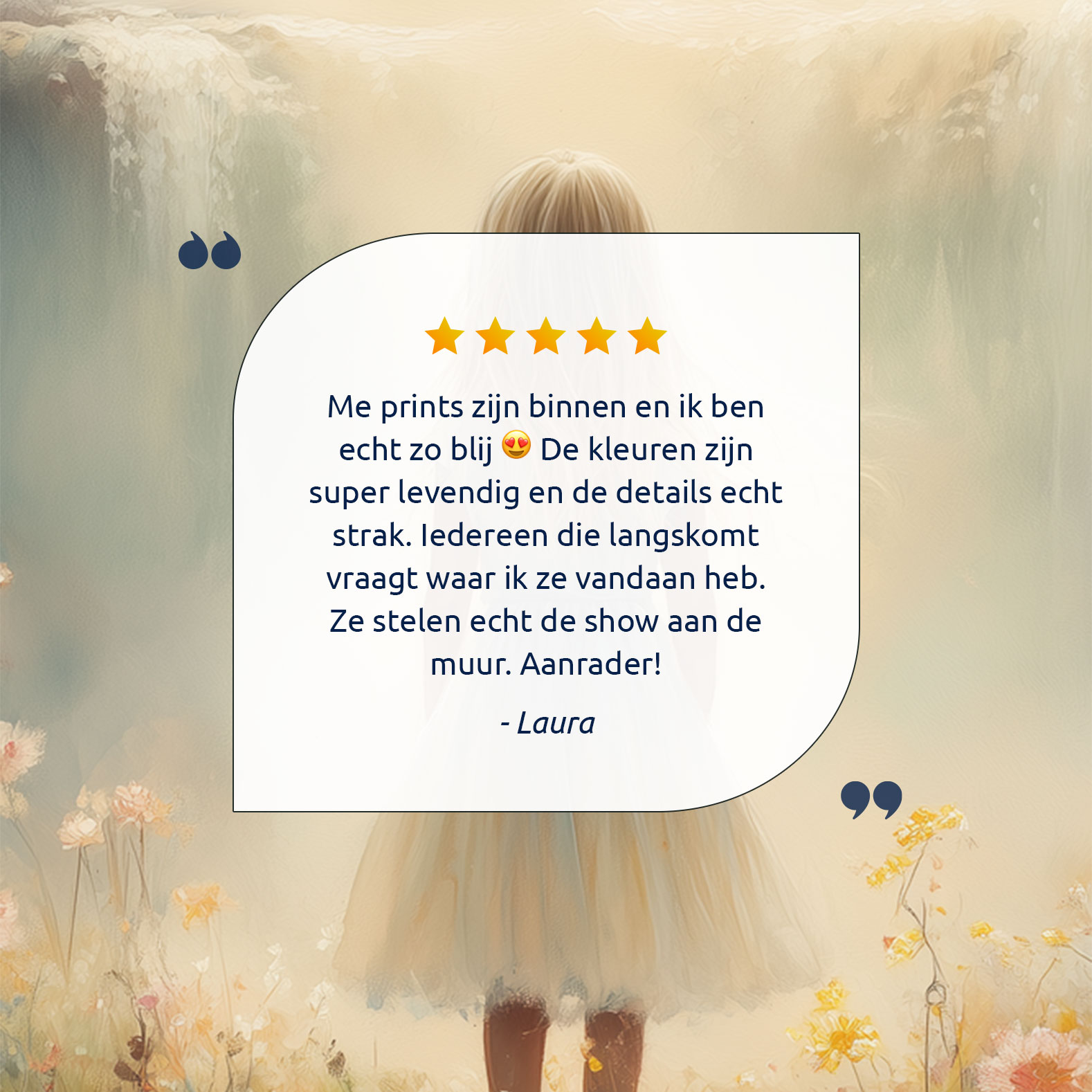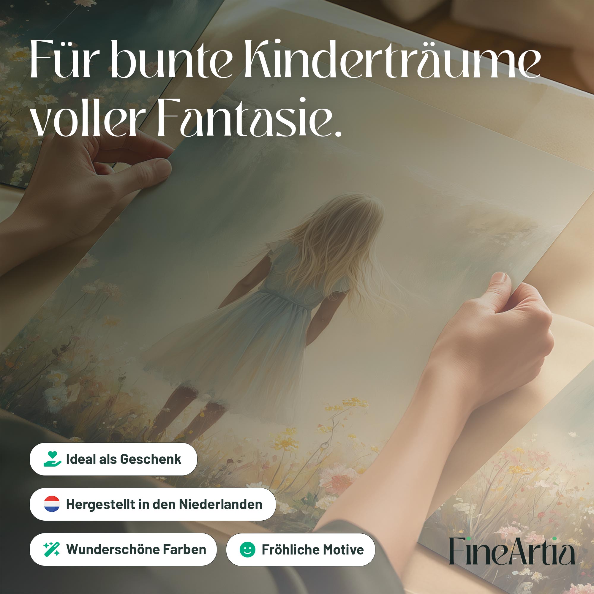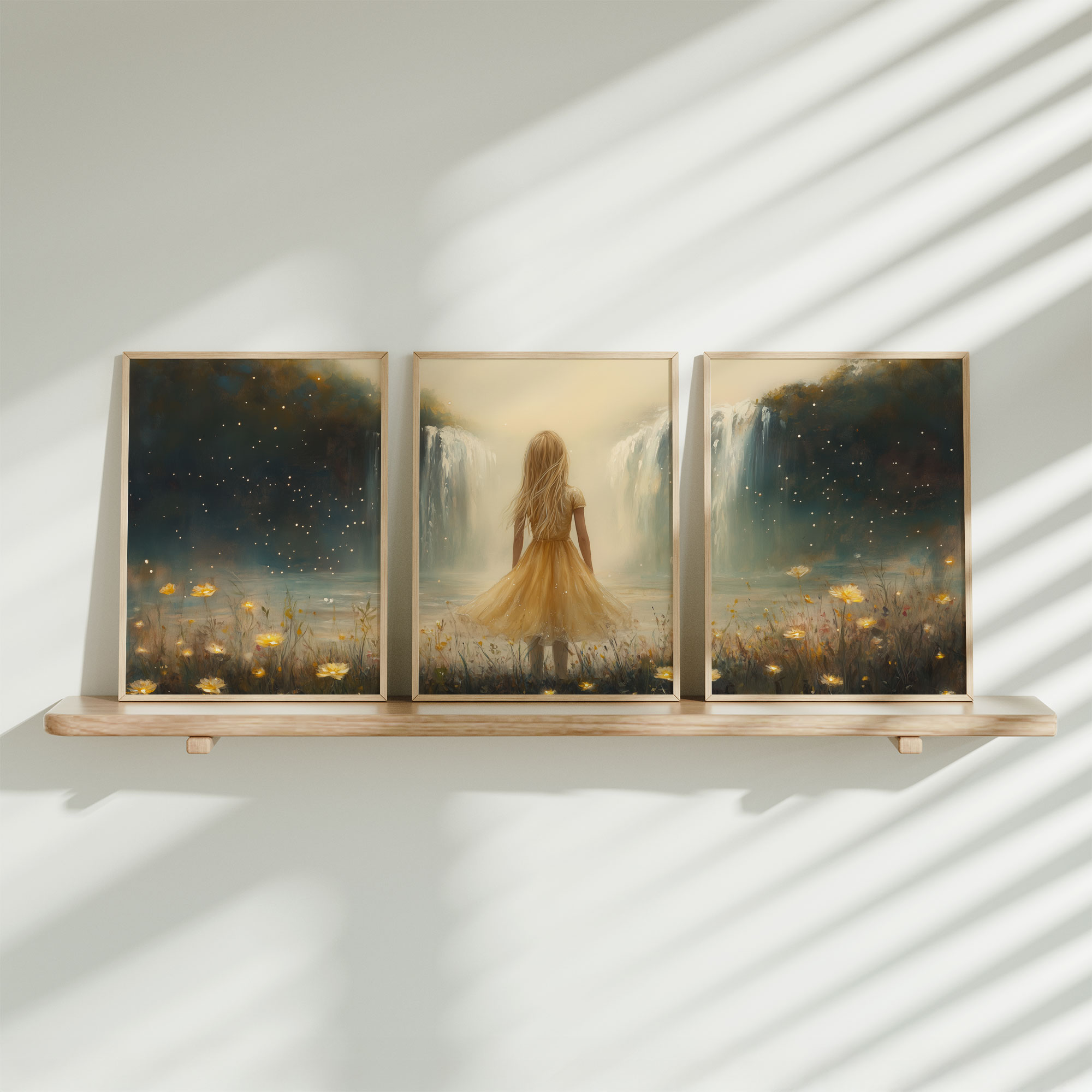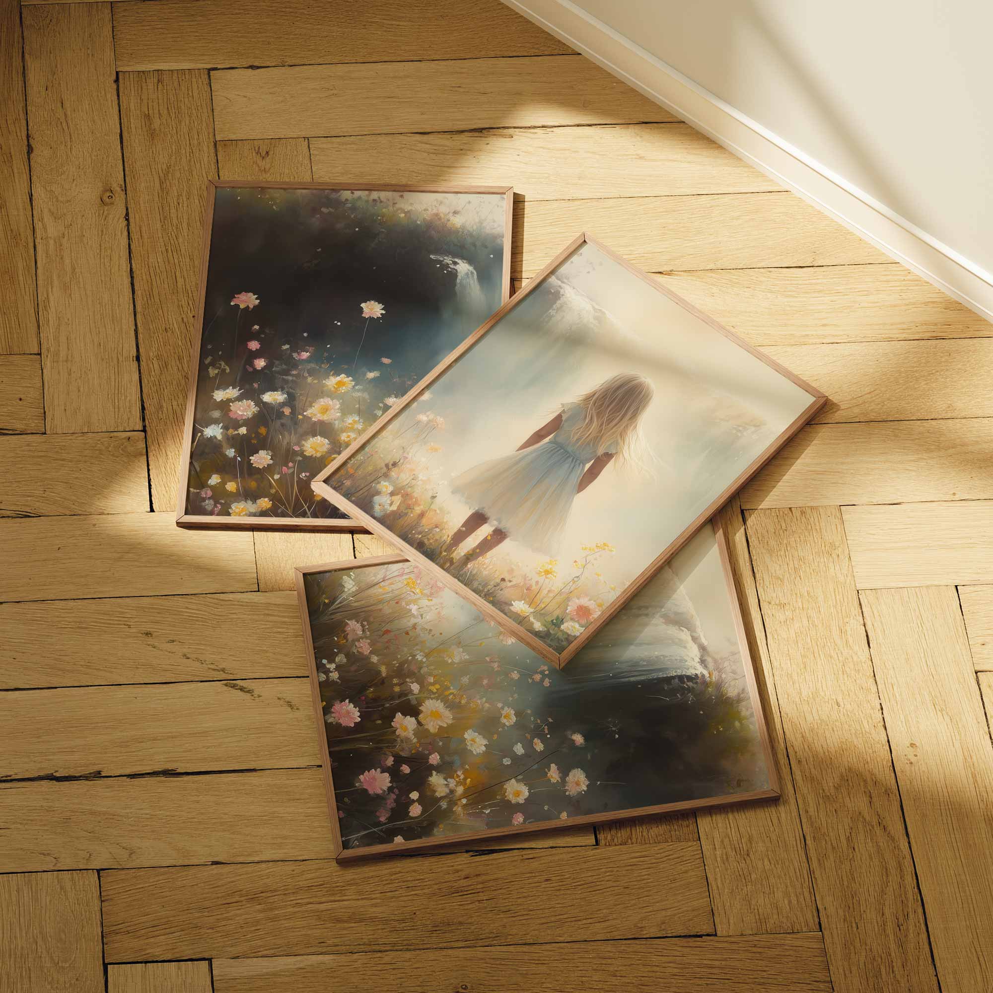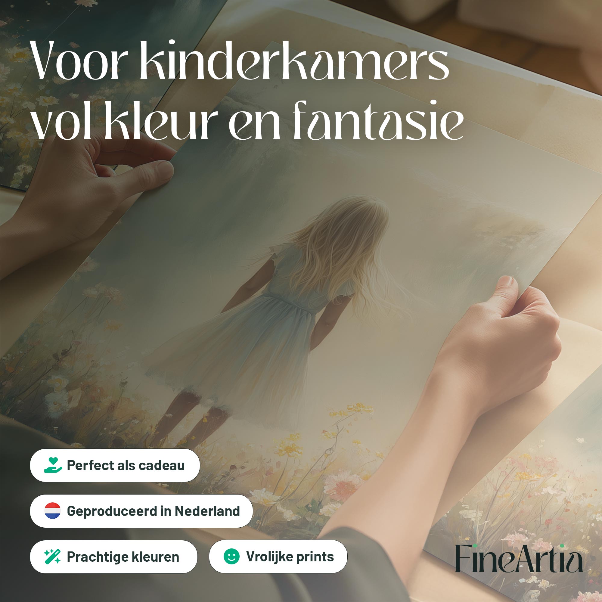 Dromerig Meisje bij Waterval in Pastel Bloemenveld