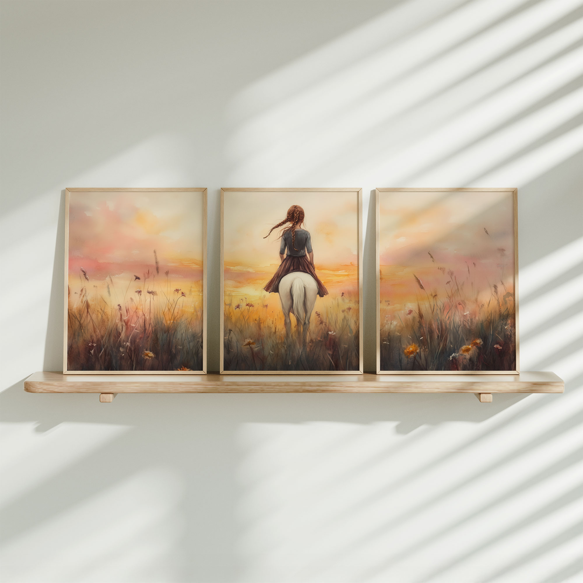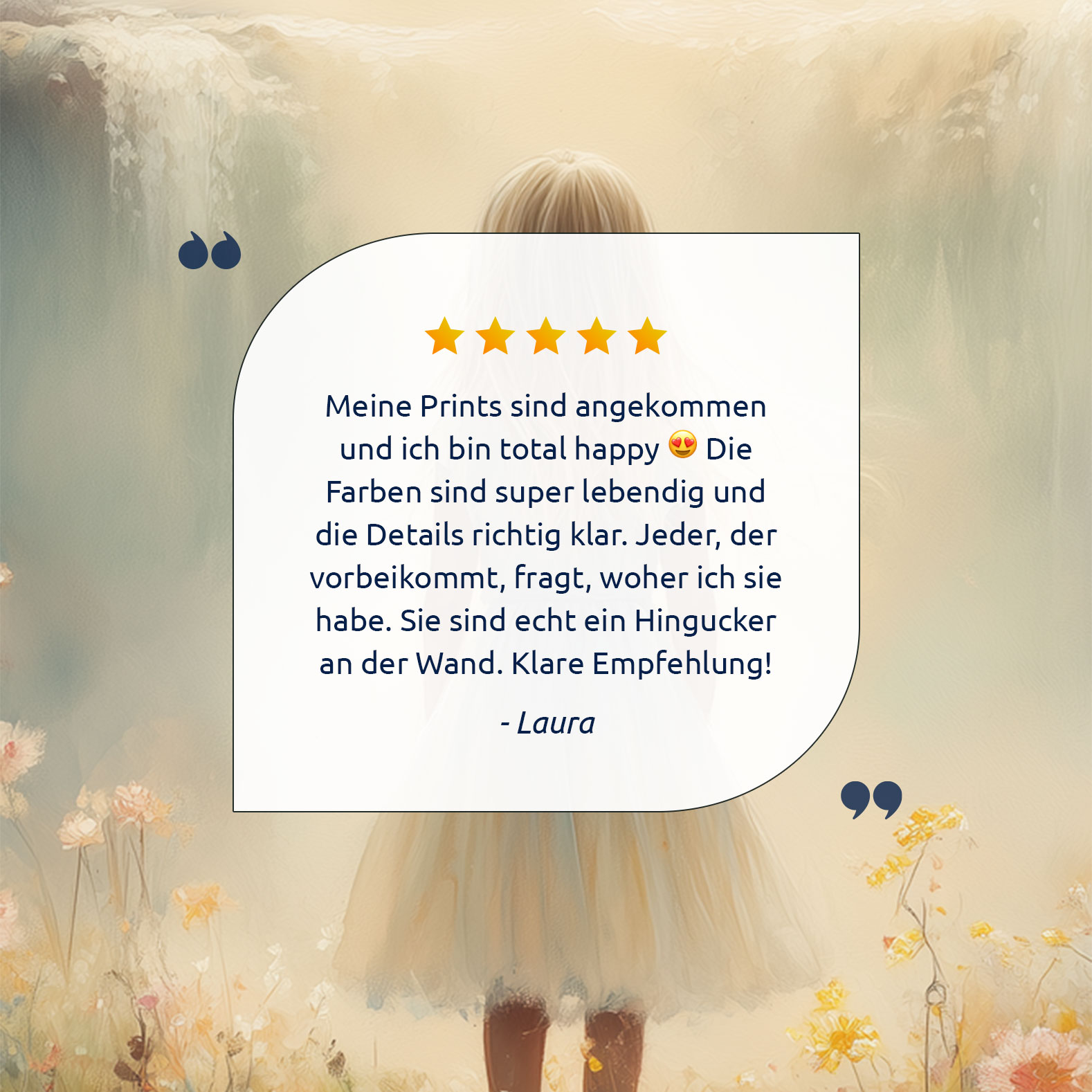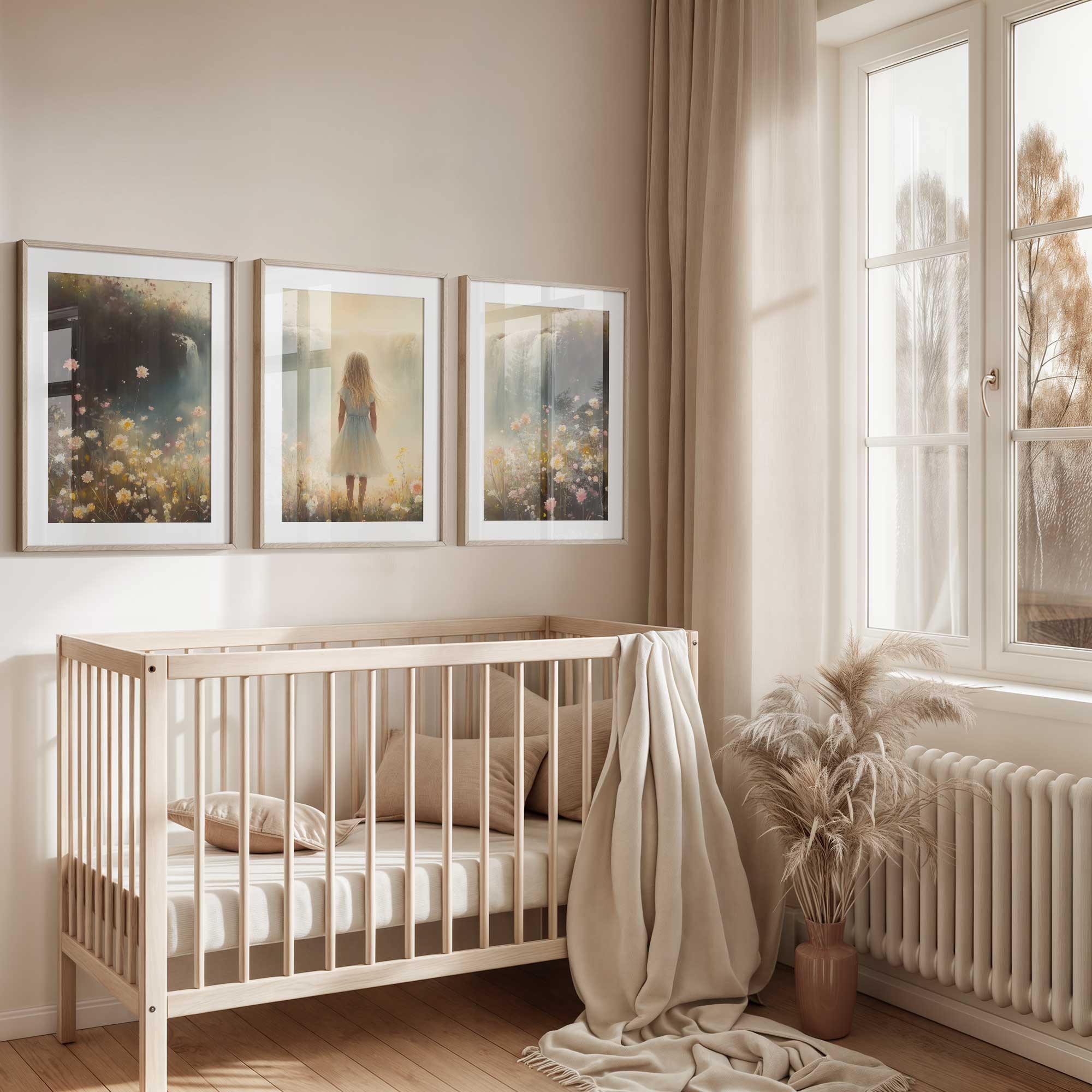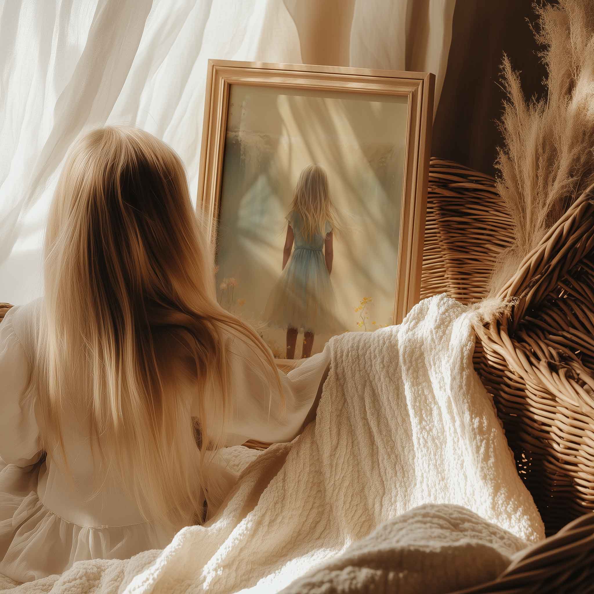 Dromerig Meisje bij Waterval in Pastel Bloemenveld