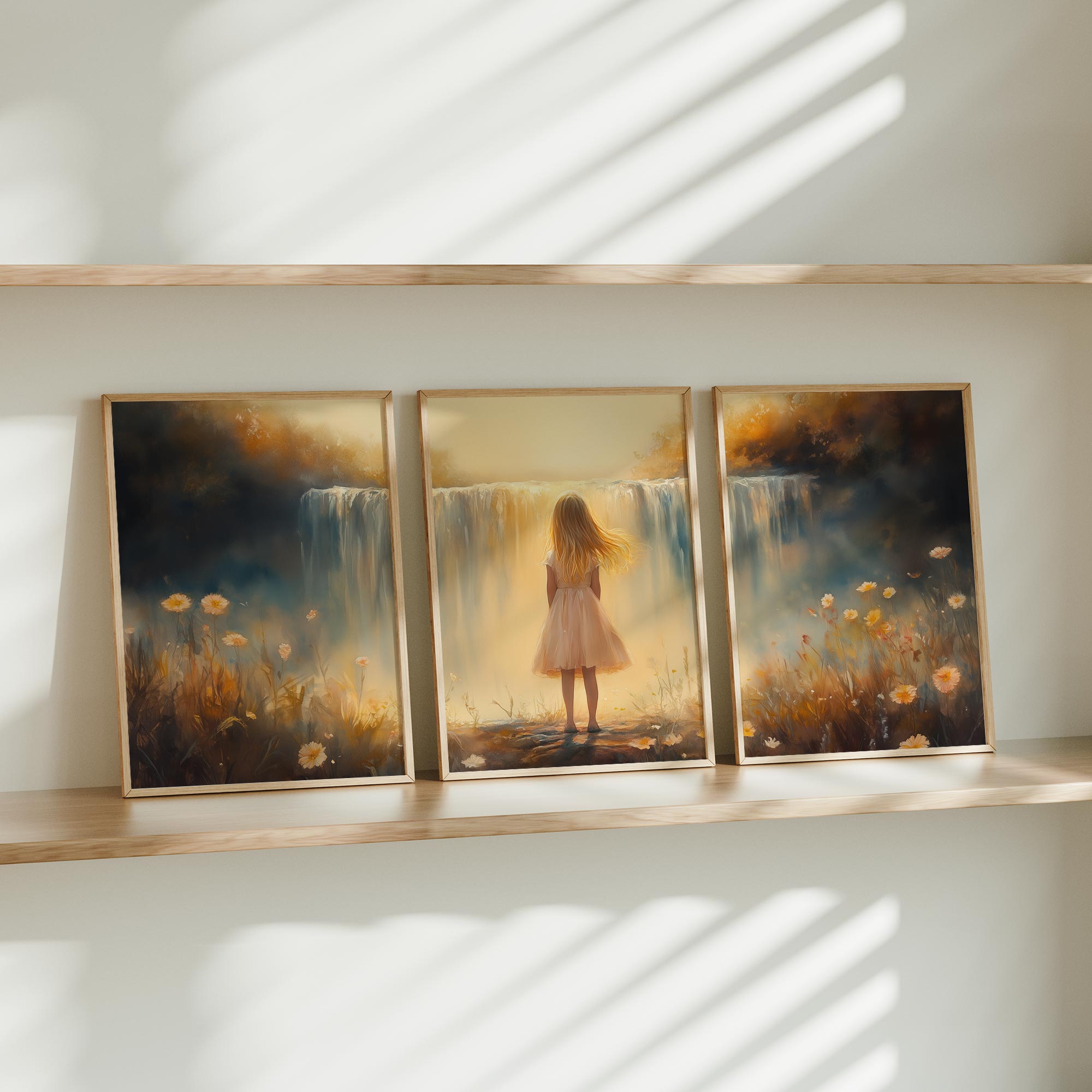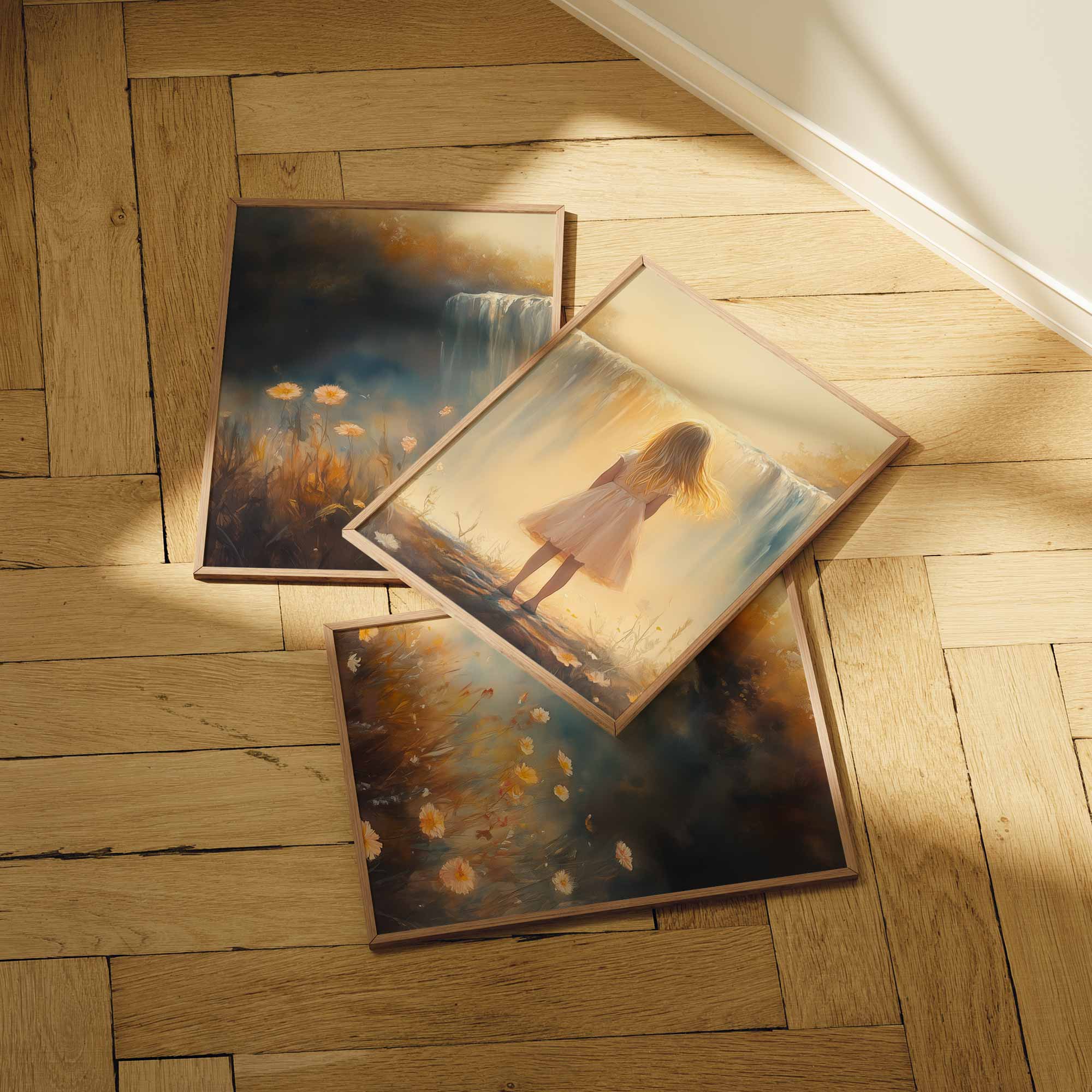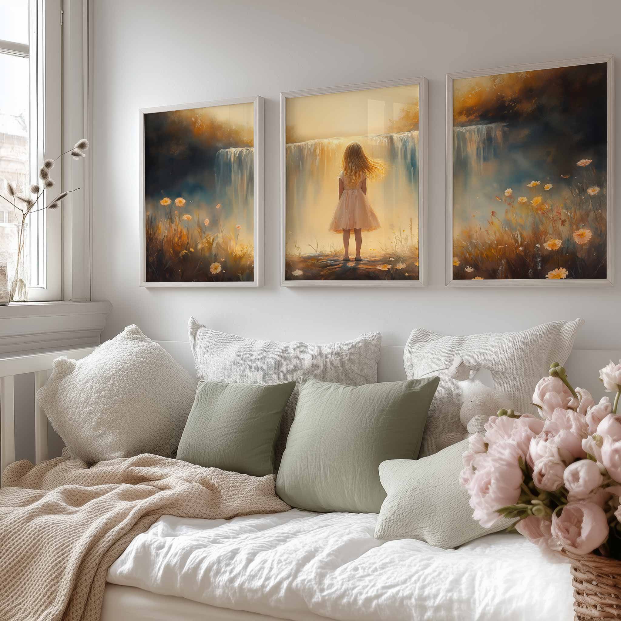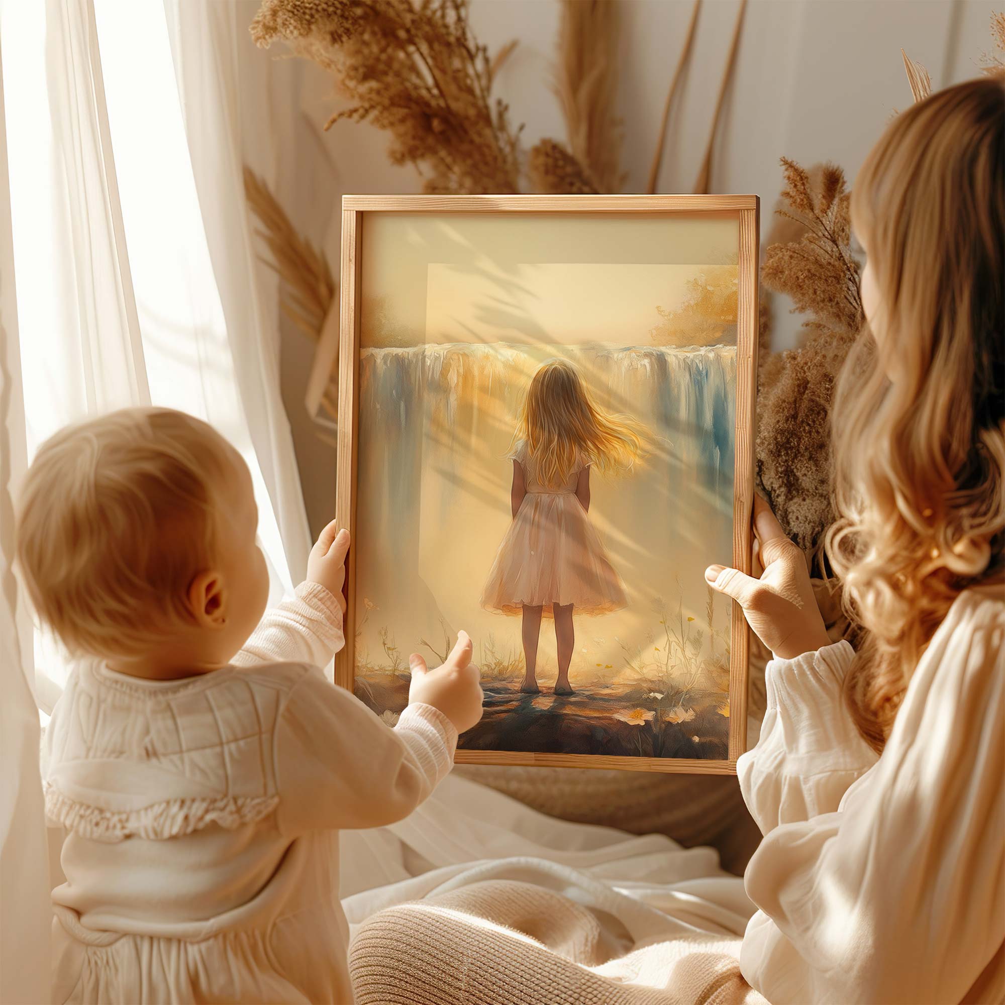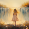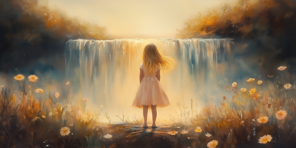 Dromerig Meisje bij Waterval – Pastel Bloemen en Sereniteit
