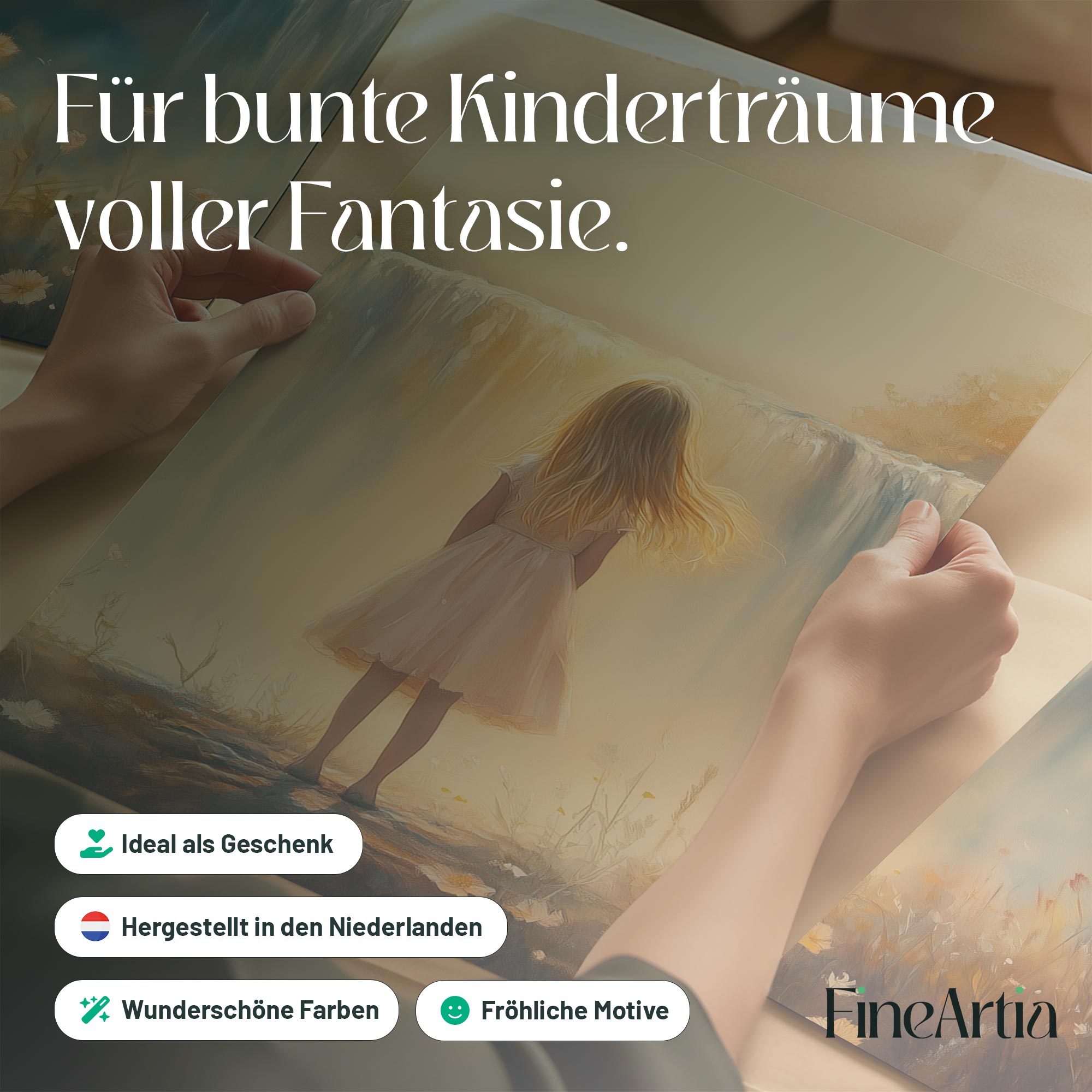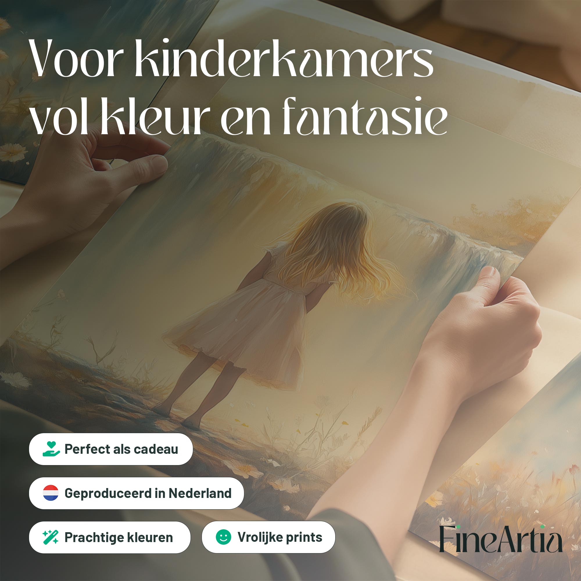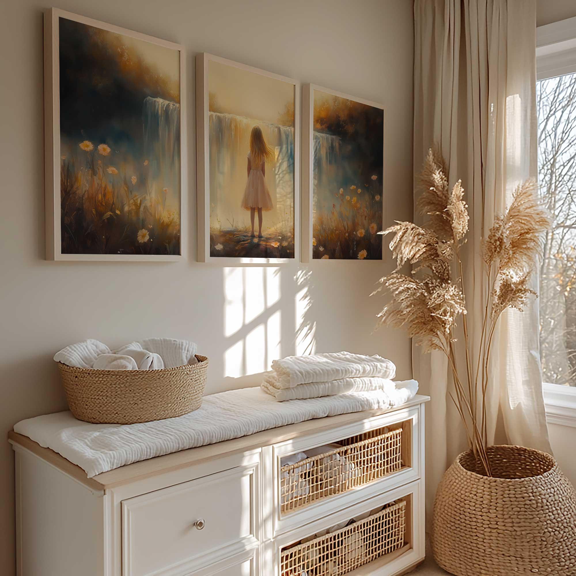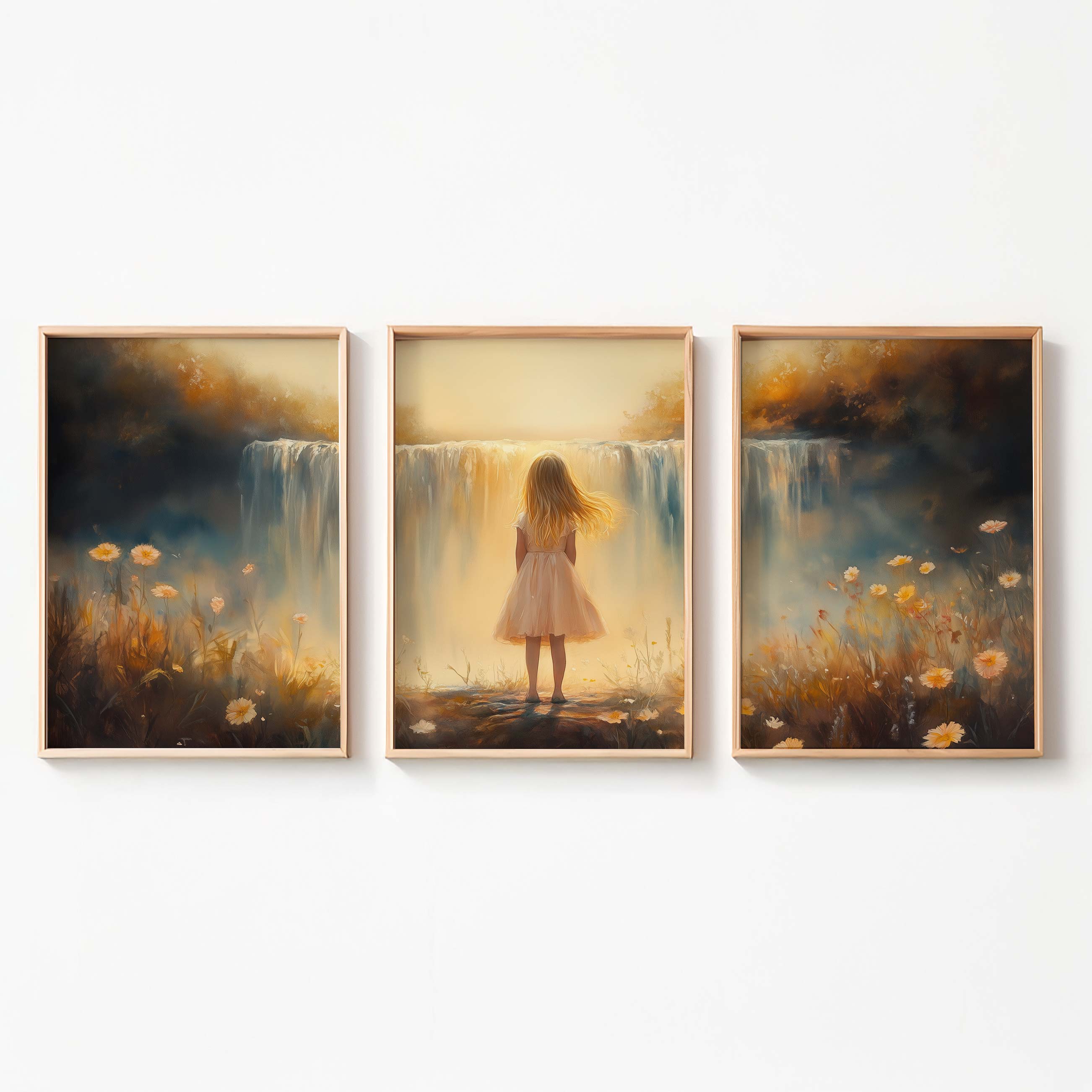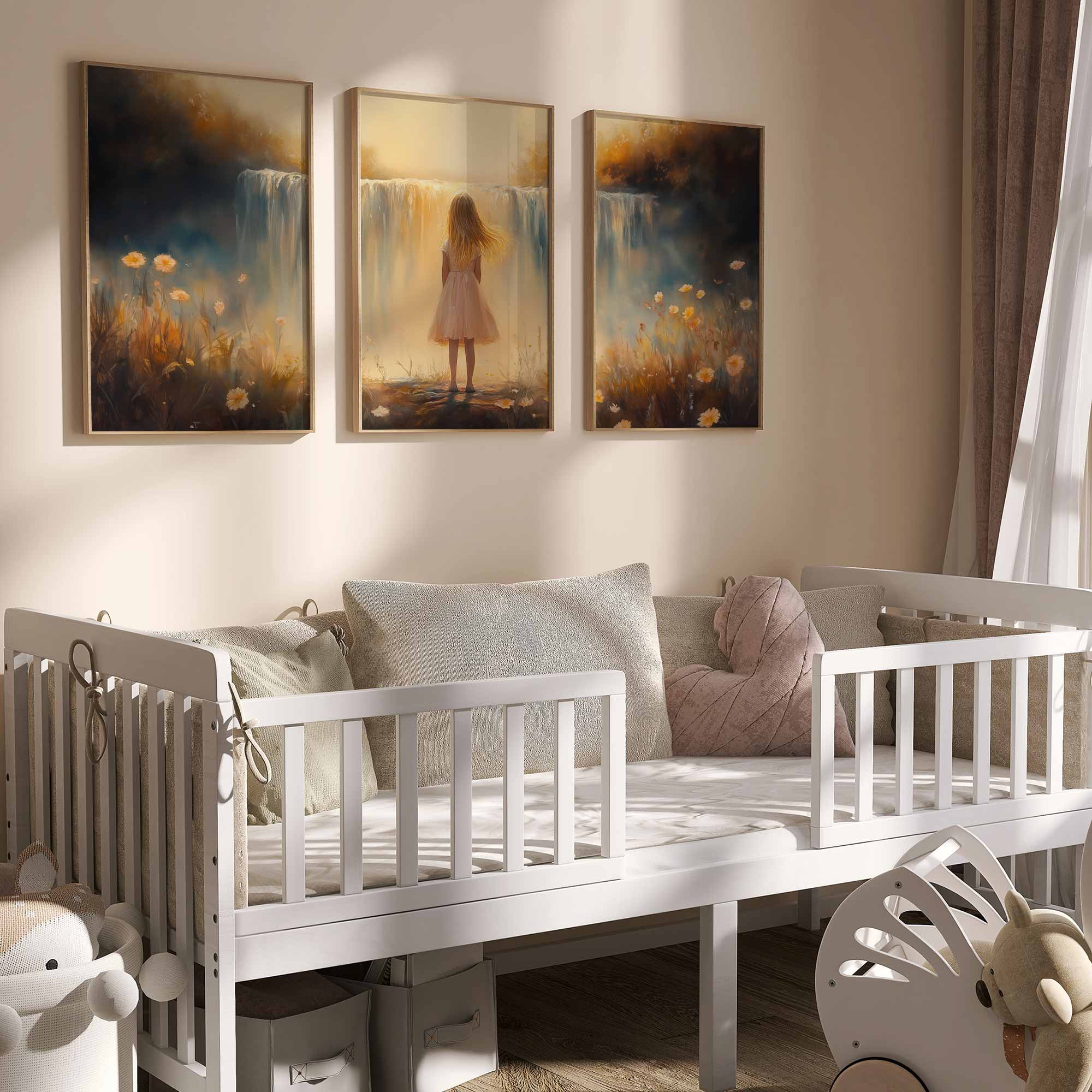 Dromerig Meisje bij Waterval – Pastel Bloemen en Sereniteit