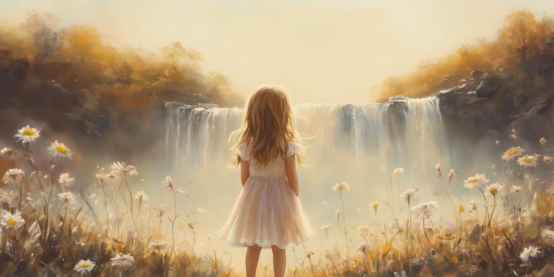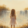 Dromerig Meisje bij Waterval – Pastel Bloemenveld