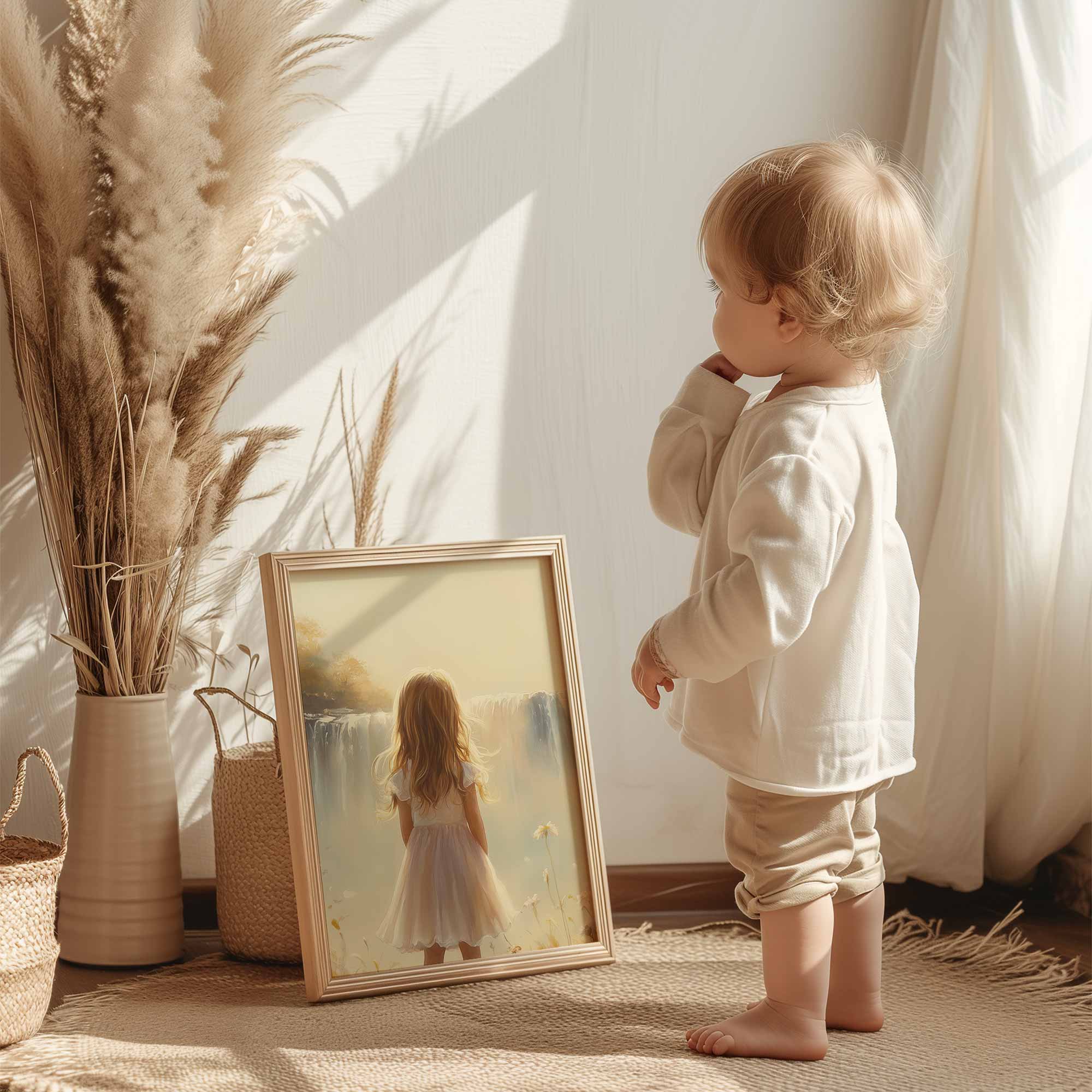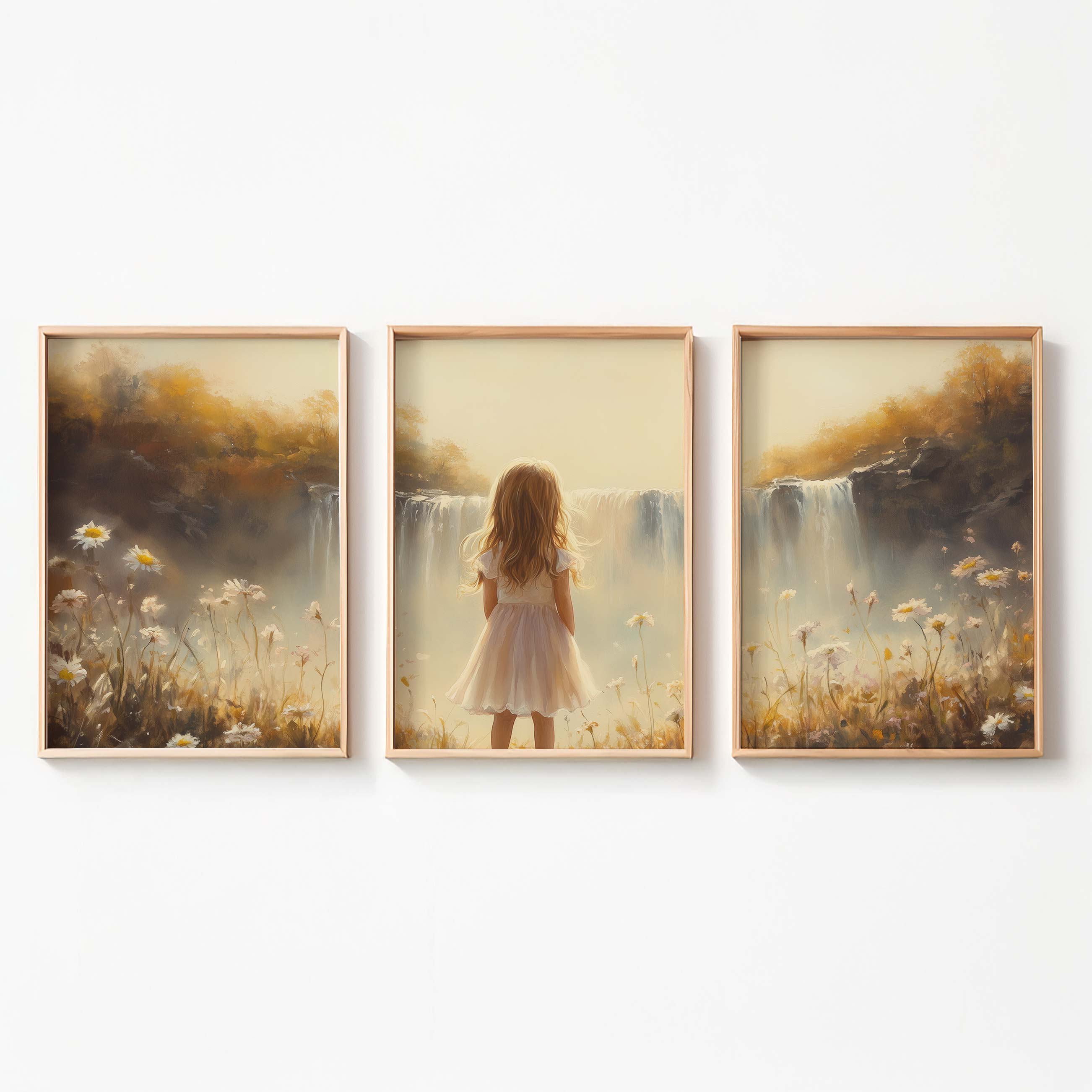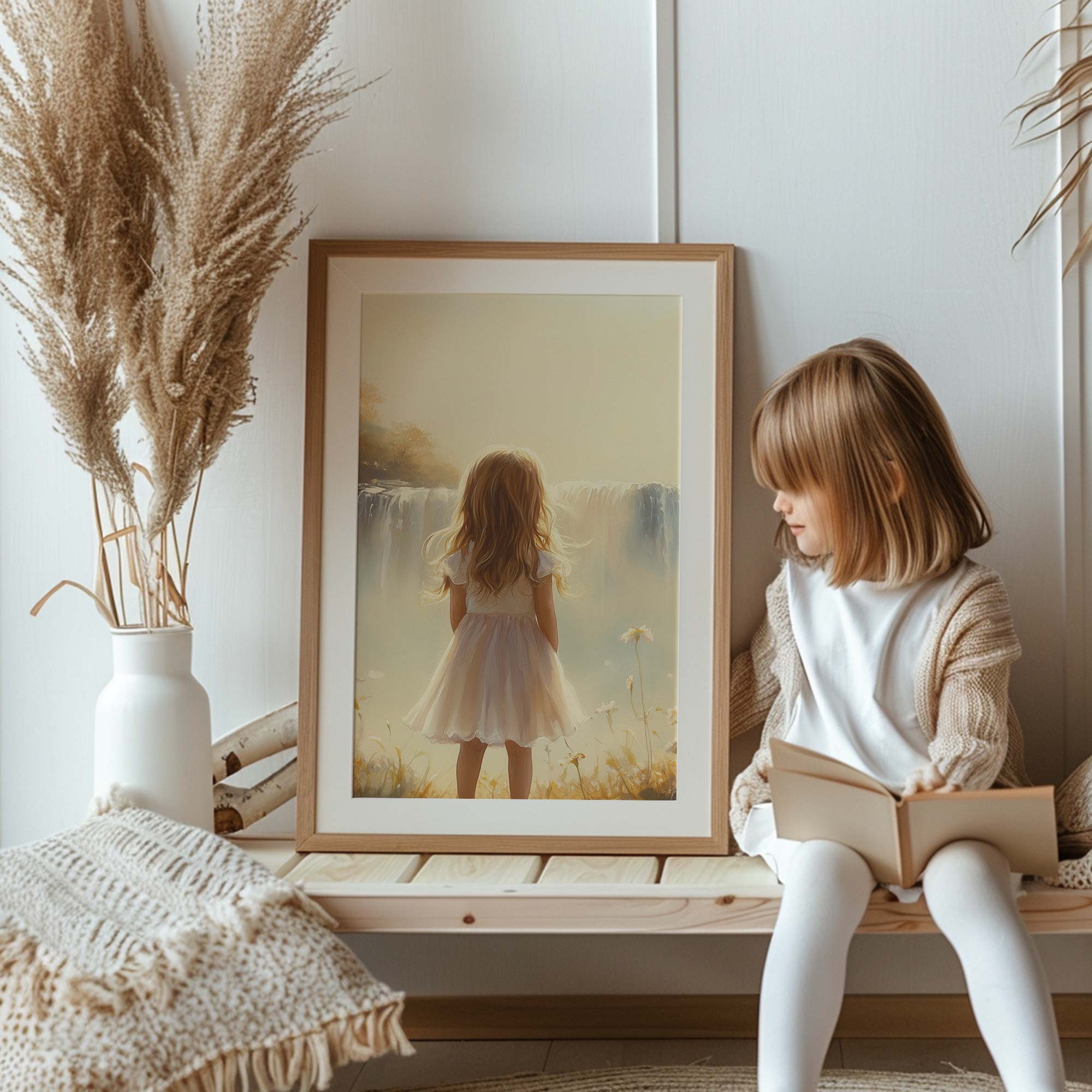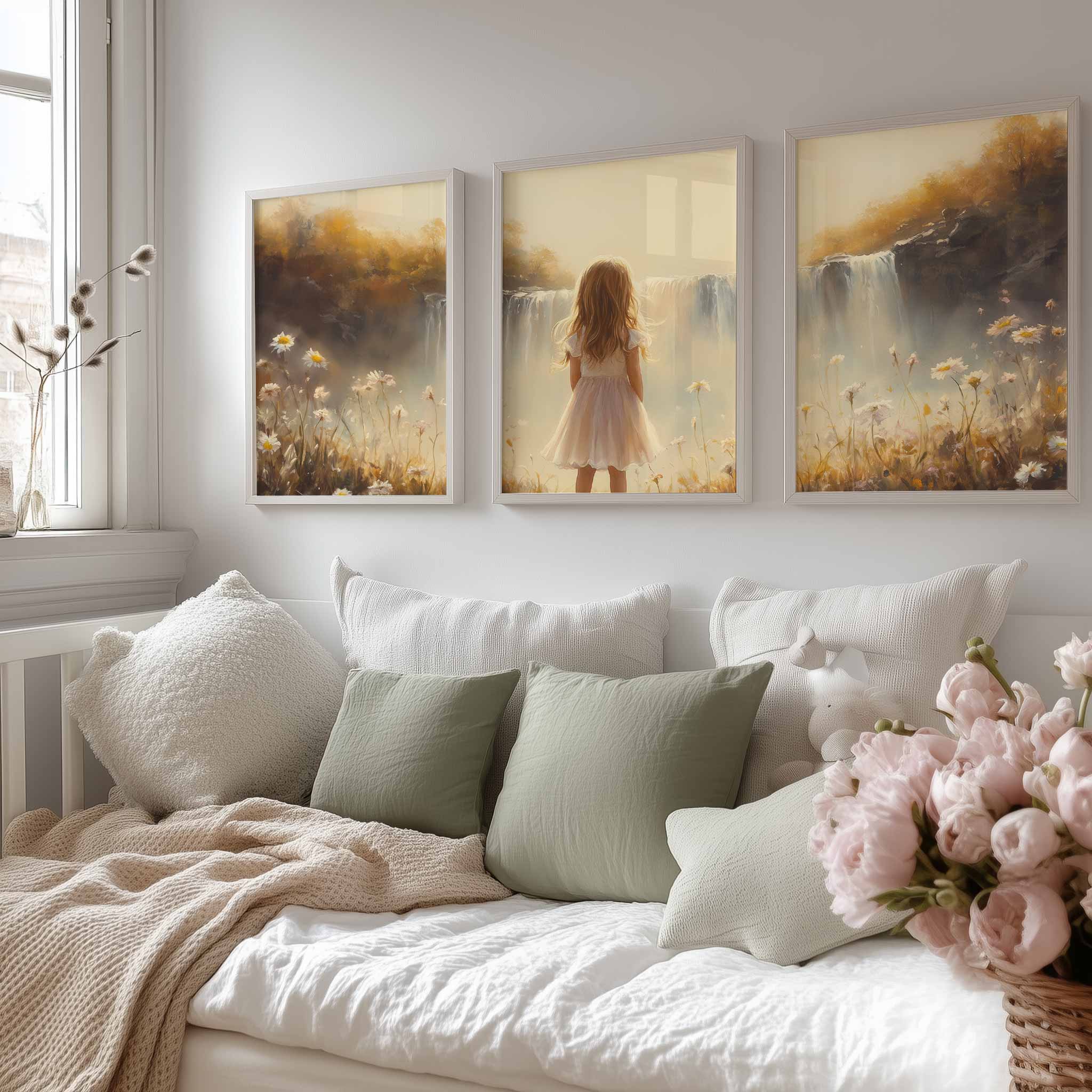Terug naar collectie Posters Dromerig Meisje bij Waterval – Pastel Bloemenveld