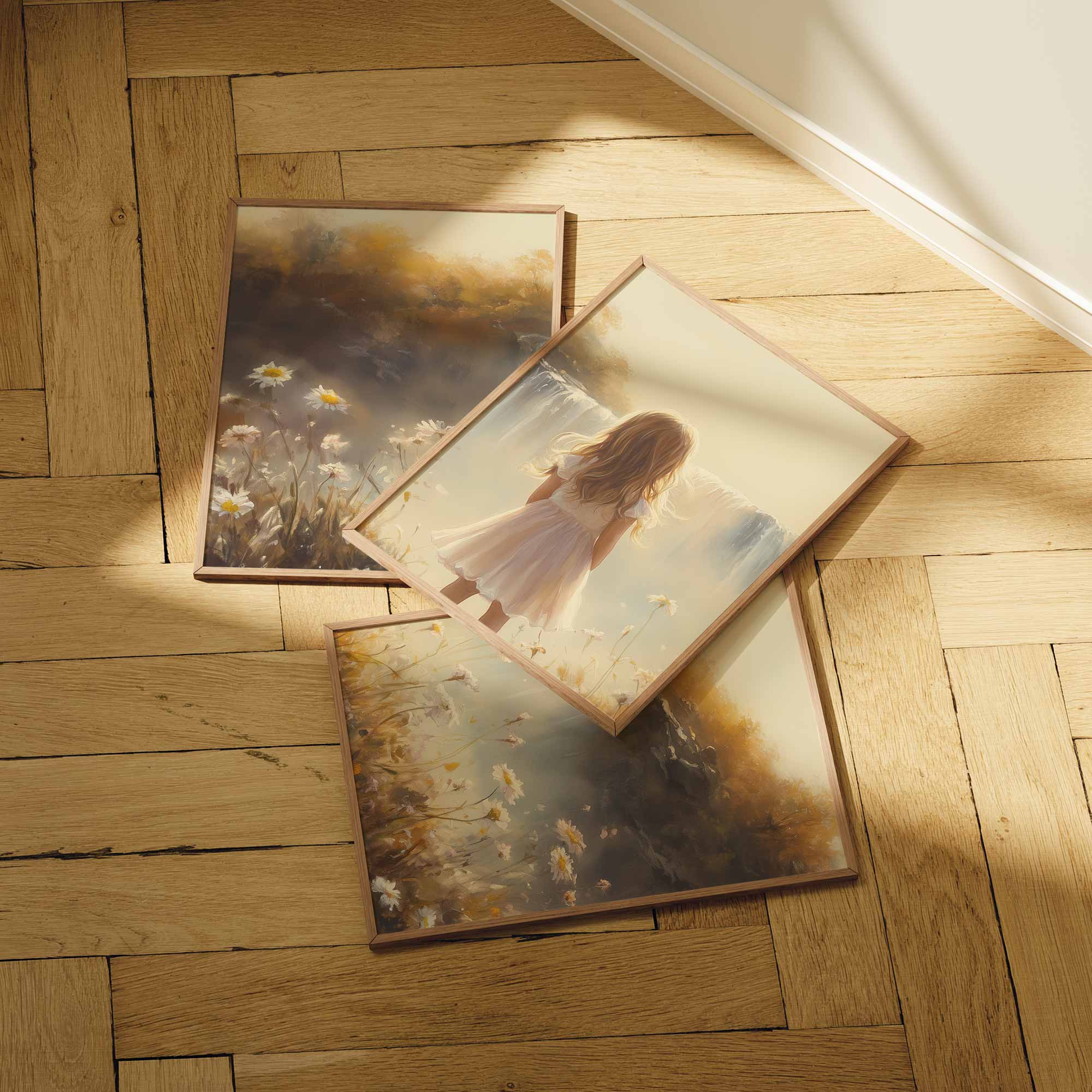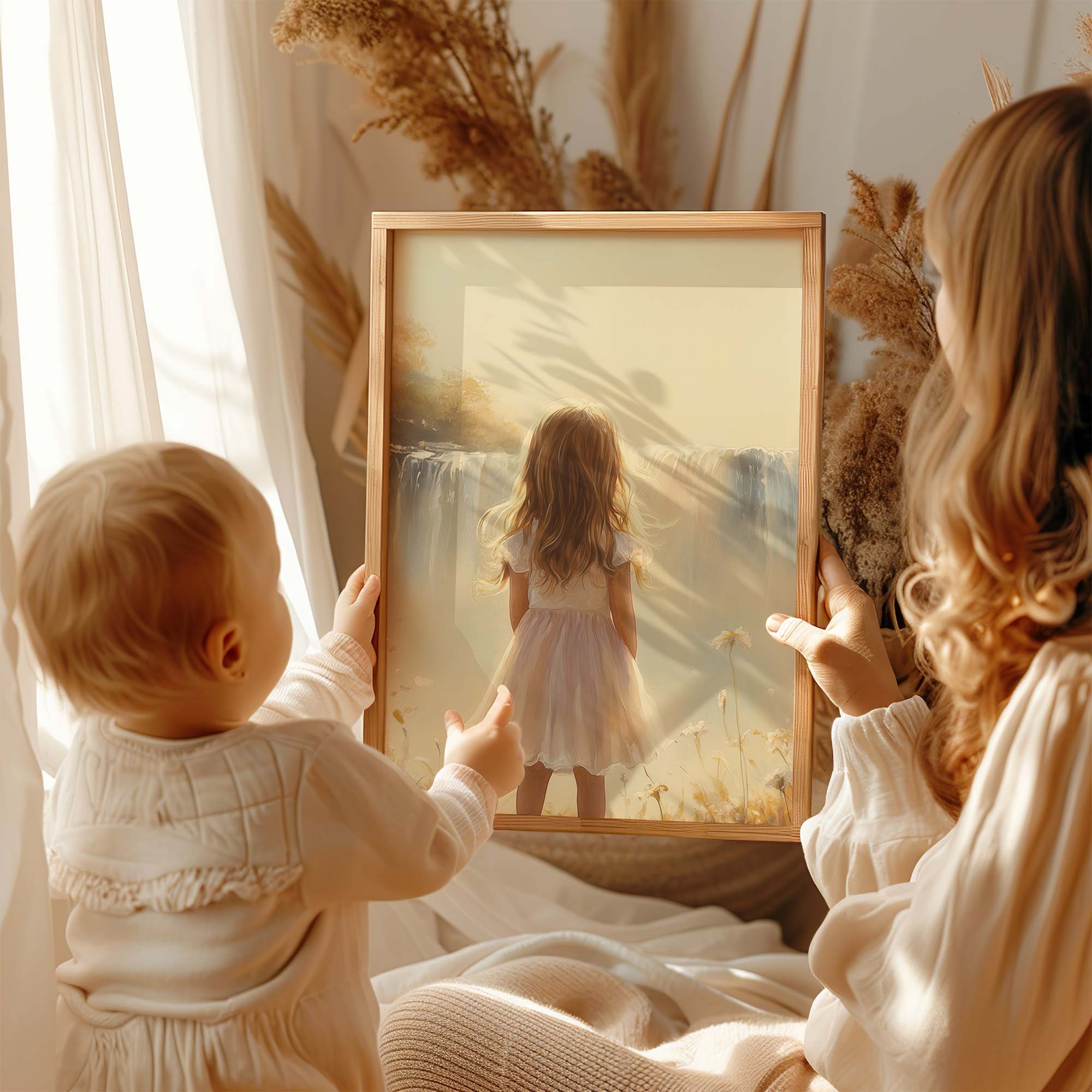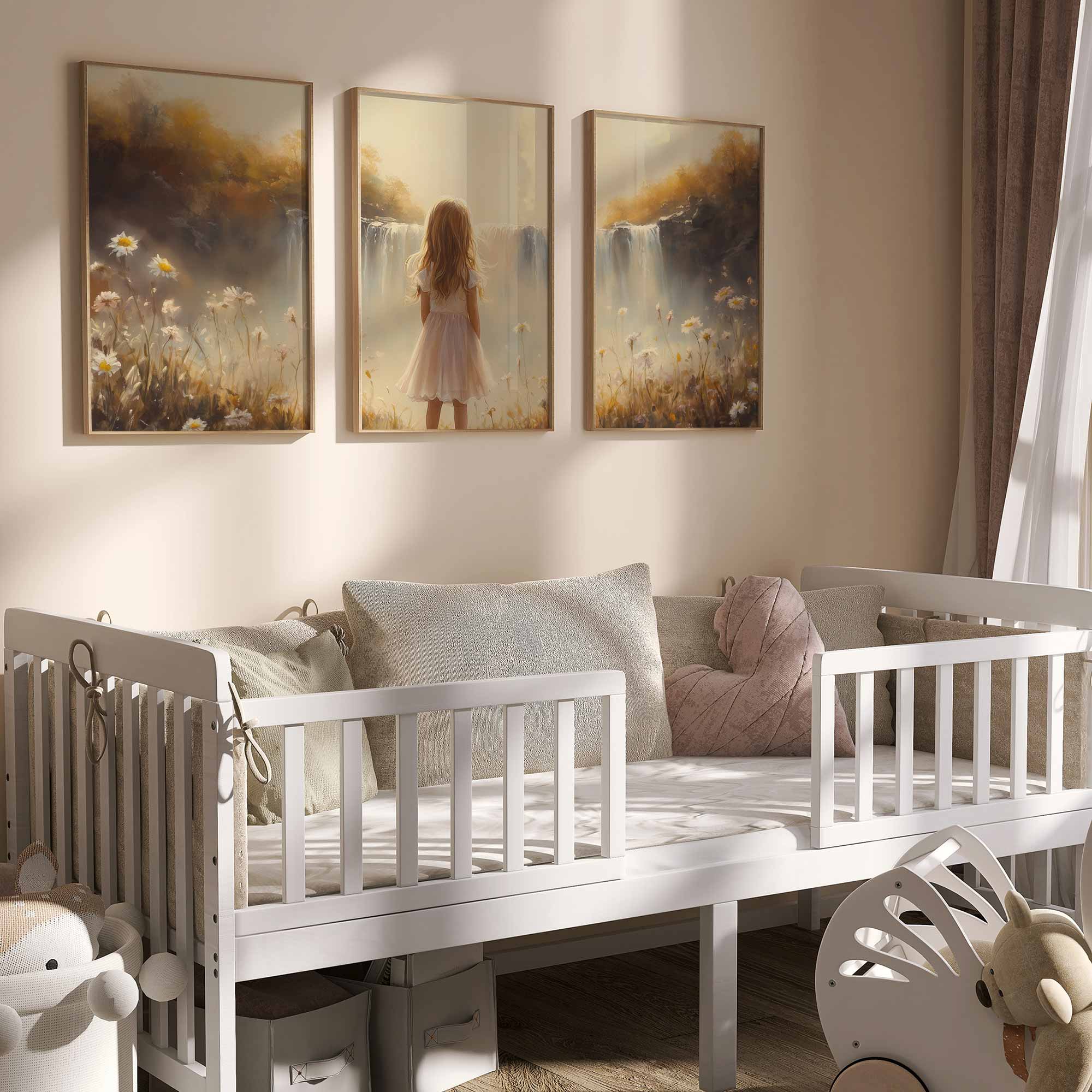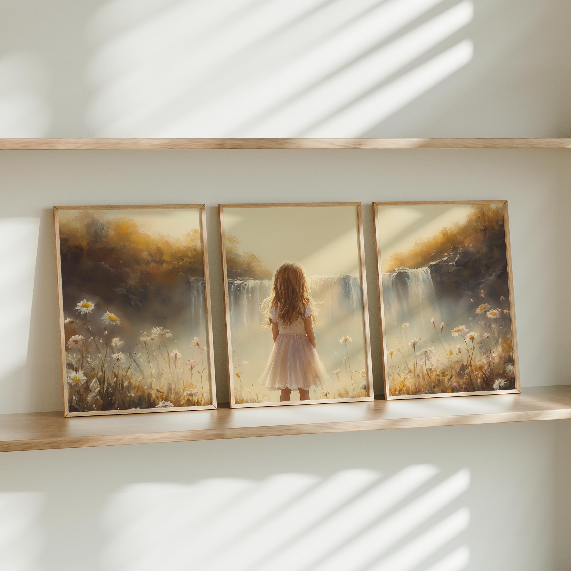 Terug naar collectie Posters Dromerig Meisje bij Waterval – Pastel Bloemenveld