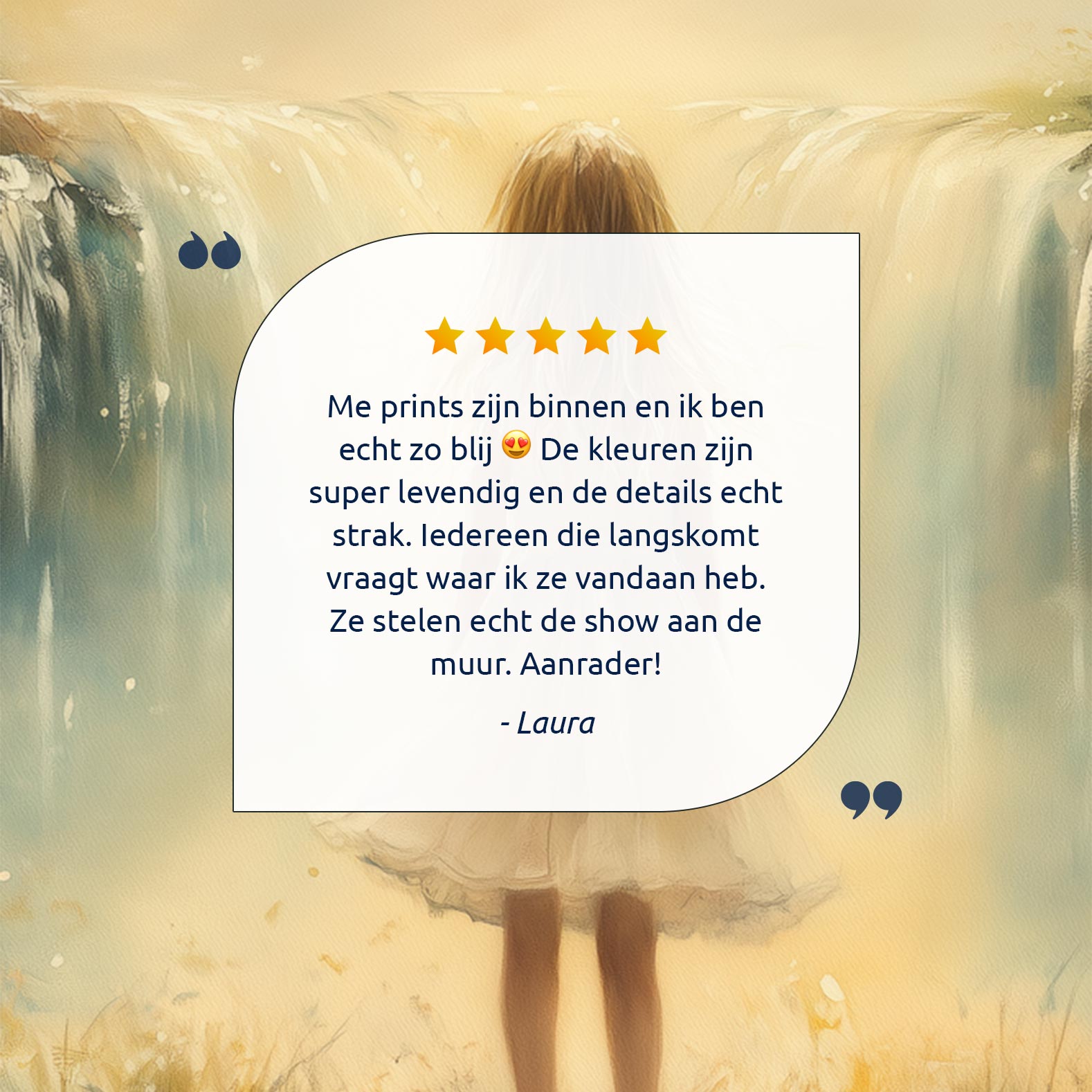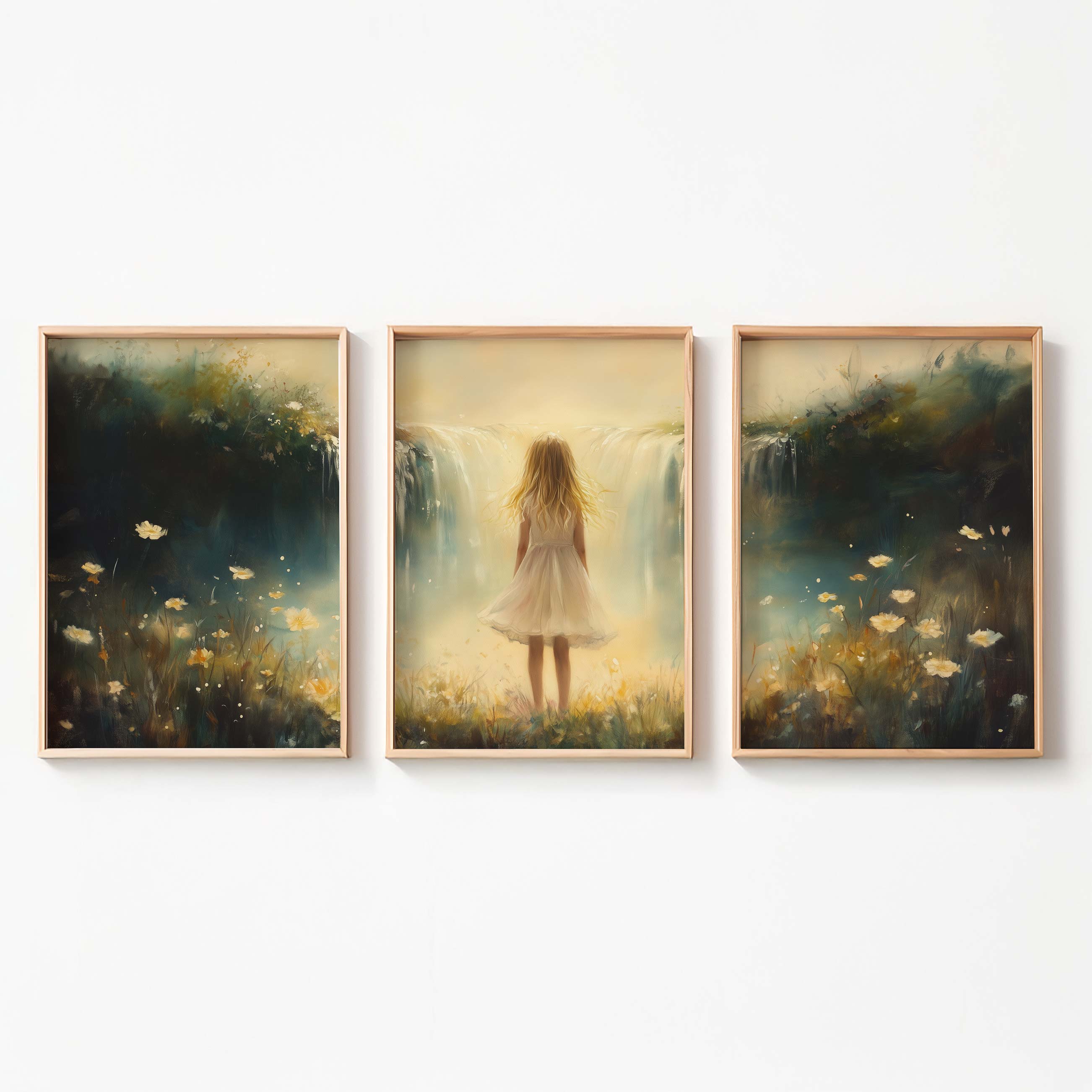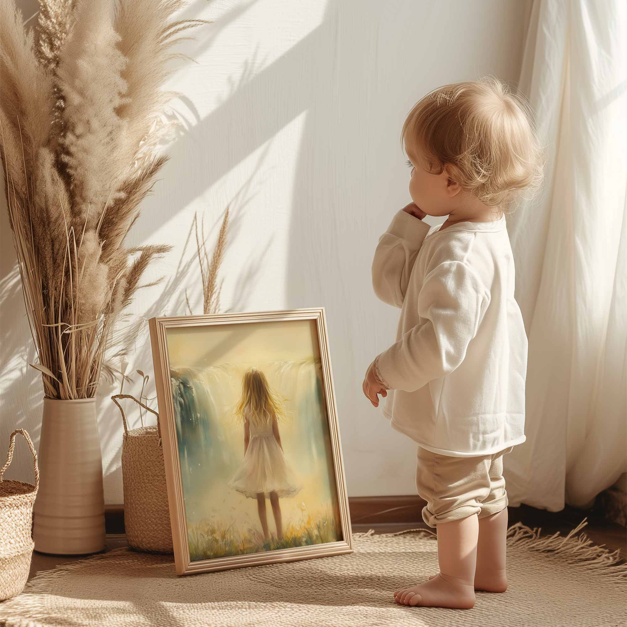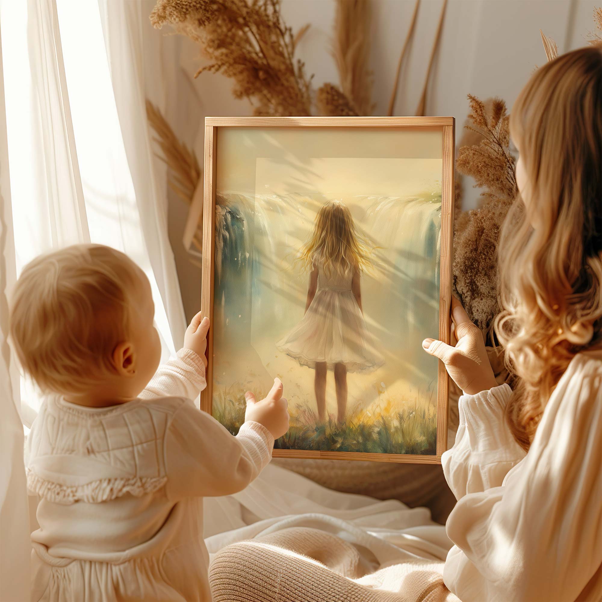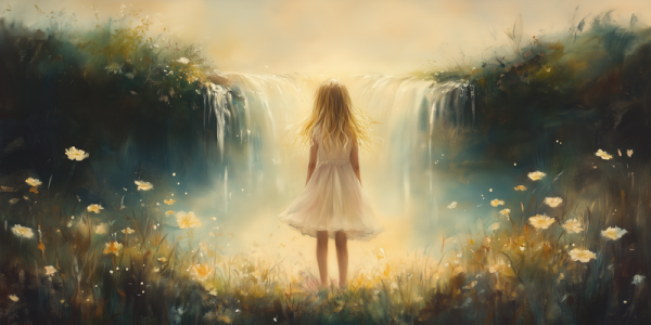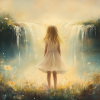 Dromerig Meisje bij Waterval – Pastel Natuurtafereel